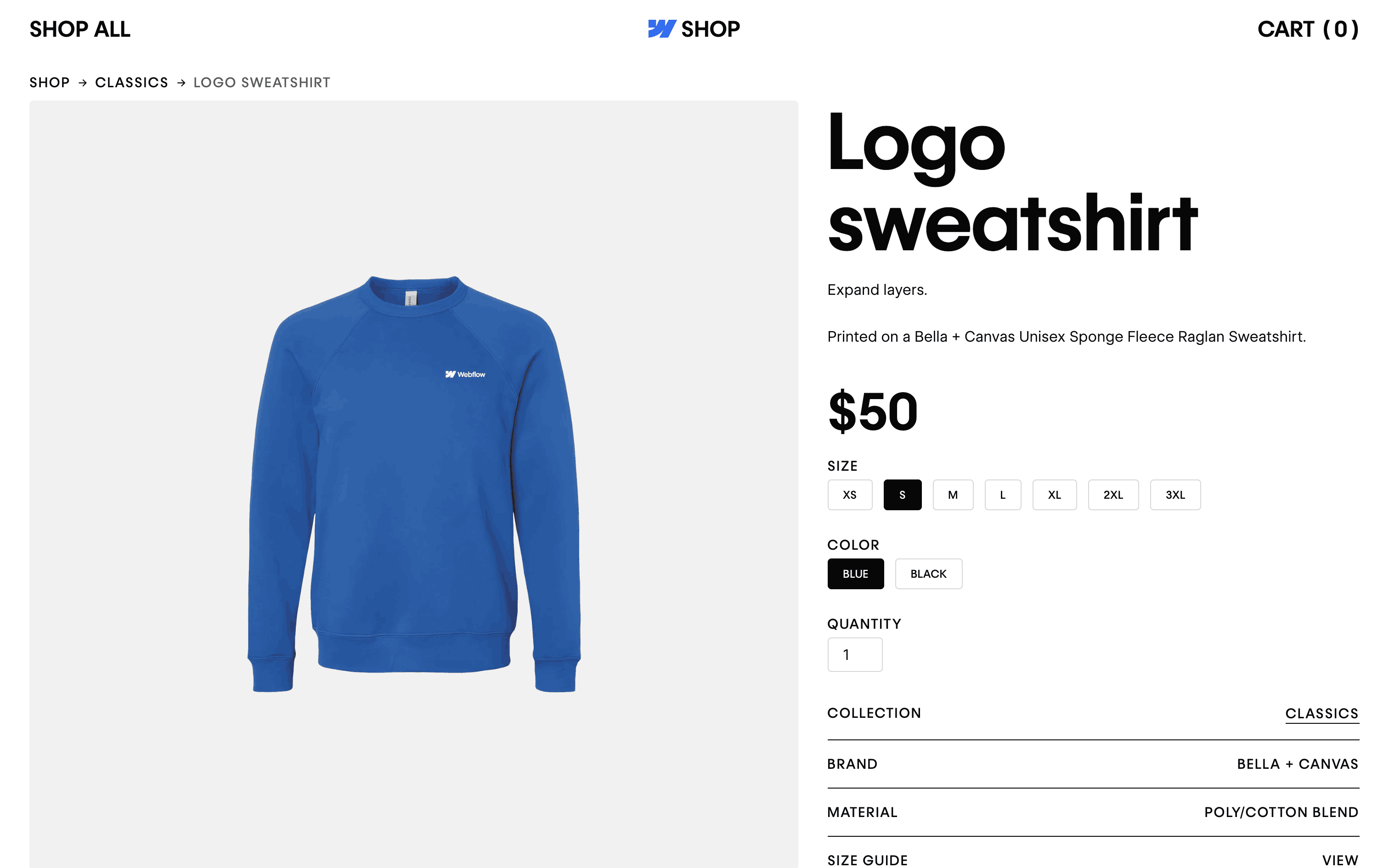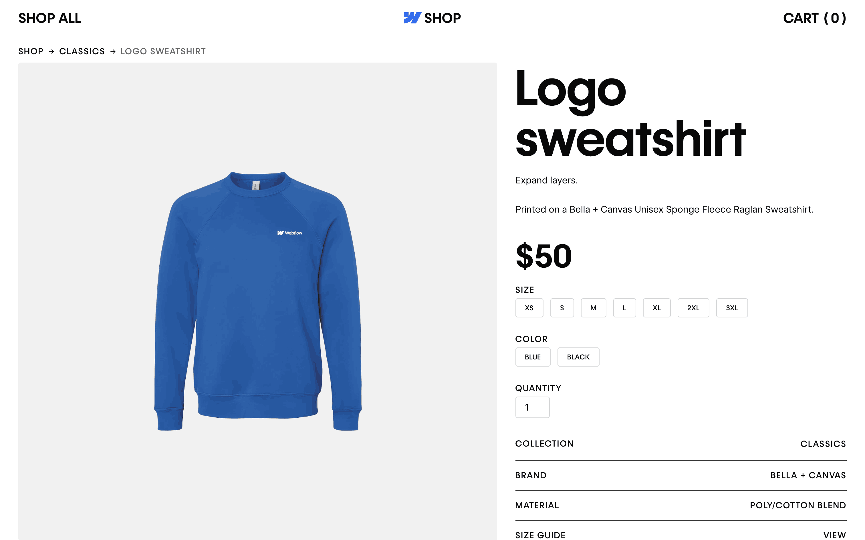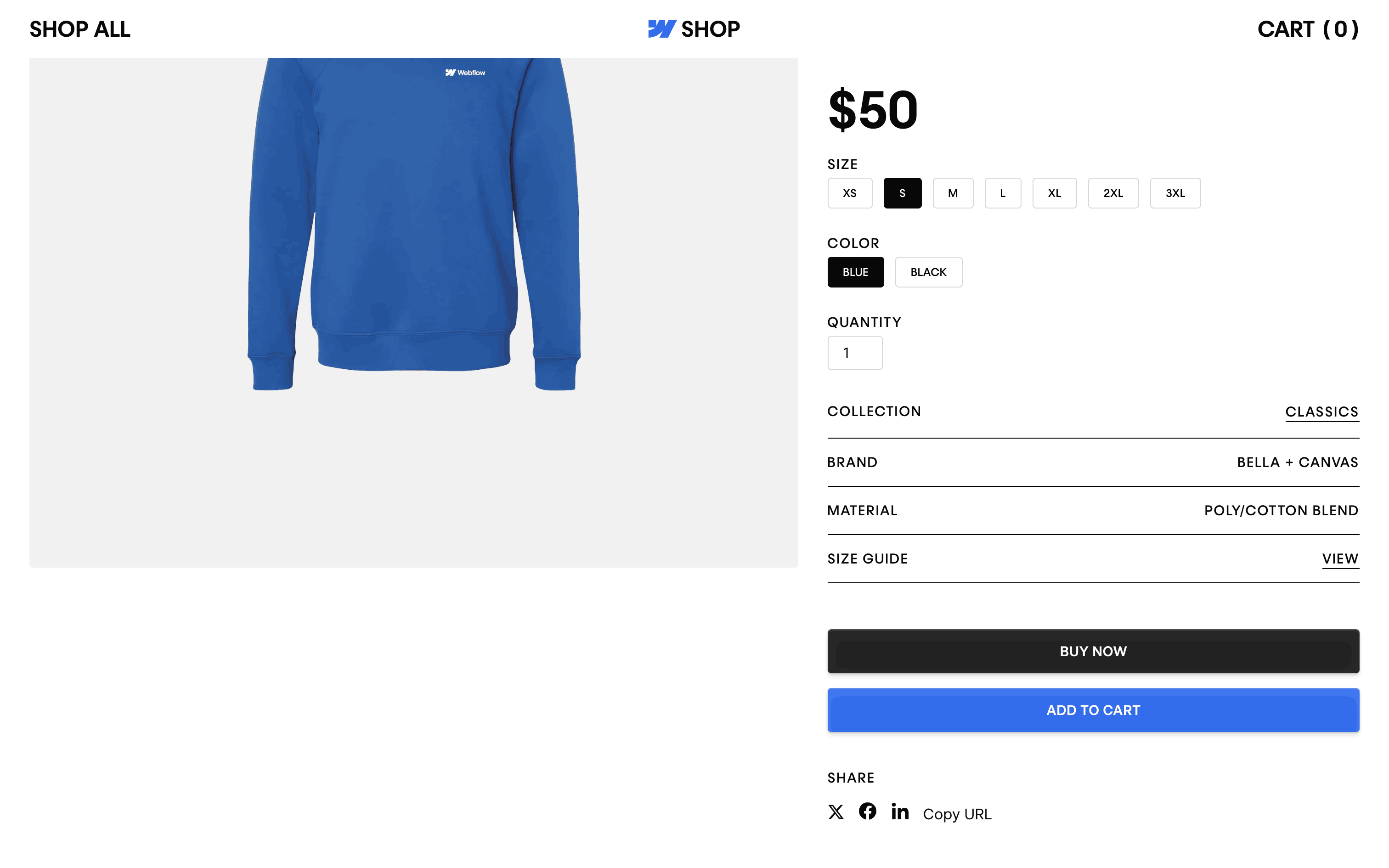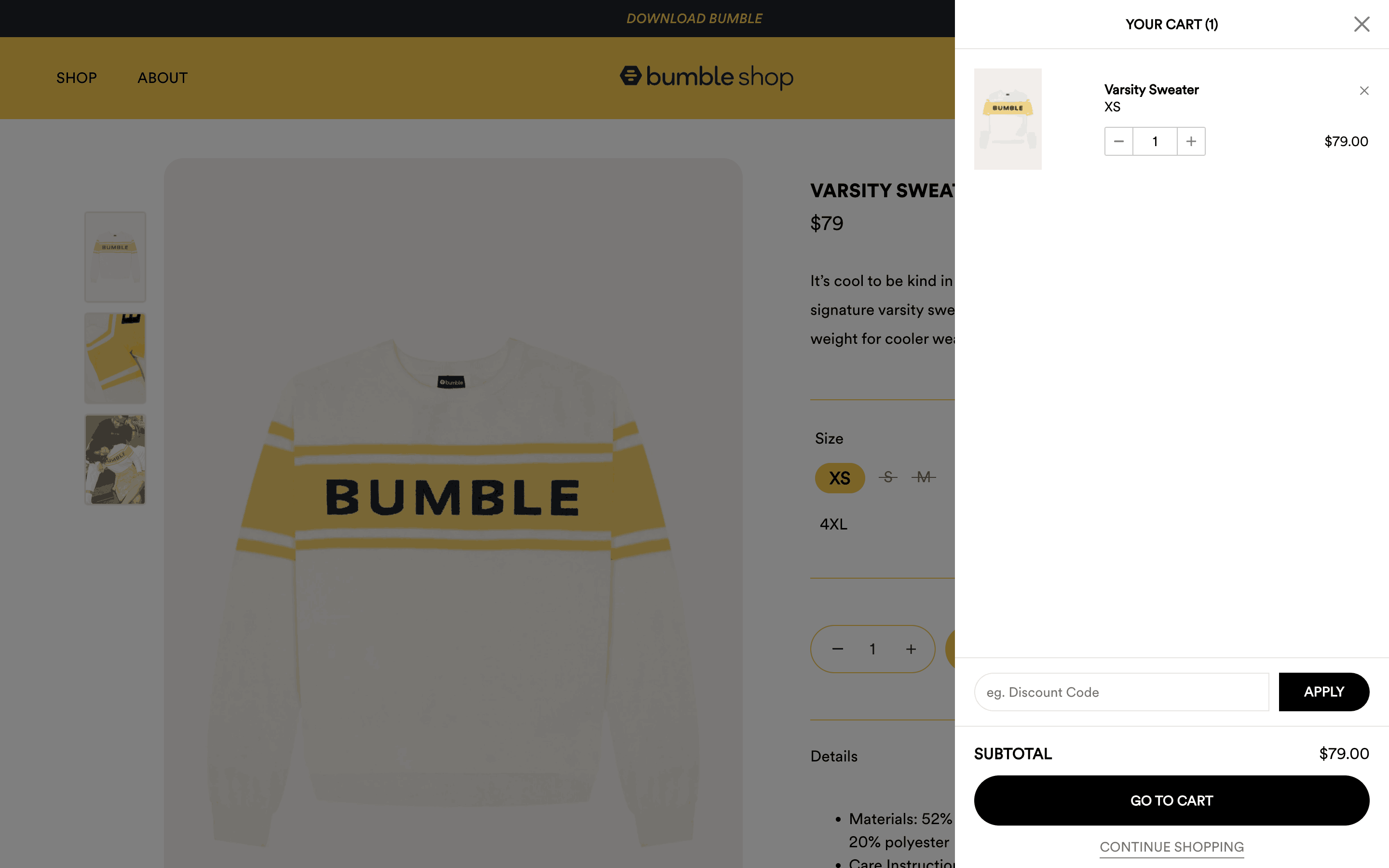 The user views a product, selects a size, and adds it to the cart. The cart modal then displays the added item and checkout options.