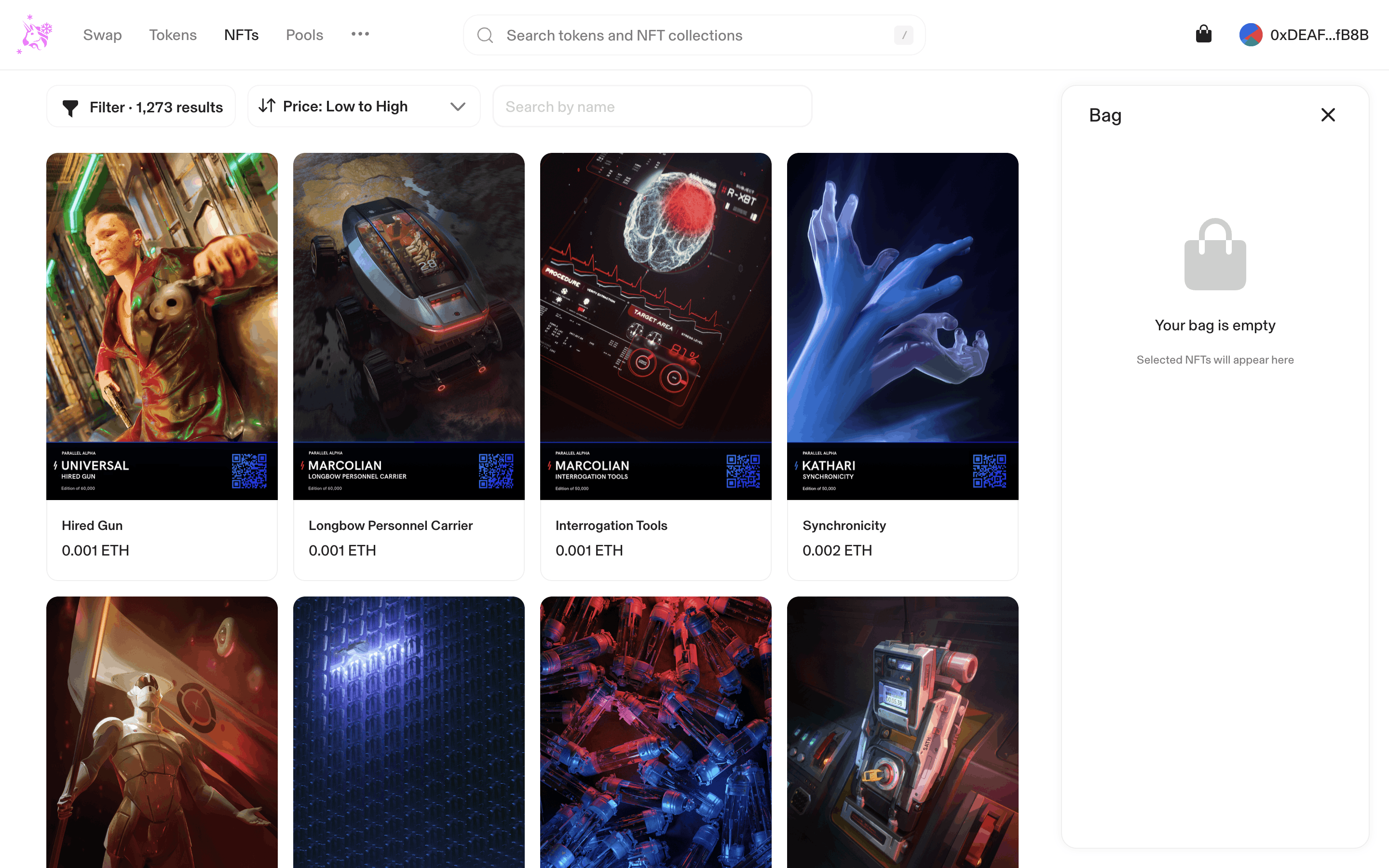 The user browses an NFT marketplace, adds items to the bag, views the bag, and then the bag becomes empty. This indicates a purchase or removal of items.