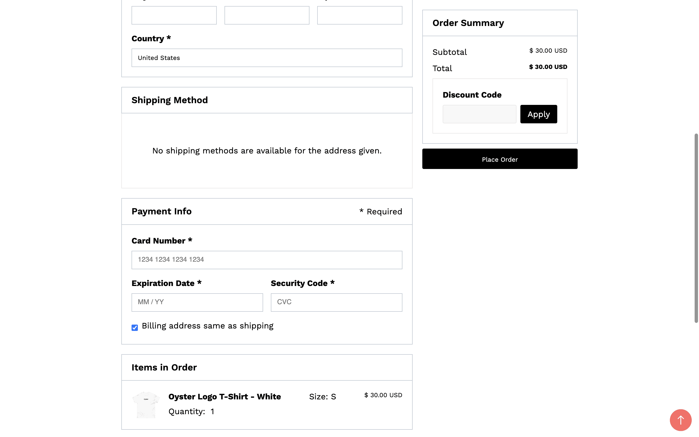 The user browses a product listing, selects a product and size, adds it to the cart, and proceeds through the checkout process. The flow culminates in the user providing payment information.