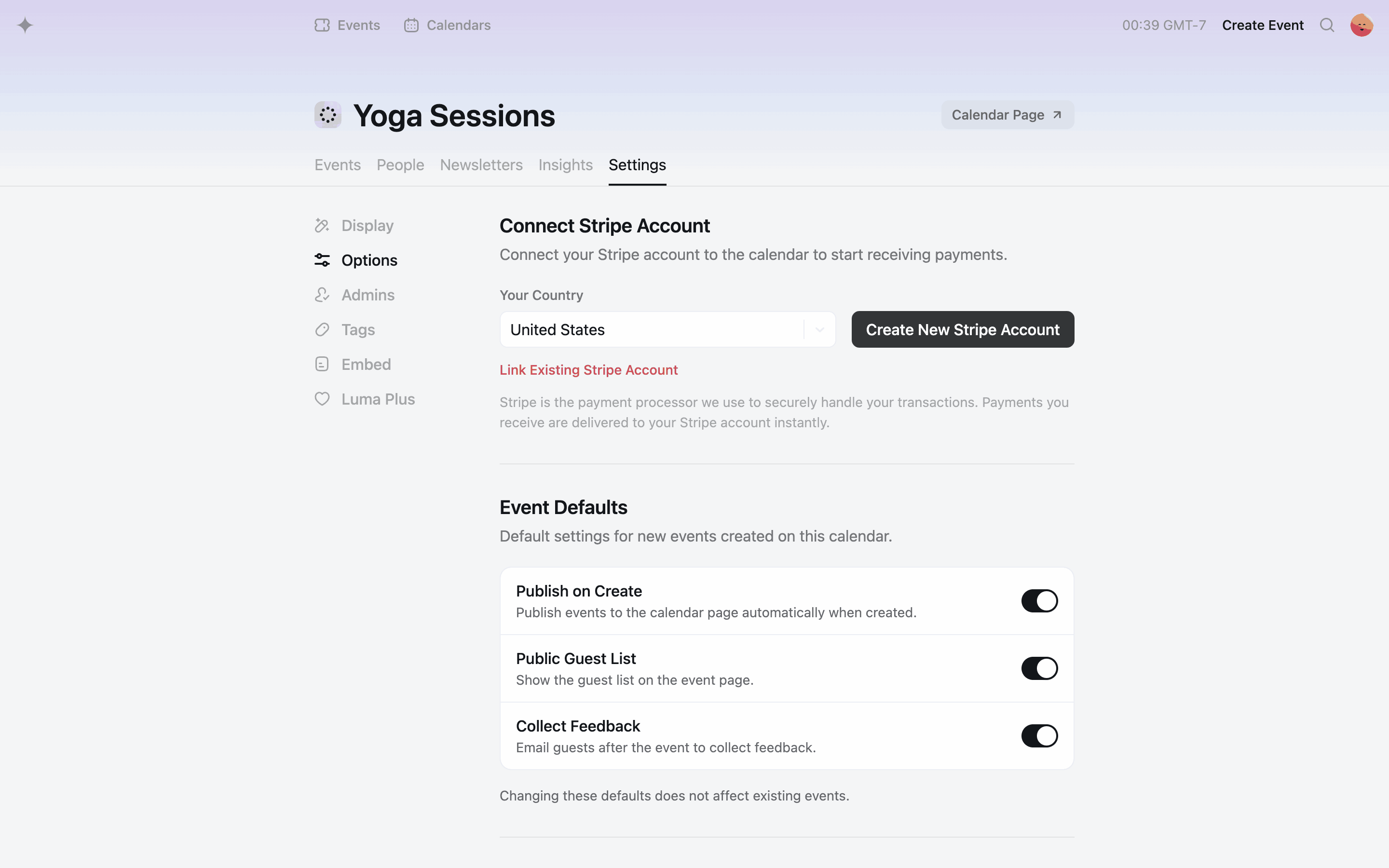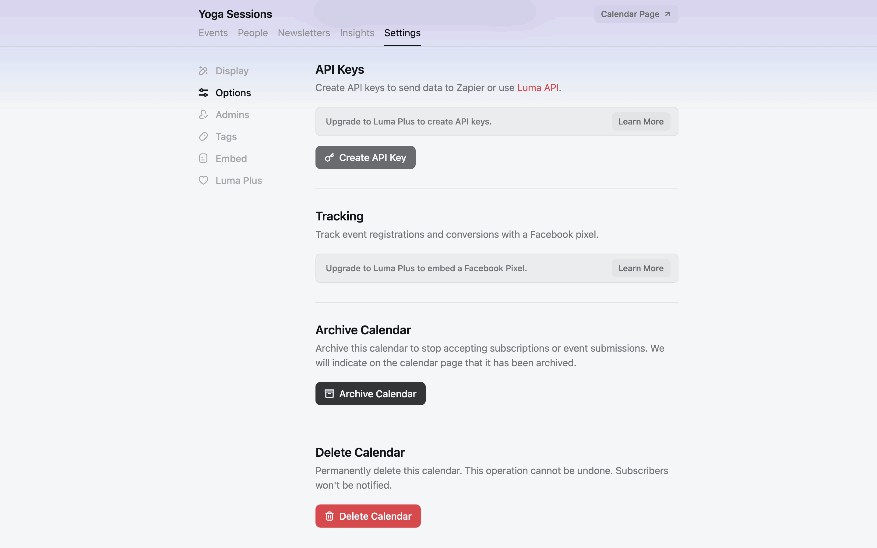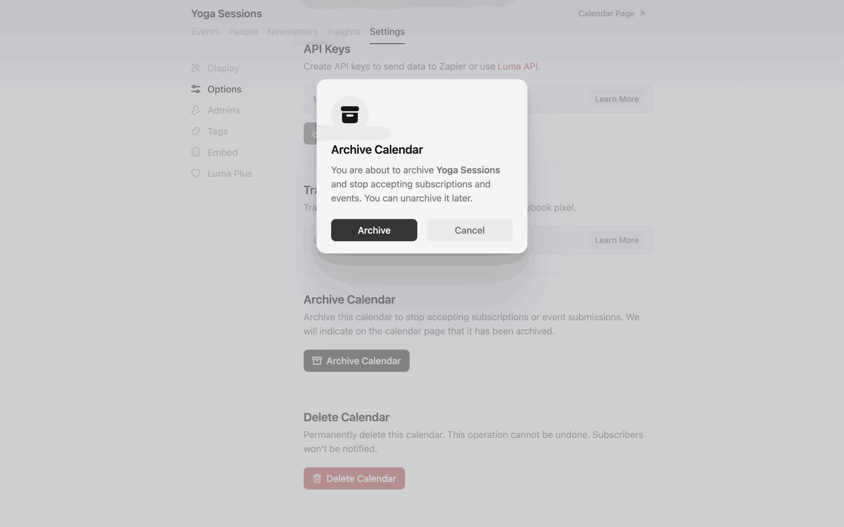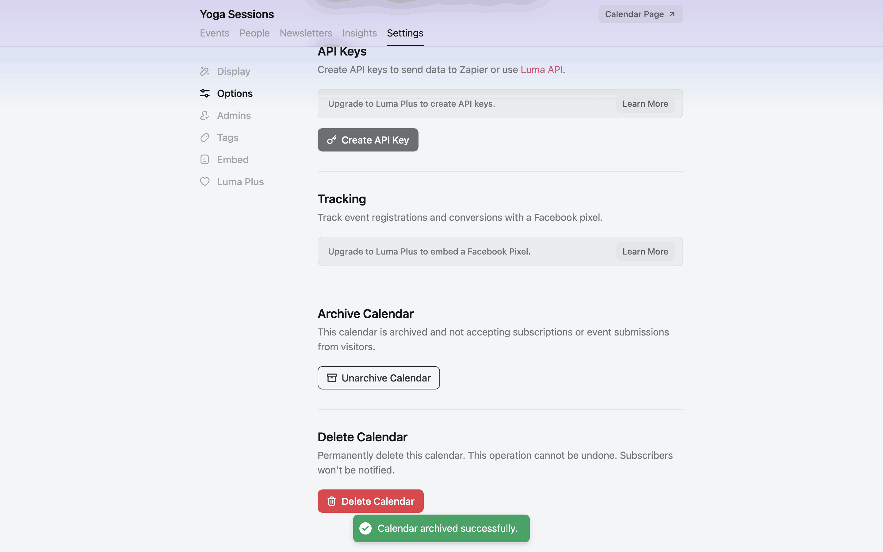 The user archives a calendar by navigating to the settings, confirming the action in a modal, and then viewing the updated settings with a success message. The flow showcases the steps to archive a calendar.