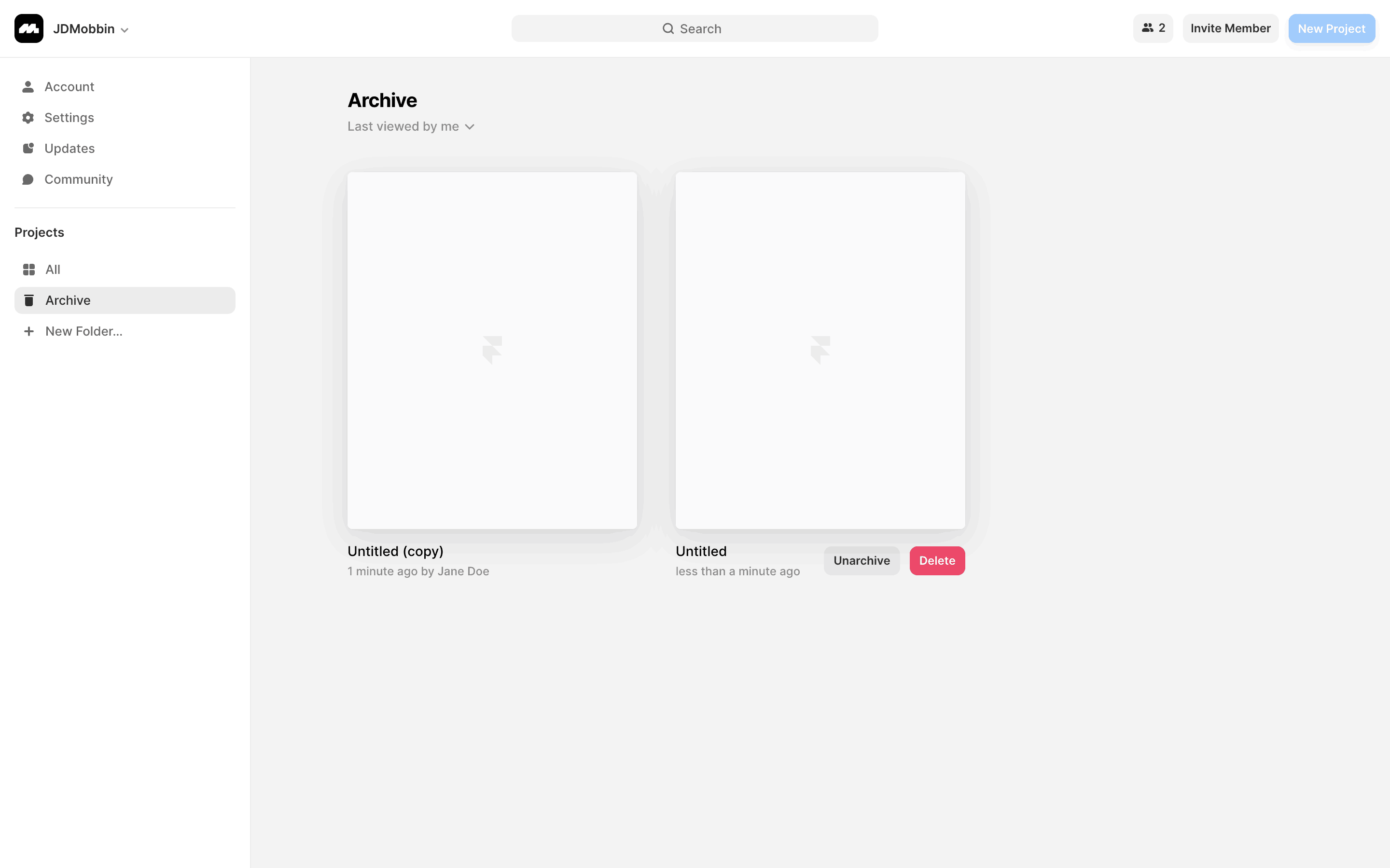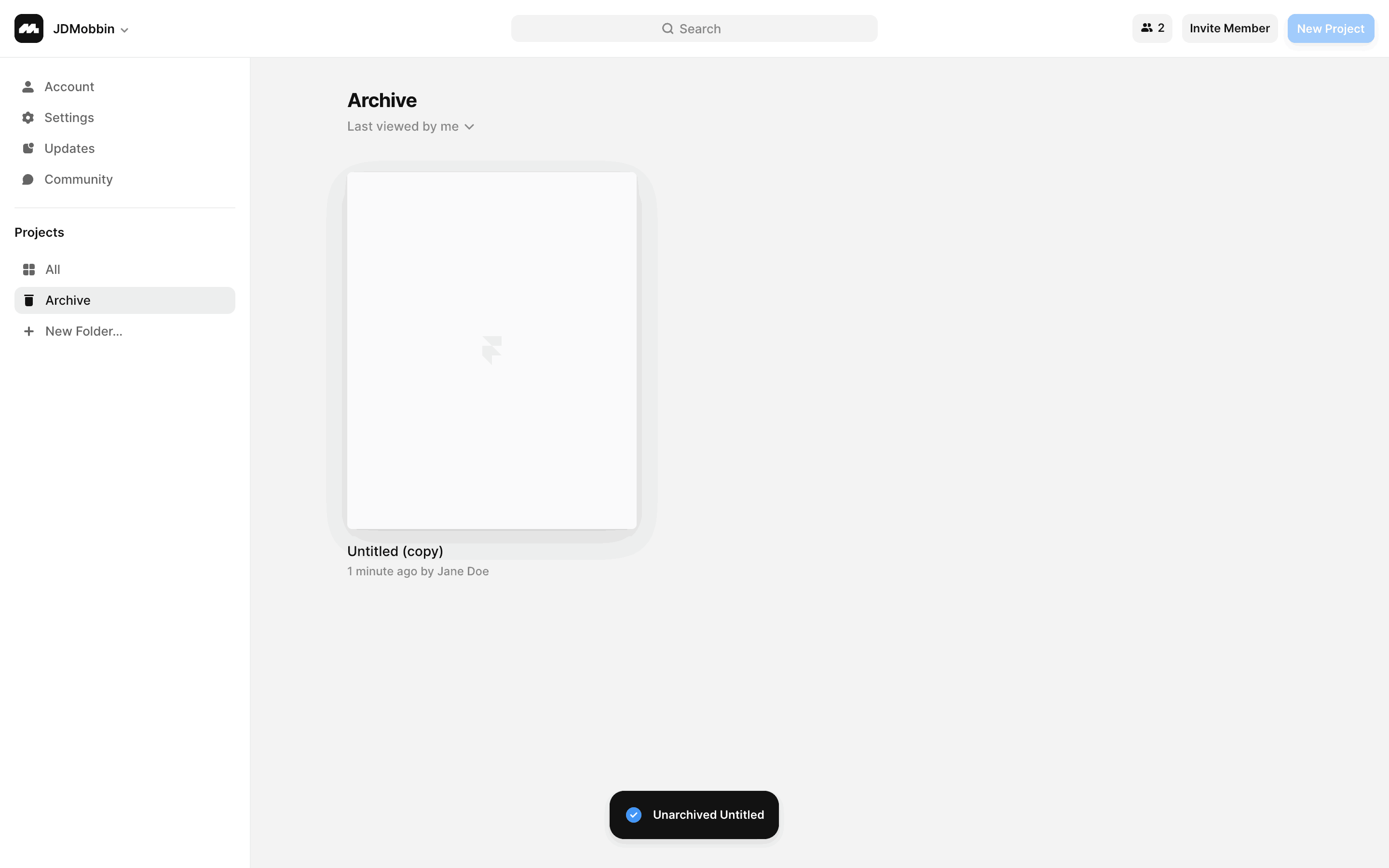 The user navigates to the archive, selects a project, and unarchives it. A confirmation message appears after the project is unarchived.
