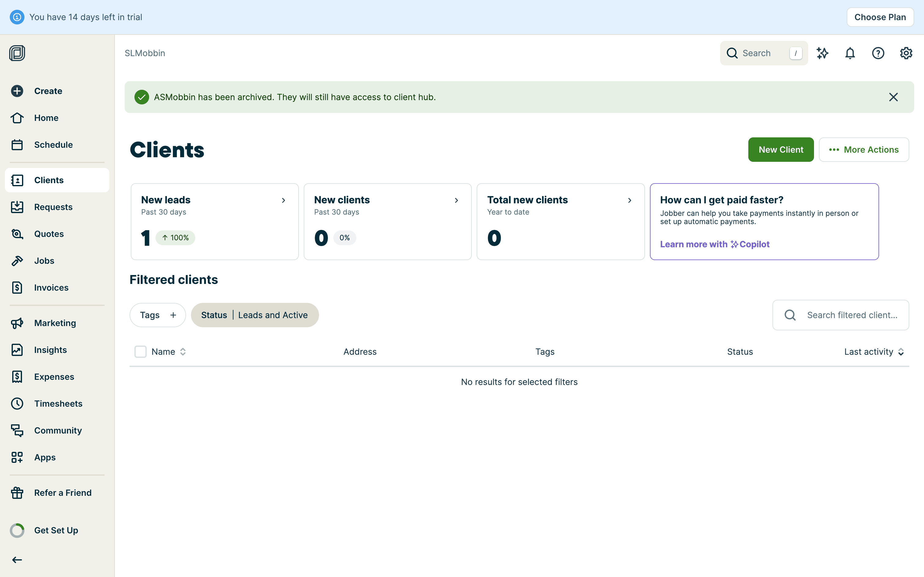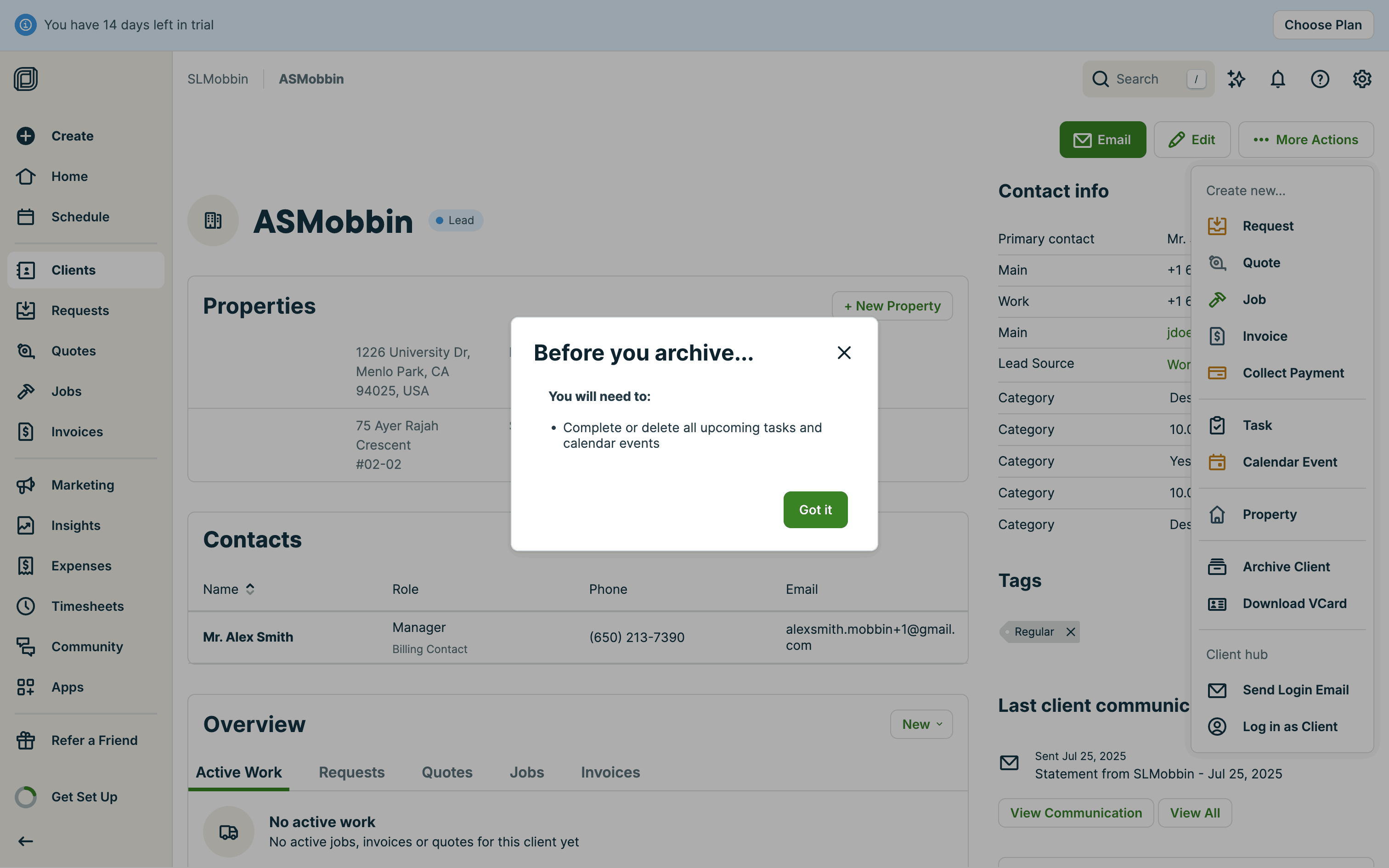 The user navigates to a client's details, initiates the archiving process, confirms it, and receives confirmation on the clients page. The main action is archiving a client.