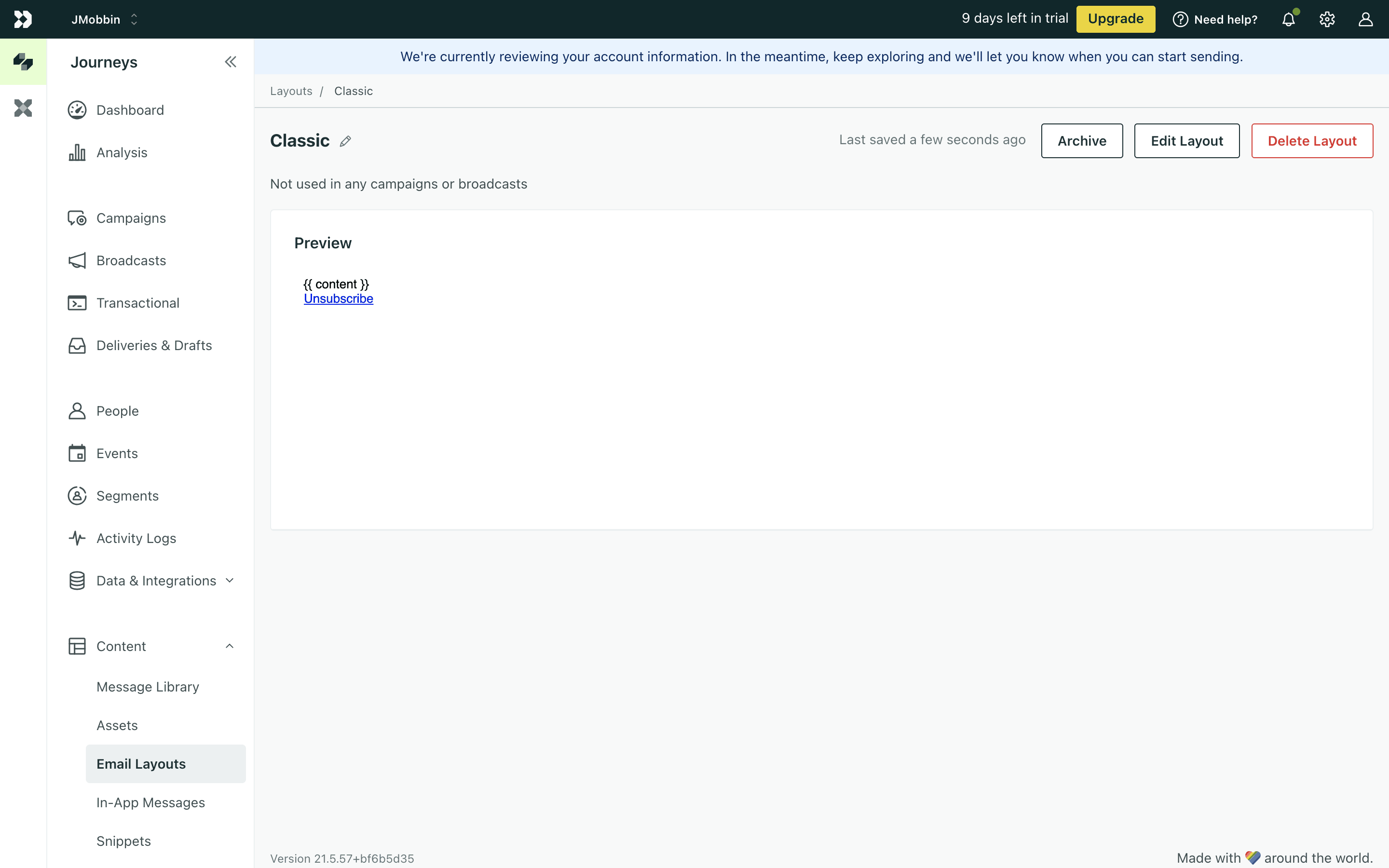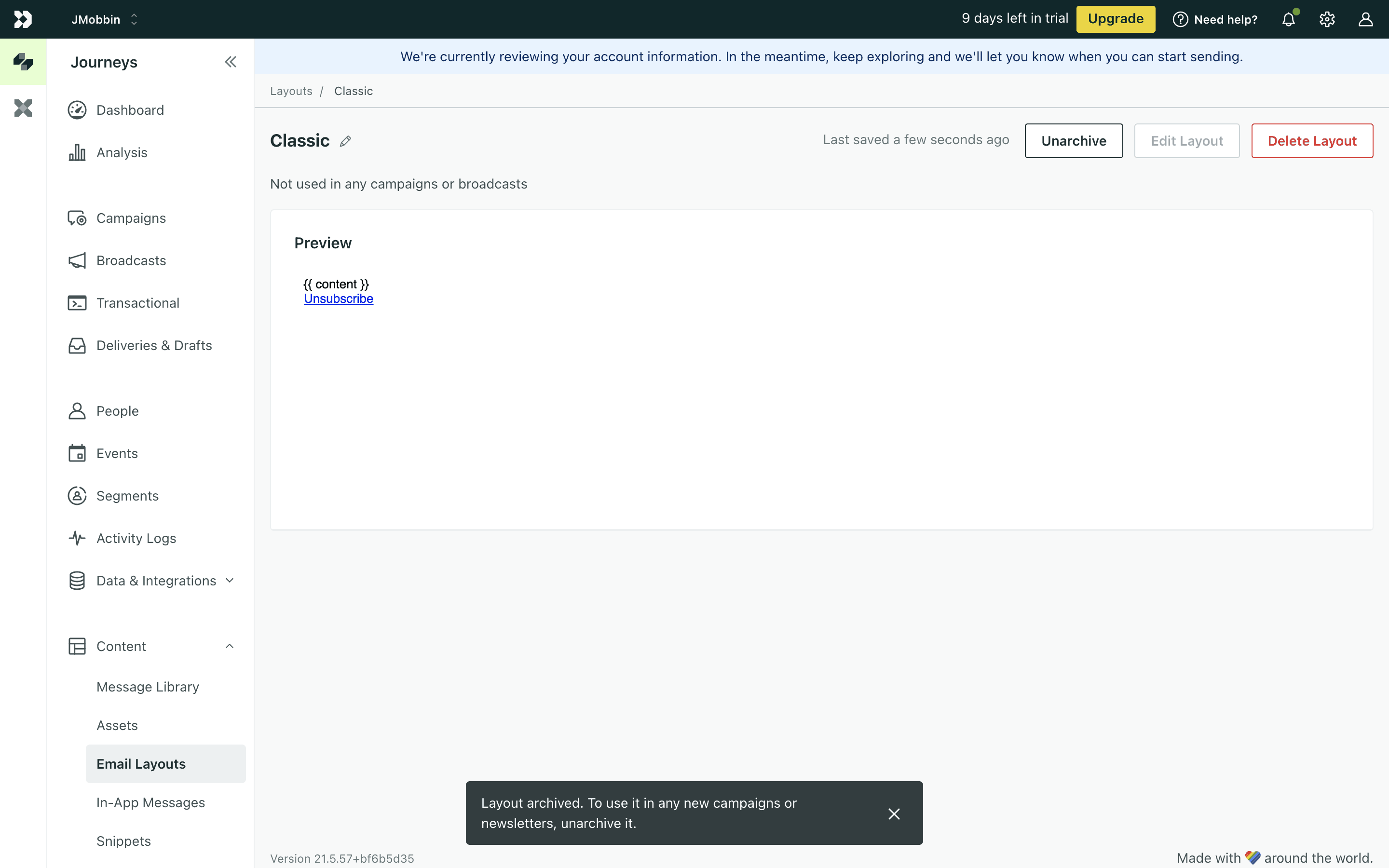 The user views a layout's details and then archives it. The UI confirms the action and provides an option to unarchive.
