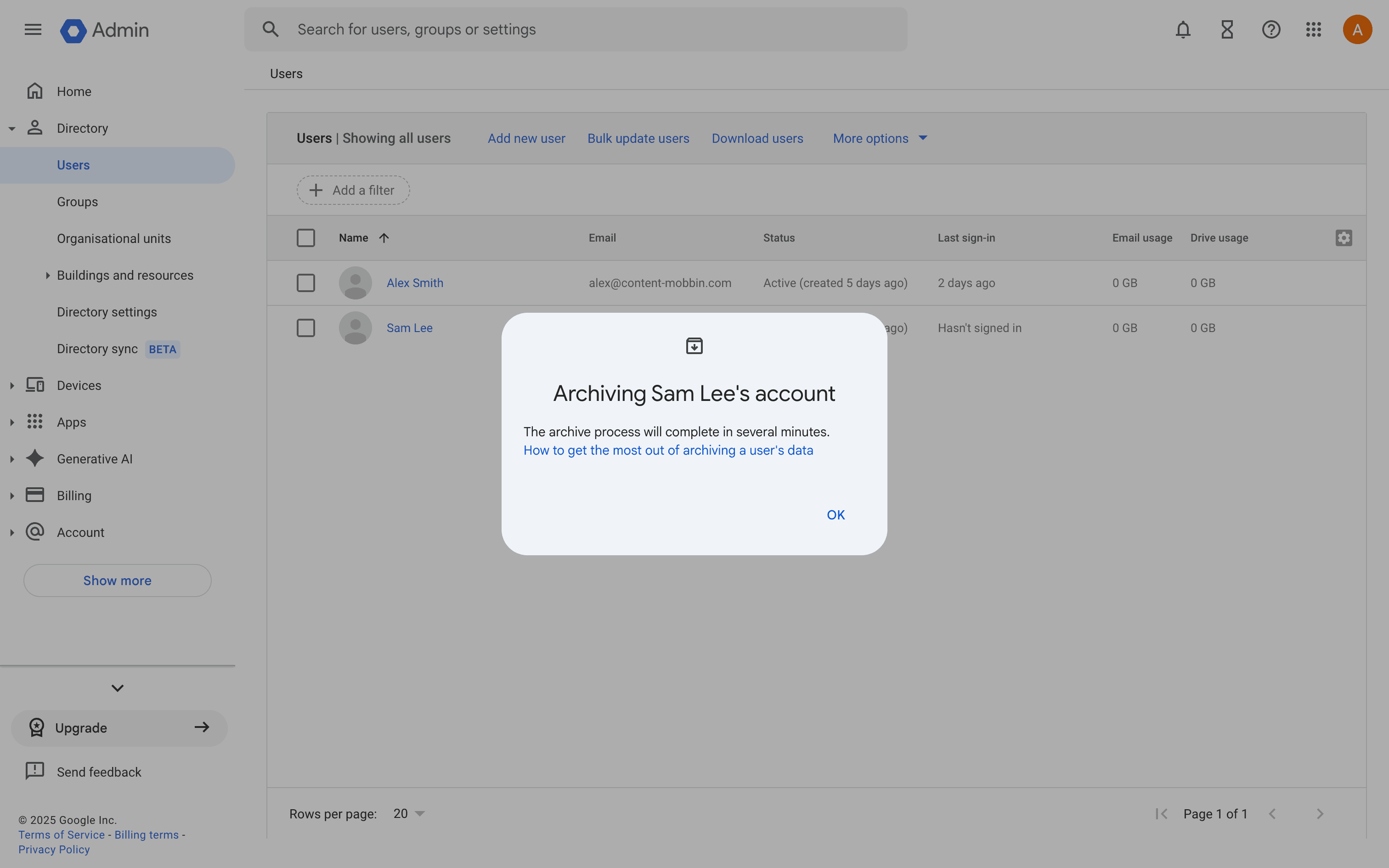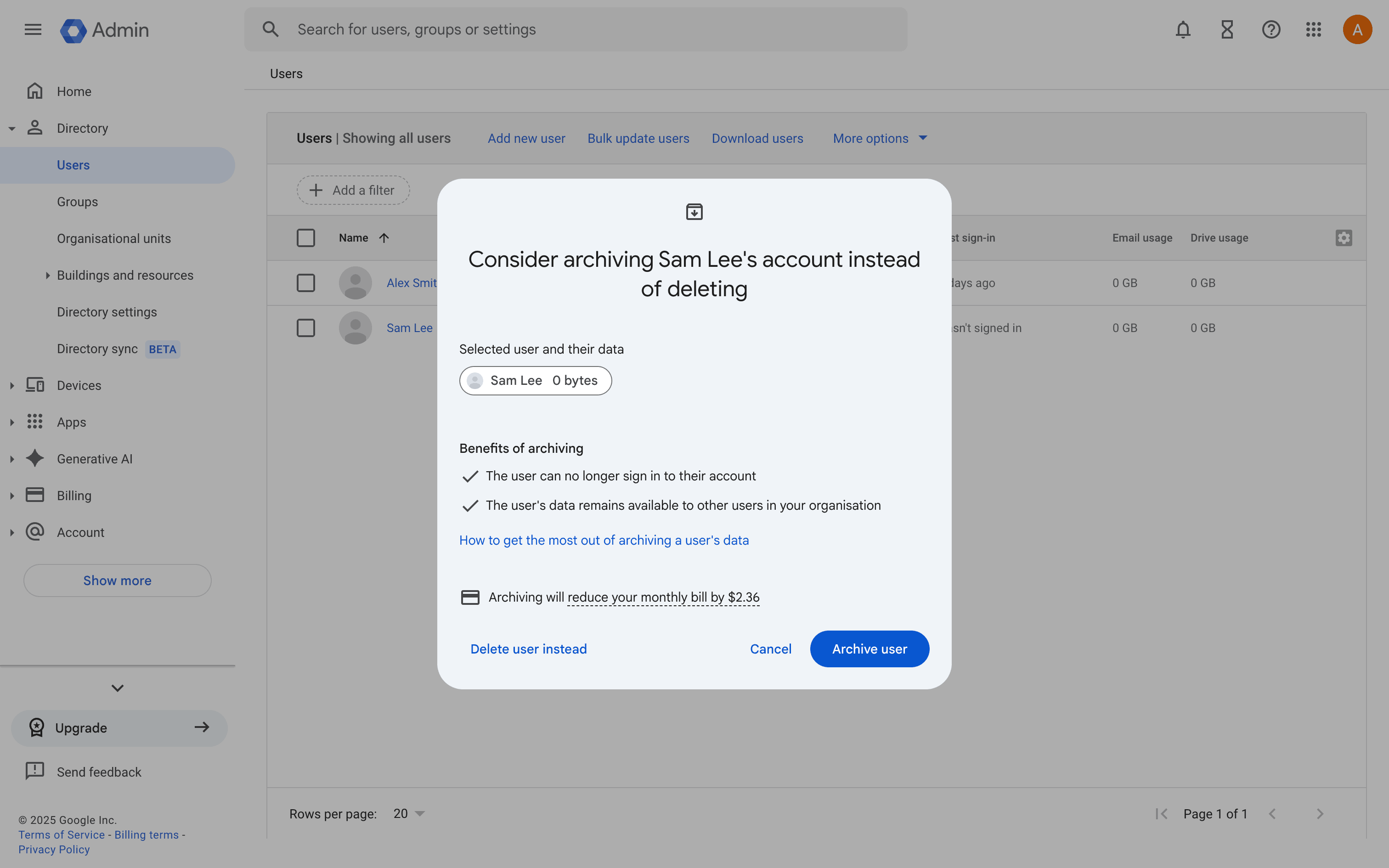 The user flow guides the user to archive a user account instead of deleting it. It confirms the start of the archiving process.