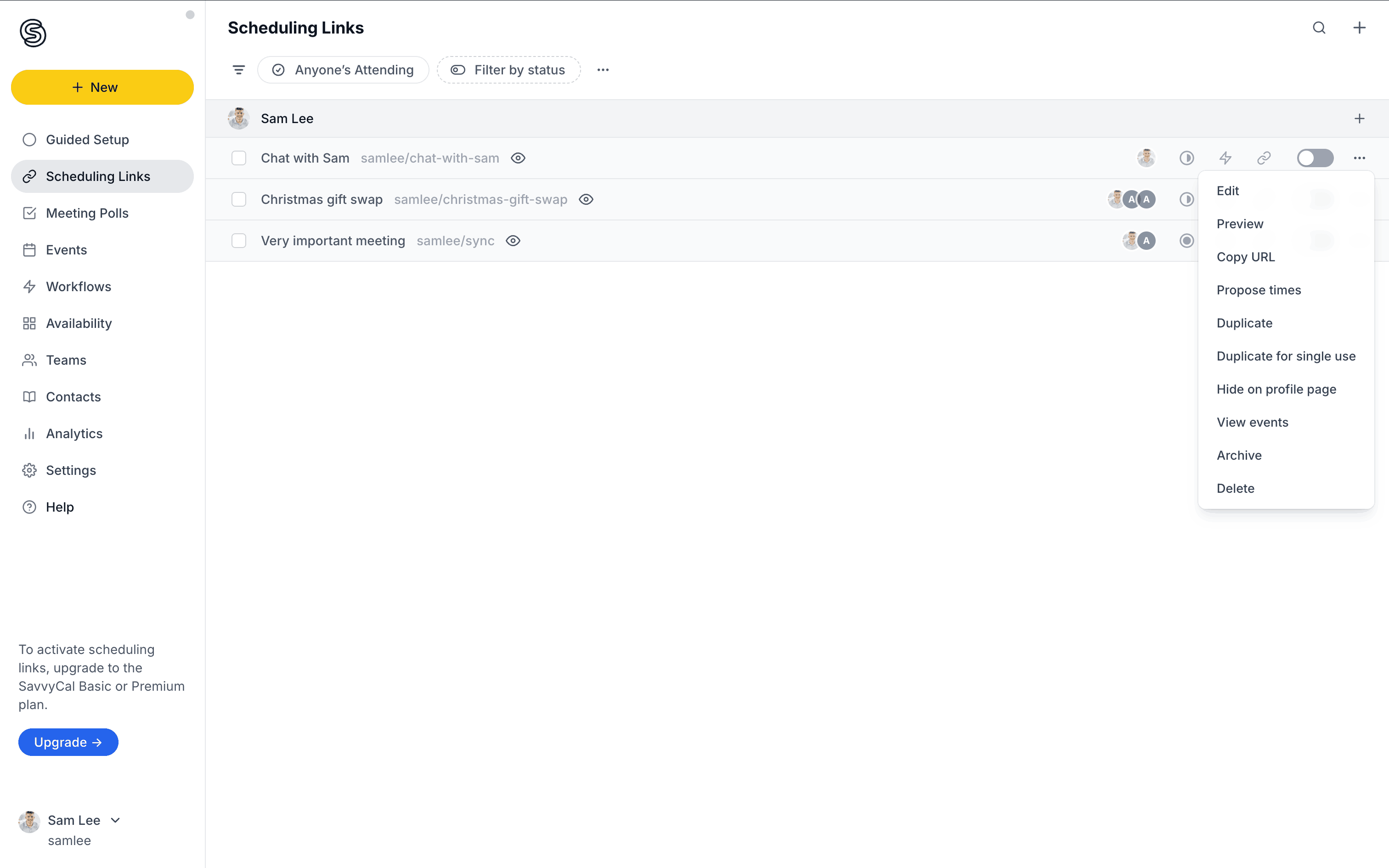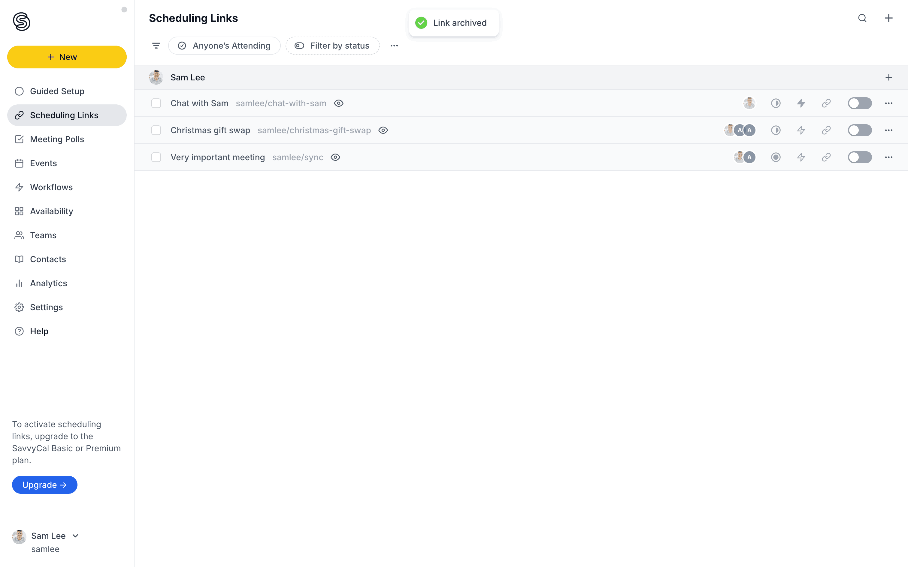 The user navigates to the scheduling links list, archives a link, and receives confirmation. The flow demonstrates archiving a scheduling link.
