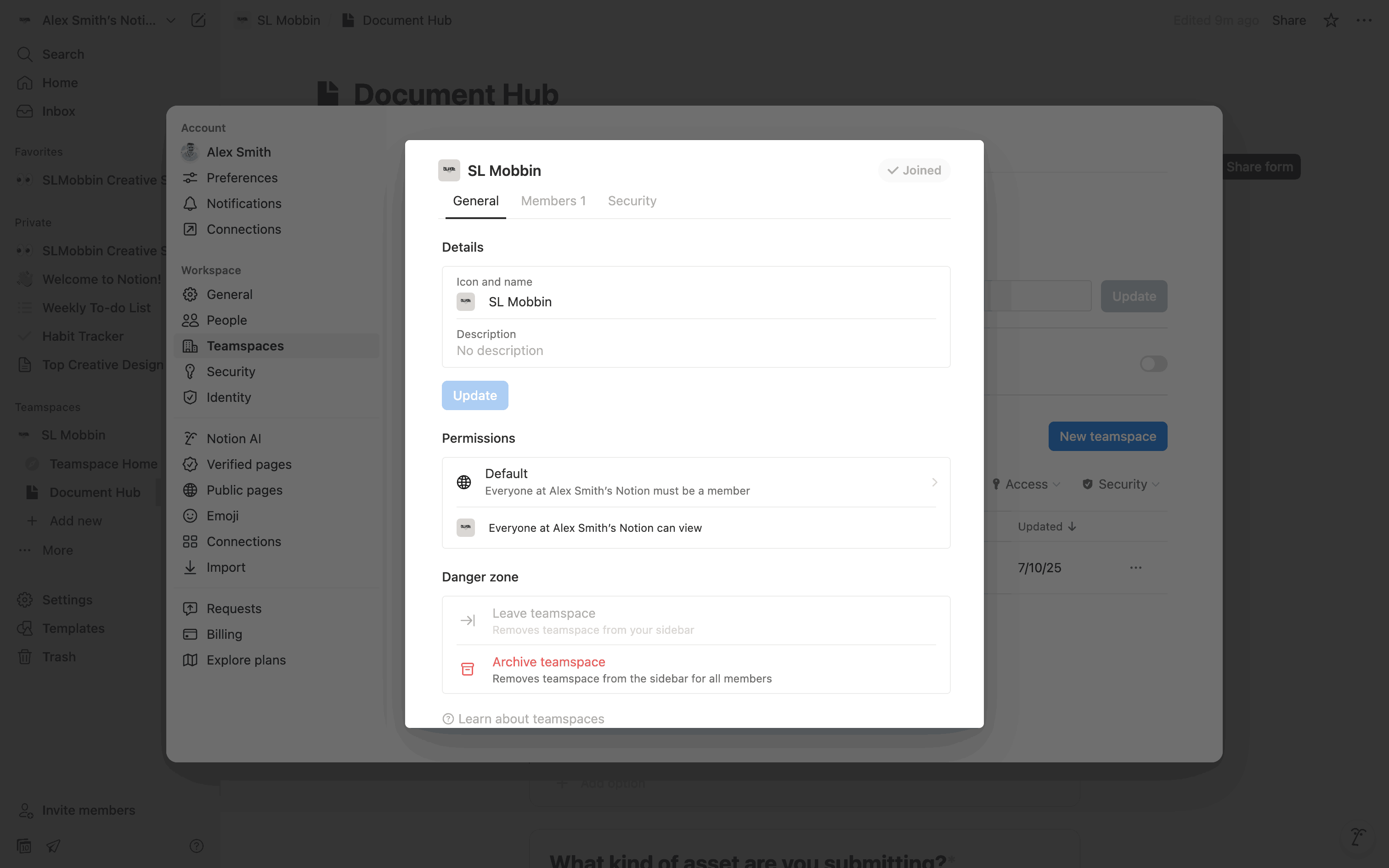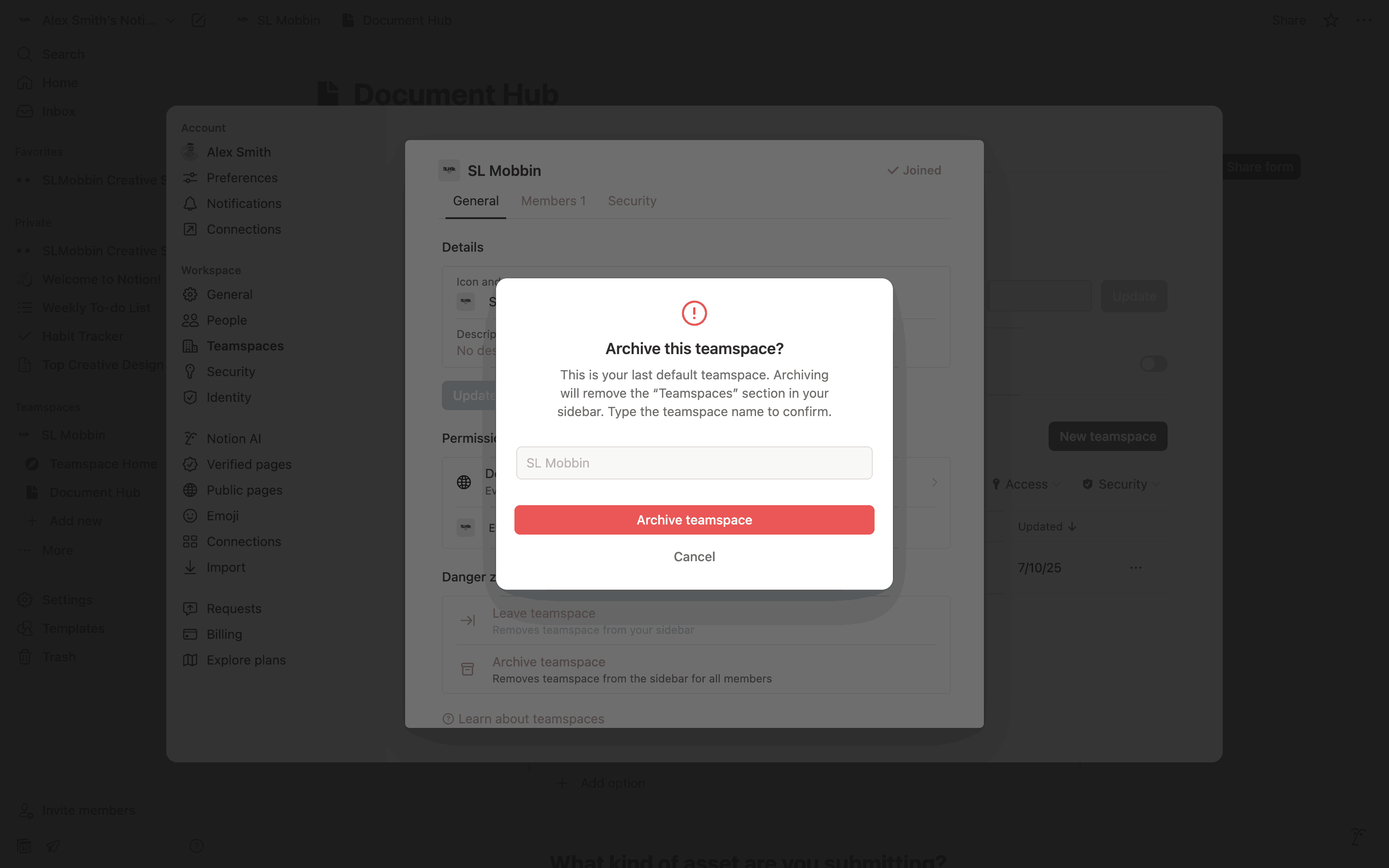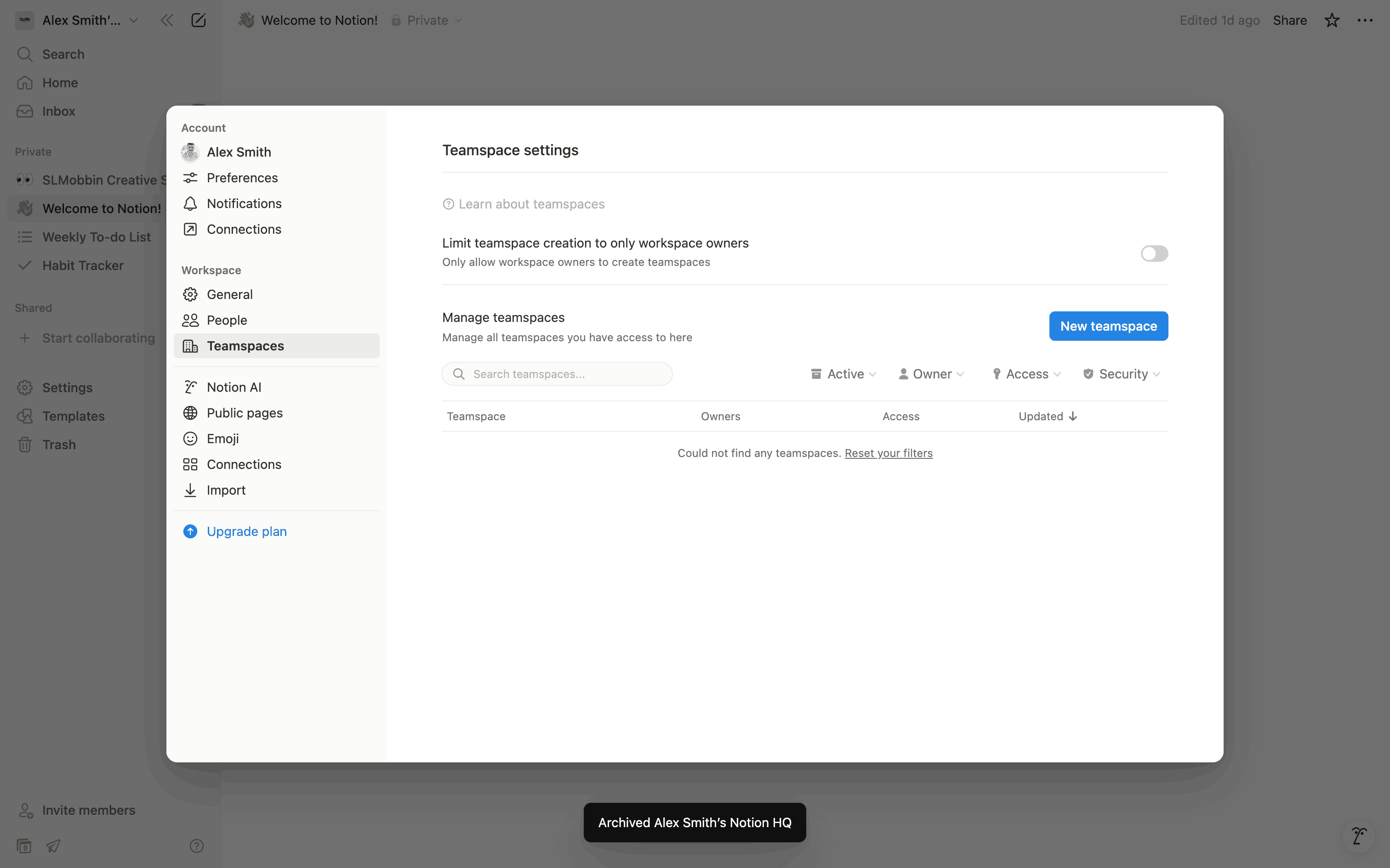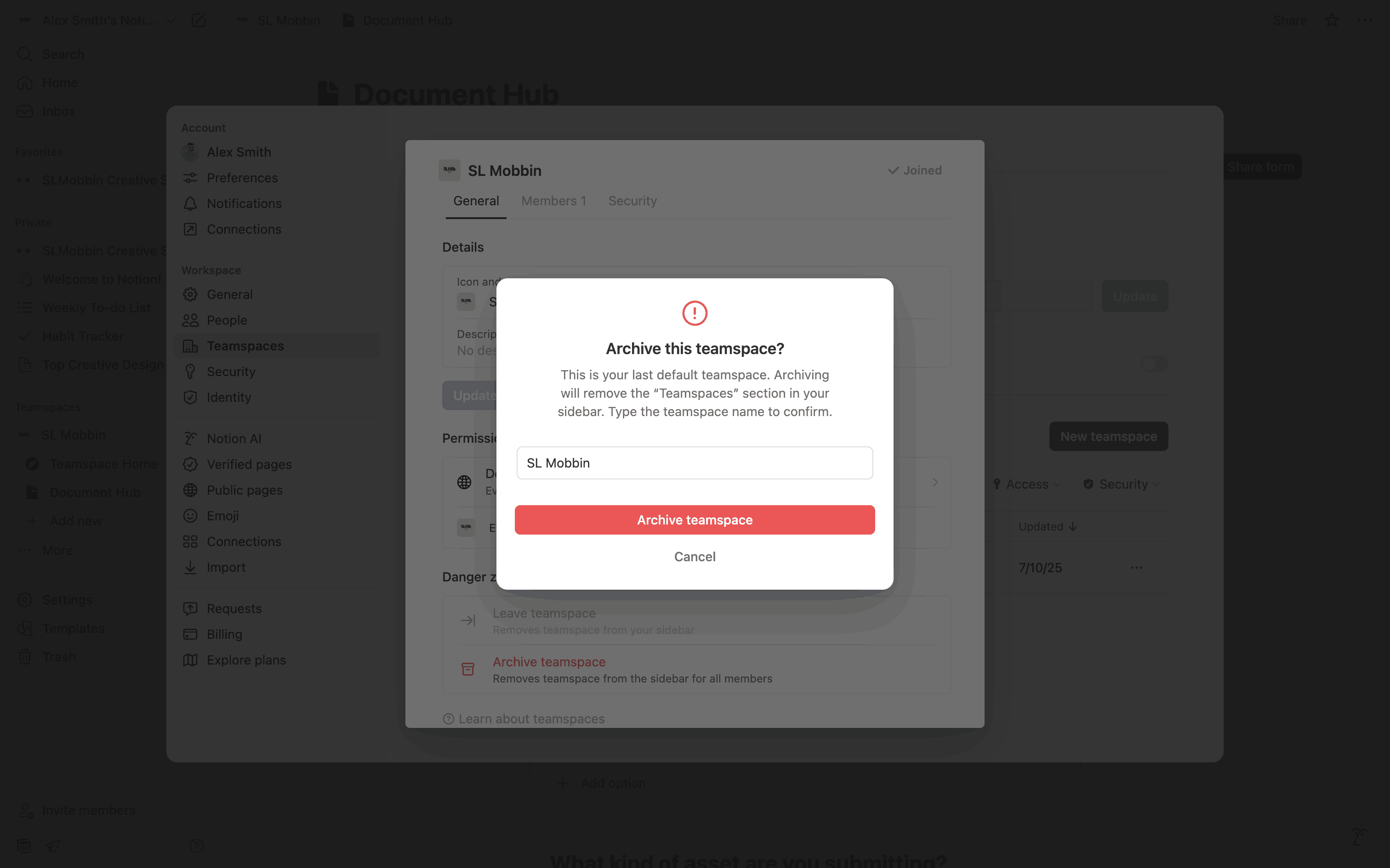 The user archives a teamspace by confirming the action in a modal. The teamspace is then removed from the teamspaces list.