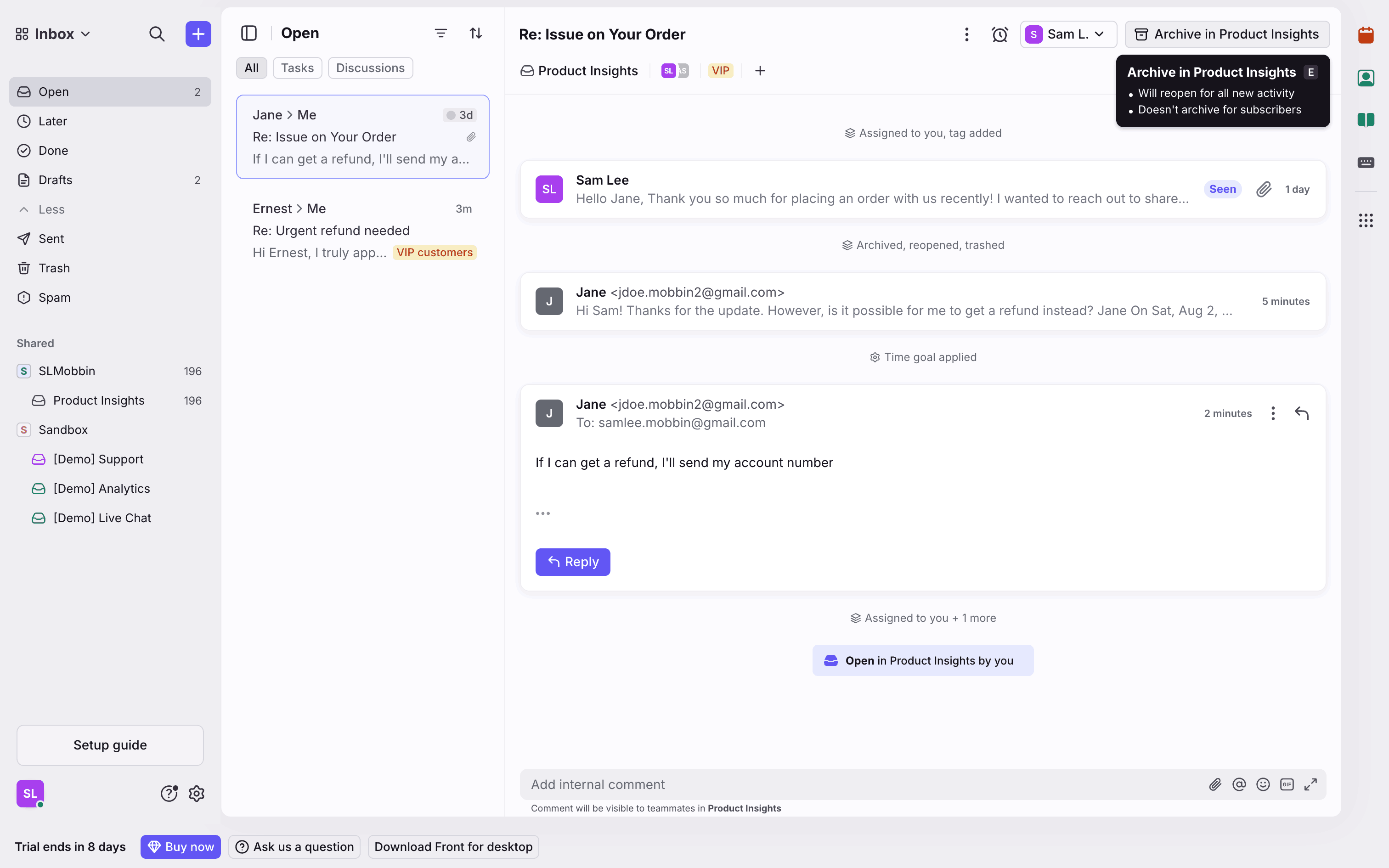 The user archives an email conversation. They select an email, choose an archive option, and receive confirmation.