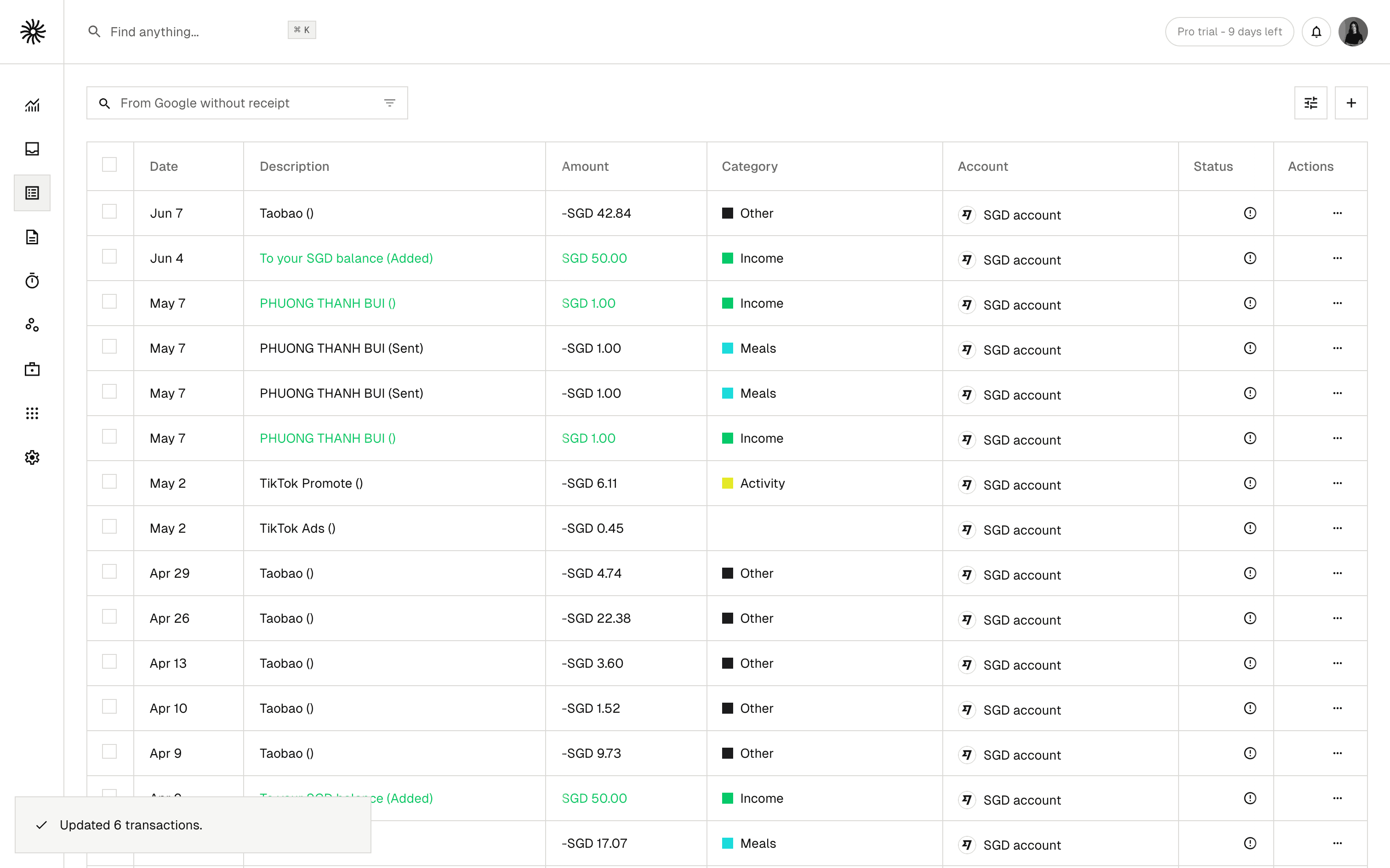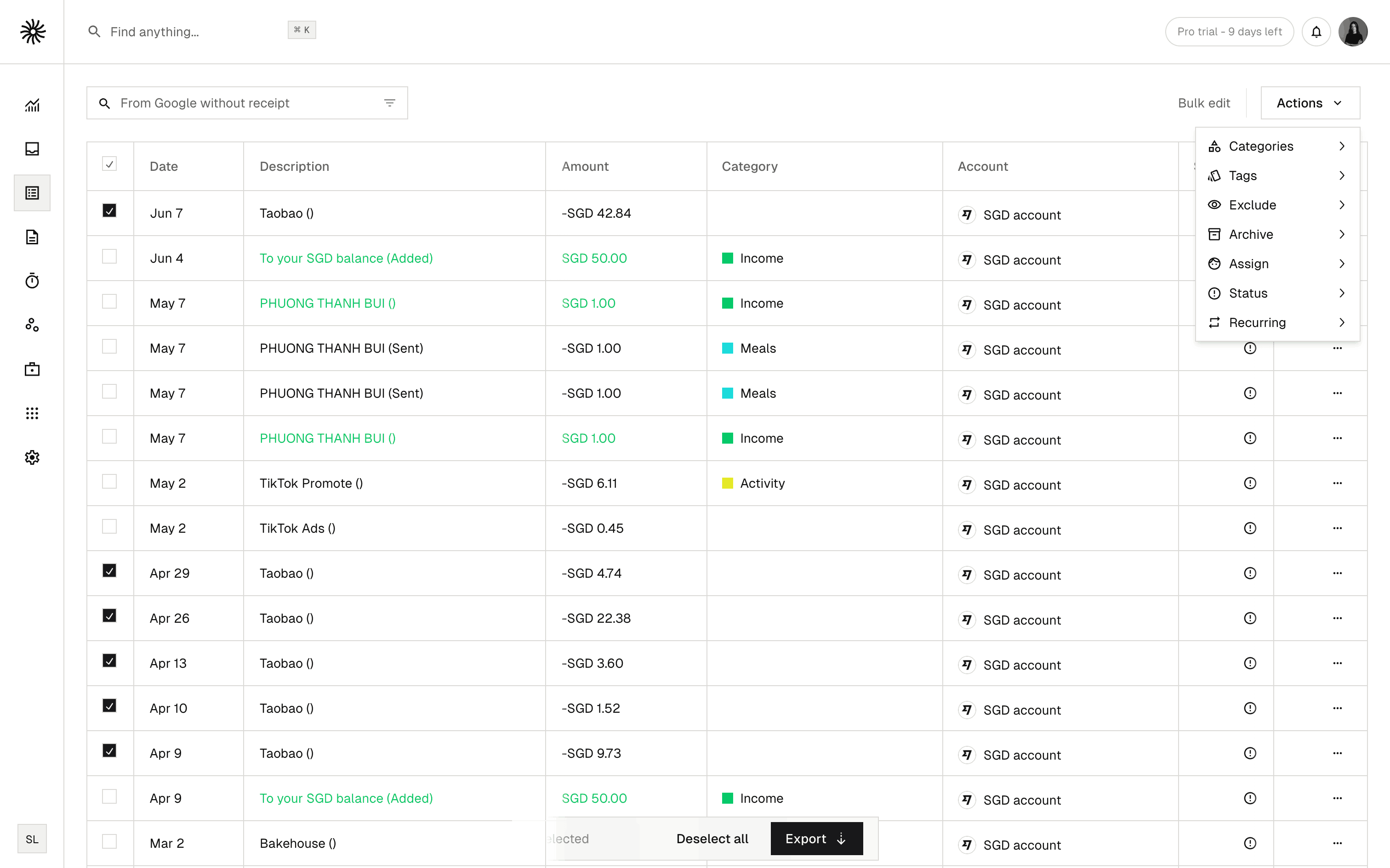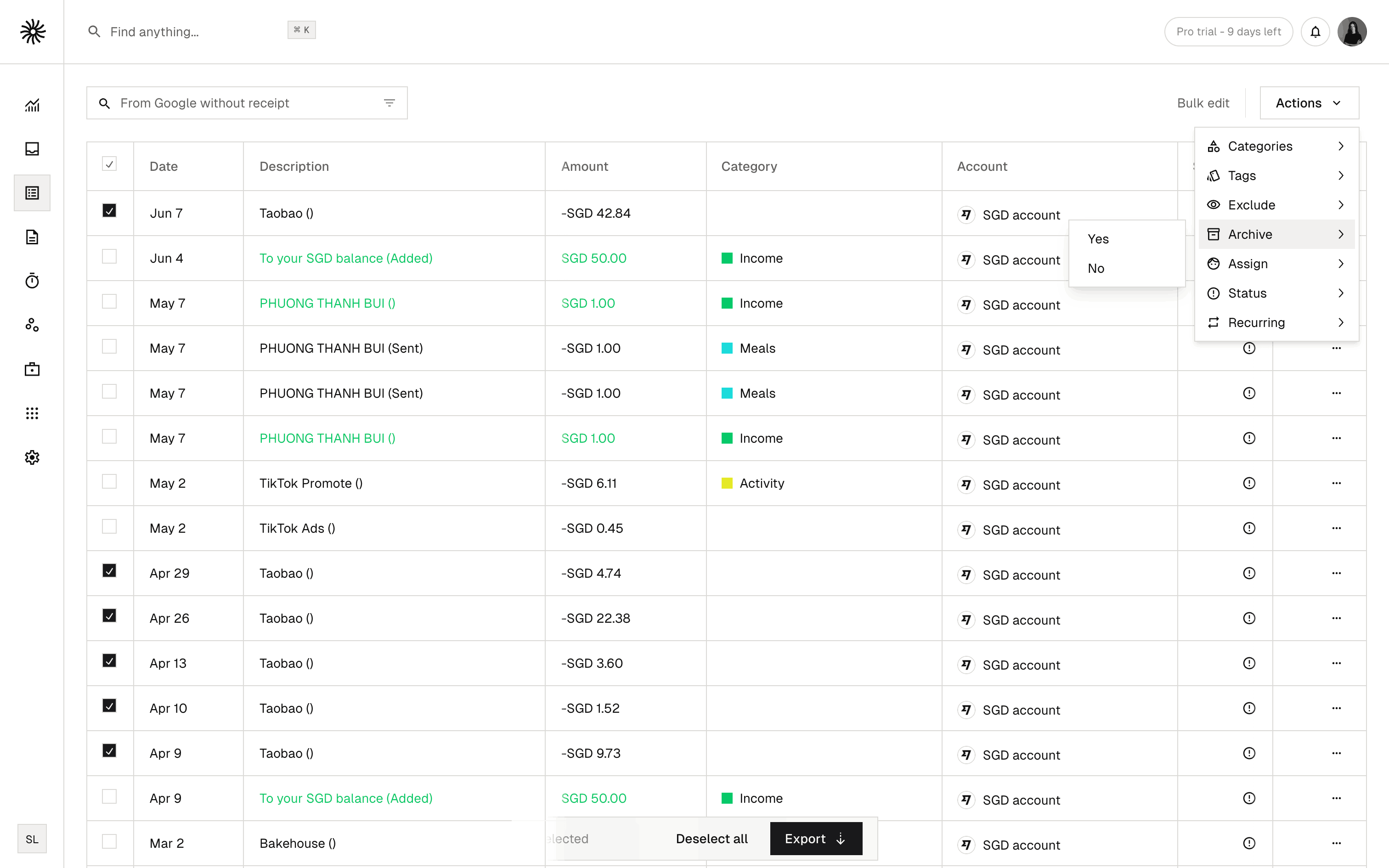 The user opens a transaction table, selects the archive action, and then sees the updated table. The goal is to archive transactions.