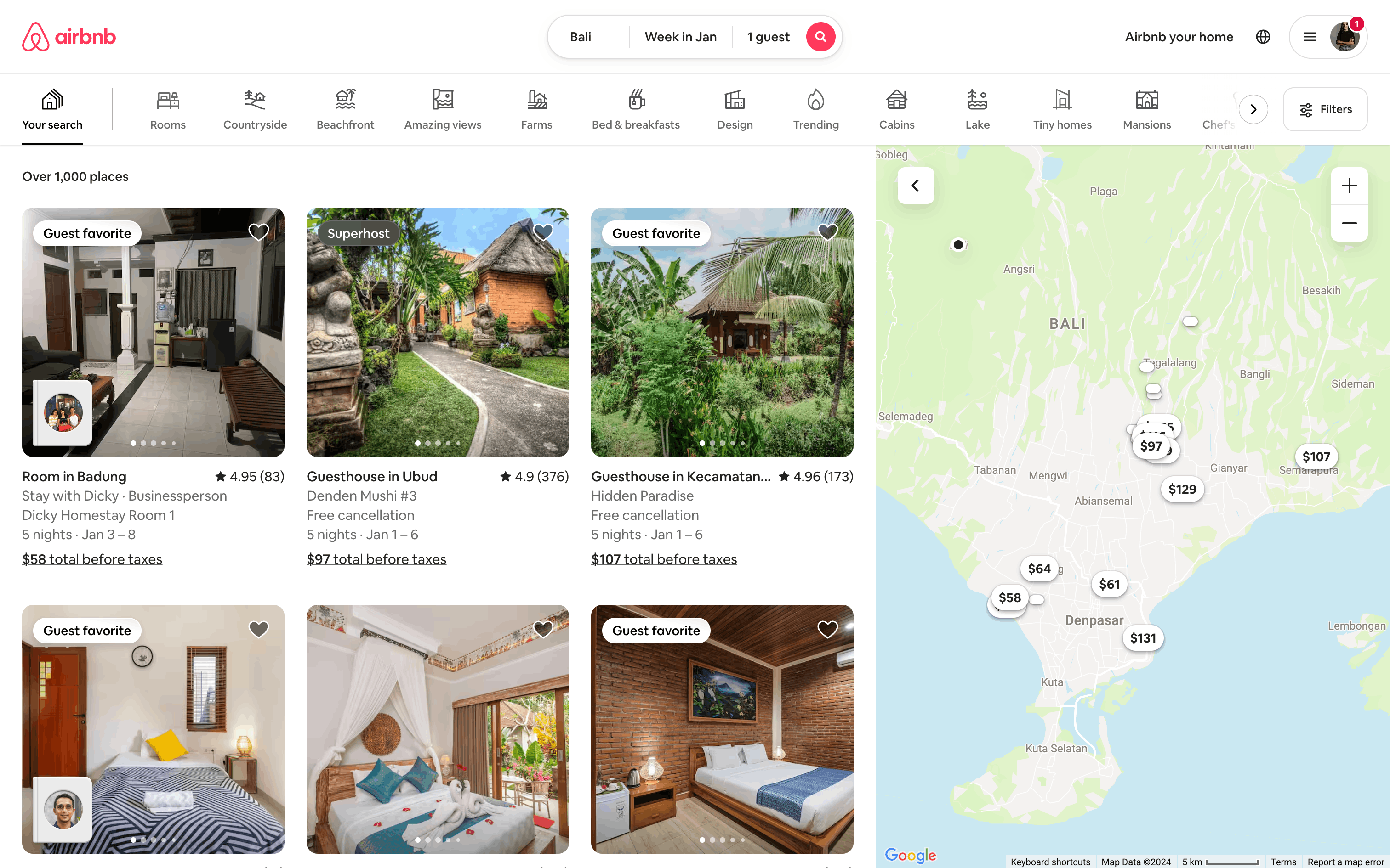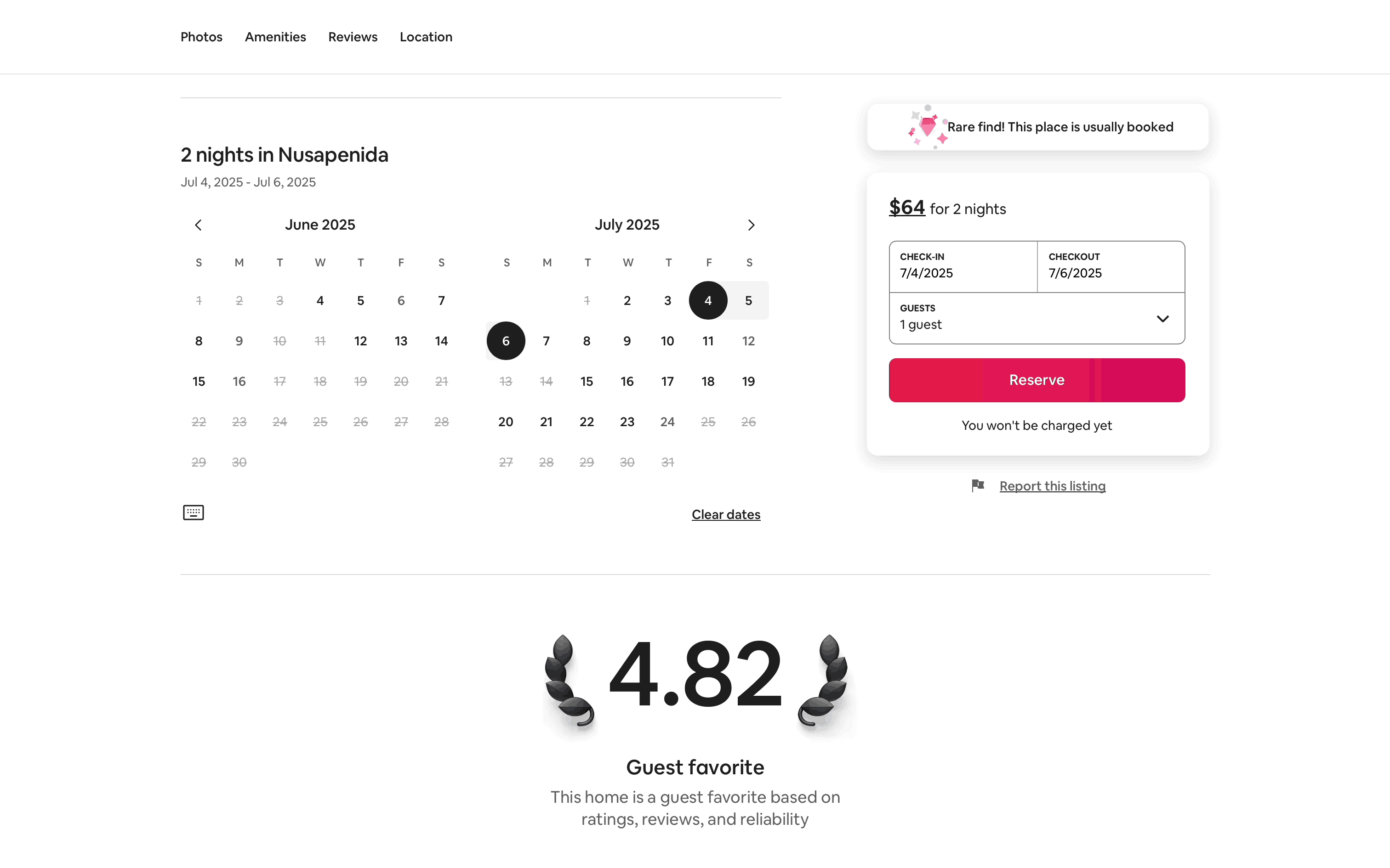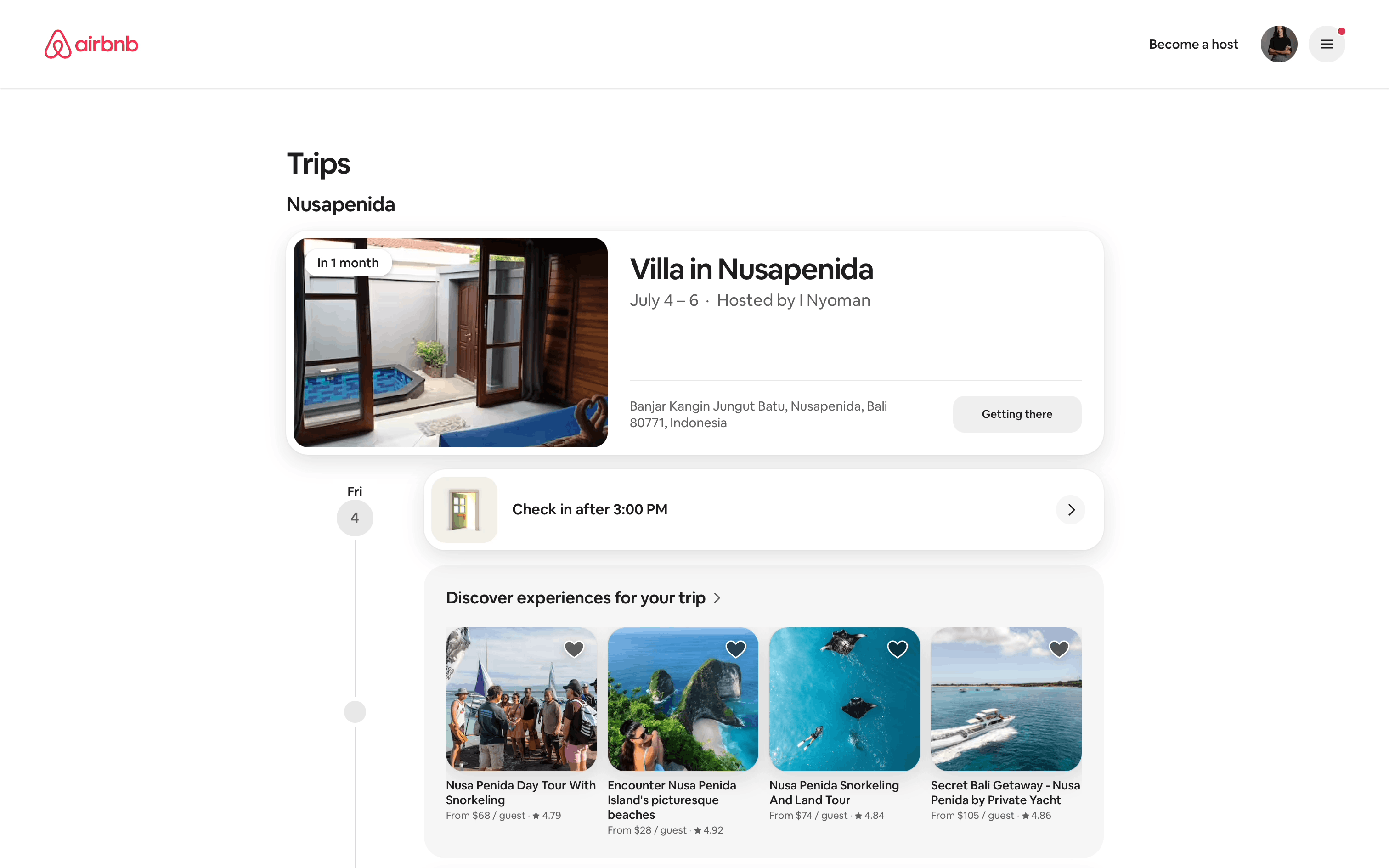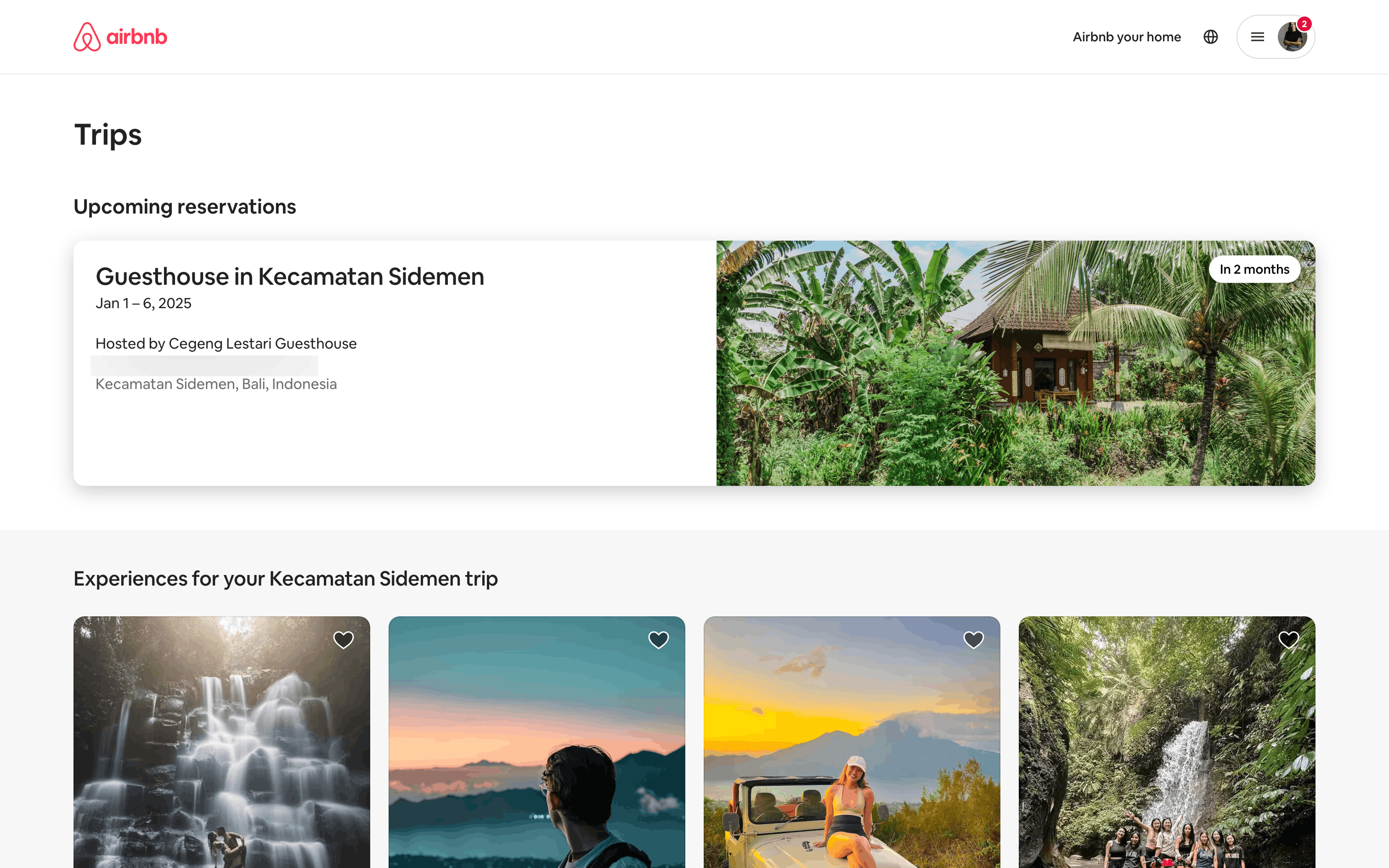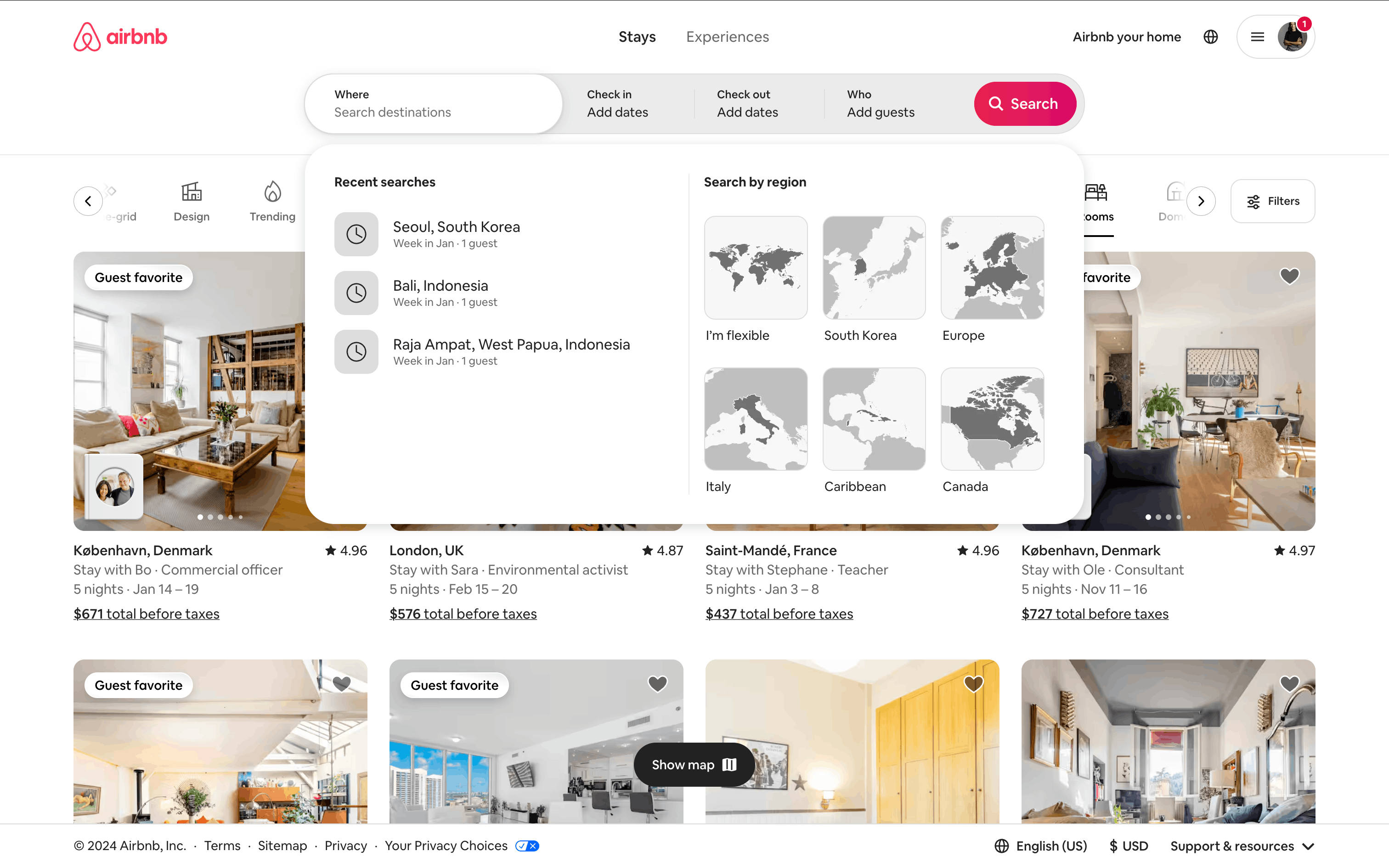 The user searches for and reserves a stay, entering payment information and confirming their booking. The final step shows the pending reservation in the 'Trips' section.
