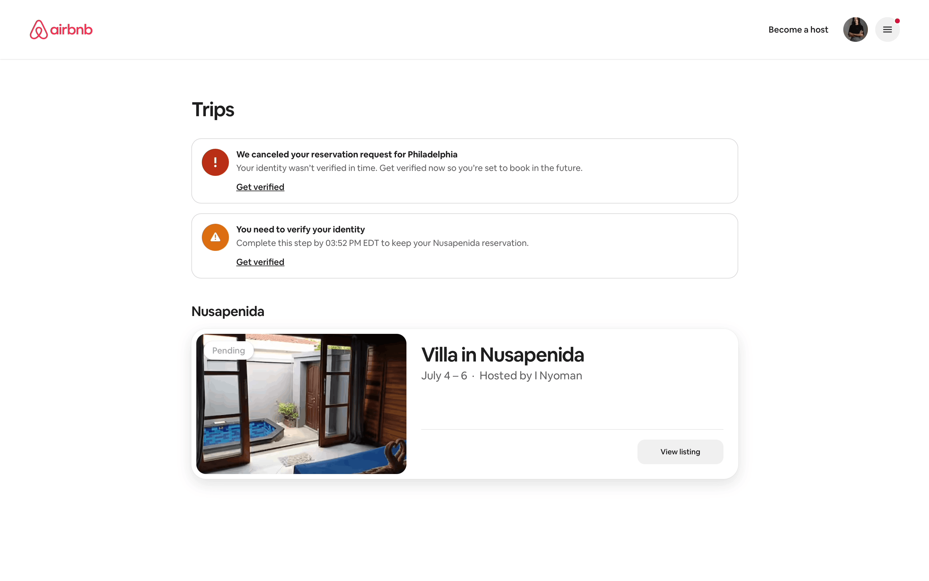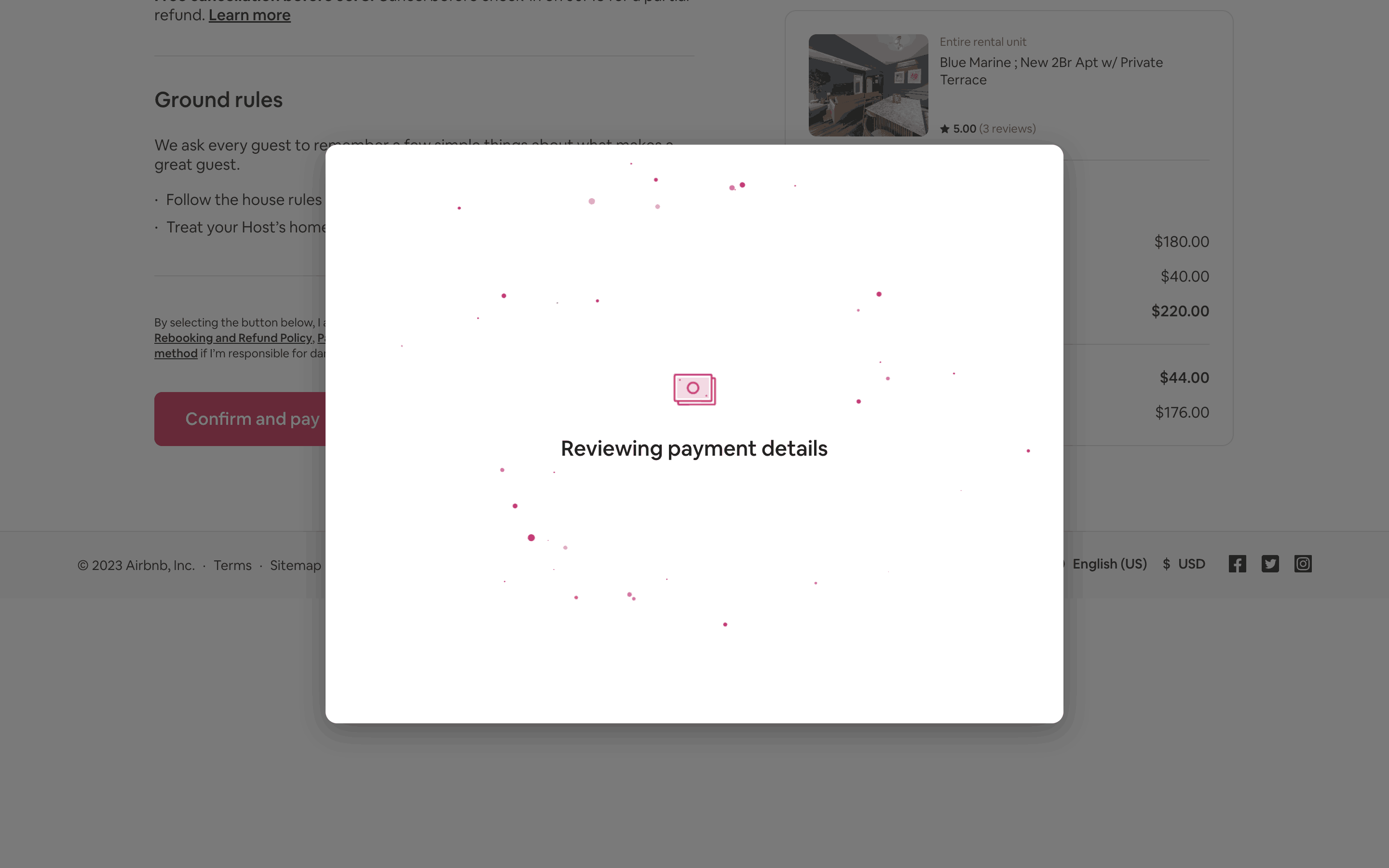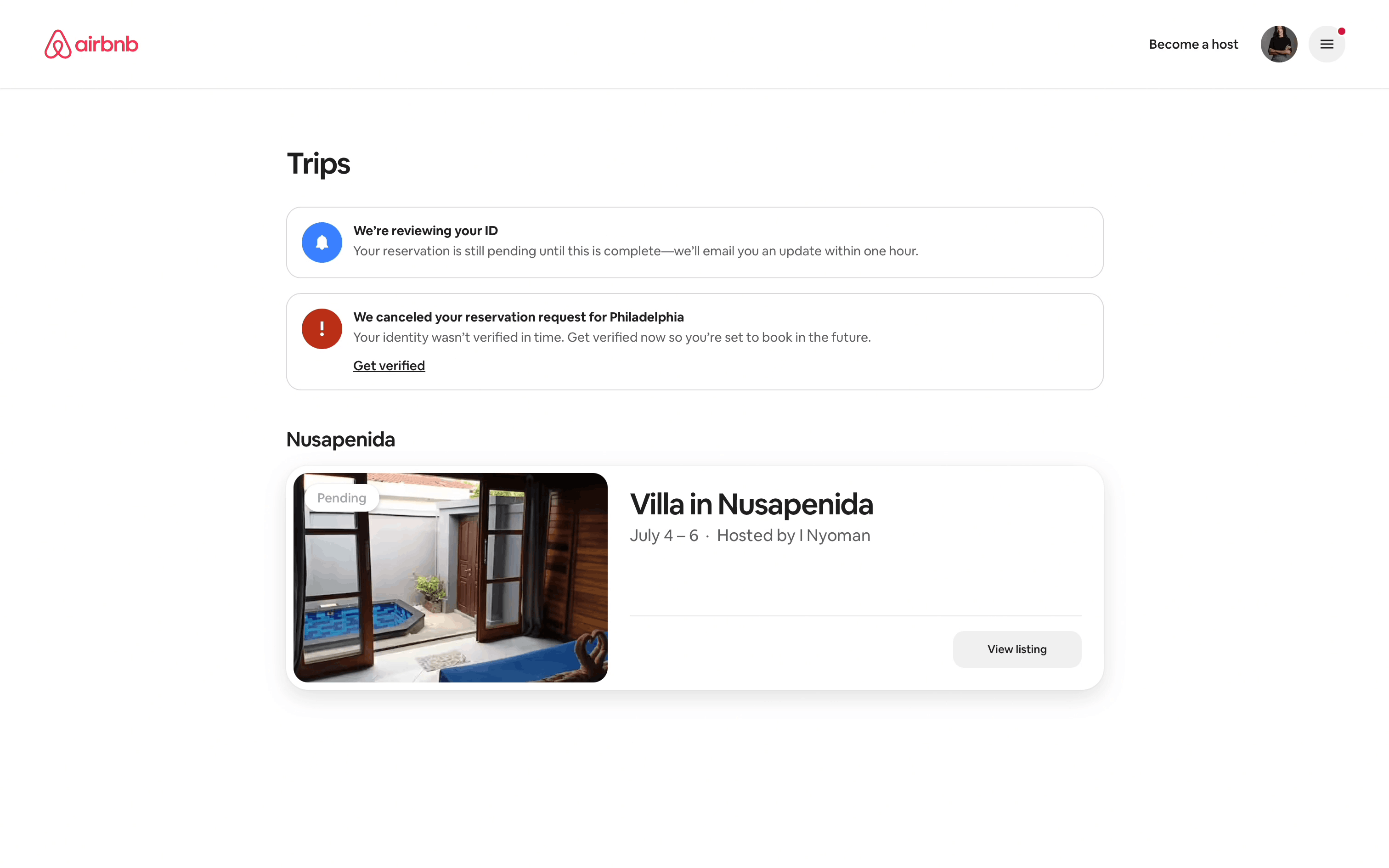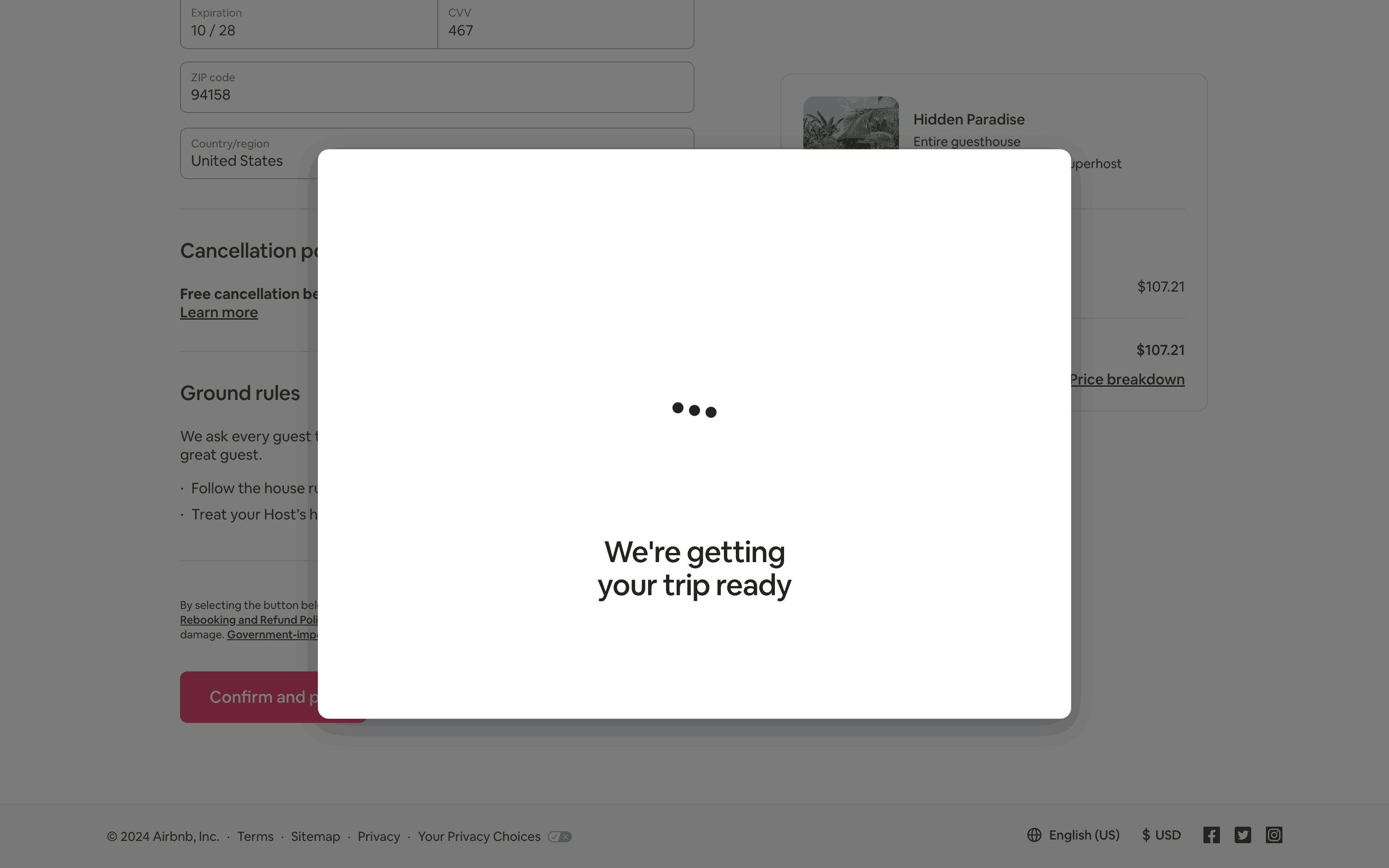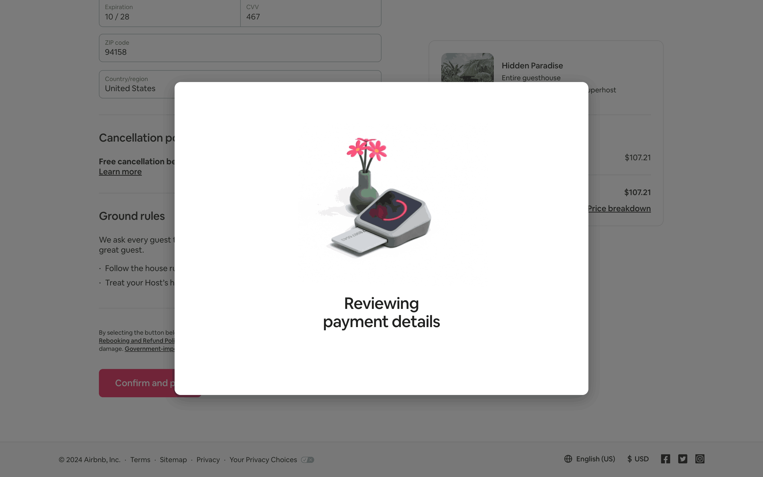 The user books a home, enters payment information, and verifies their identity. The flow ends with a confirmed reservation.