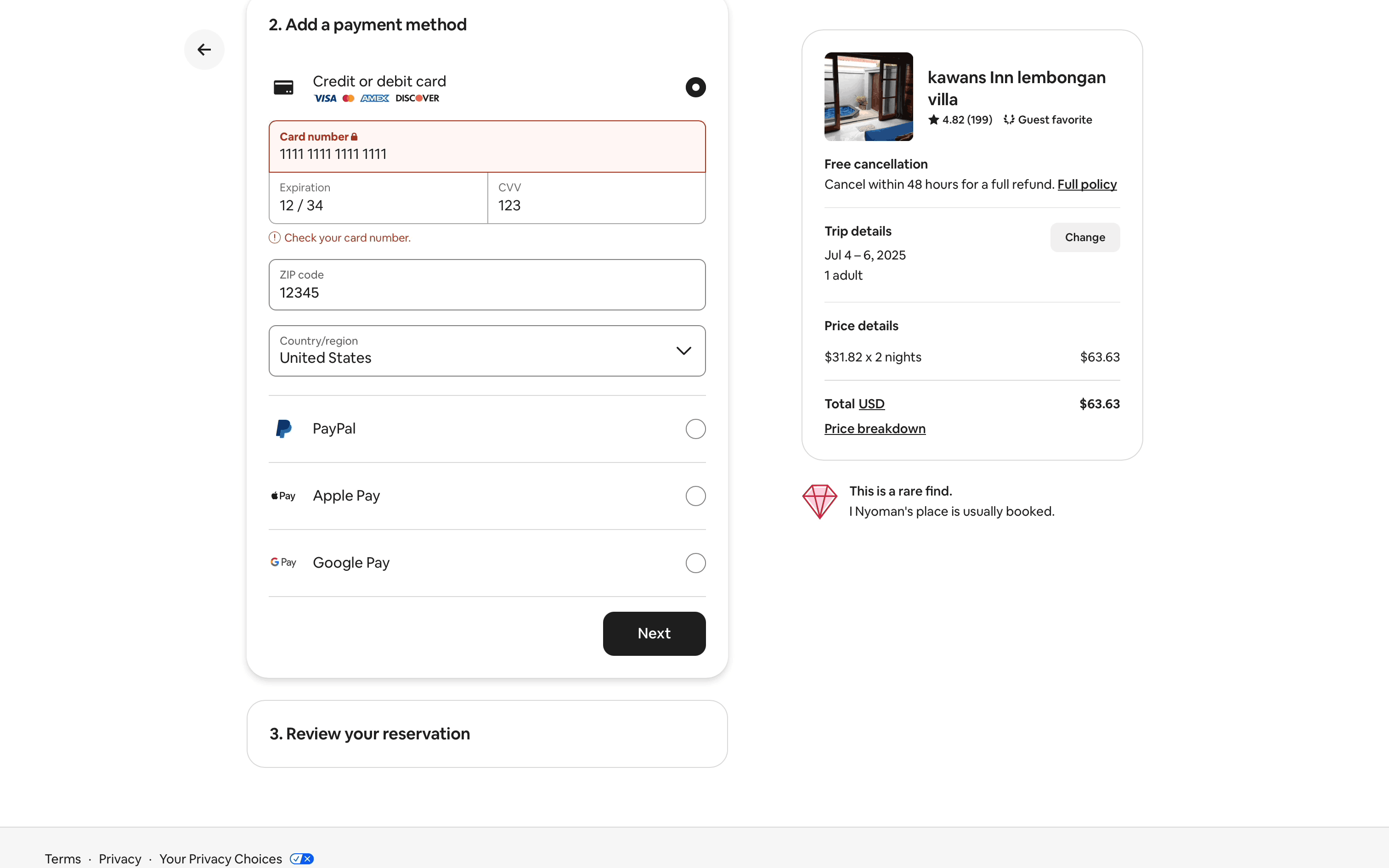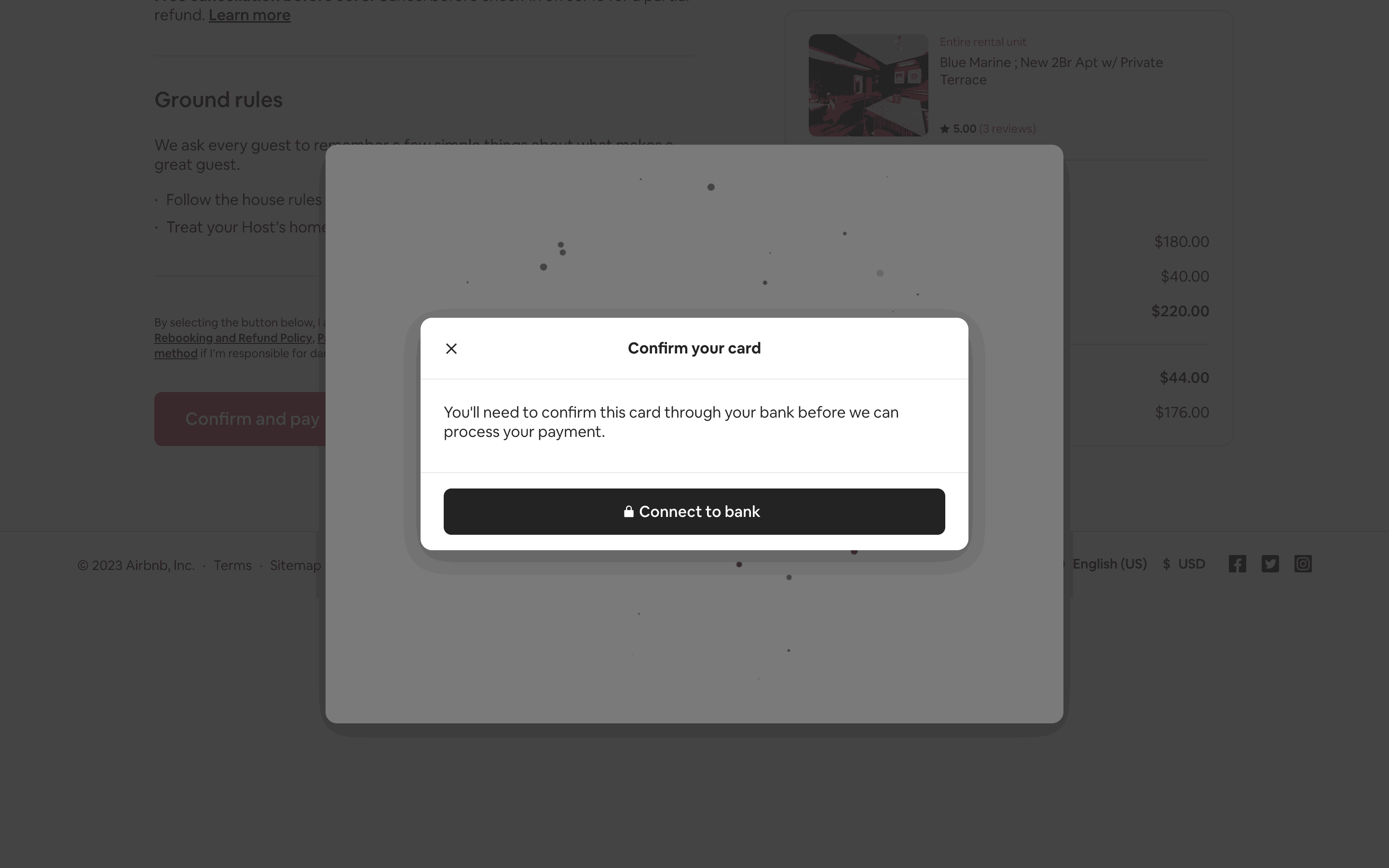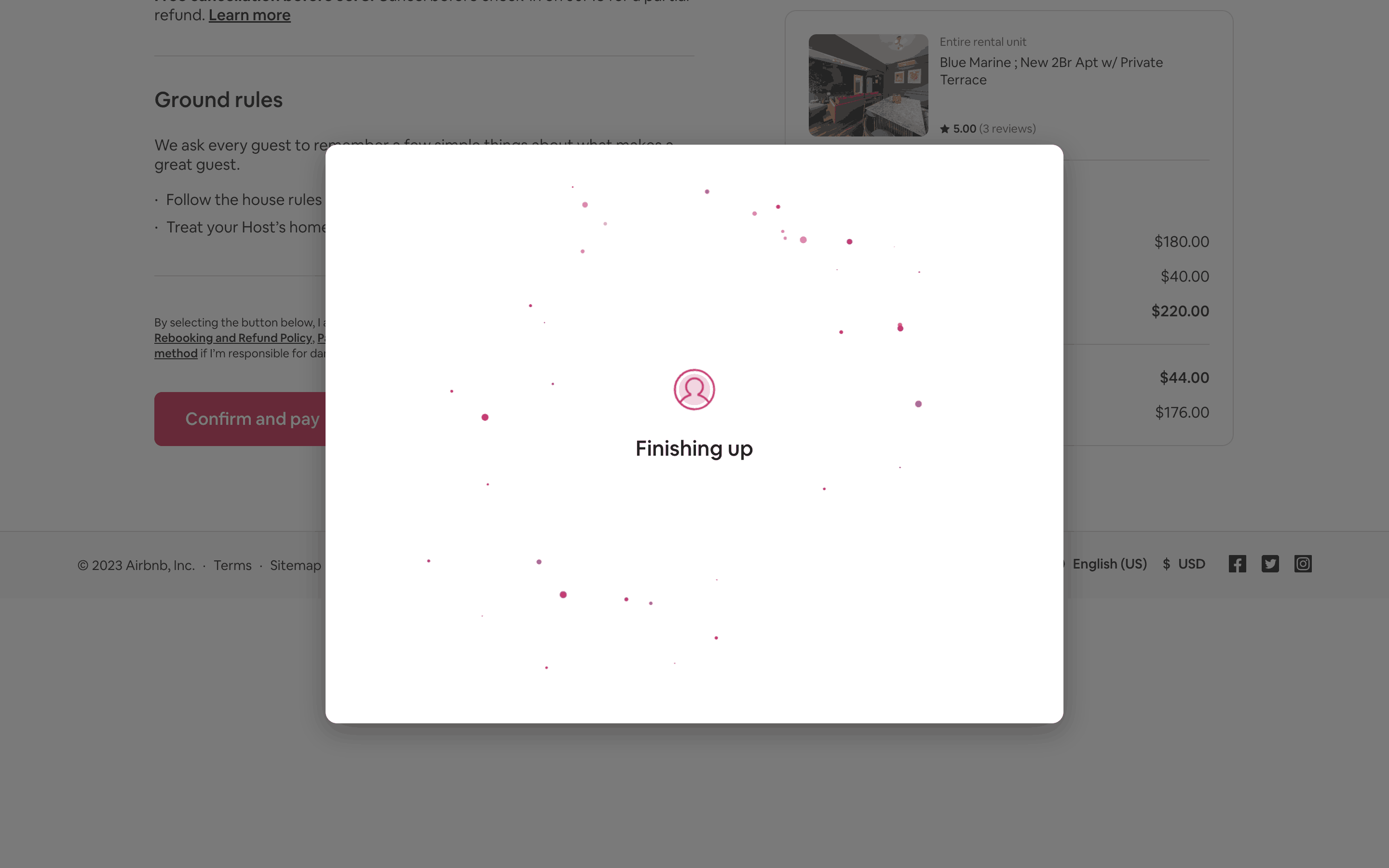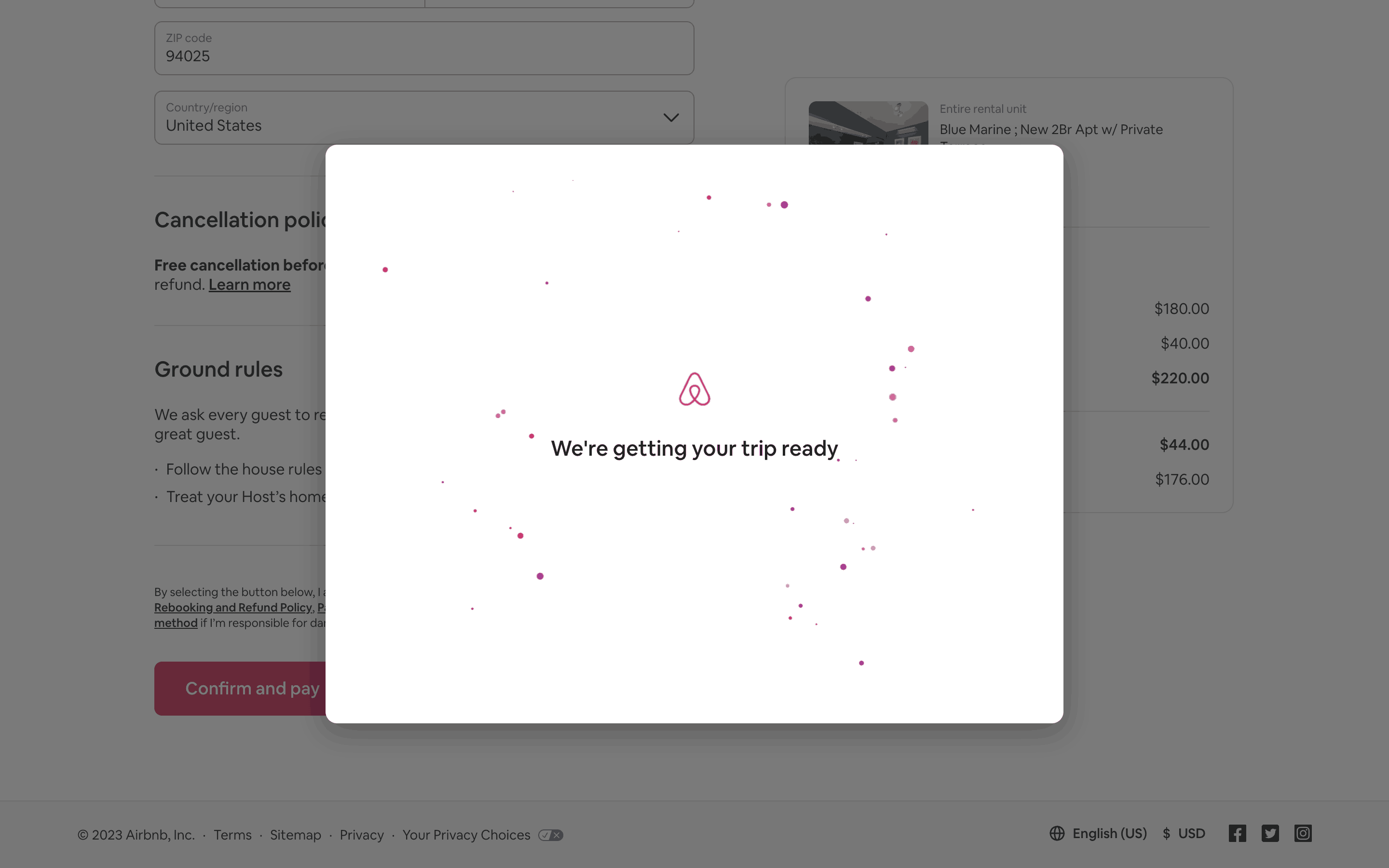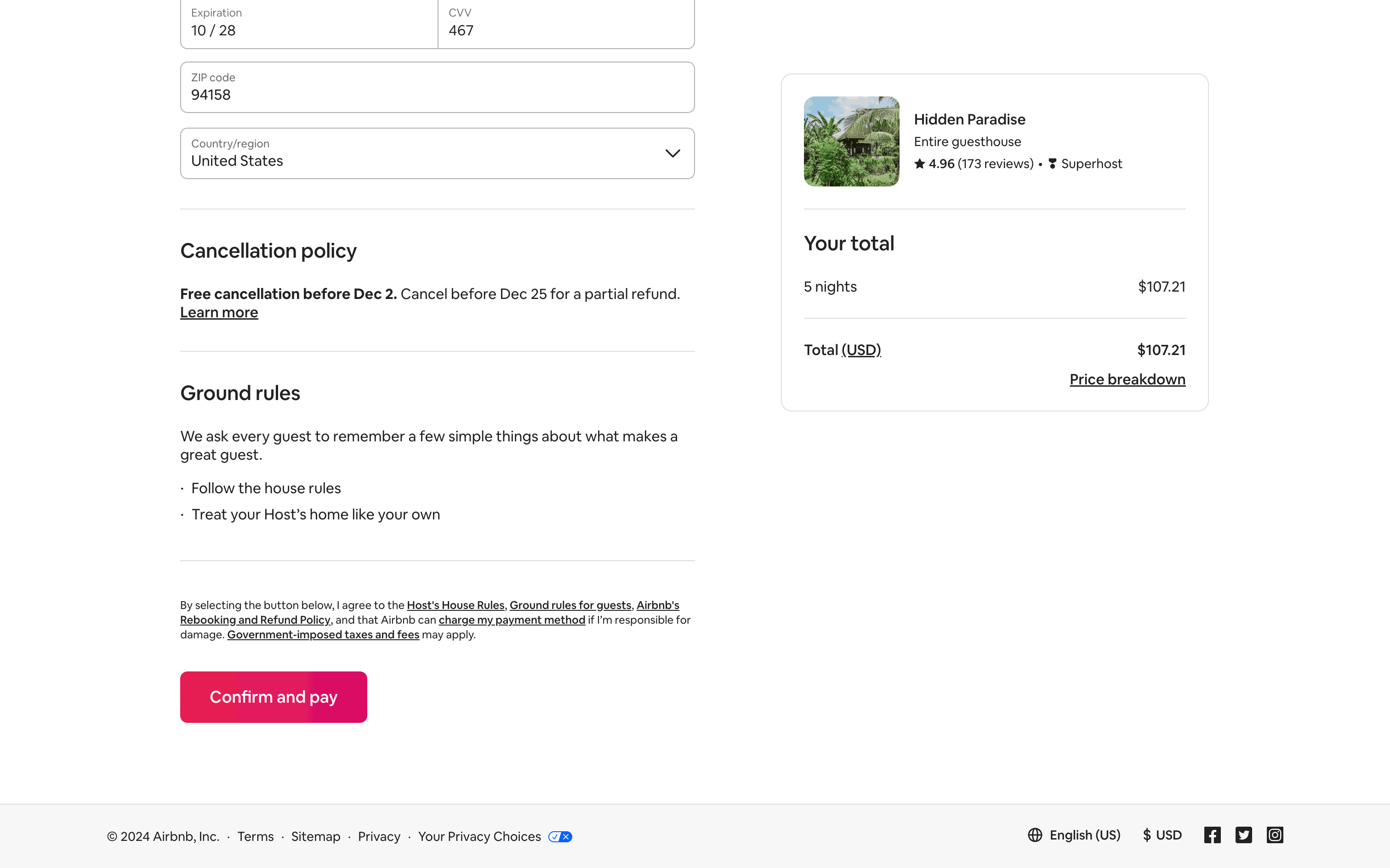 The user books a home, enters payment information, and verifies their identity. The flow ends with a confirmed reservation.