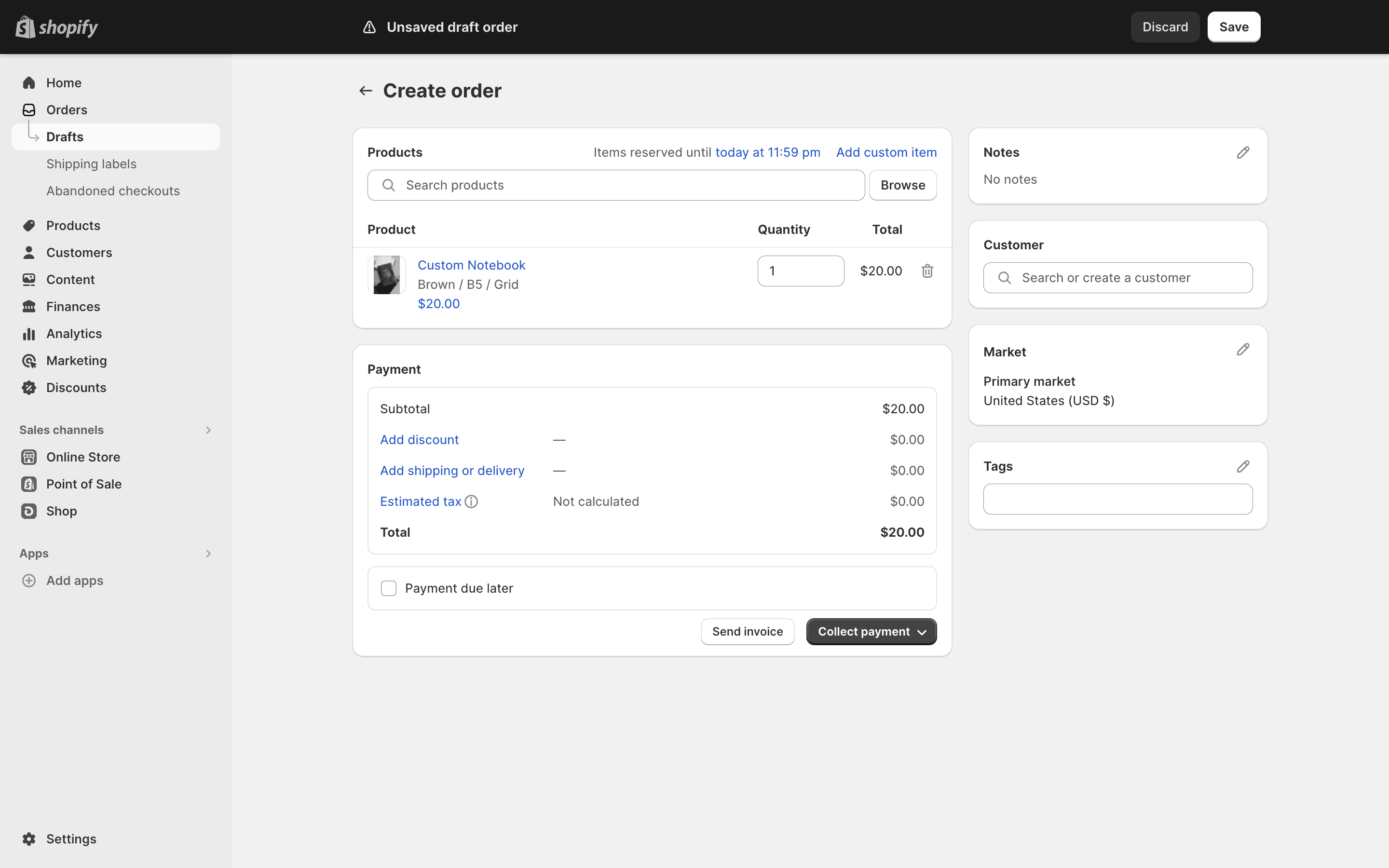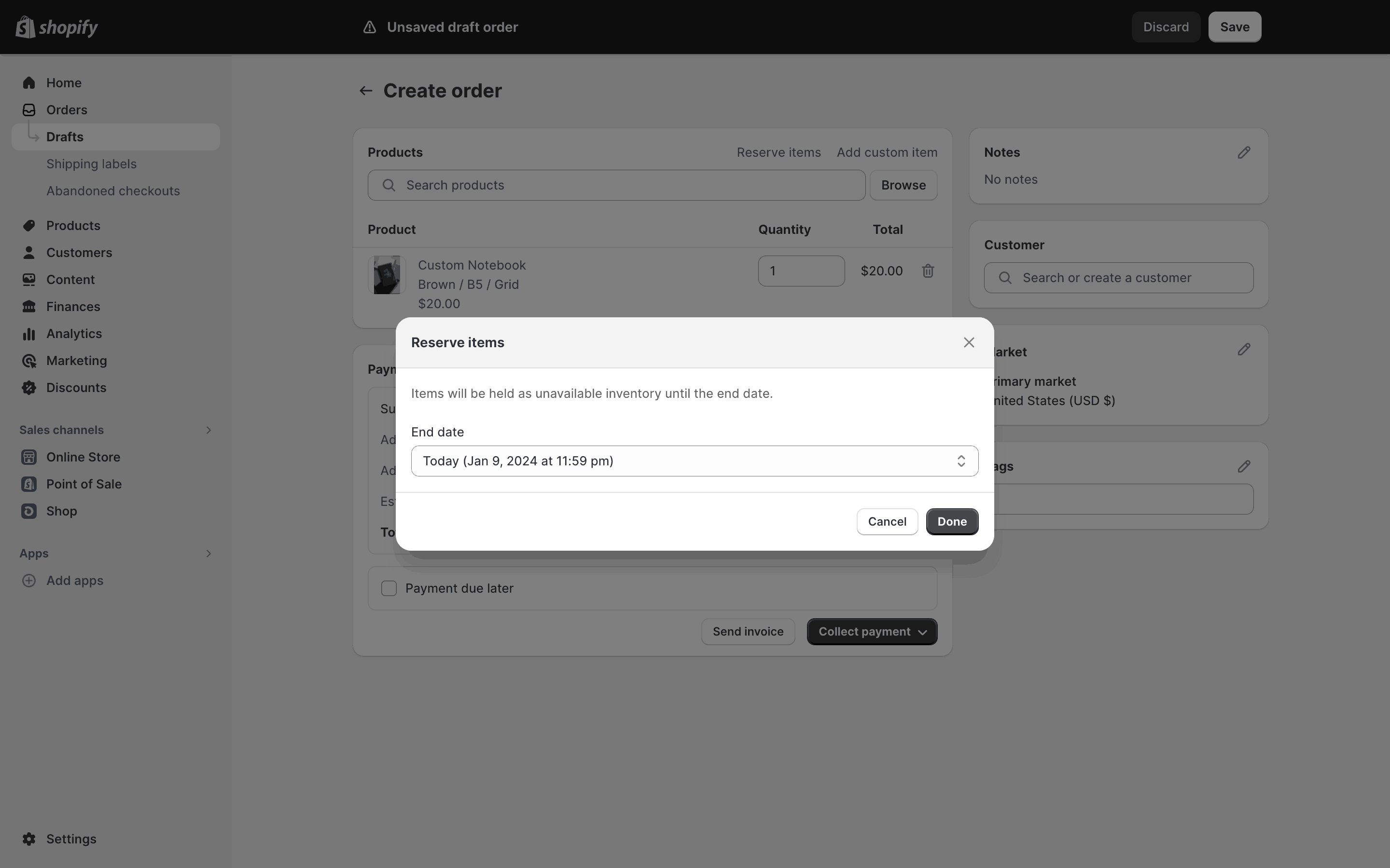 The user flow demonstrates reserving items on a "Create order" page. It involves setting an end date for the reservation and confirming the reservation on the page.