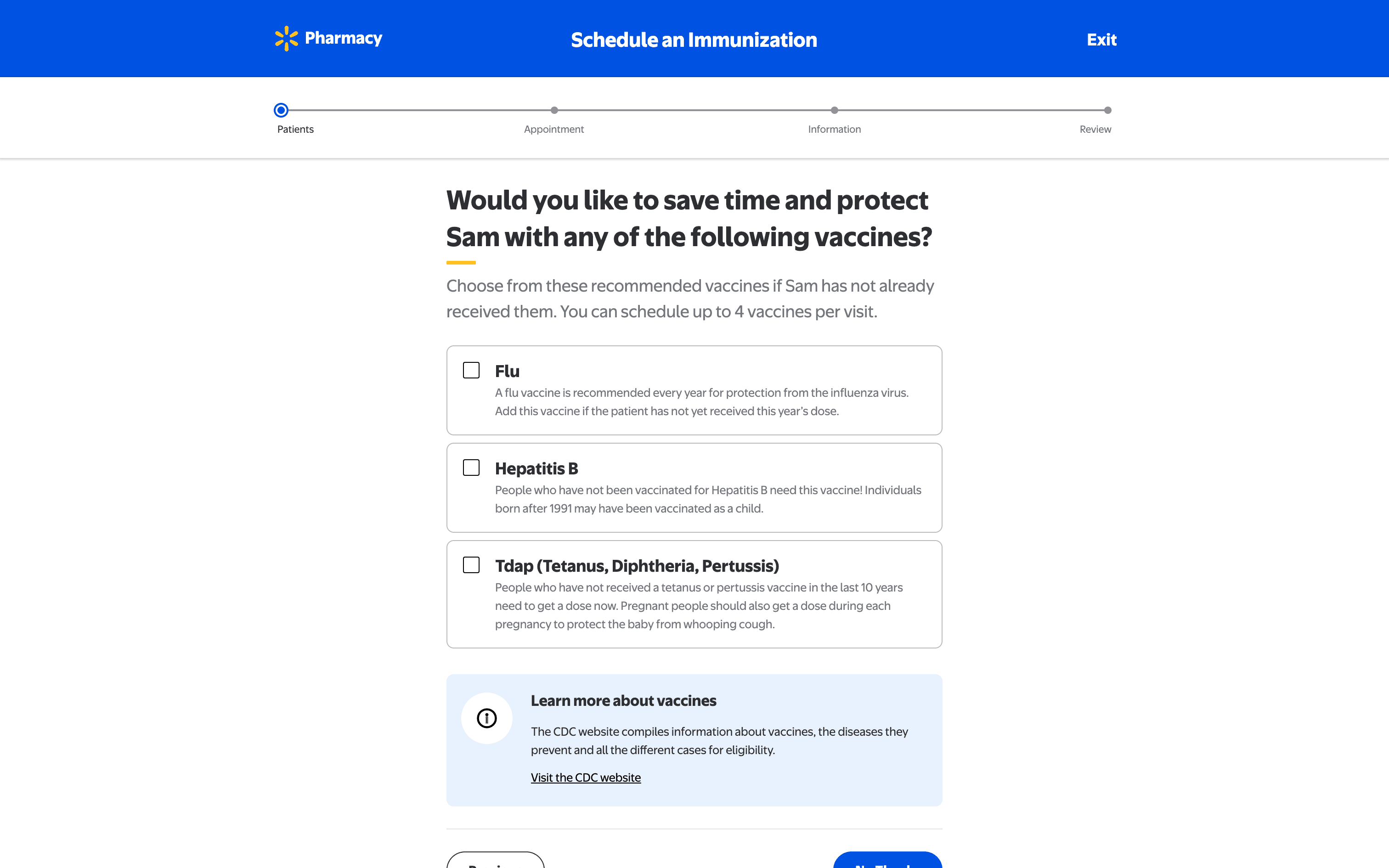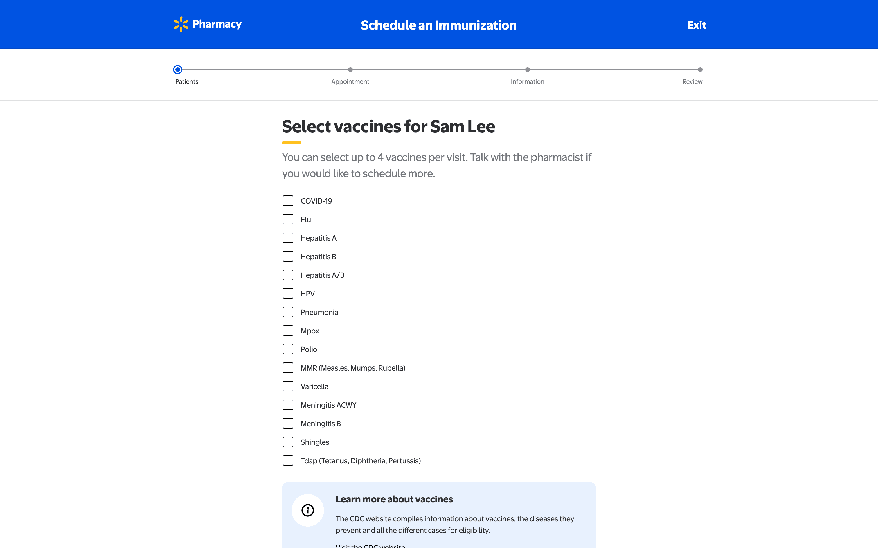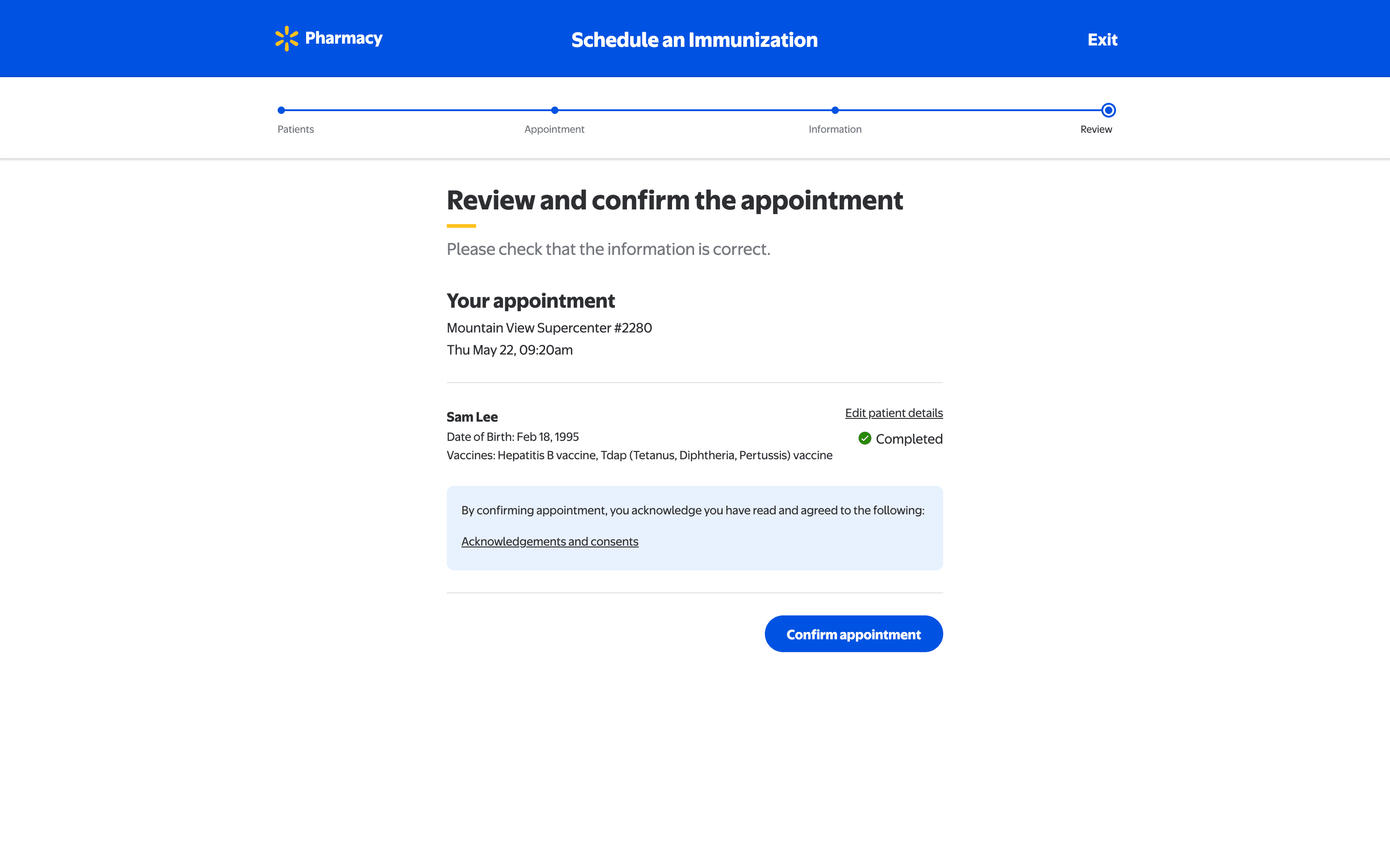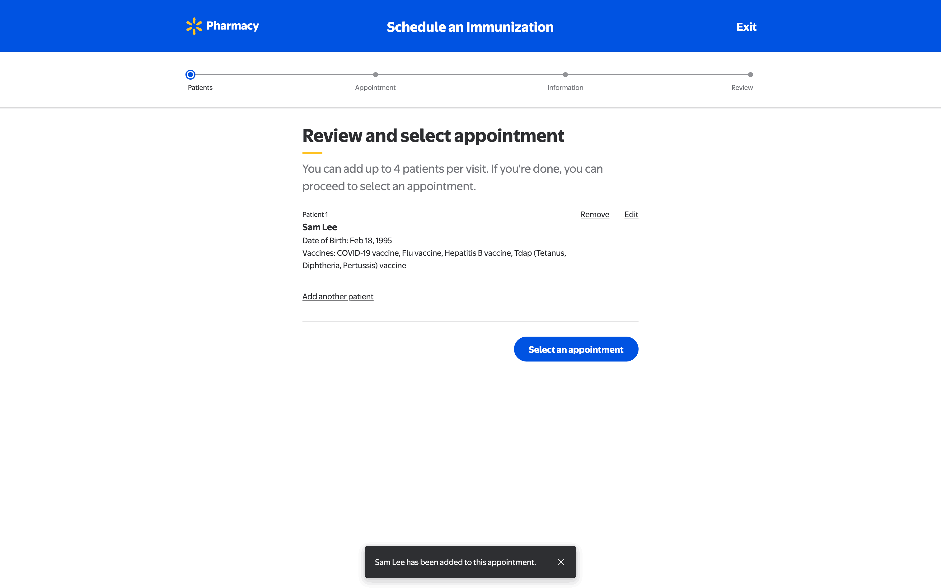 The user schedules an immunization by providing patient details, selecting vaccines, choosing an appointment time, and confirming the appointment. The flow concludes with an appointment confirmation.