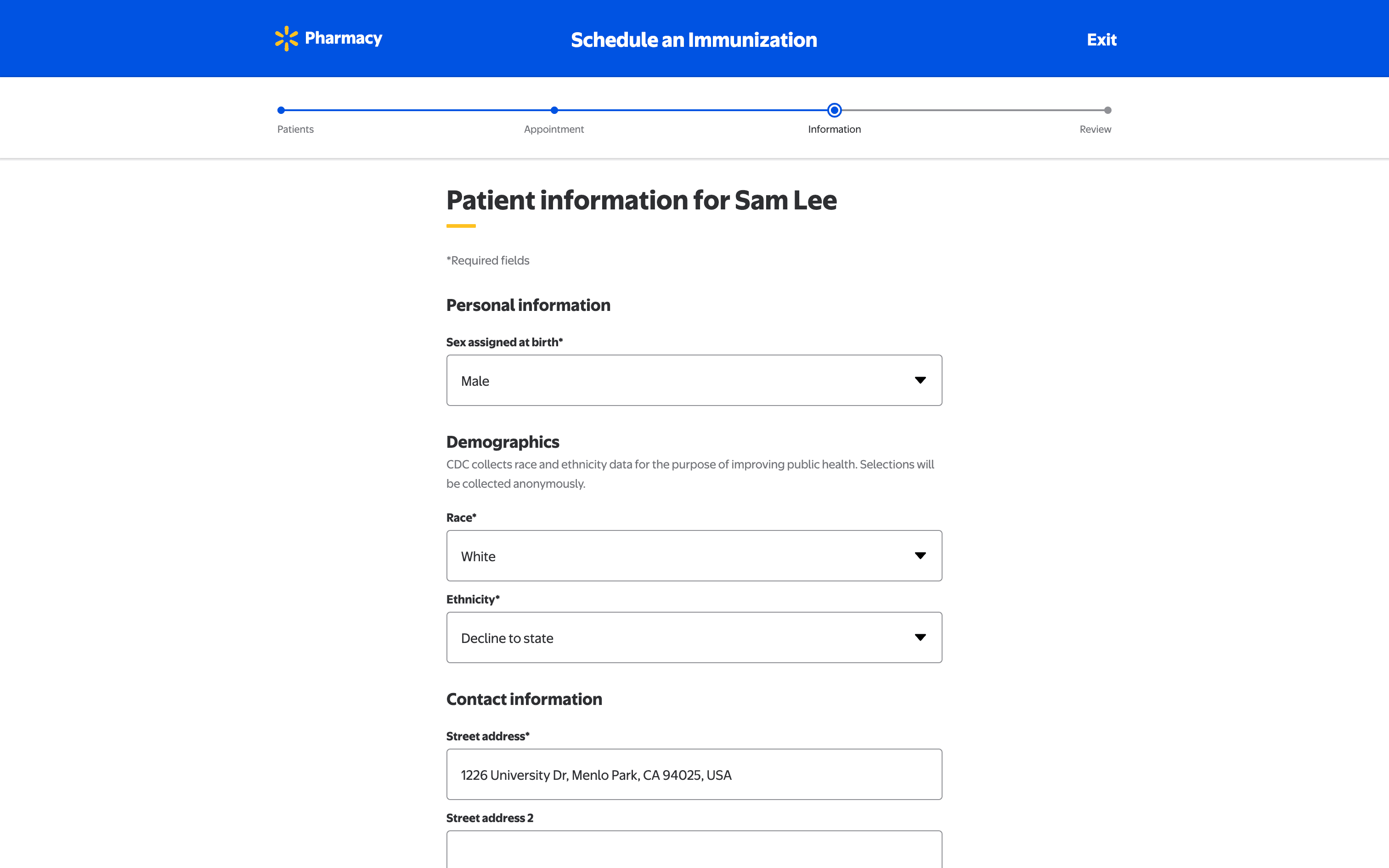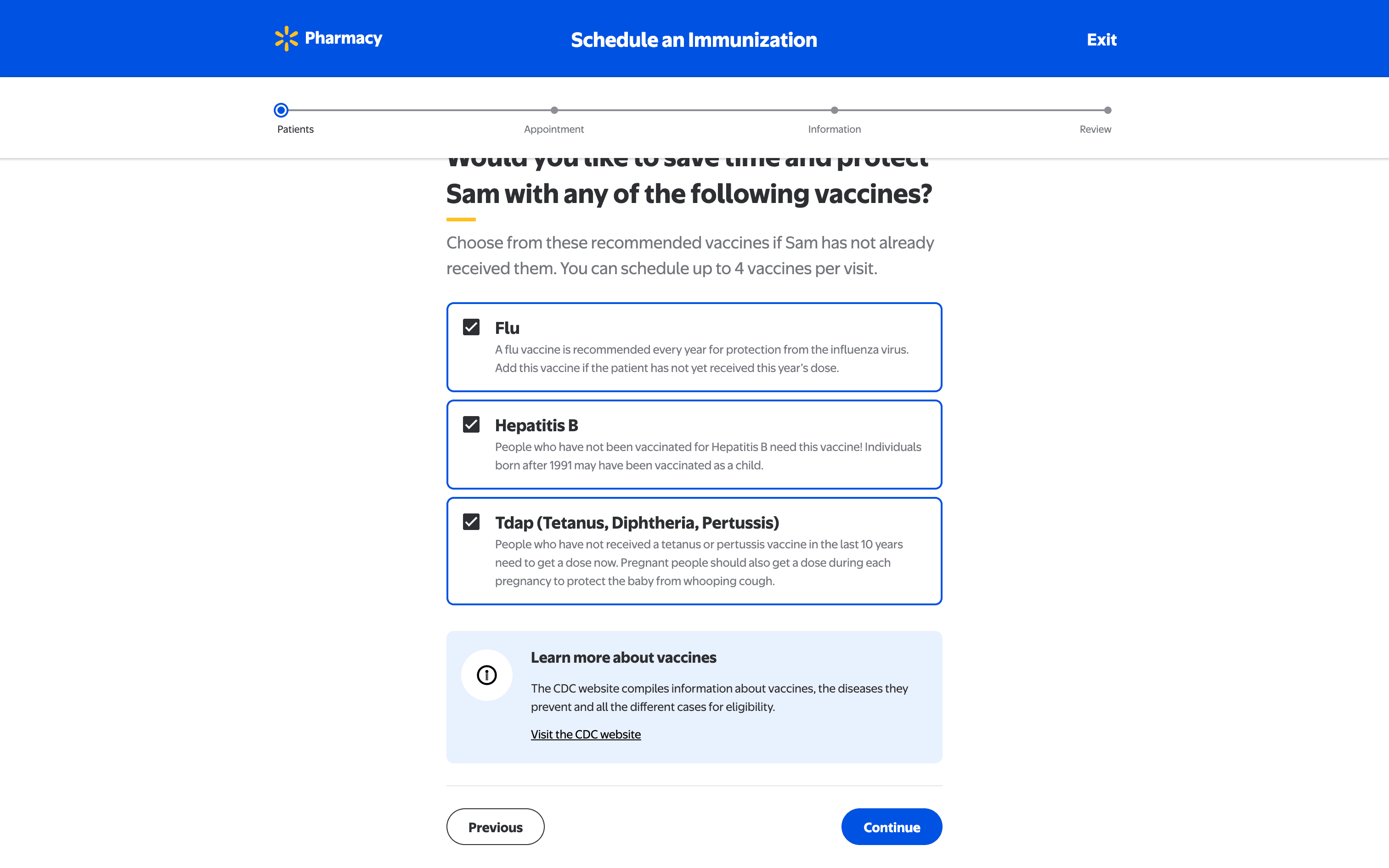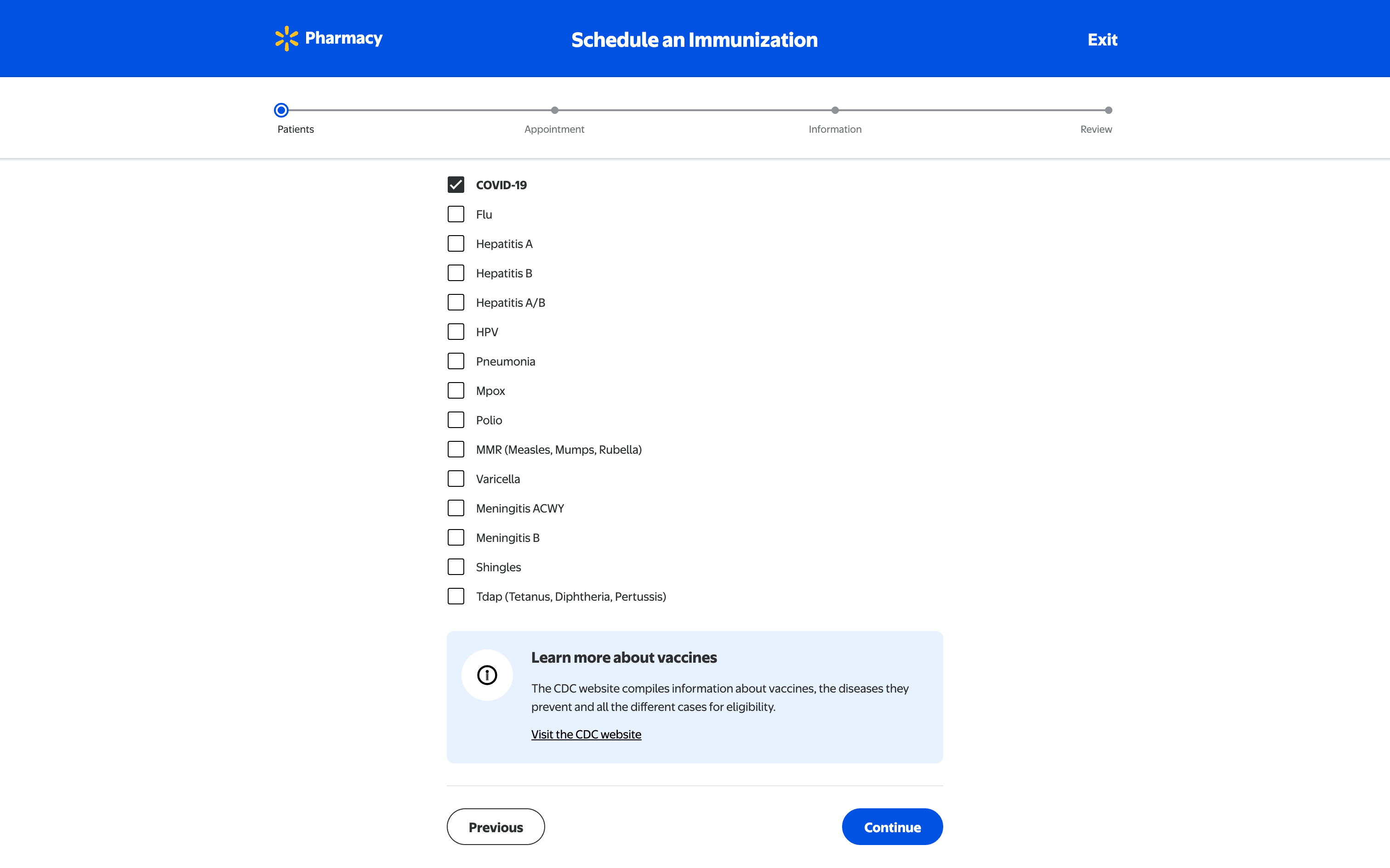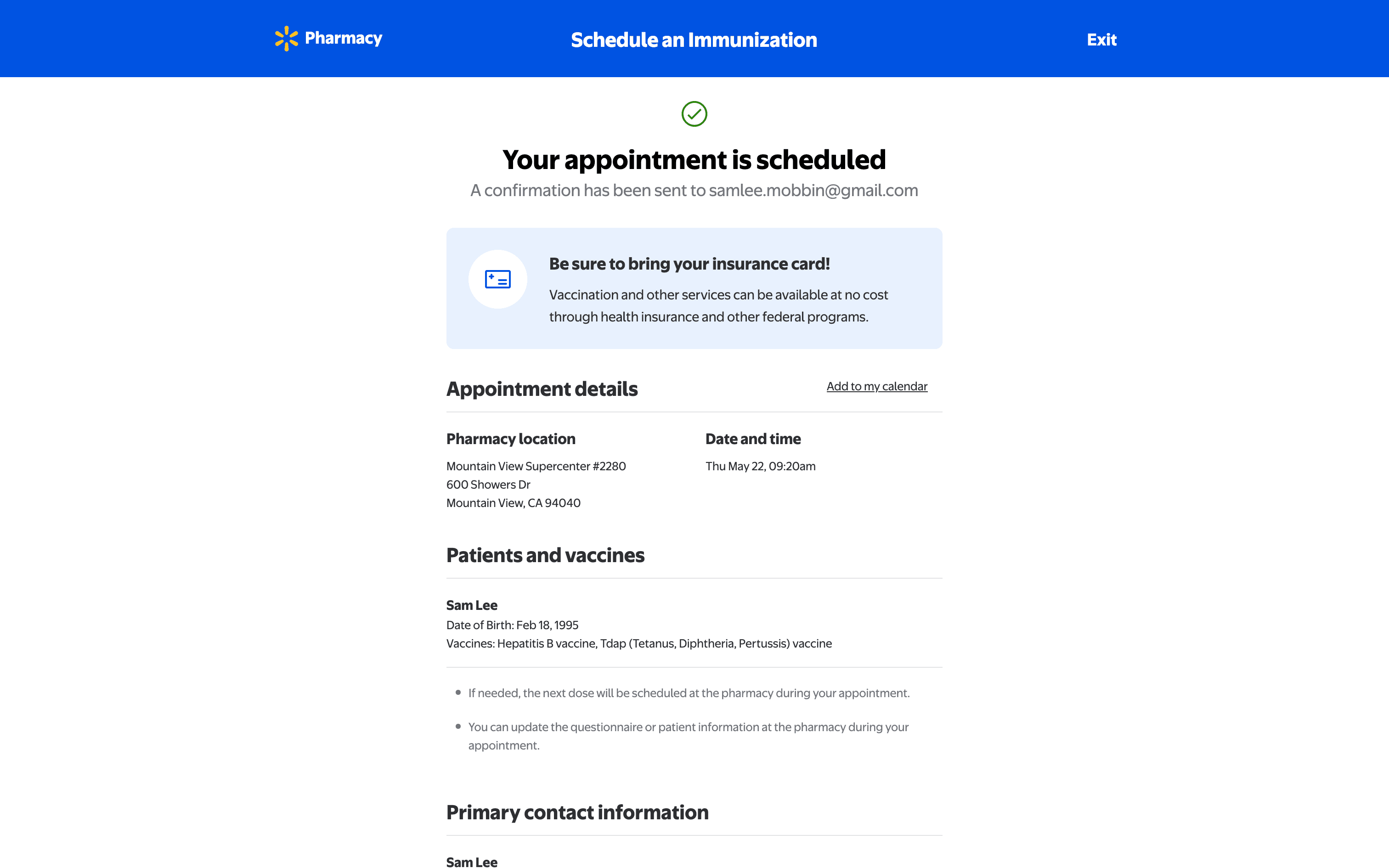 The user schedules an immunization by providing patient details, selecting vaccines, choosing an appointment time, and confirming the appointment. The flow concludes with an appointment confirmation.