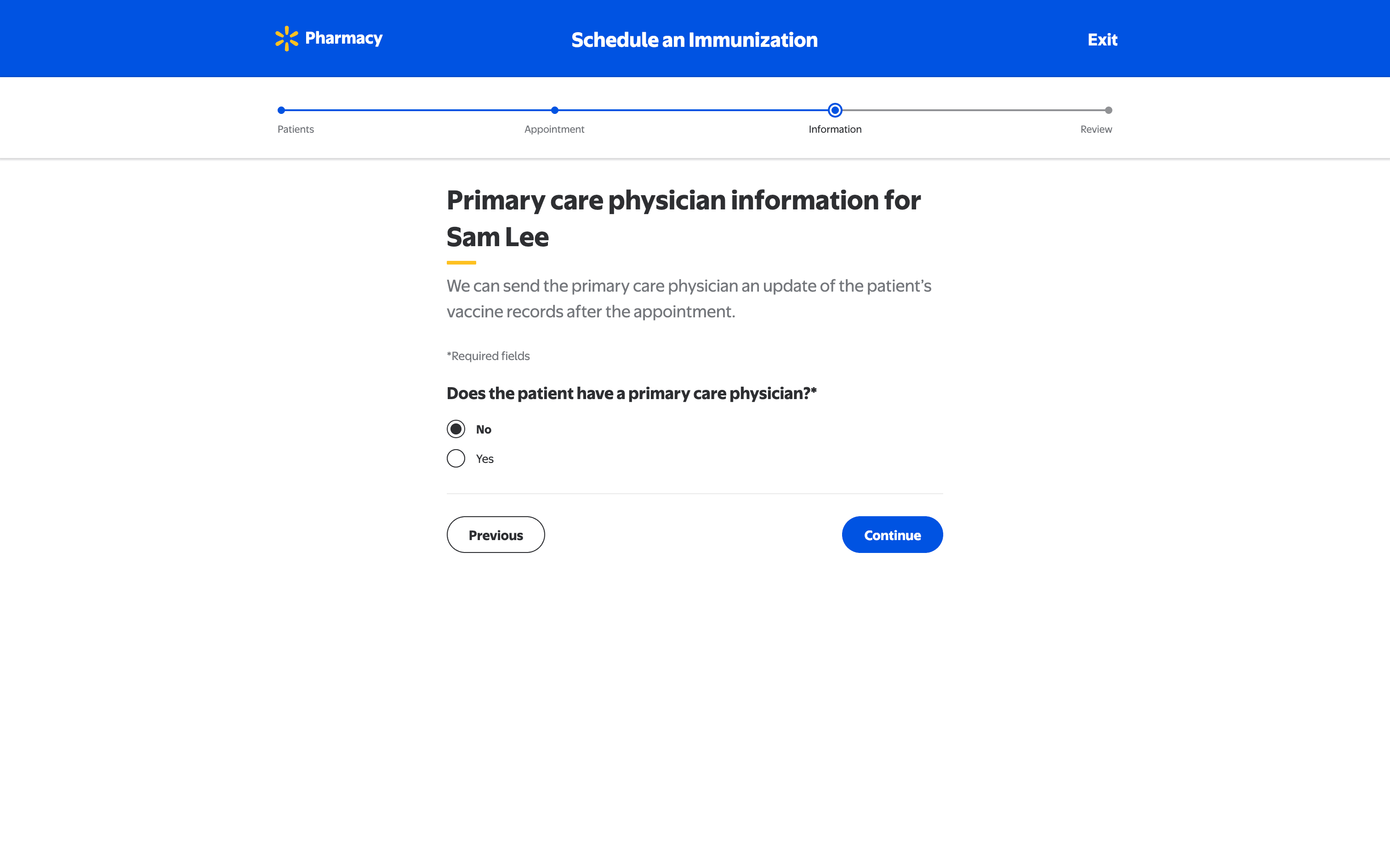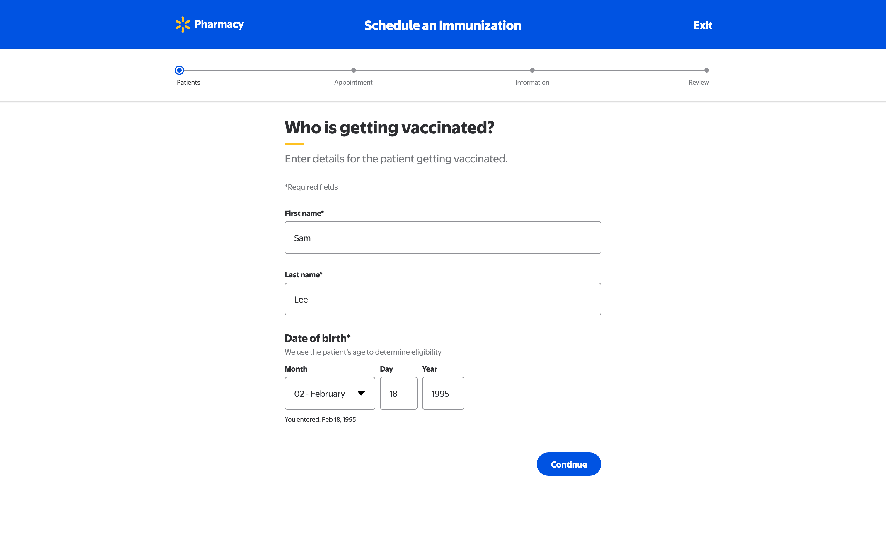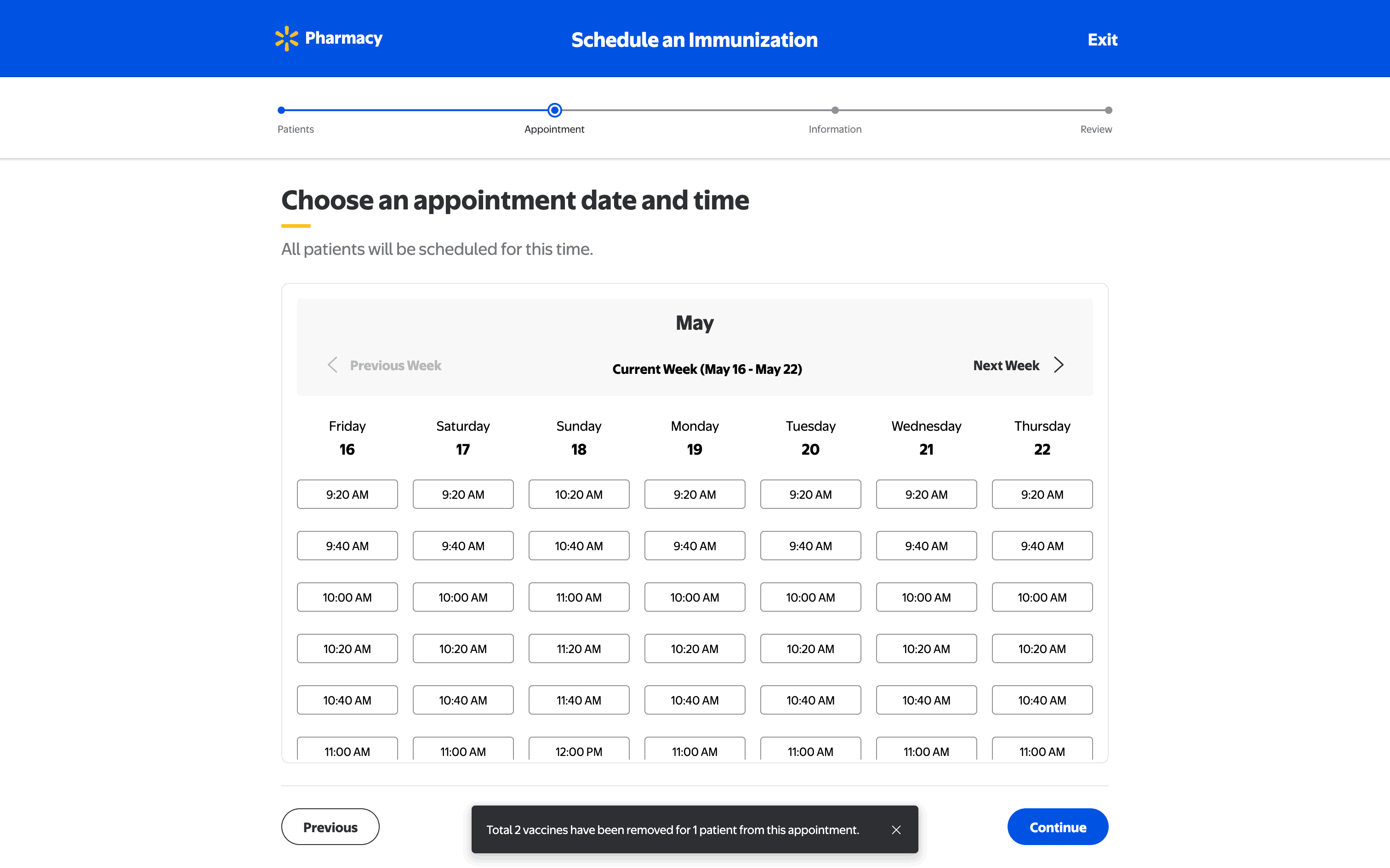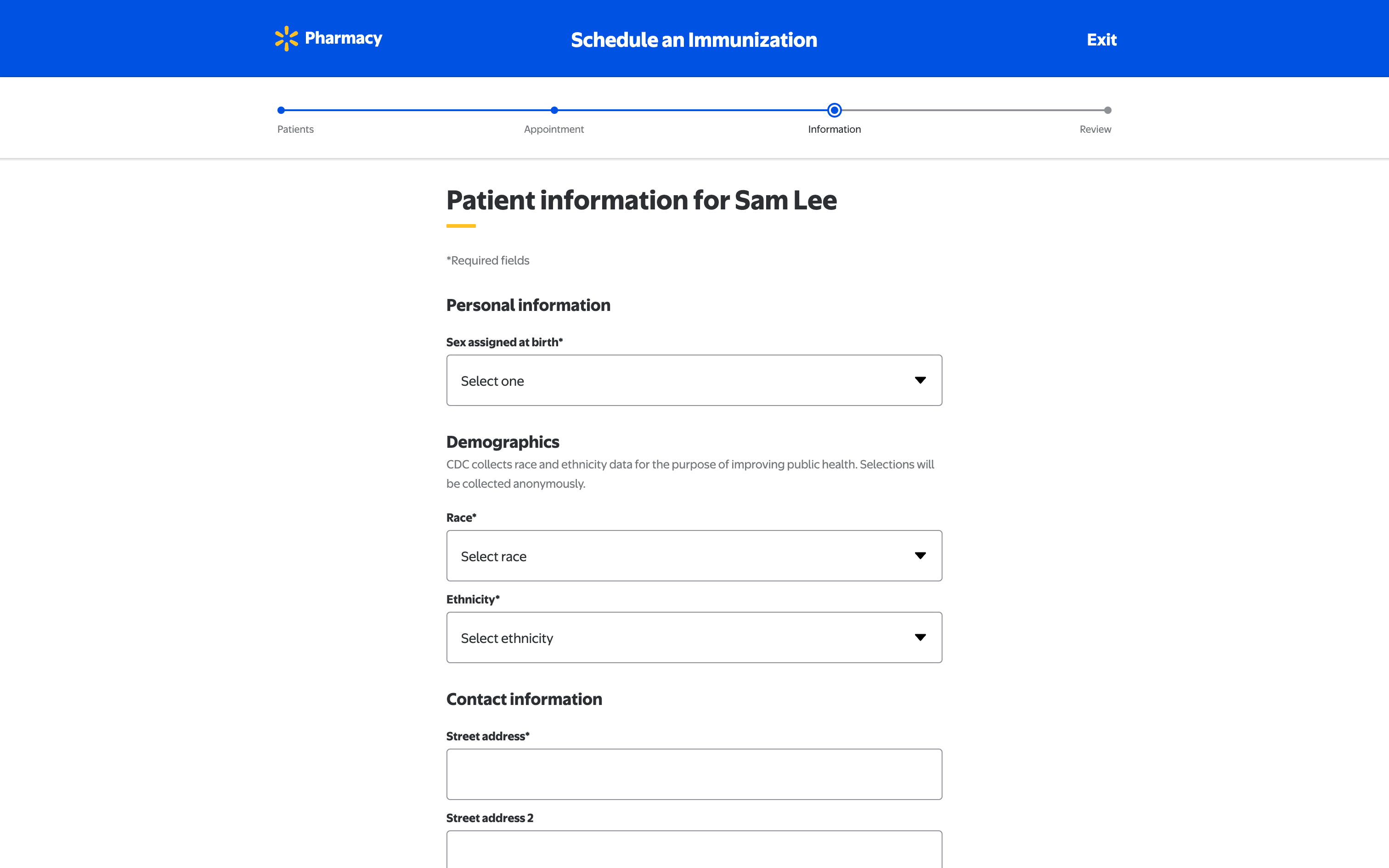 The user schedules an immunization by providing patient details, selecting vaccines, choosing an appointment time, and confirming the appointment. The flow concludes with an appointment confirmation.