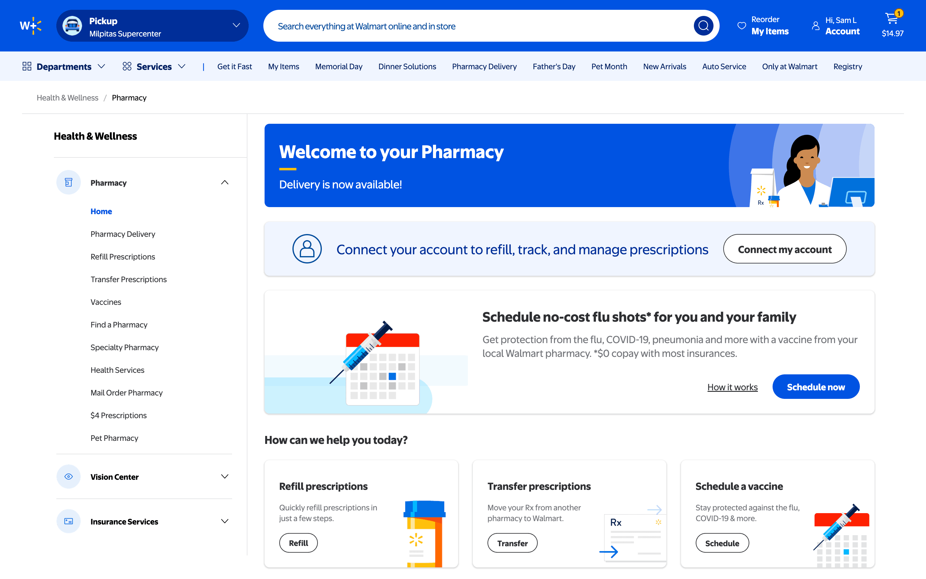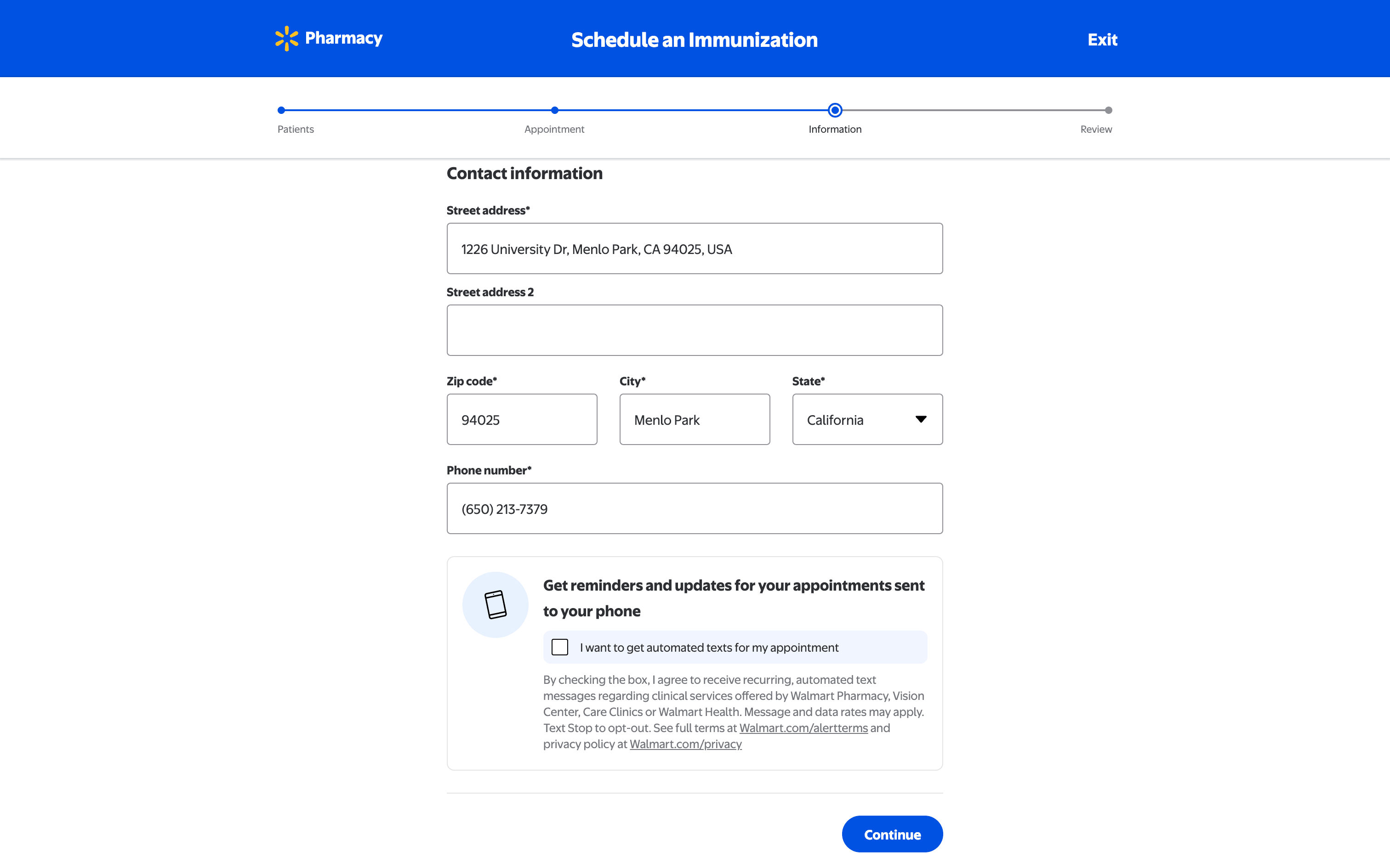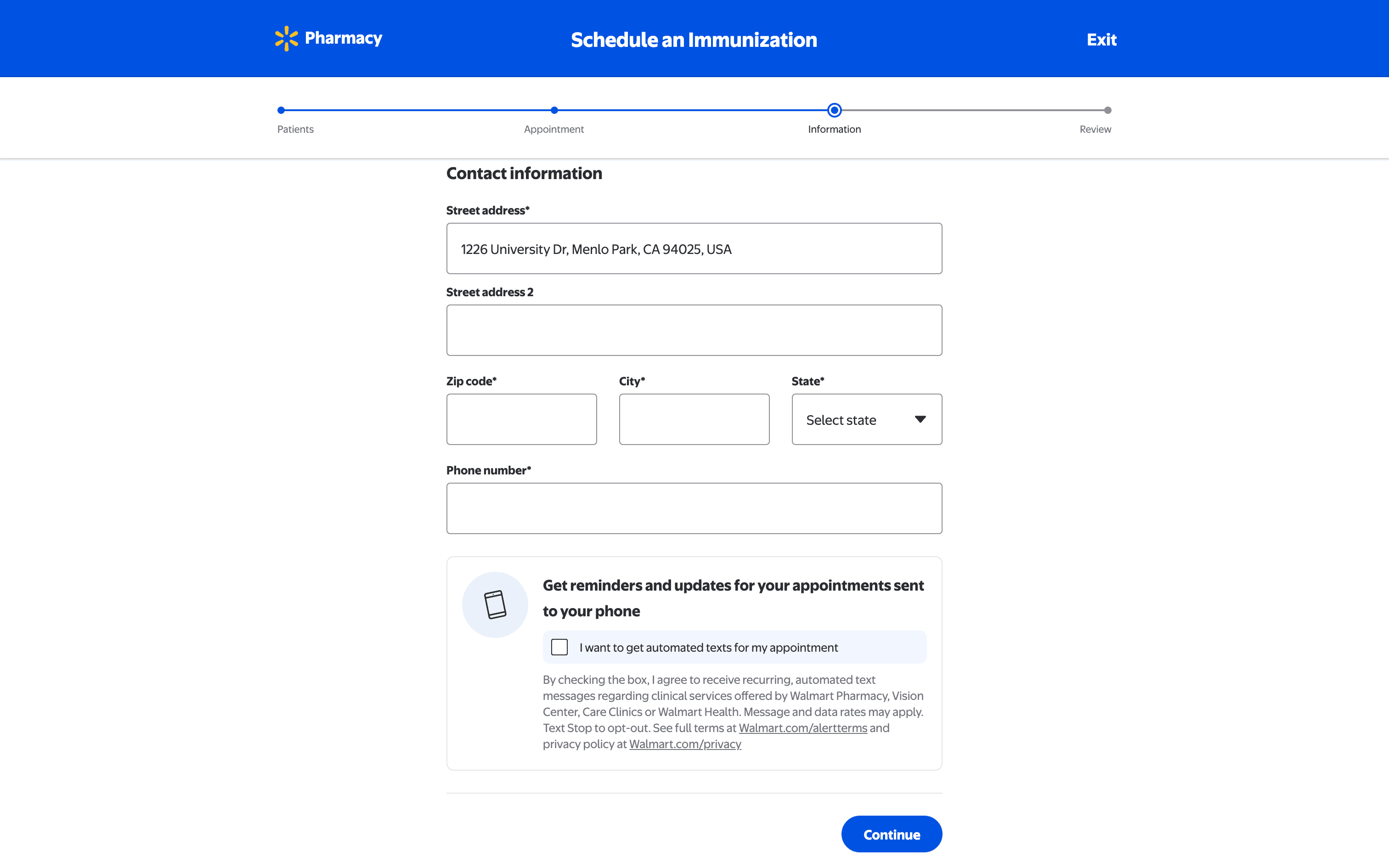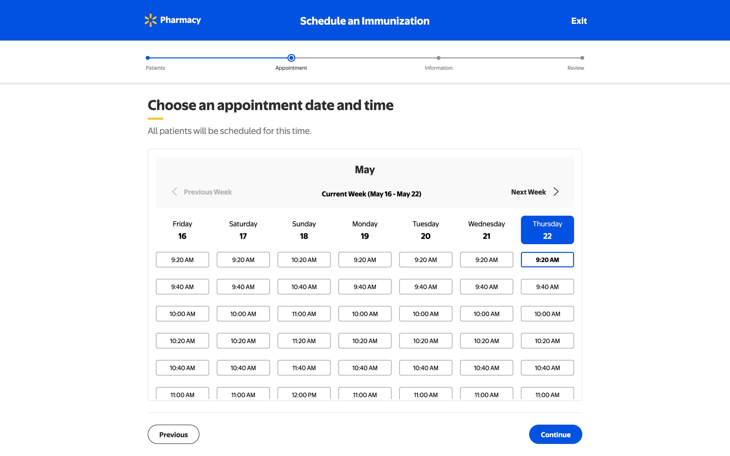 The user schedules an immunization by providing patient details, selecting vaccines, choosing an appointment time, and confirming the appointment. The flow concludes with an appointment confirmation.