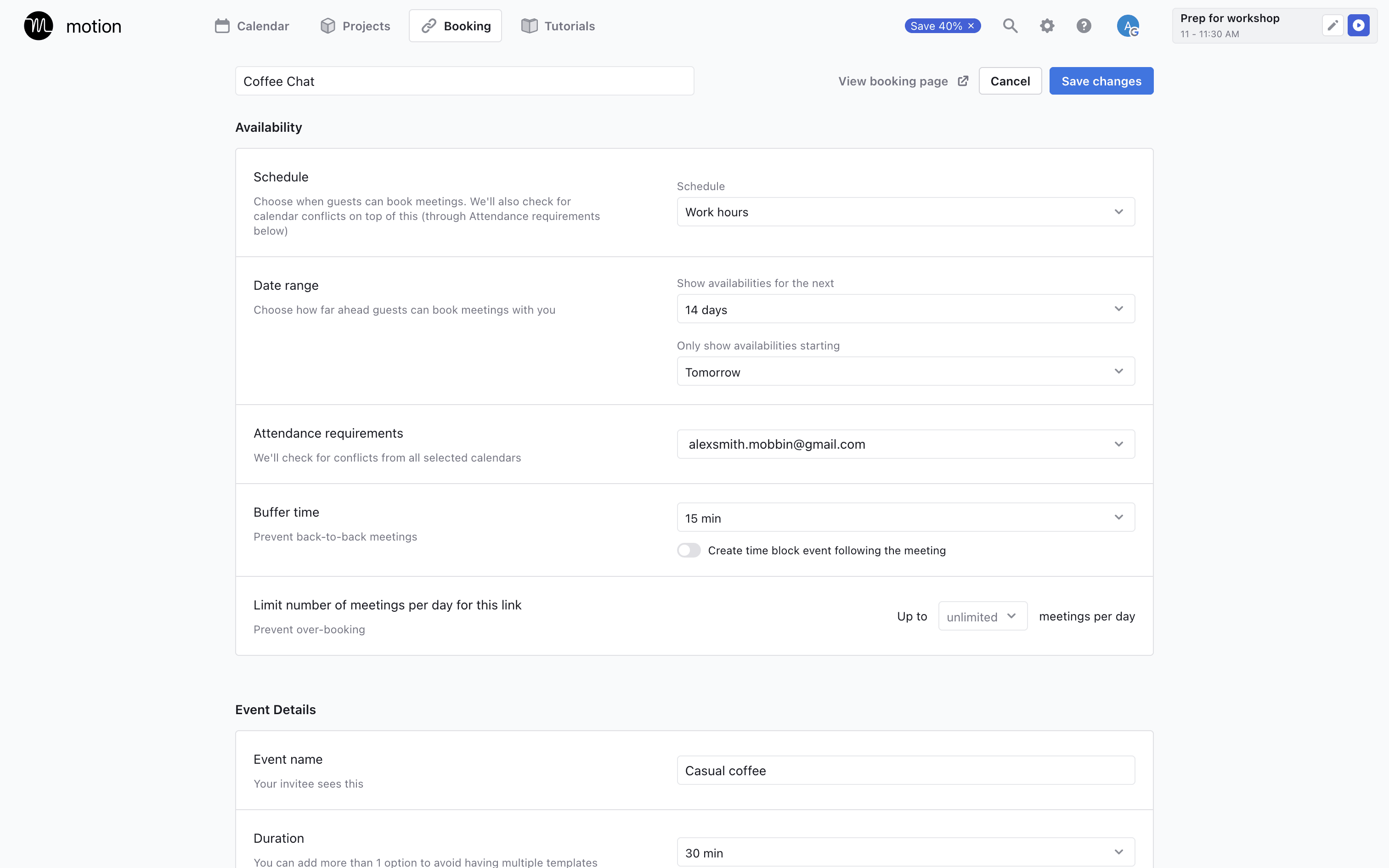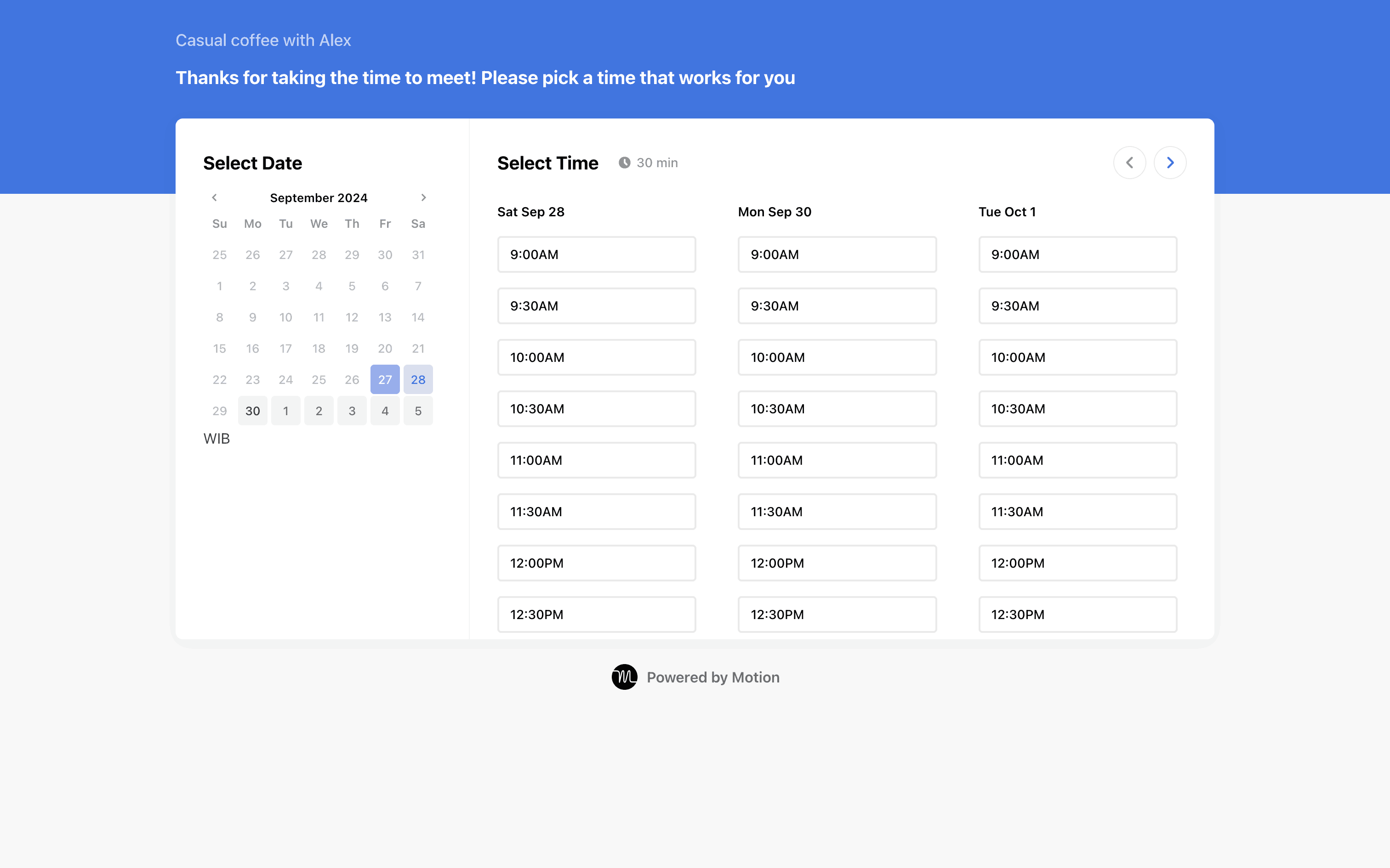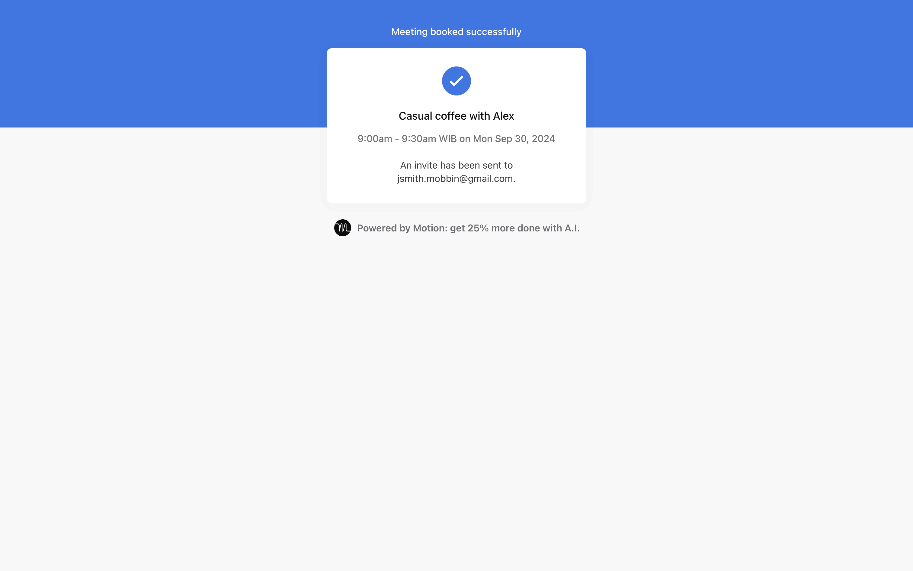 The user flow demonstrates booking a meeting by configuring settings, selecting a time, providing details, and receiving confirmation. The flow culminates in a successfully booked meeting.