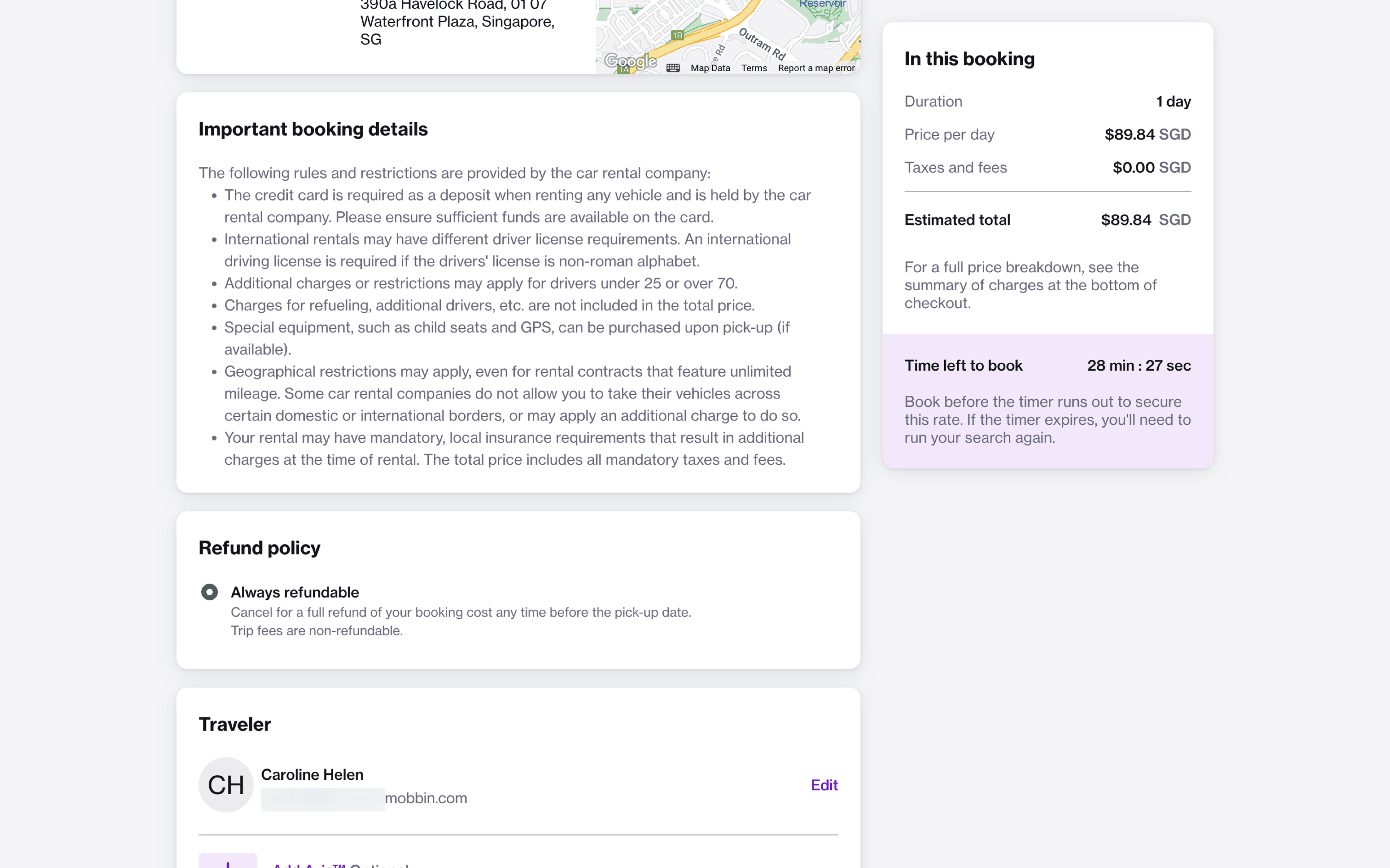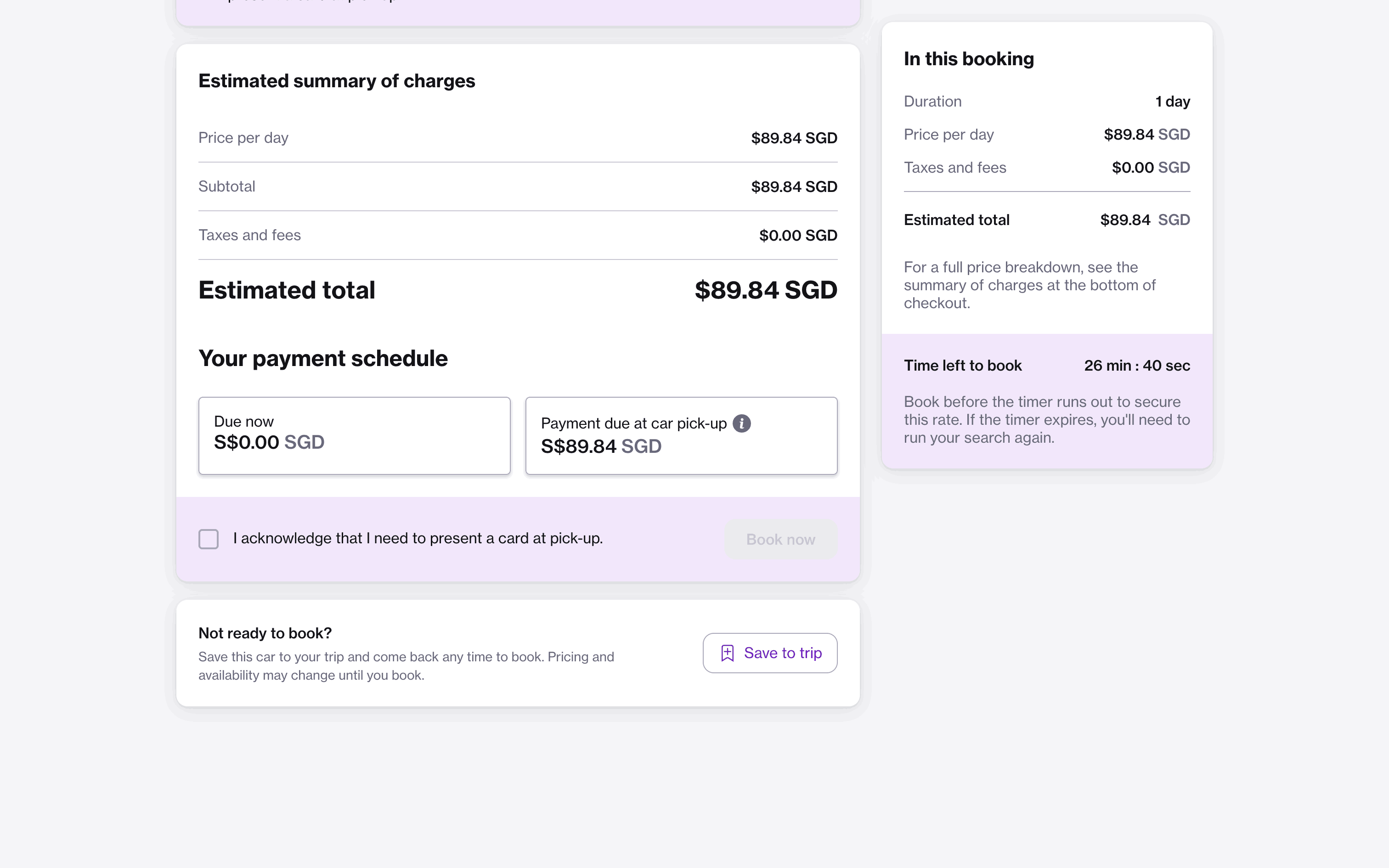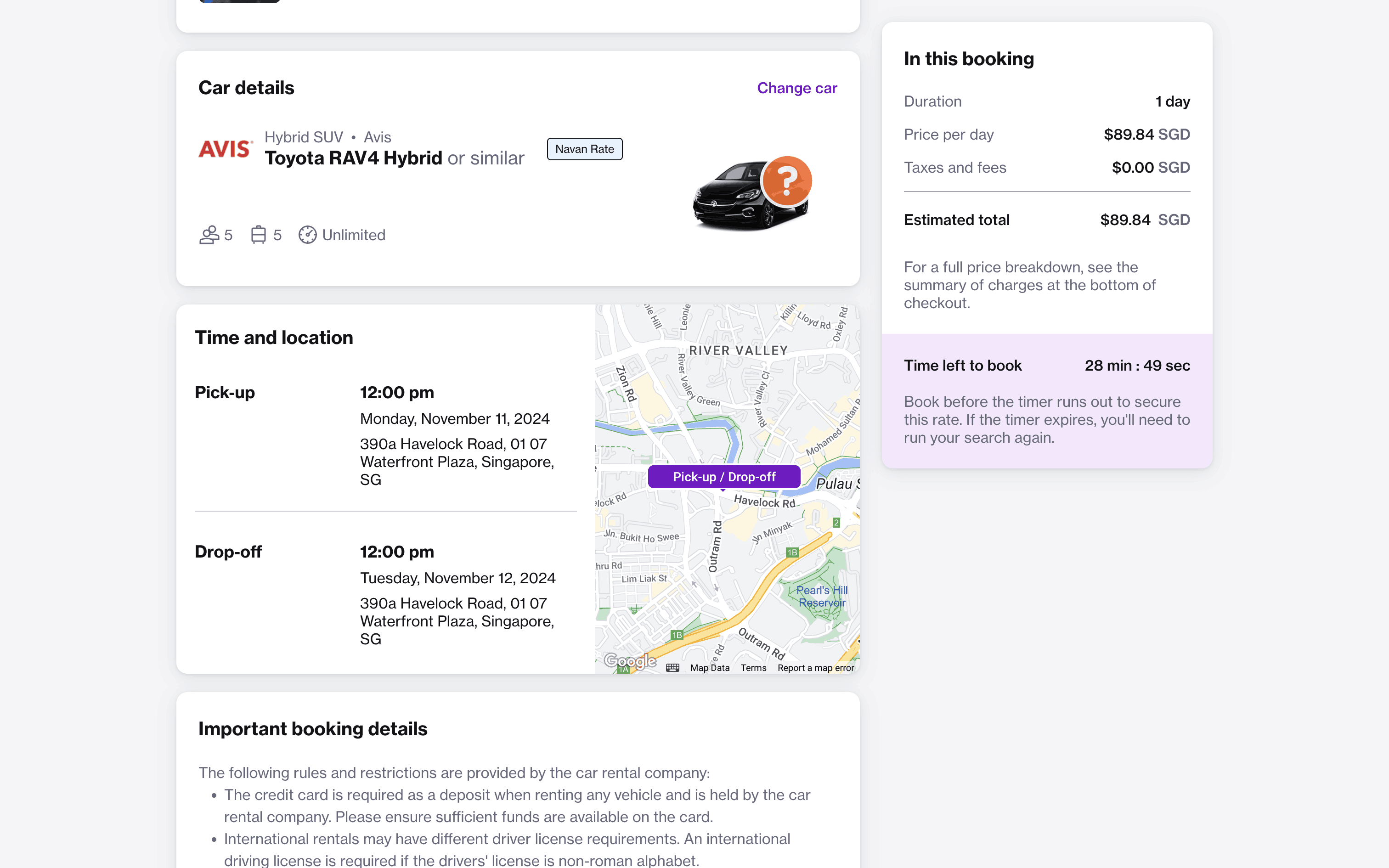Users select a car, review booking details and policies, then confirm payment to complete the reservation.