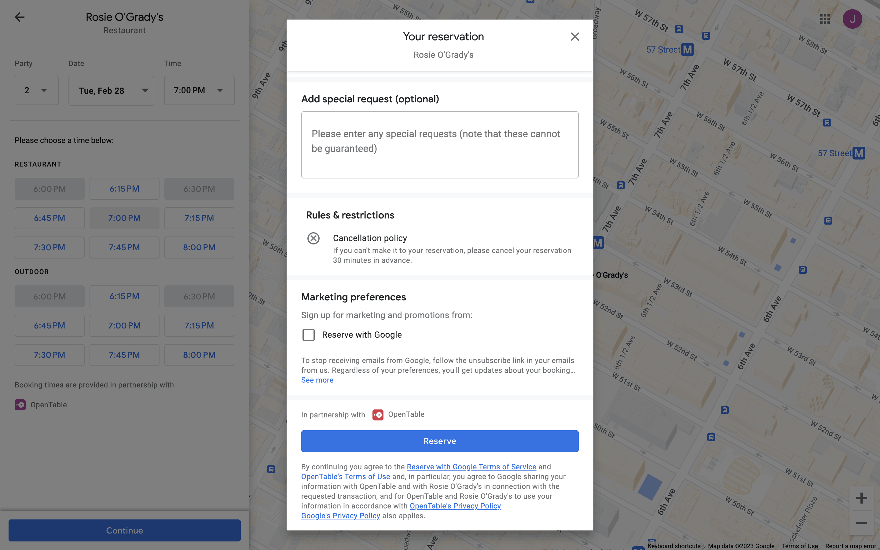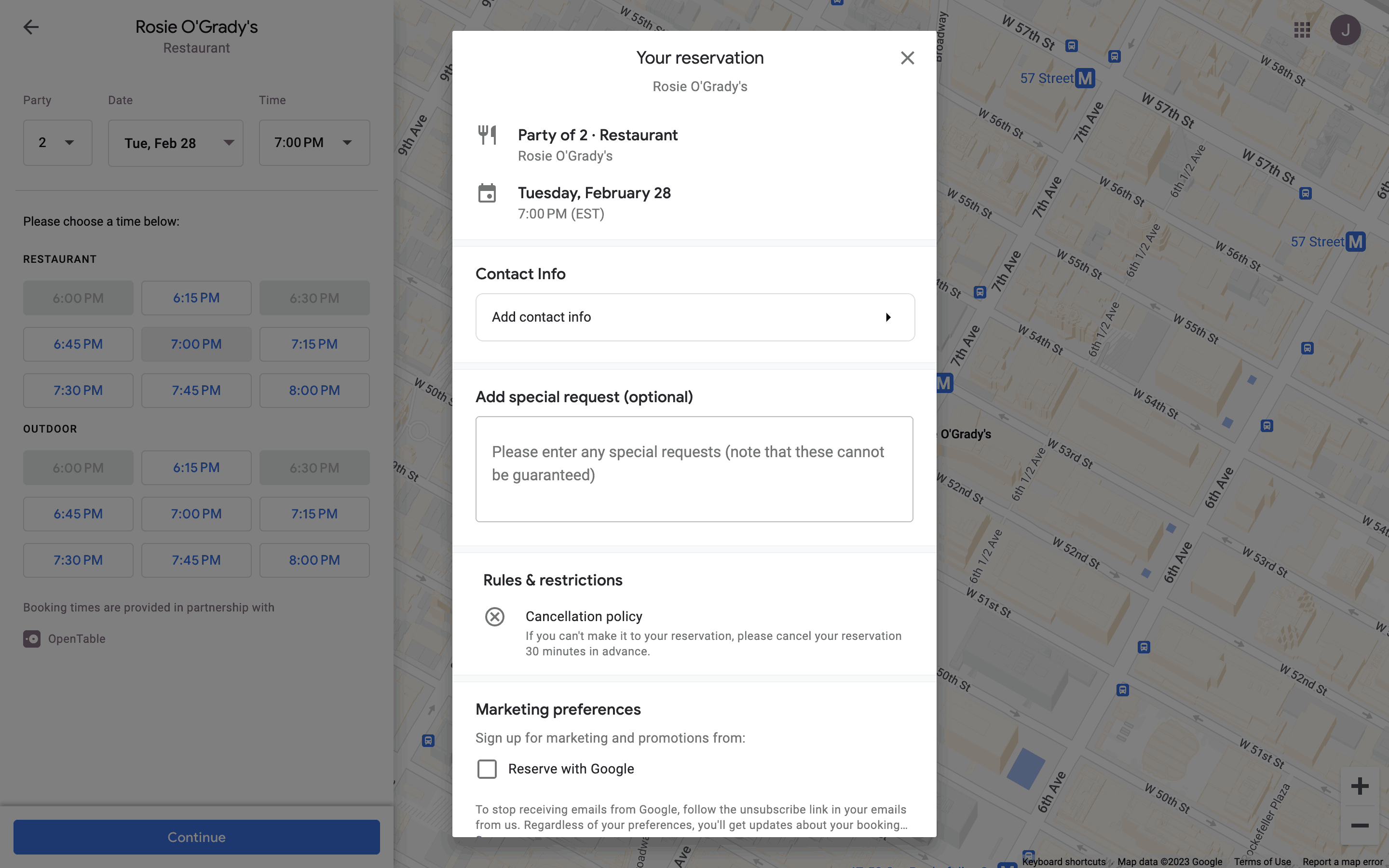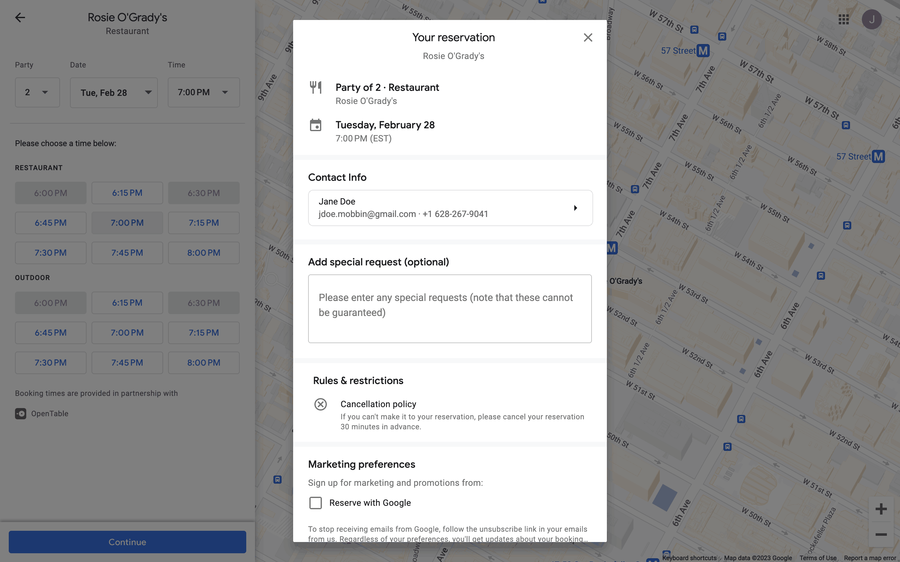 Users select a restaurant, choose a reservation time, provide contact info, and confirm. A summary with modification options is then displayed.