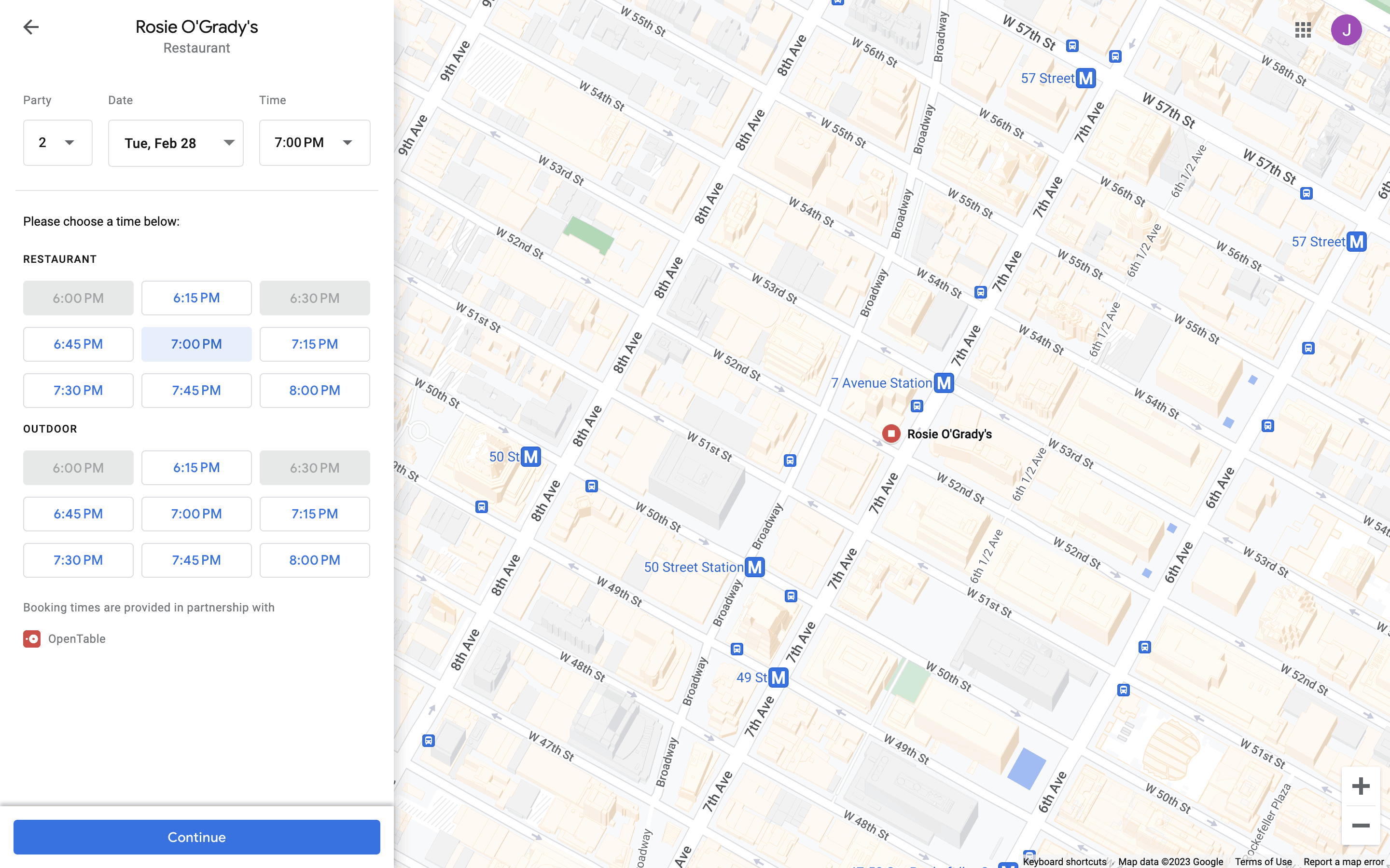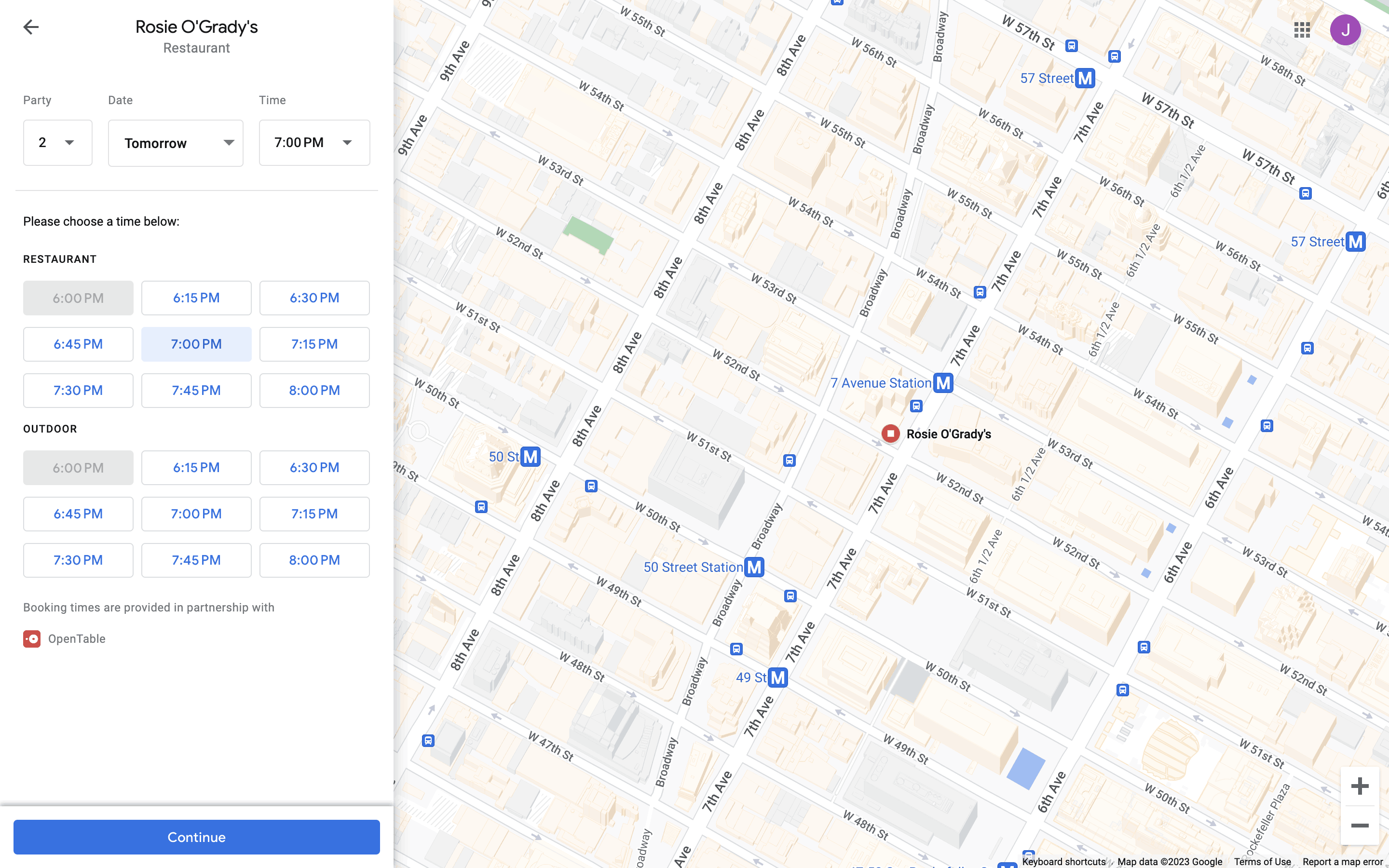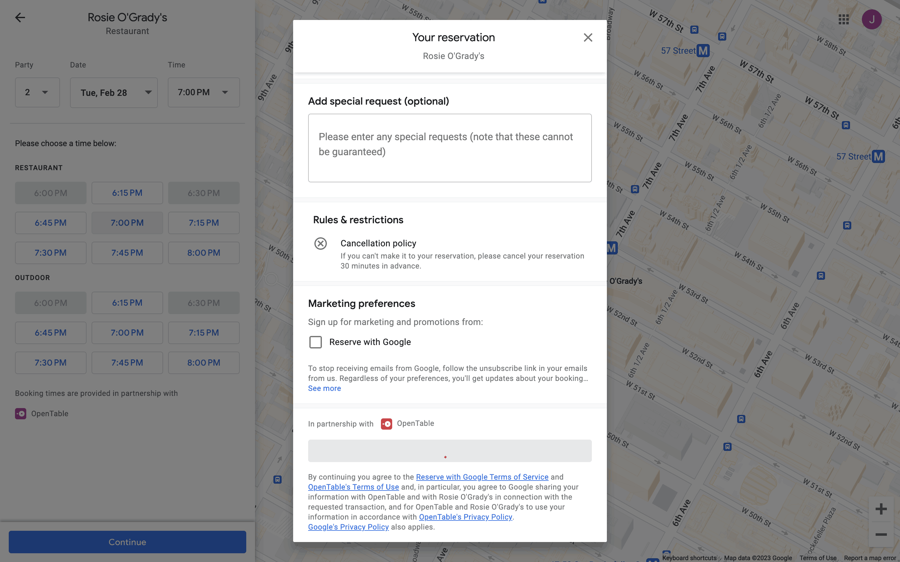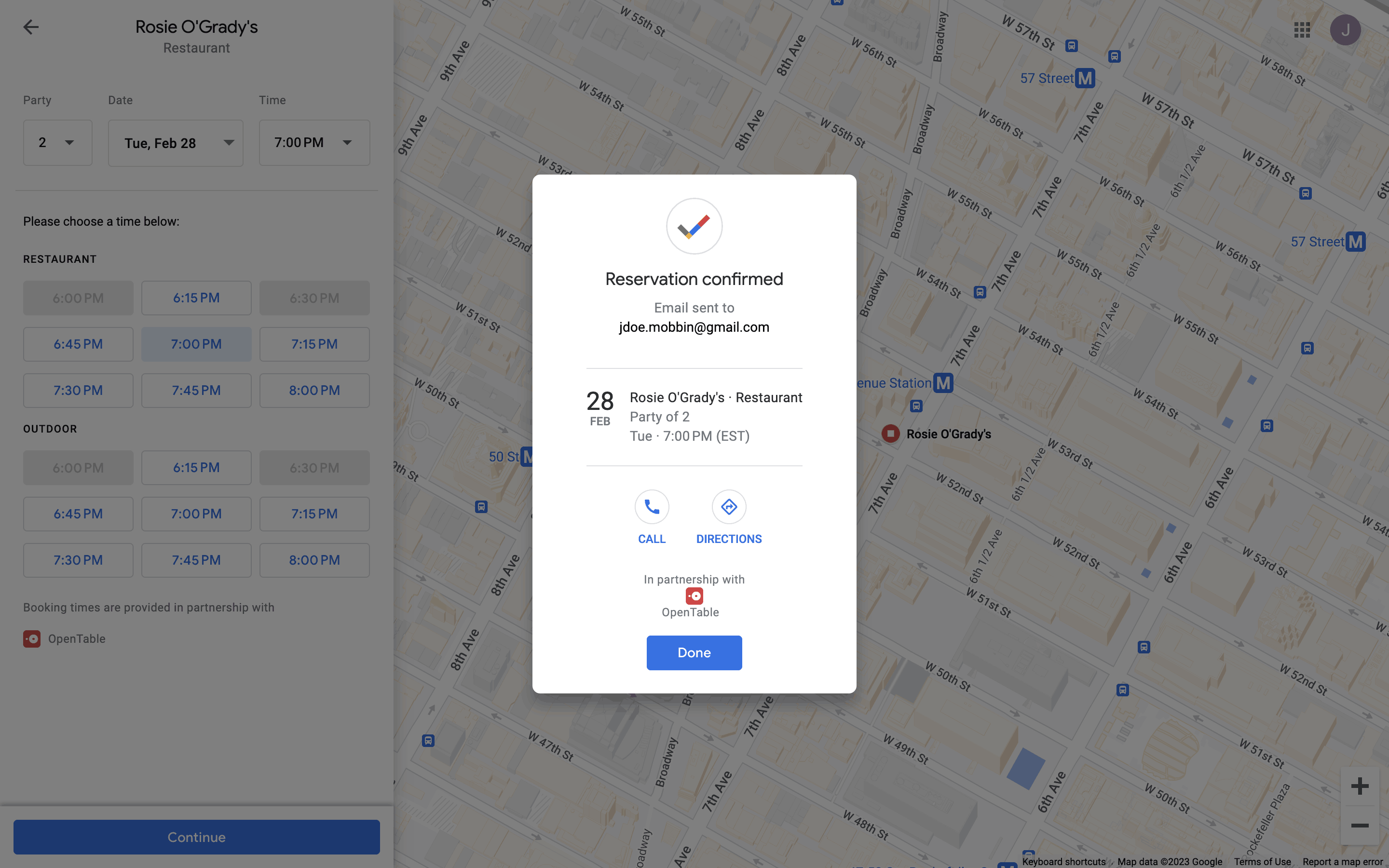 Users select a restaurant, choose a reservation time, provide contact info, and confirm. A summary with modification options is then displayed.