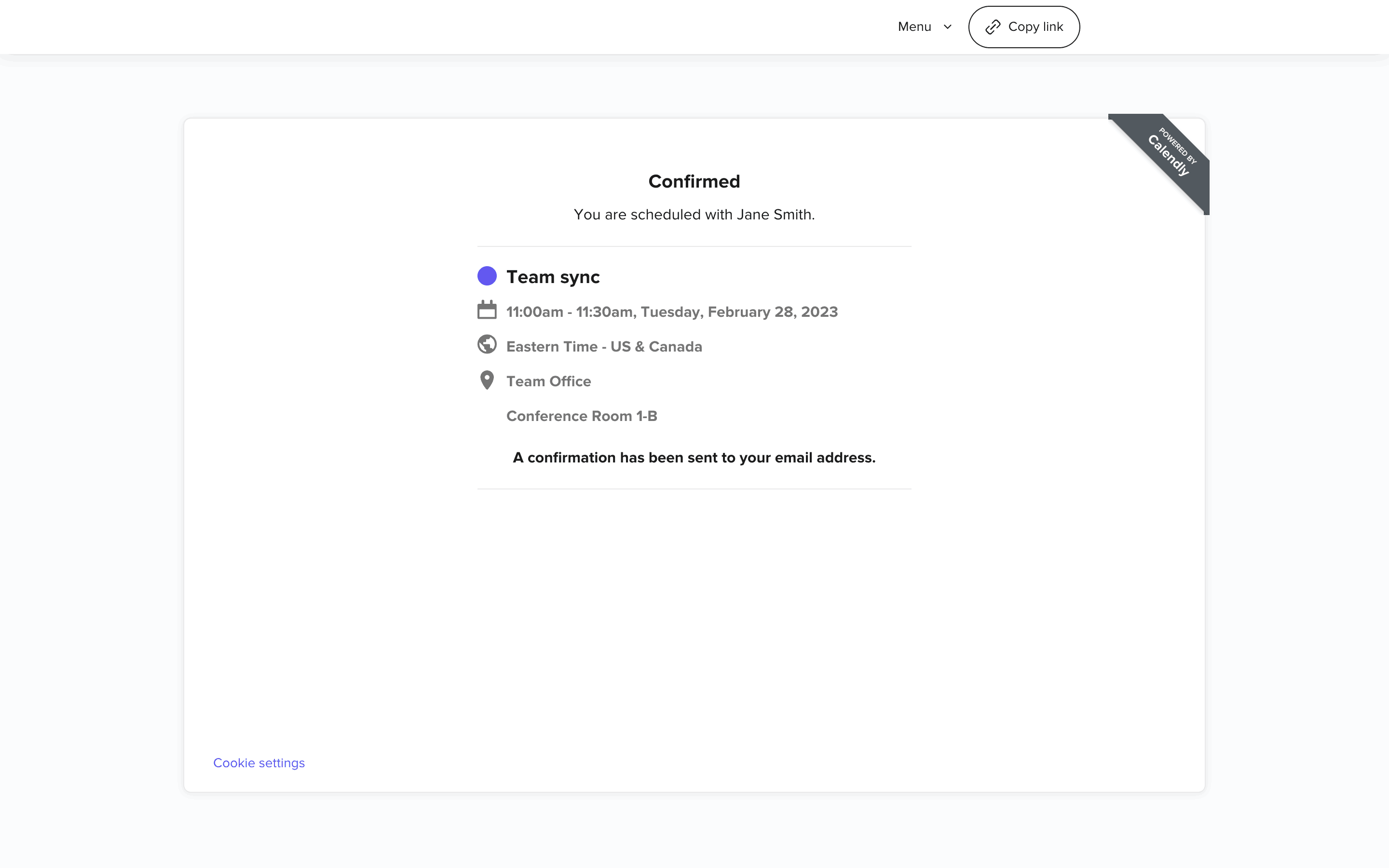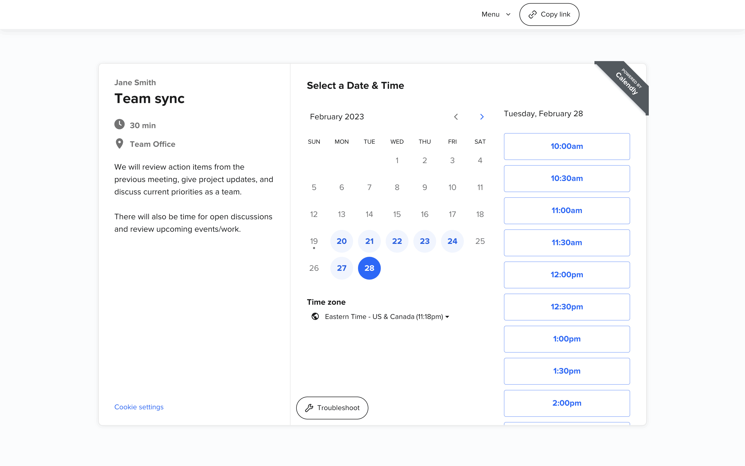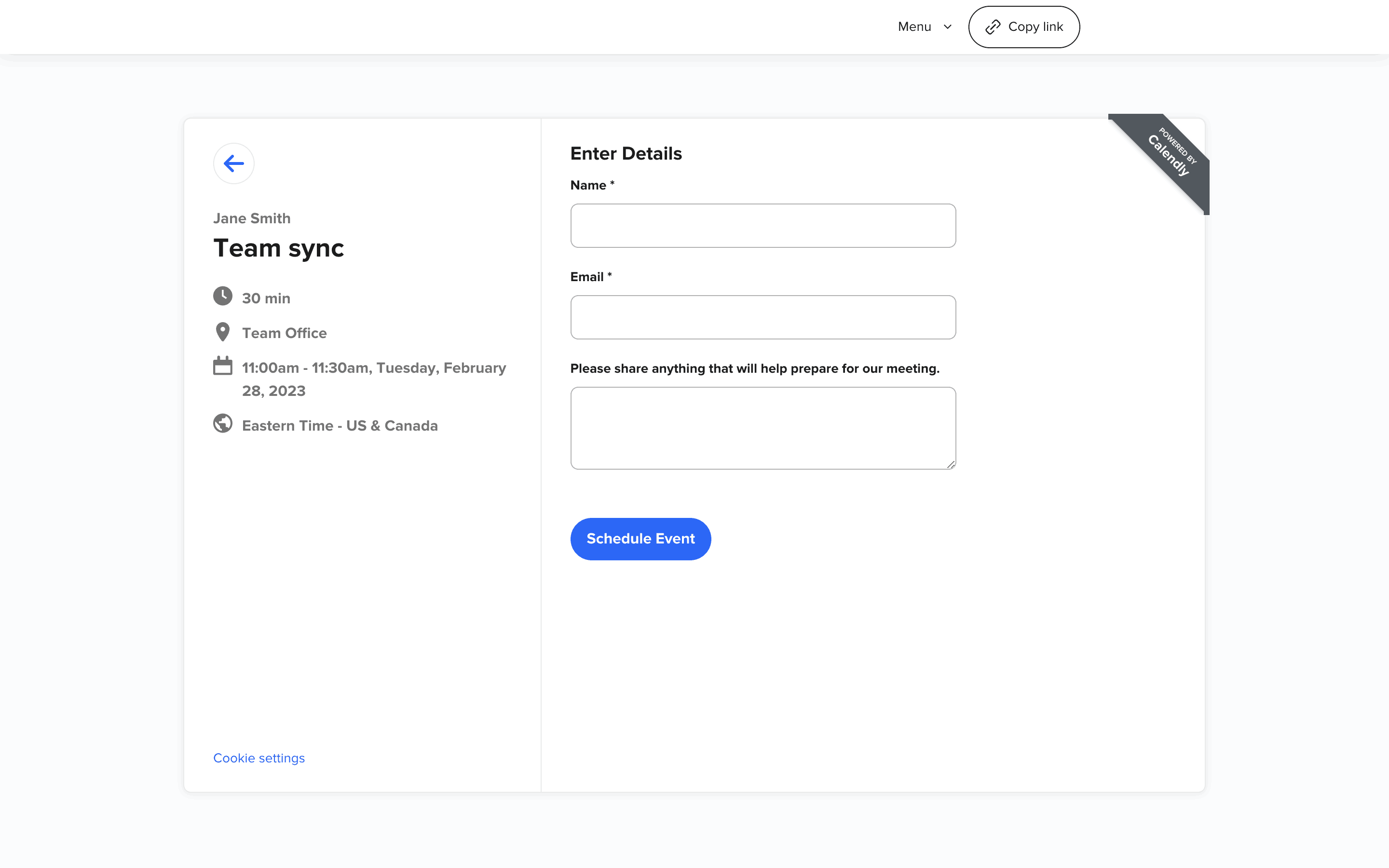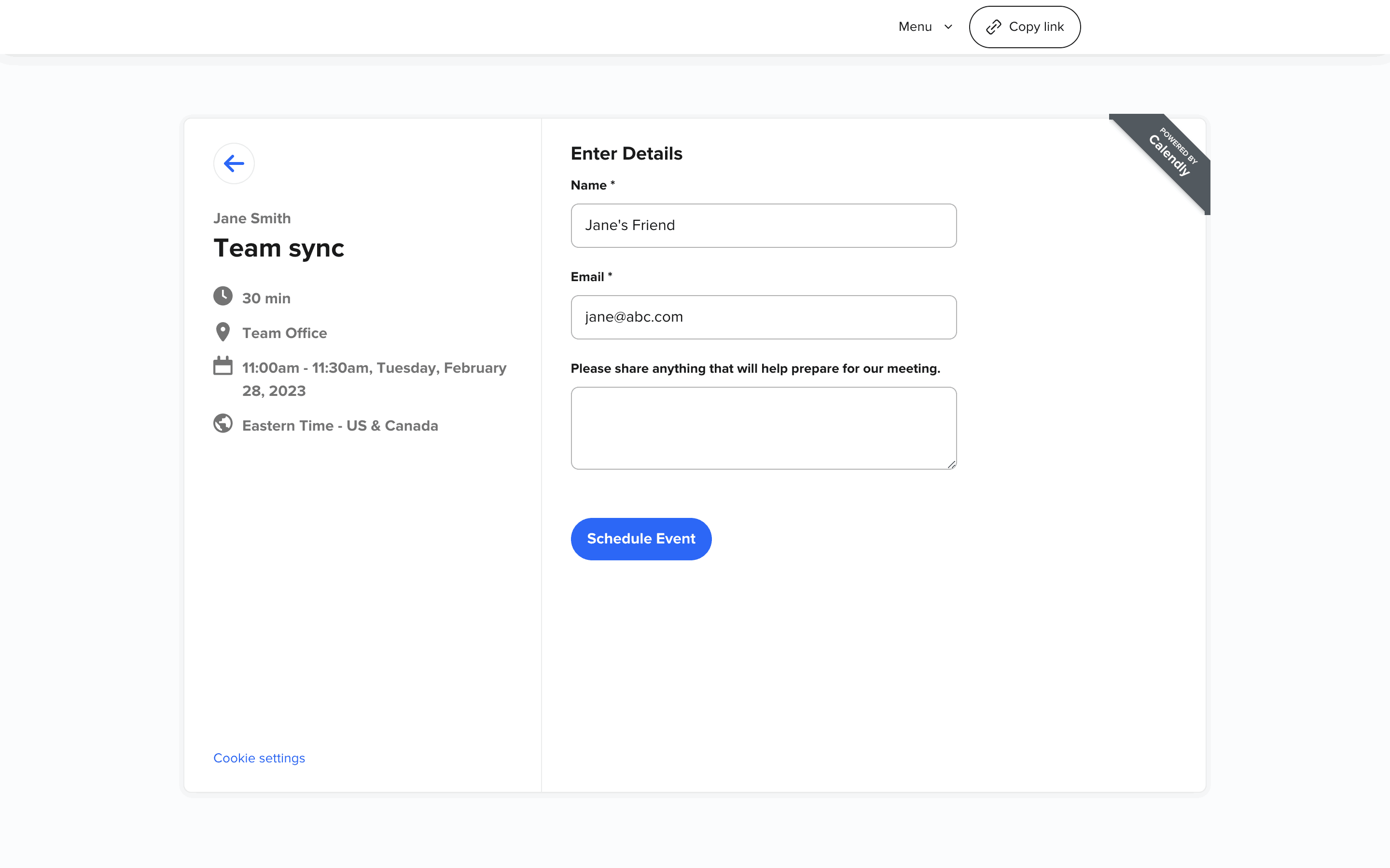 The user flow demonstrates booking a "Team sync" event by selecting a date and time, entering personal details, and receiving a booking confirmation.