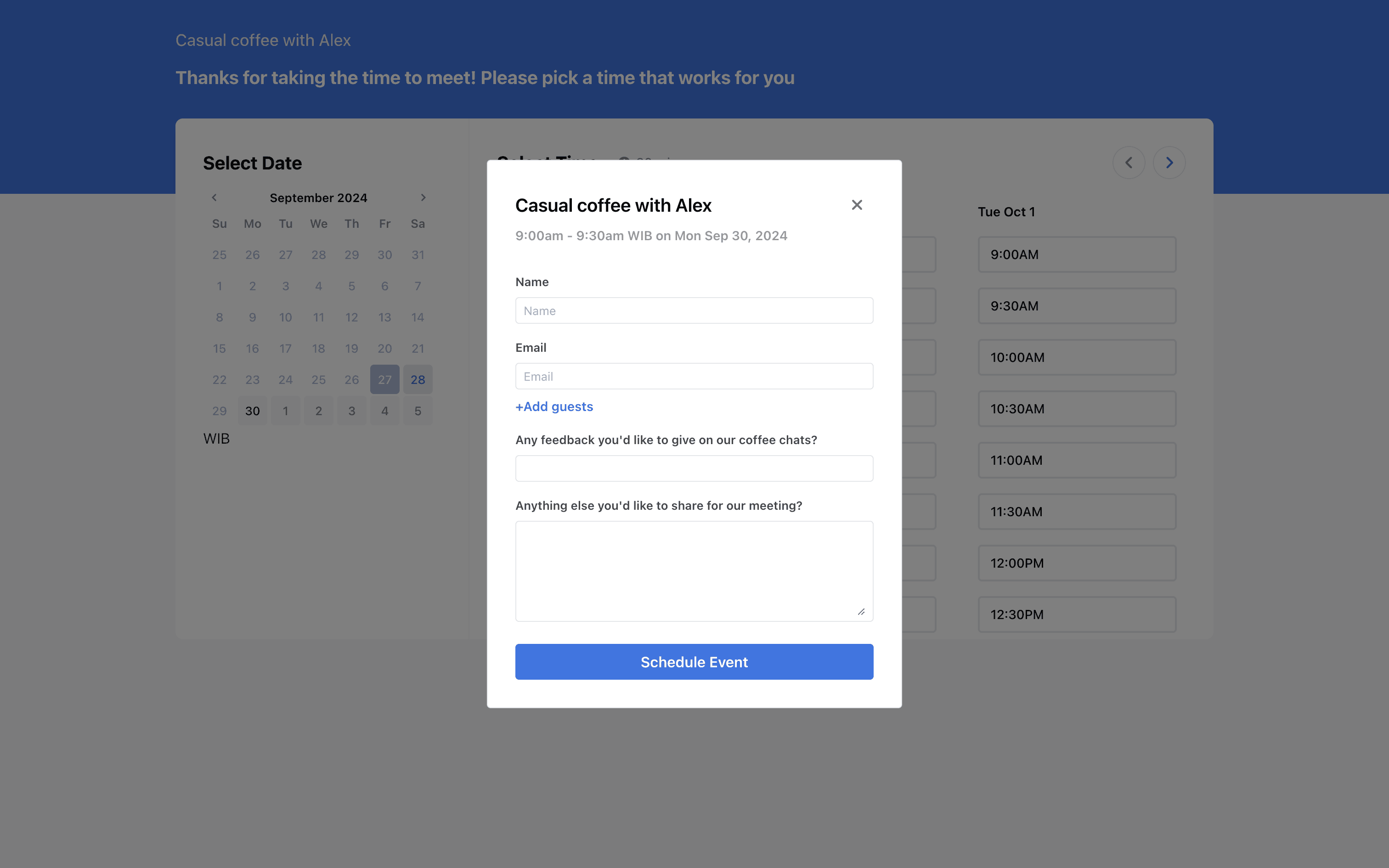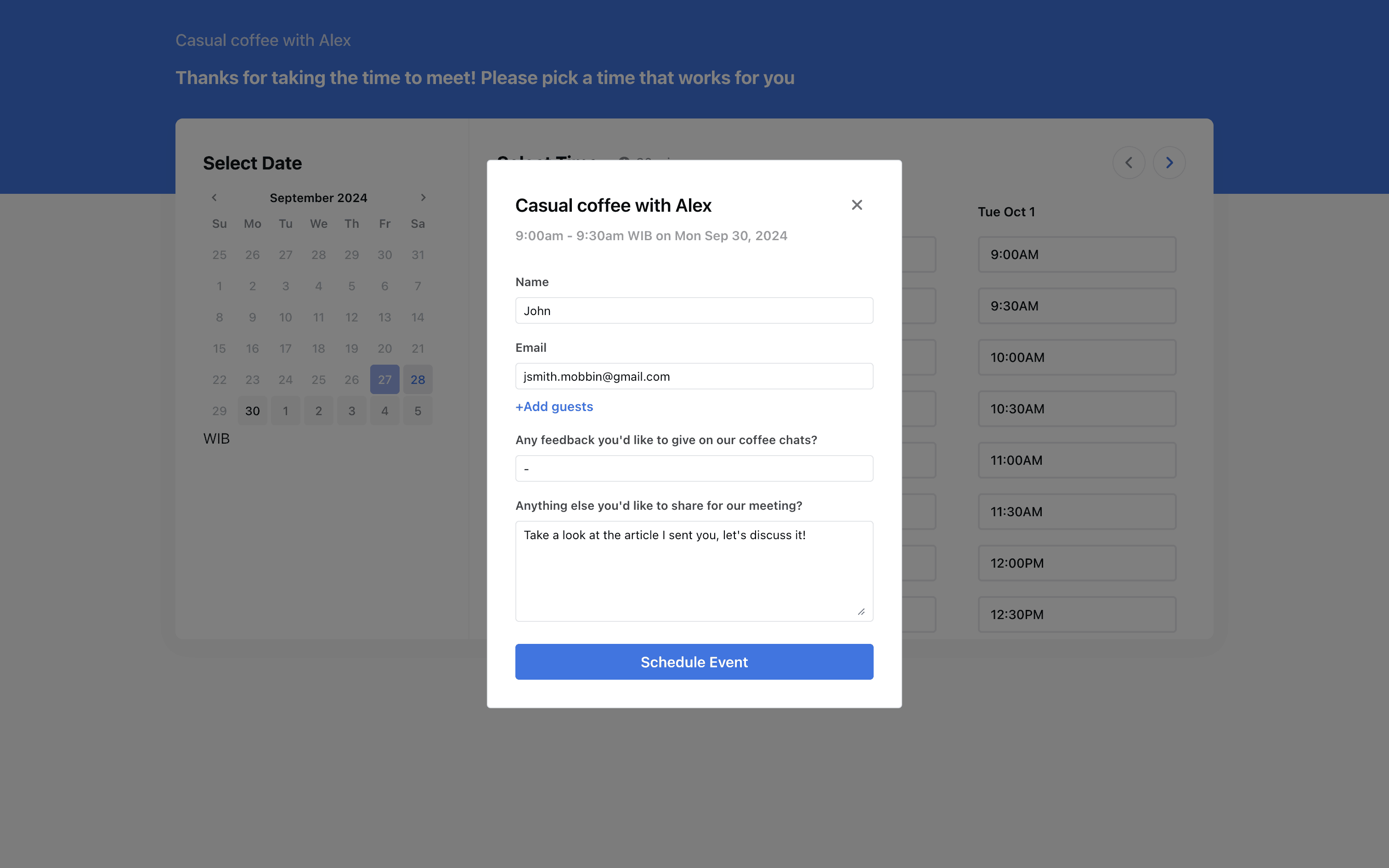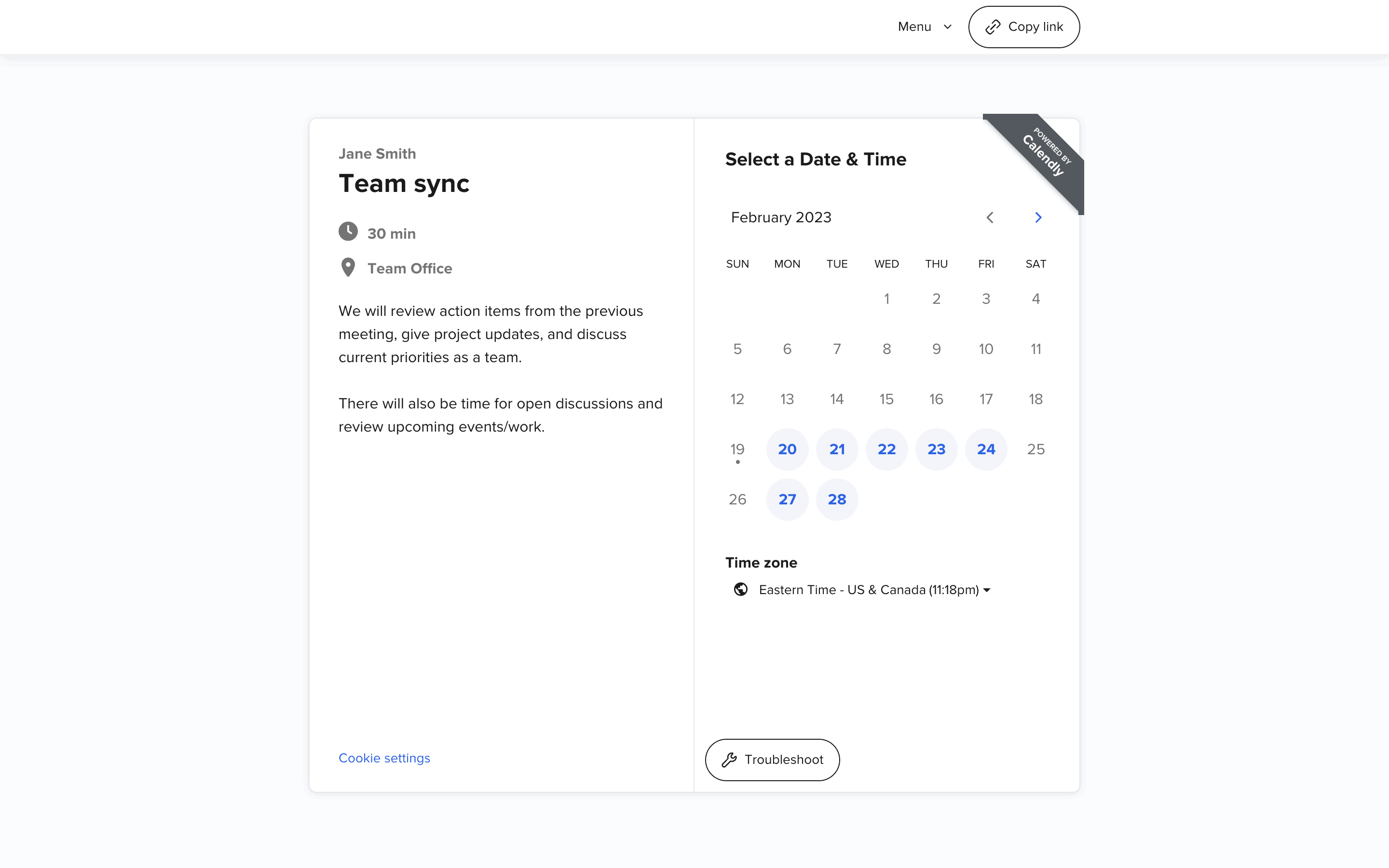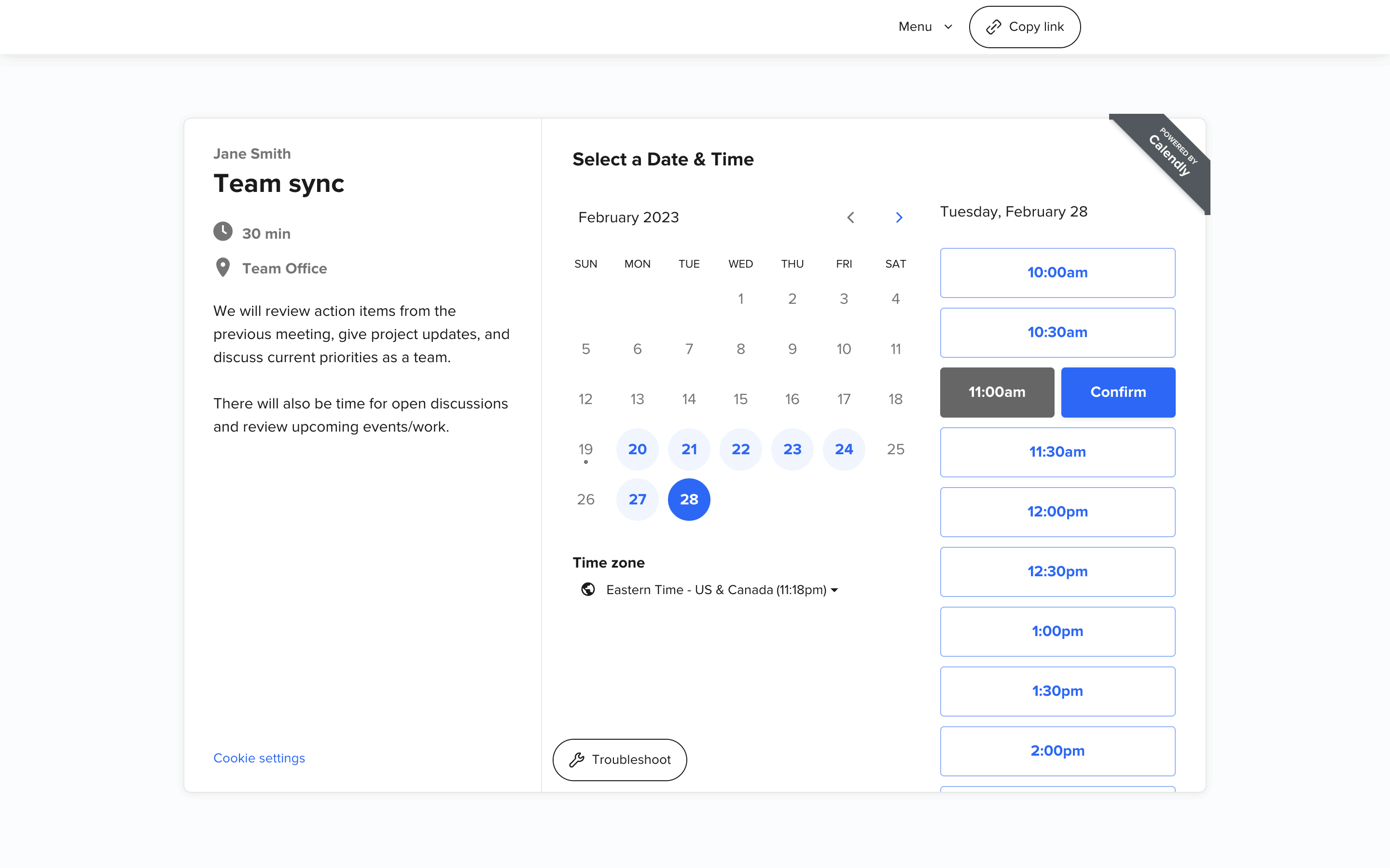The user flow demonstrates booking a "Team sync" event by selecting a date and time, entering personal details, and receiving a booking confirmation.