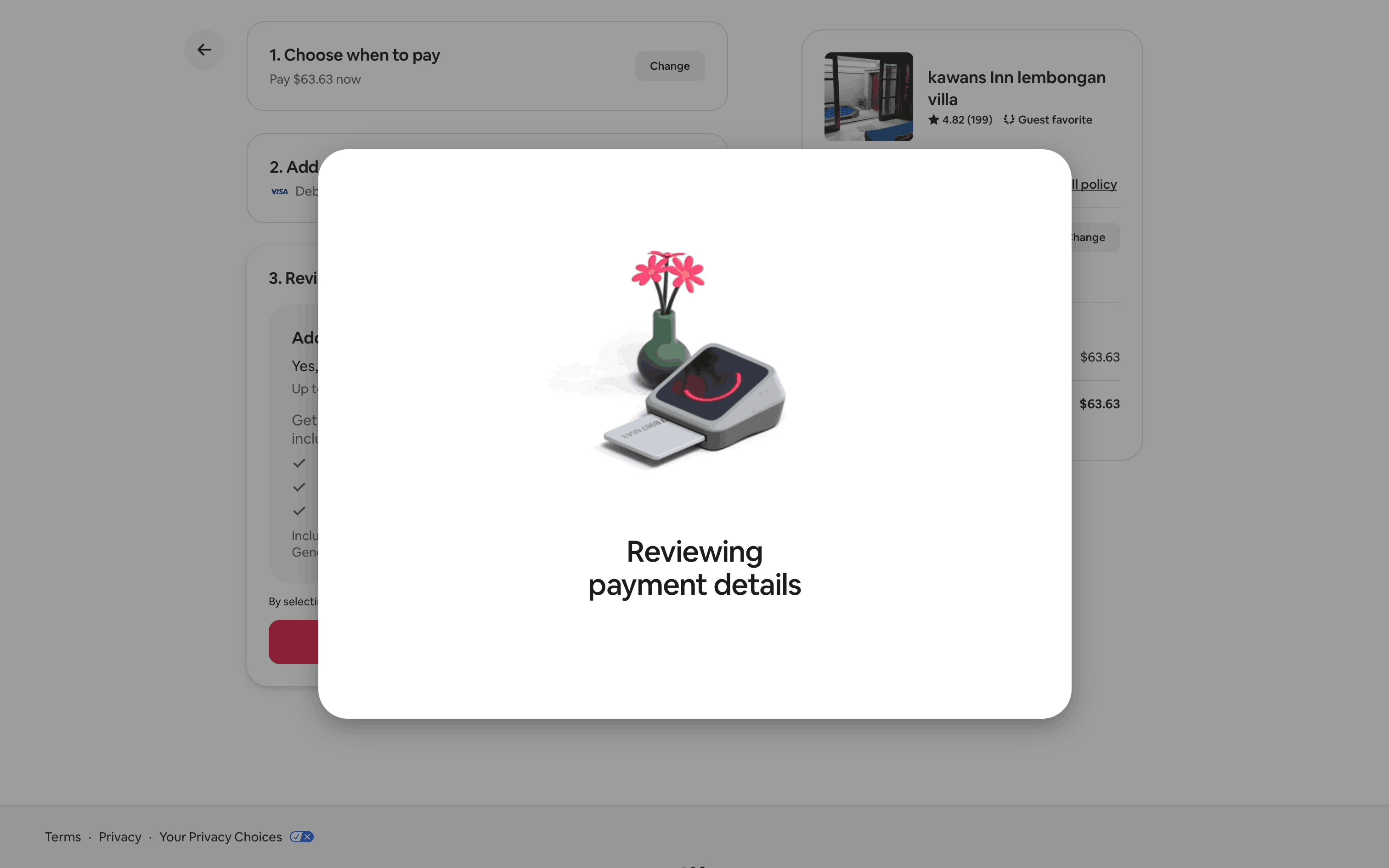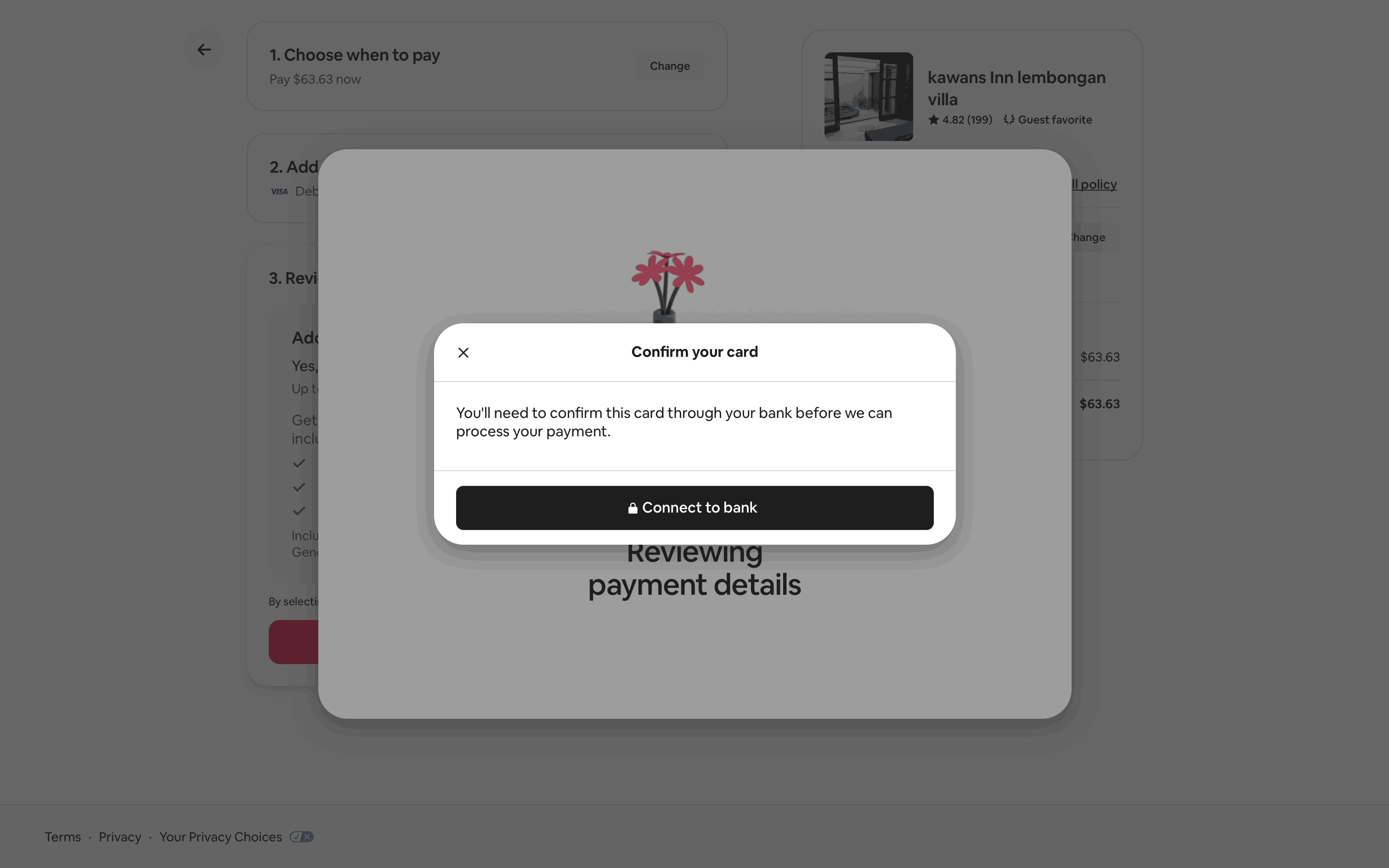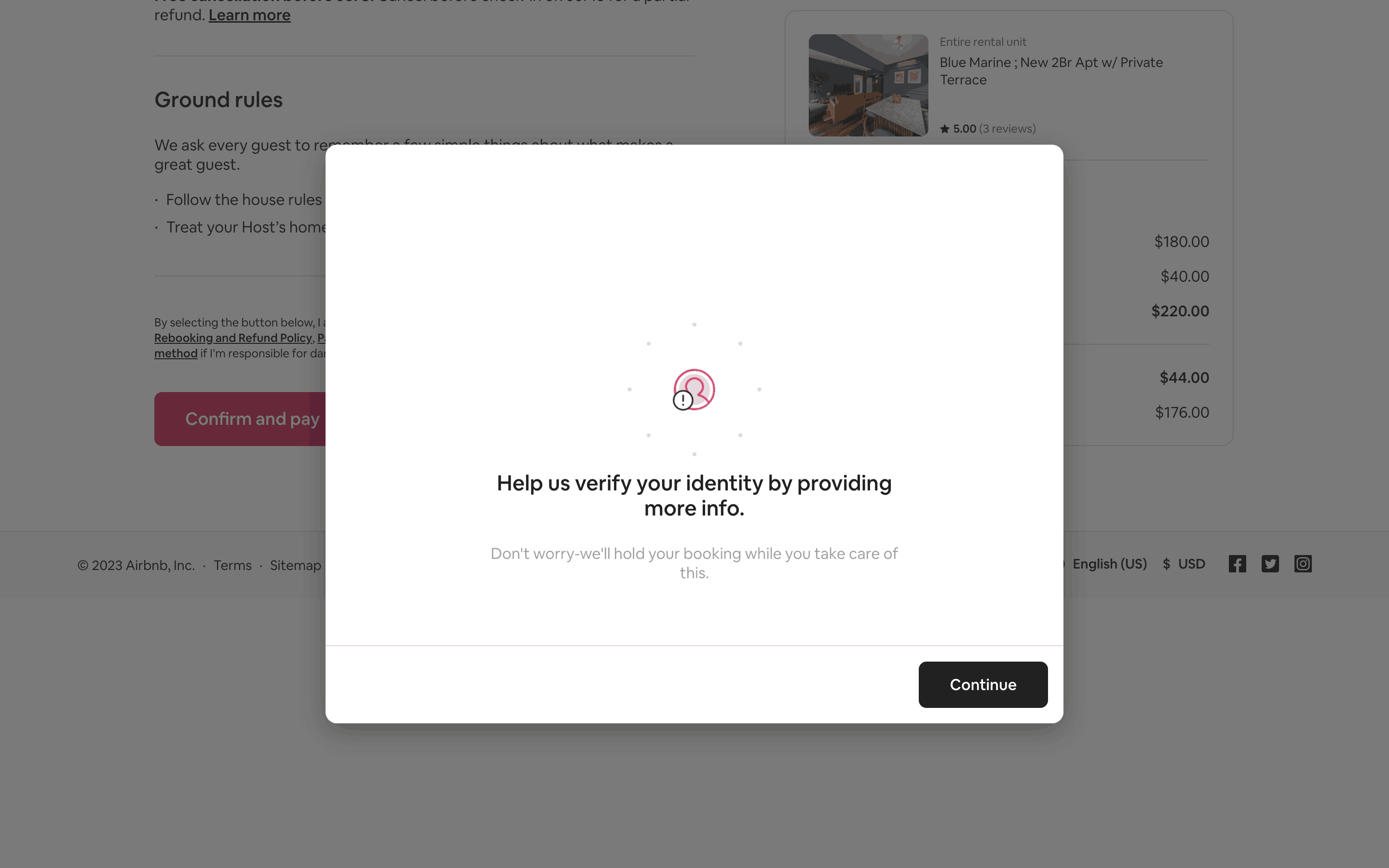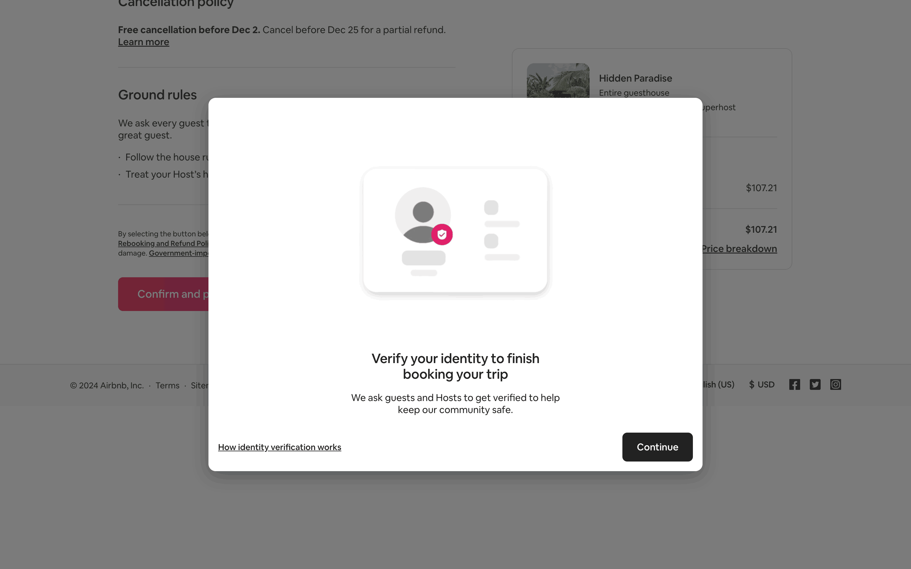 The user confirms a booking and attempts to pay, but is prompted to verify their card and identity. The flow showcases identity verification during payment.