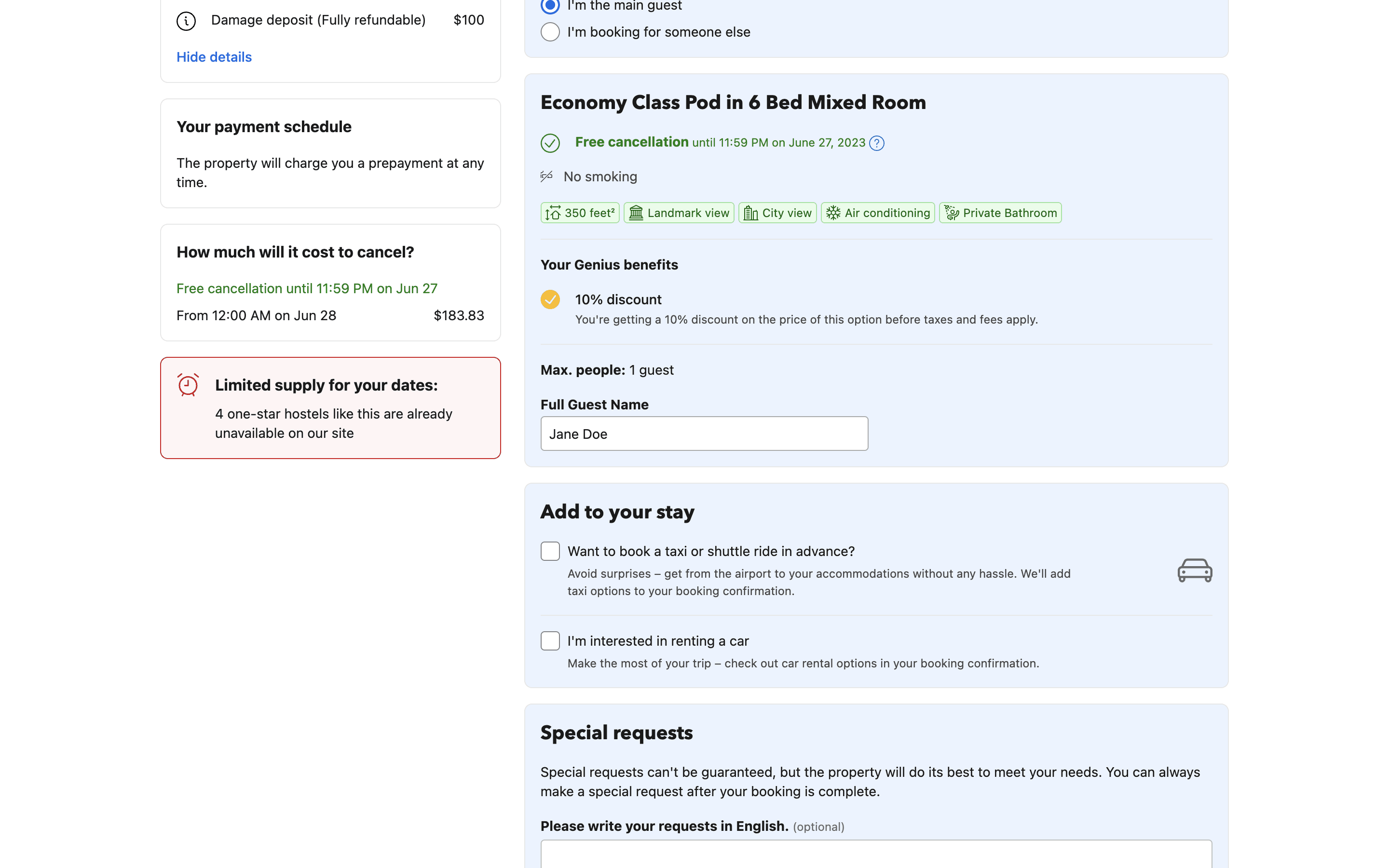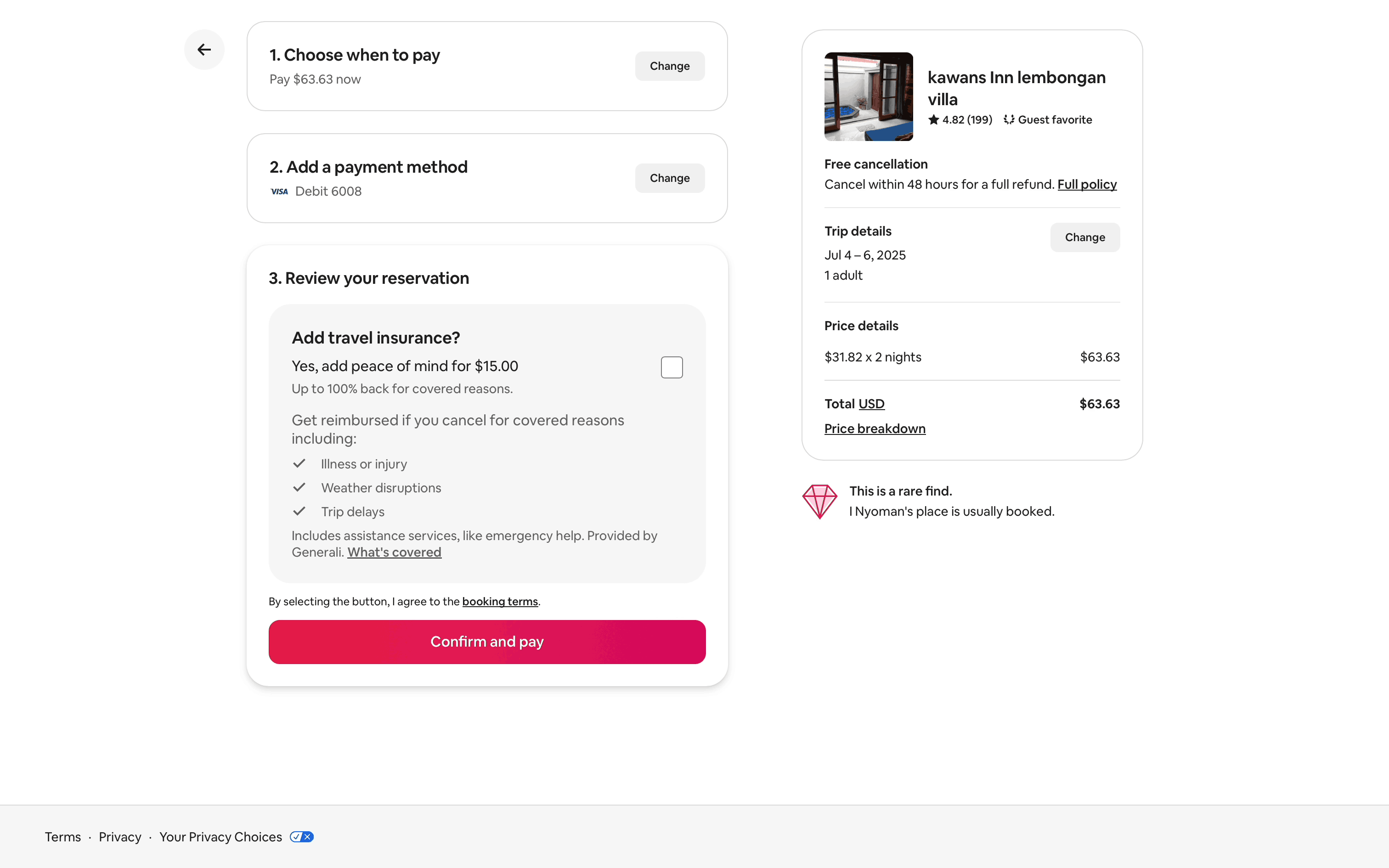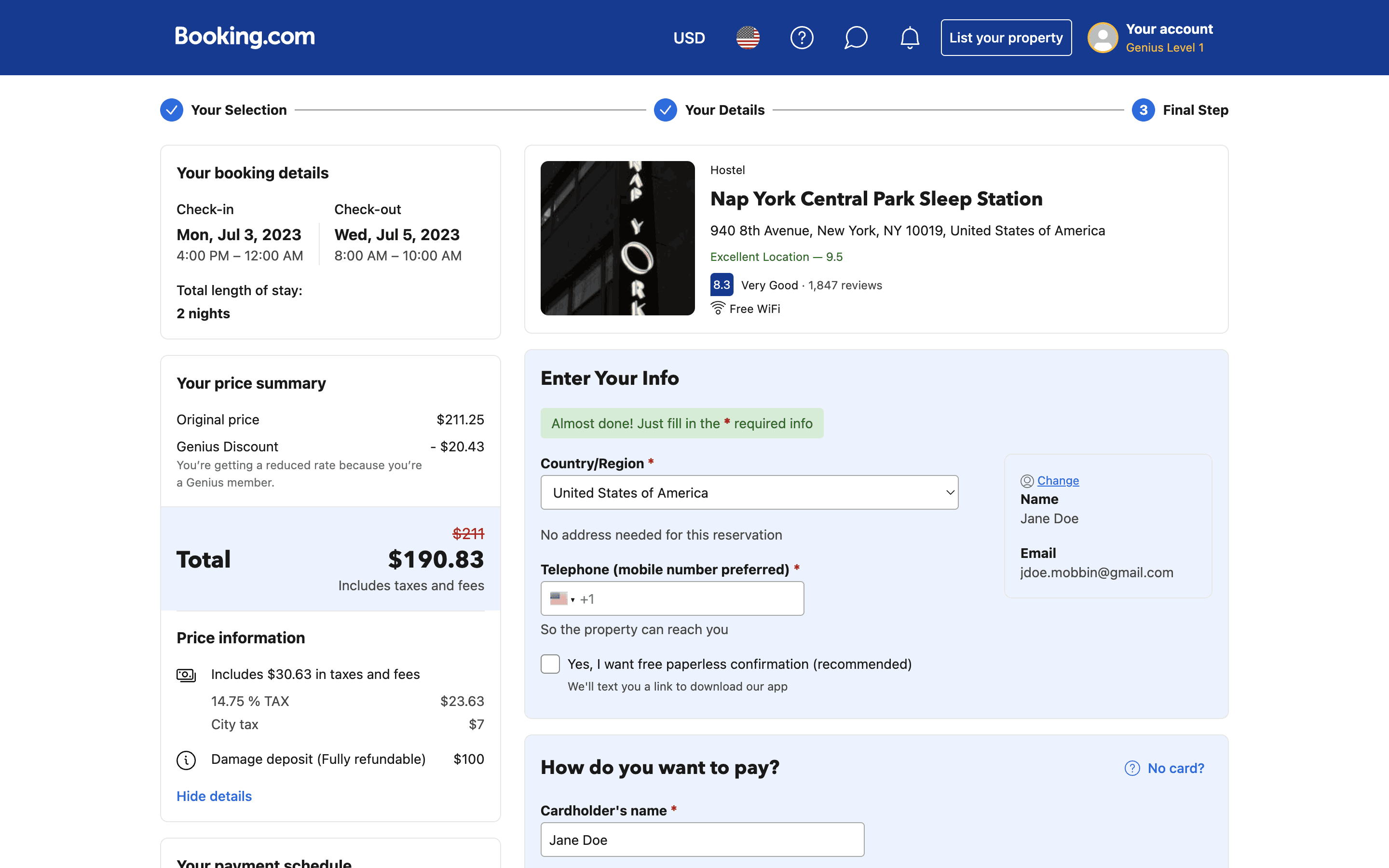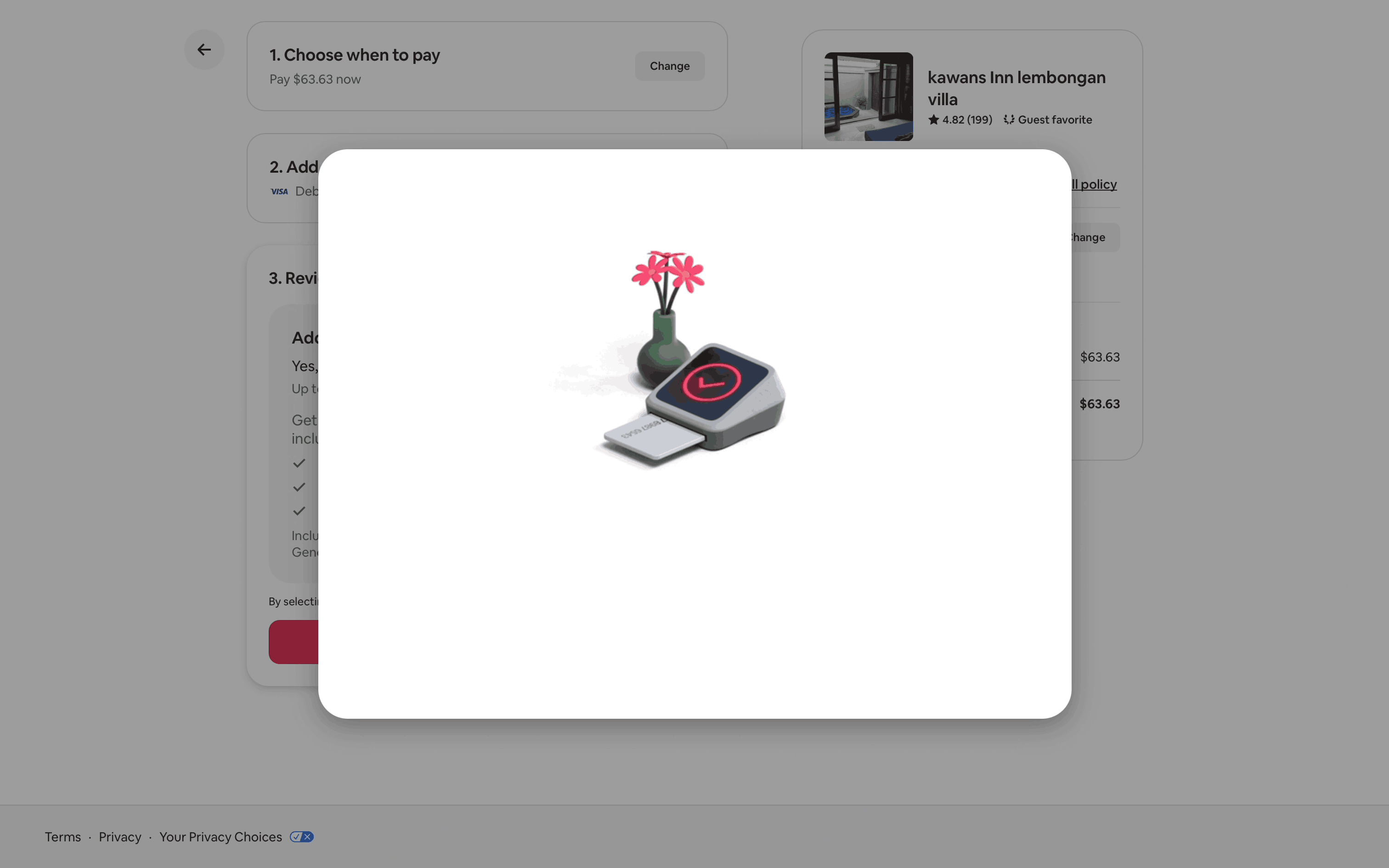 The user confirms a booking and attempts to pay, but is prompted to verify their card and identity. The flow showcases identity verification during payment.