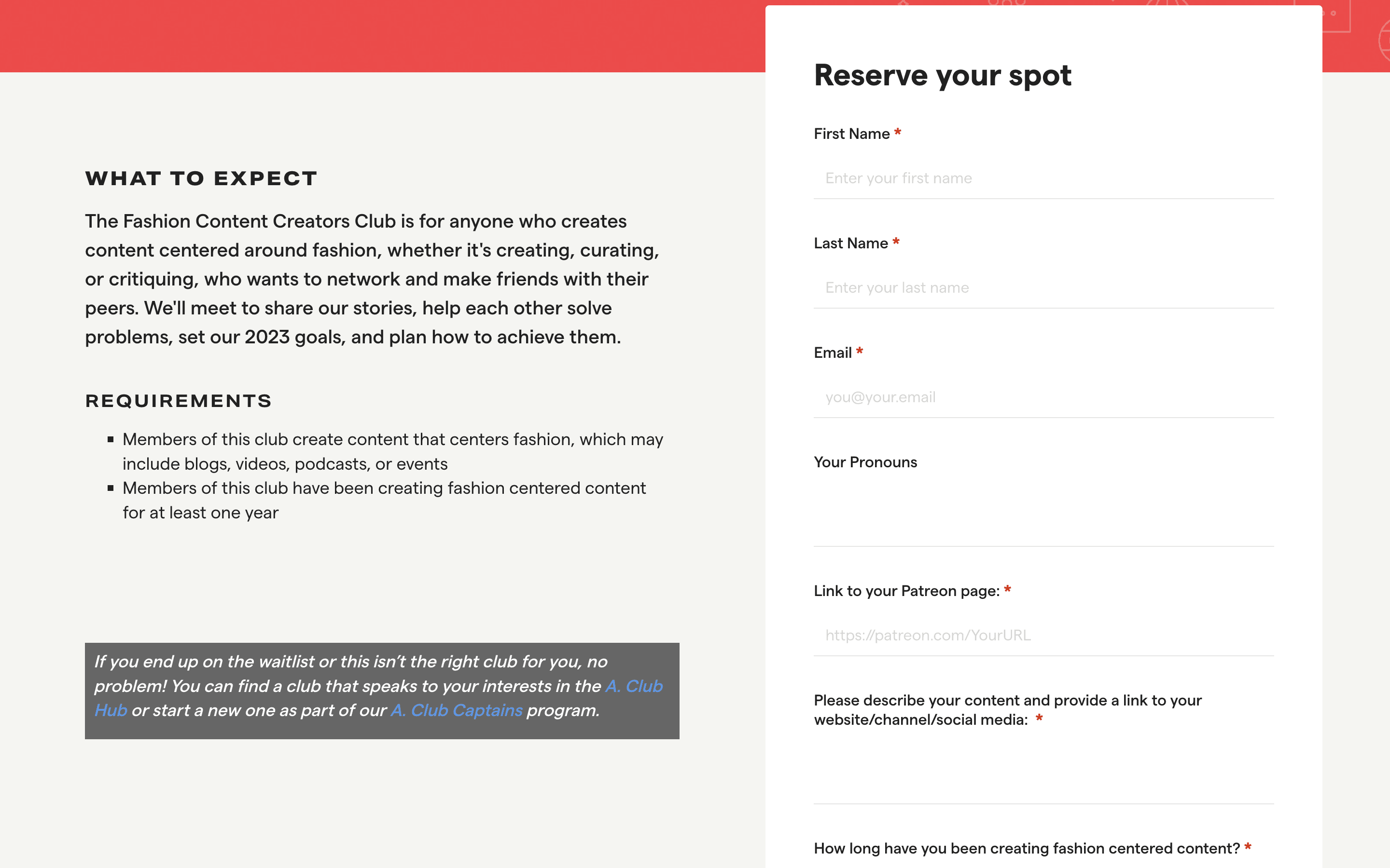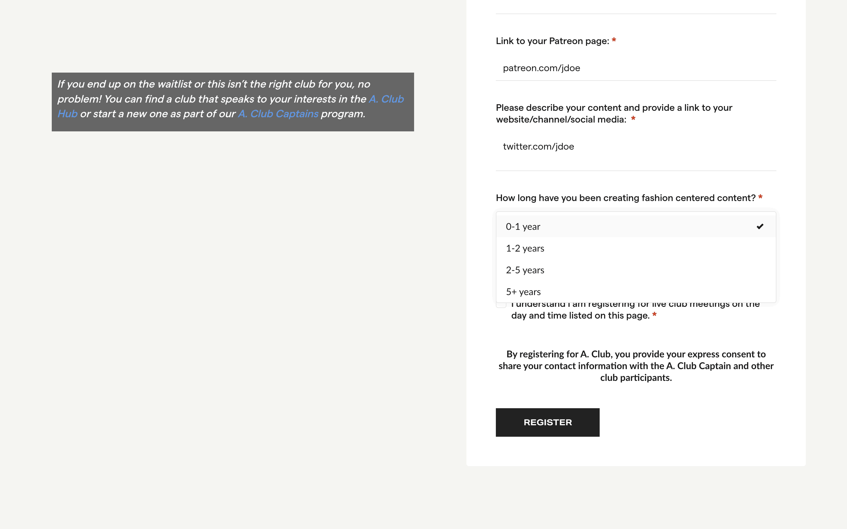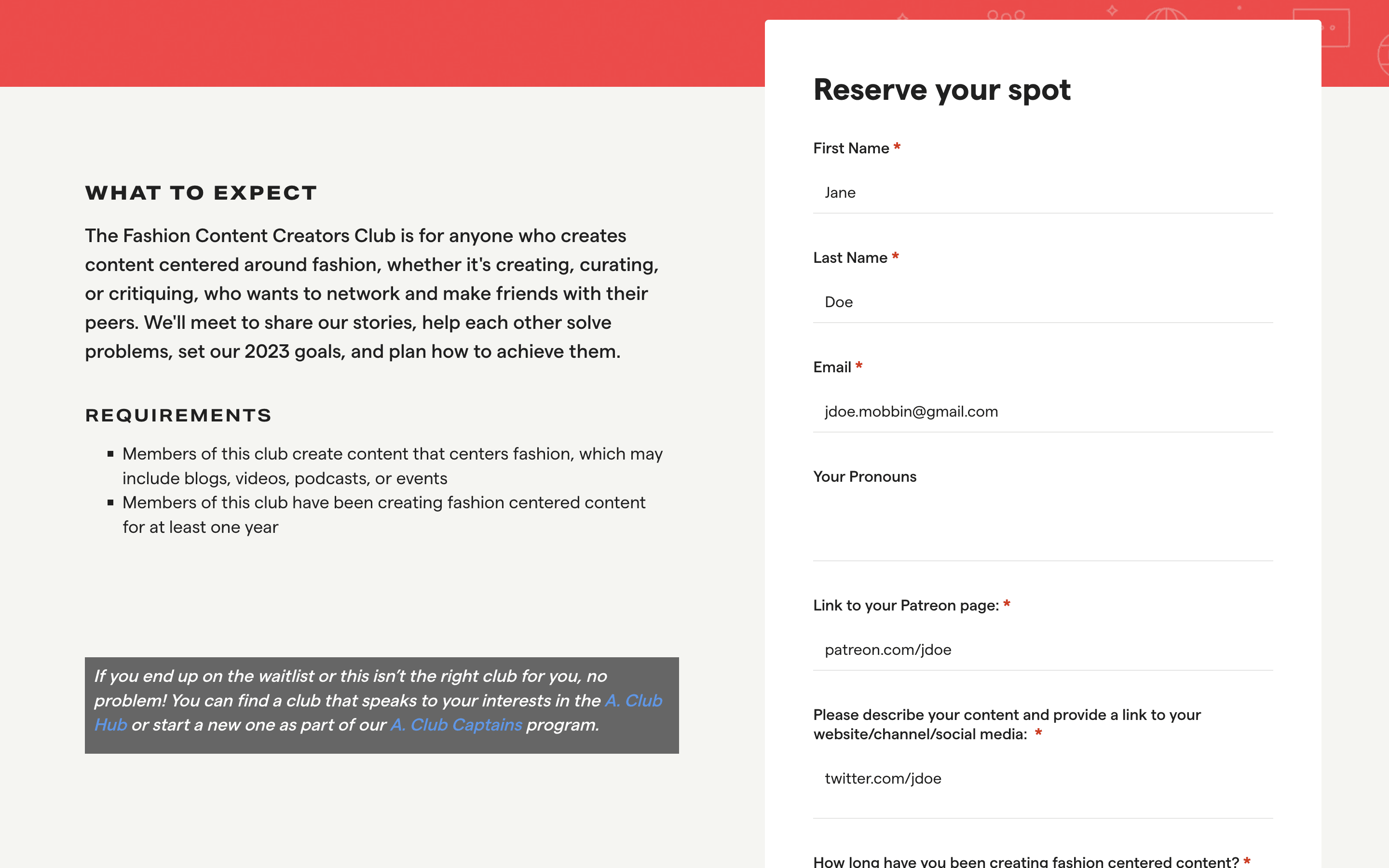 The user fills out a registration form, agrees to the terms, and submits the form to reserve a spot. A confirmation message is then displayed.
