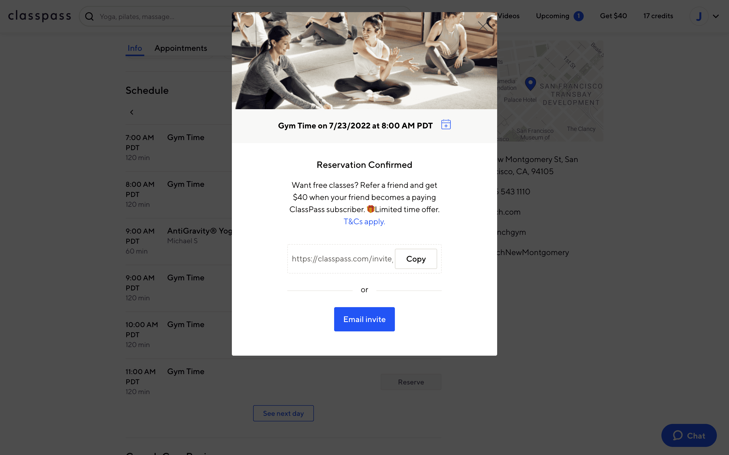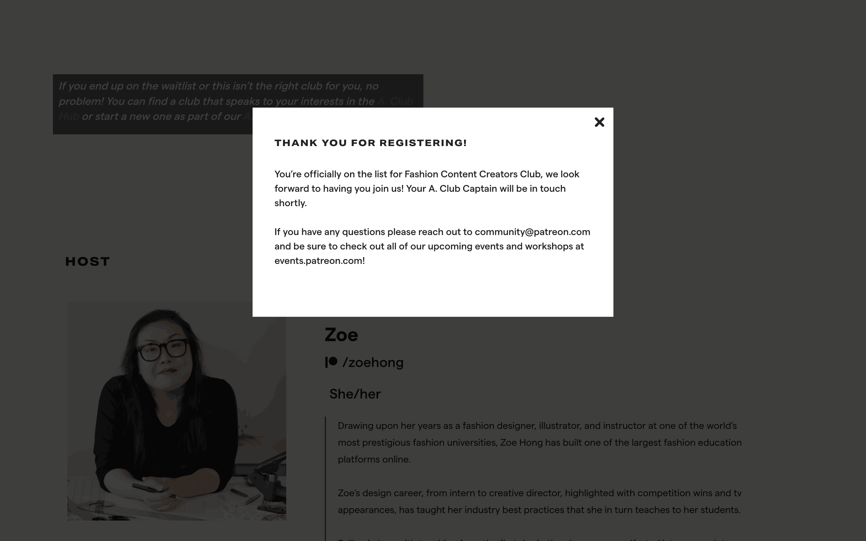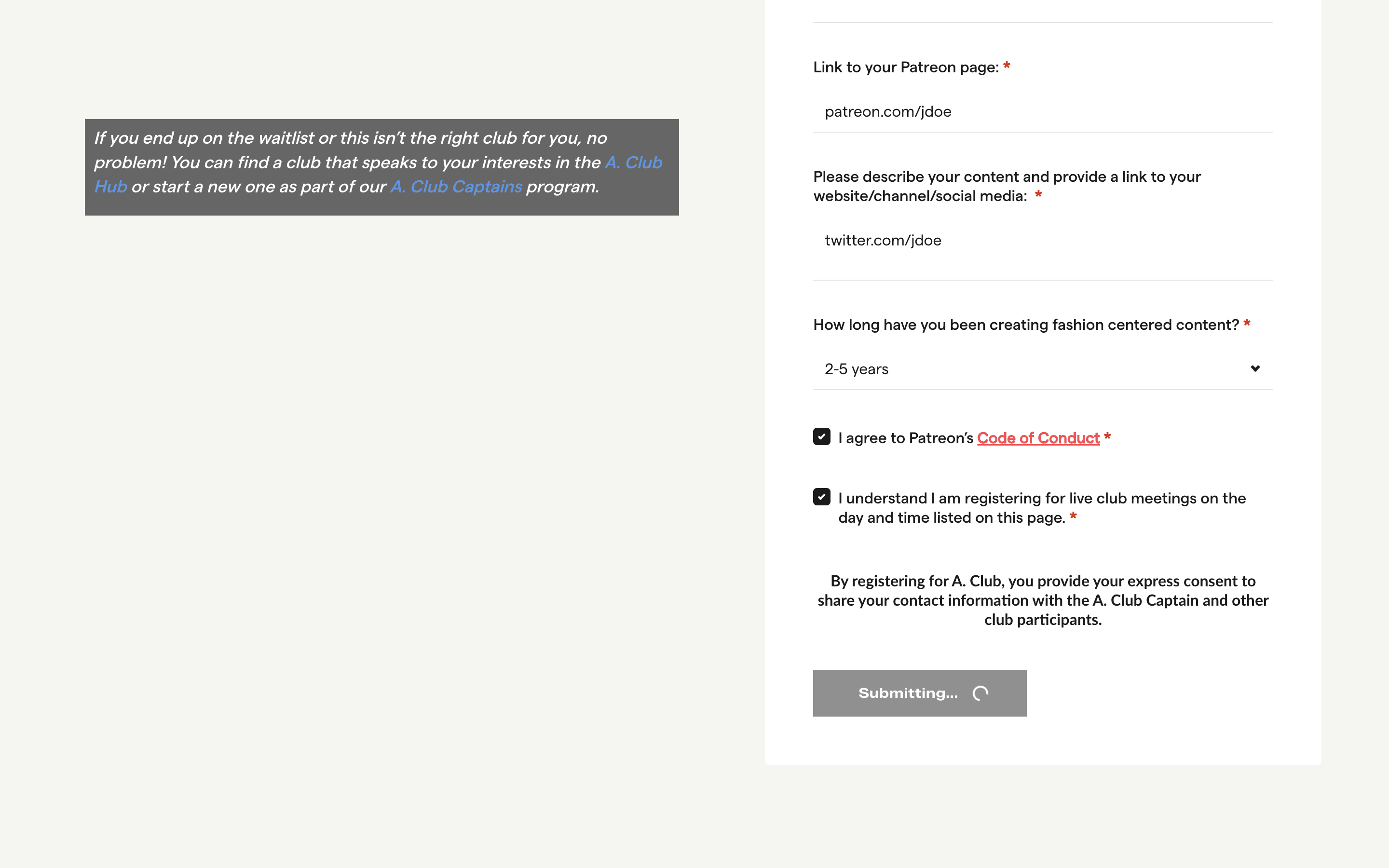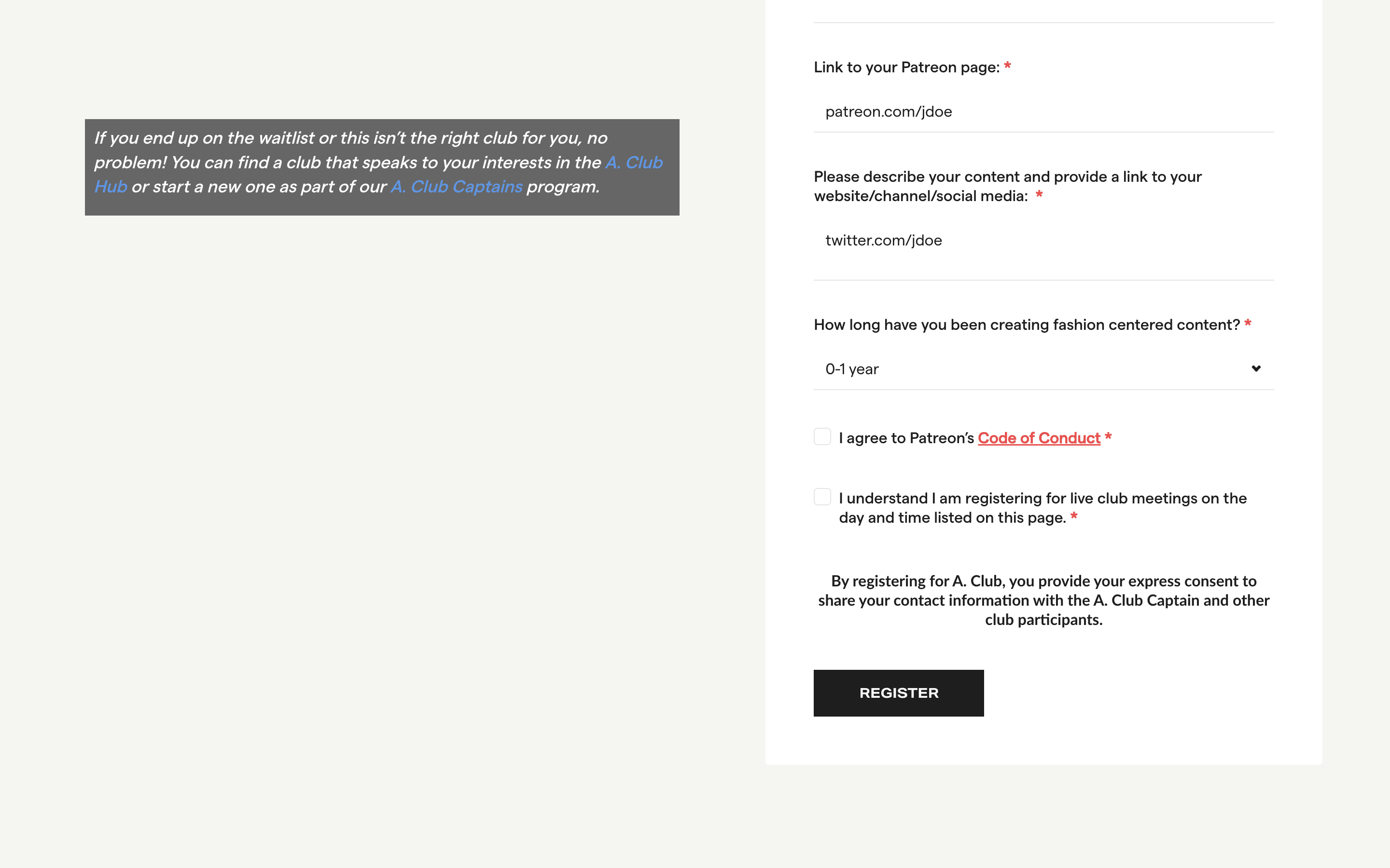 The user fills out a registration form, agrees to the terms, and submits the form to reserve a spot. A confirmation message is then displayed.