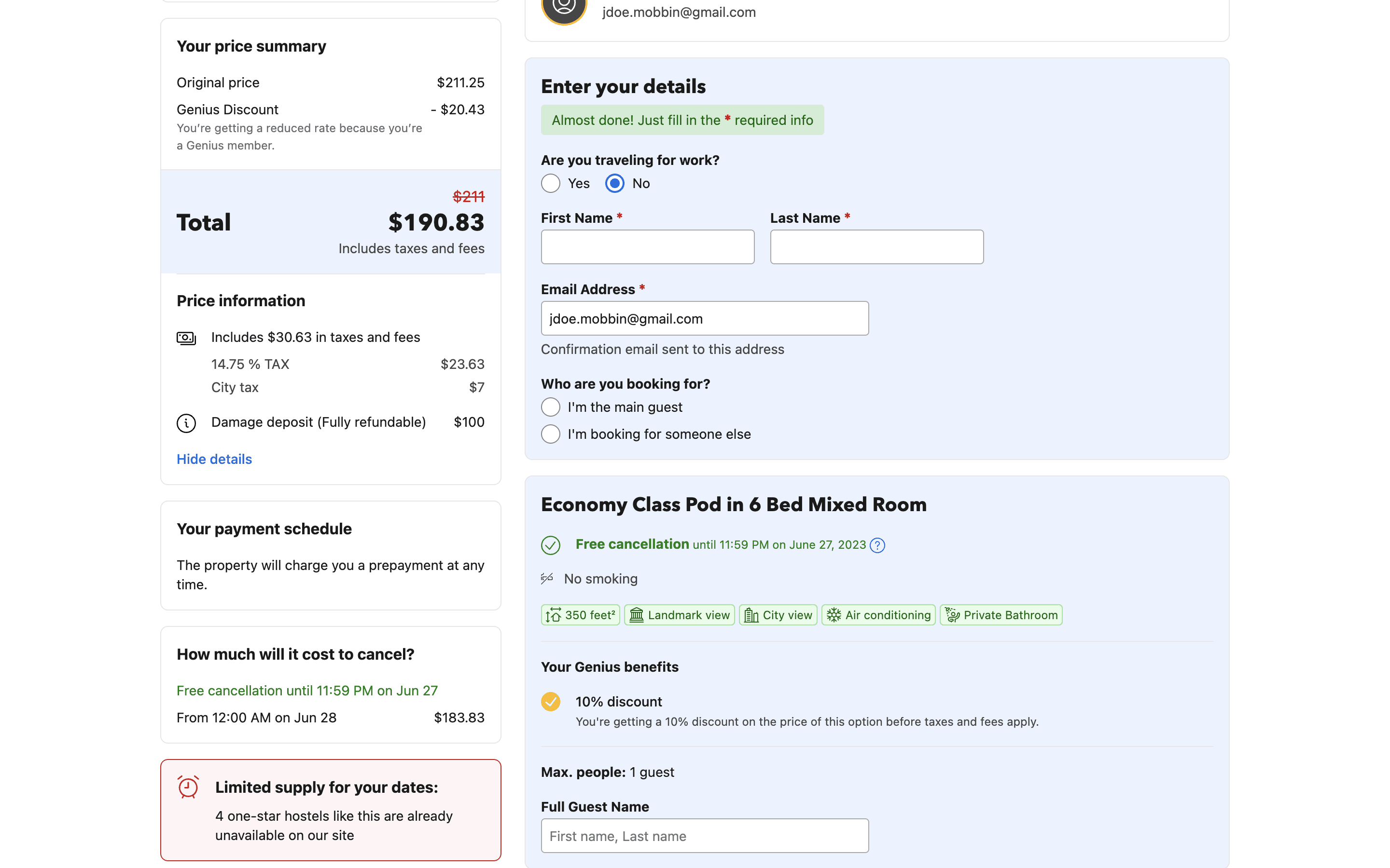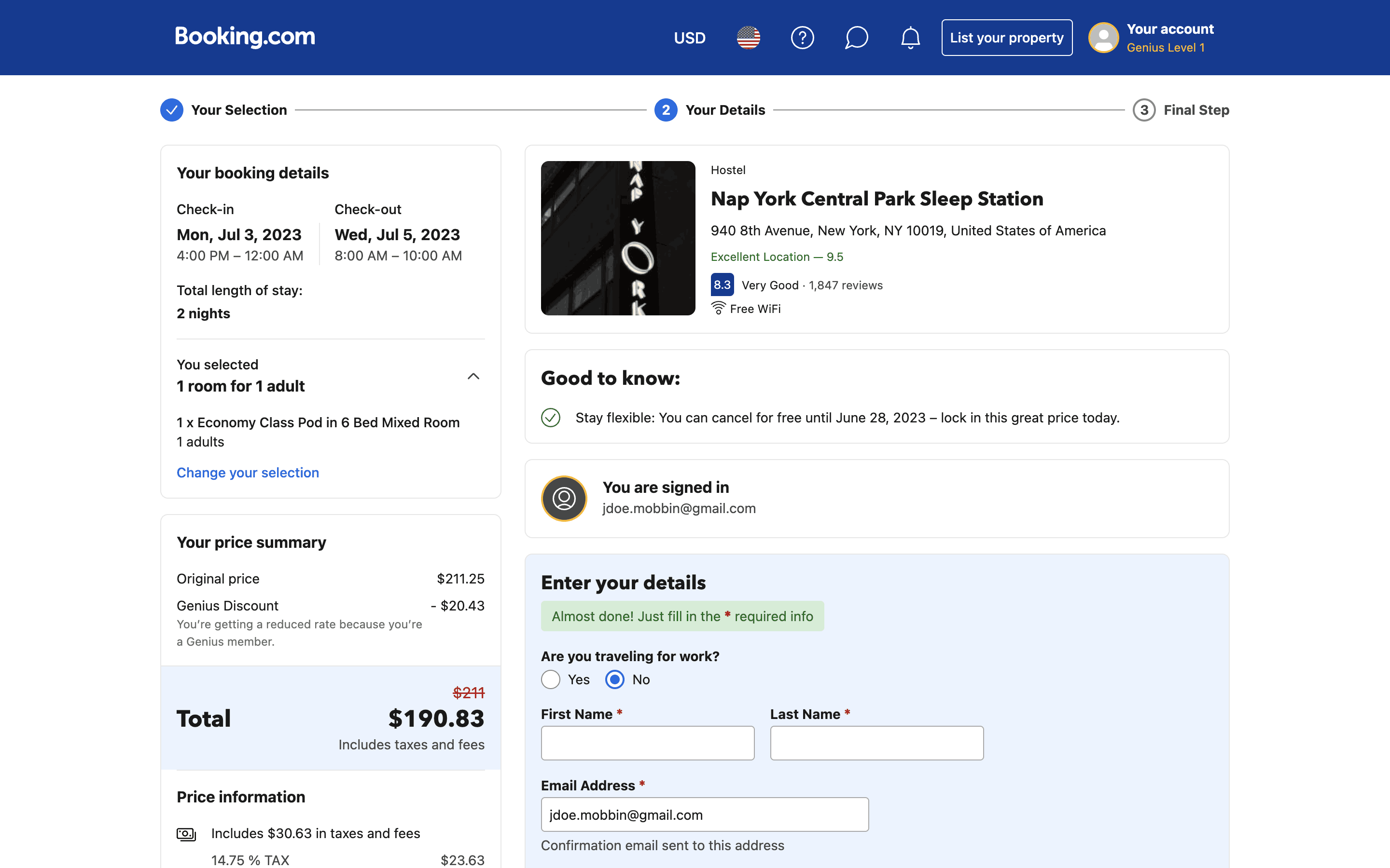The user searches for a hotel, selects a room, and then fills in their personal and payment details to reserve the room. The flow culminates in the user providing payment information.