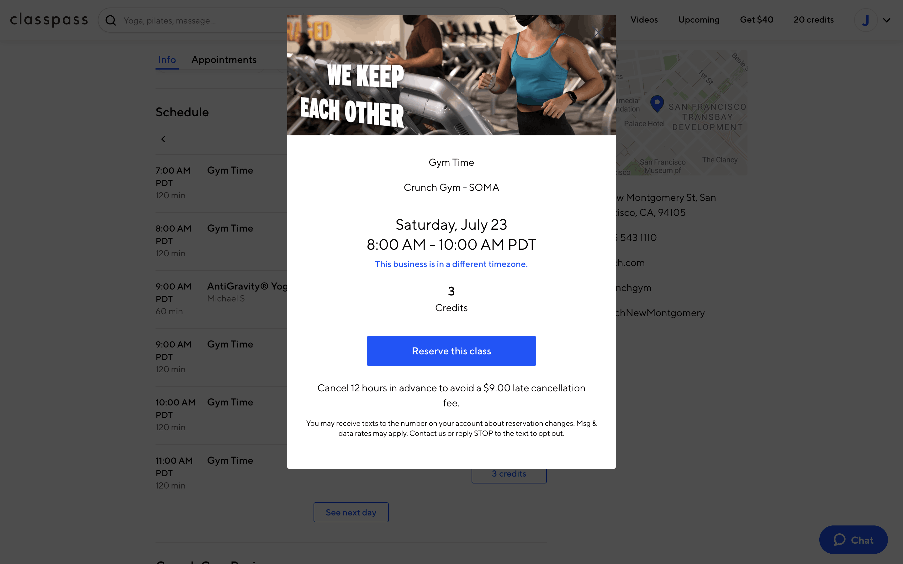The user flow shows the process of reserving a class, from browsing the schedule to confirming the reservation. The schedule is then updated to reflect the change.