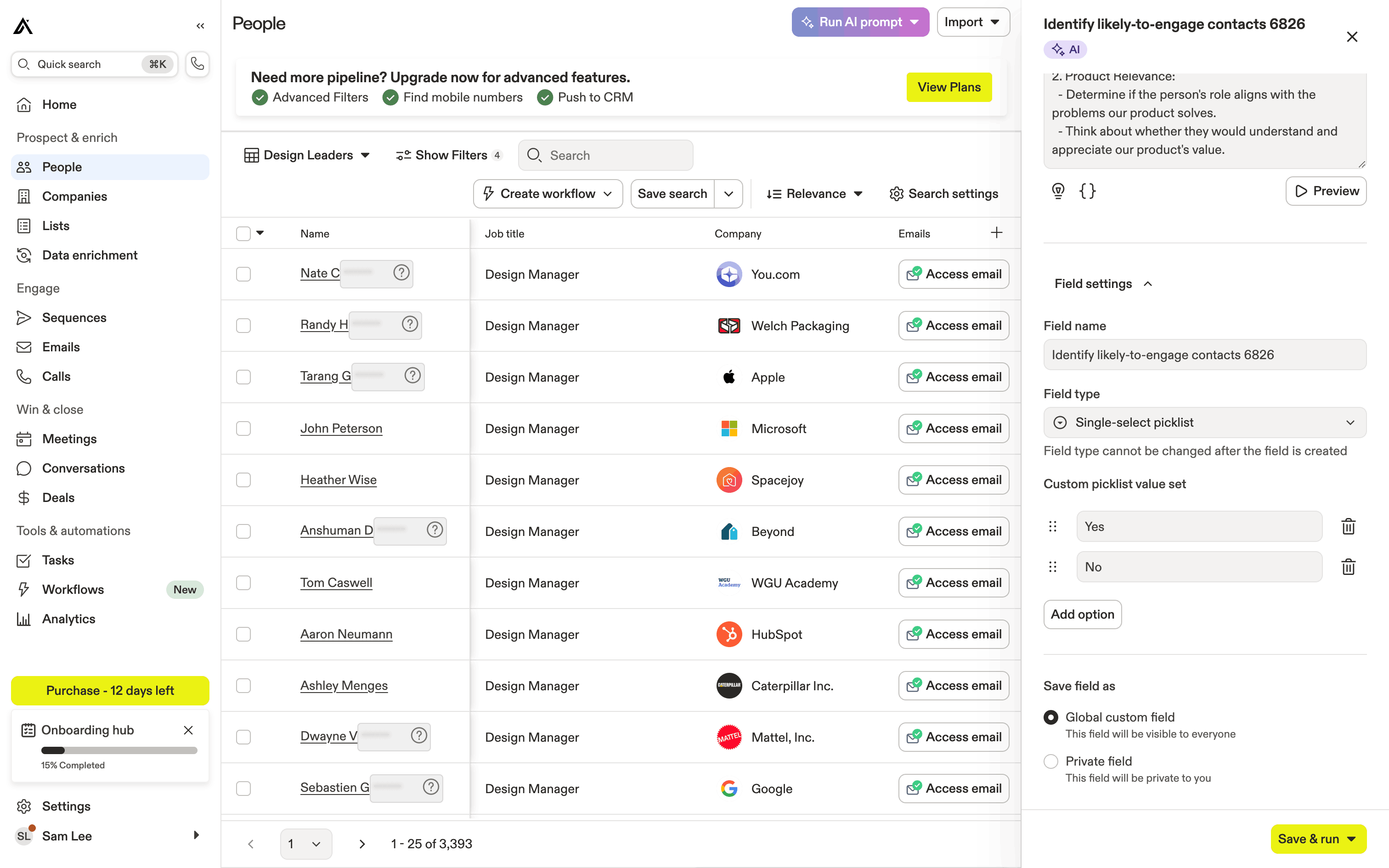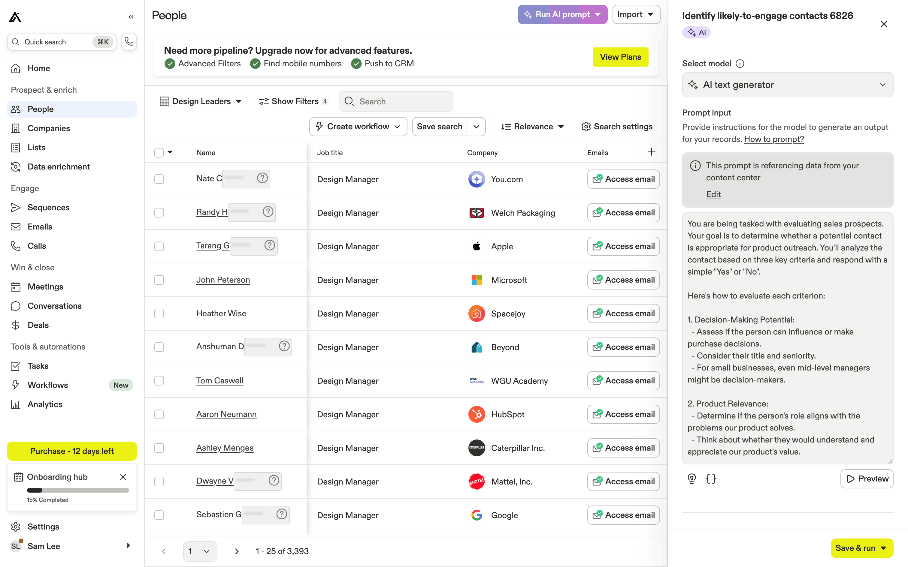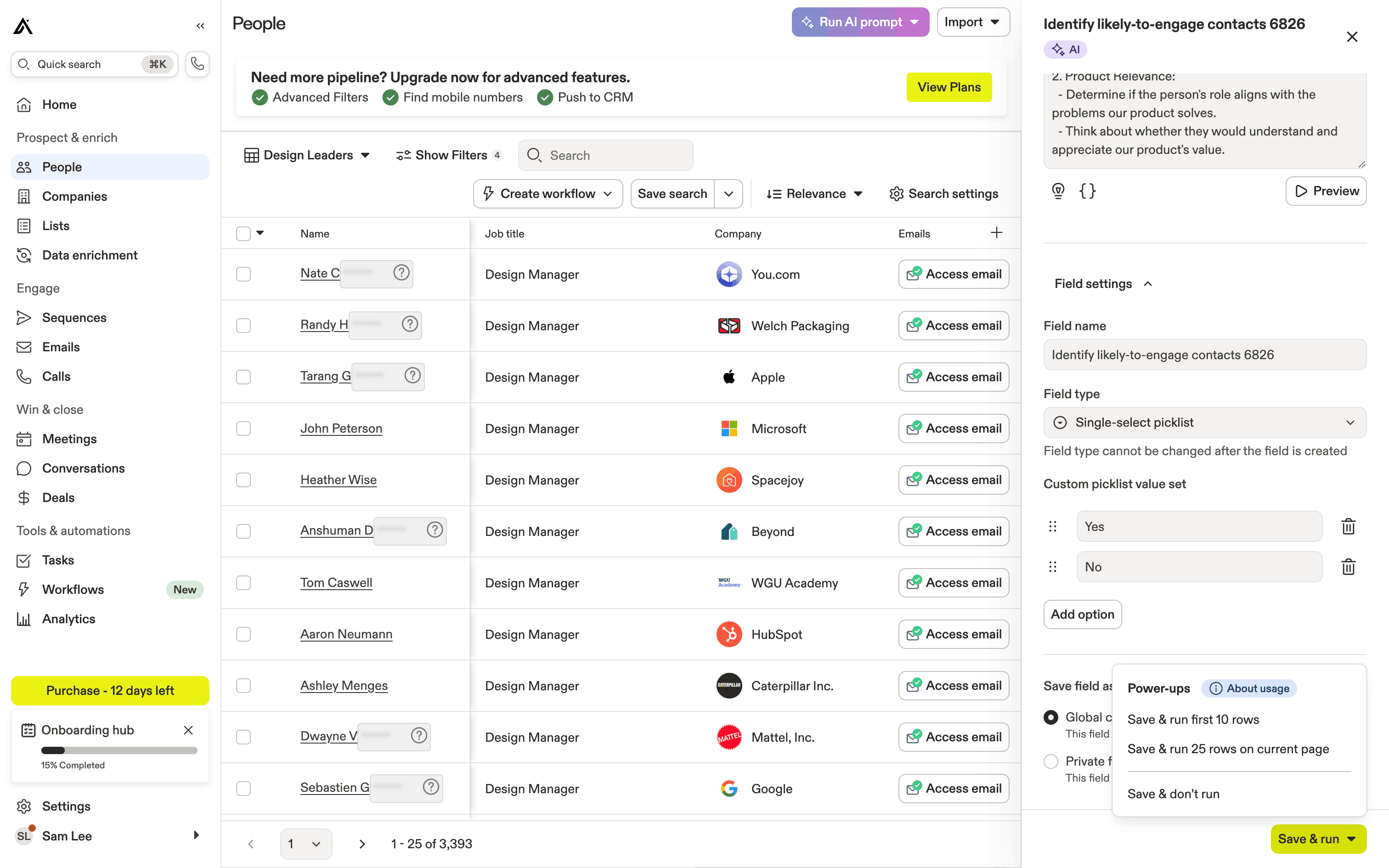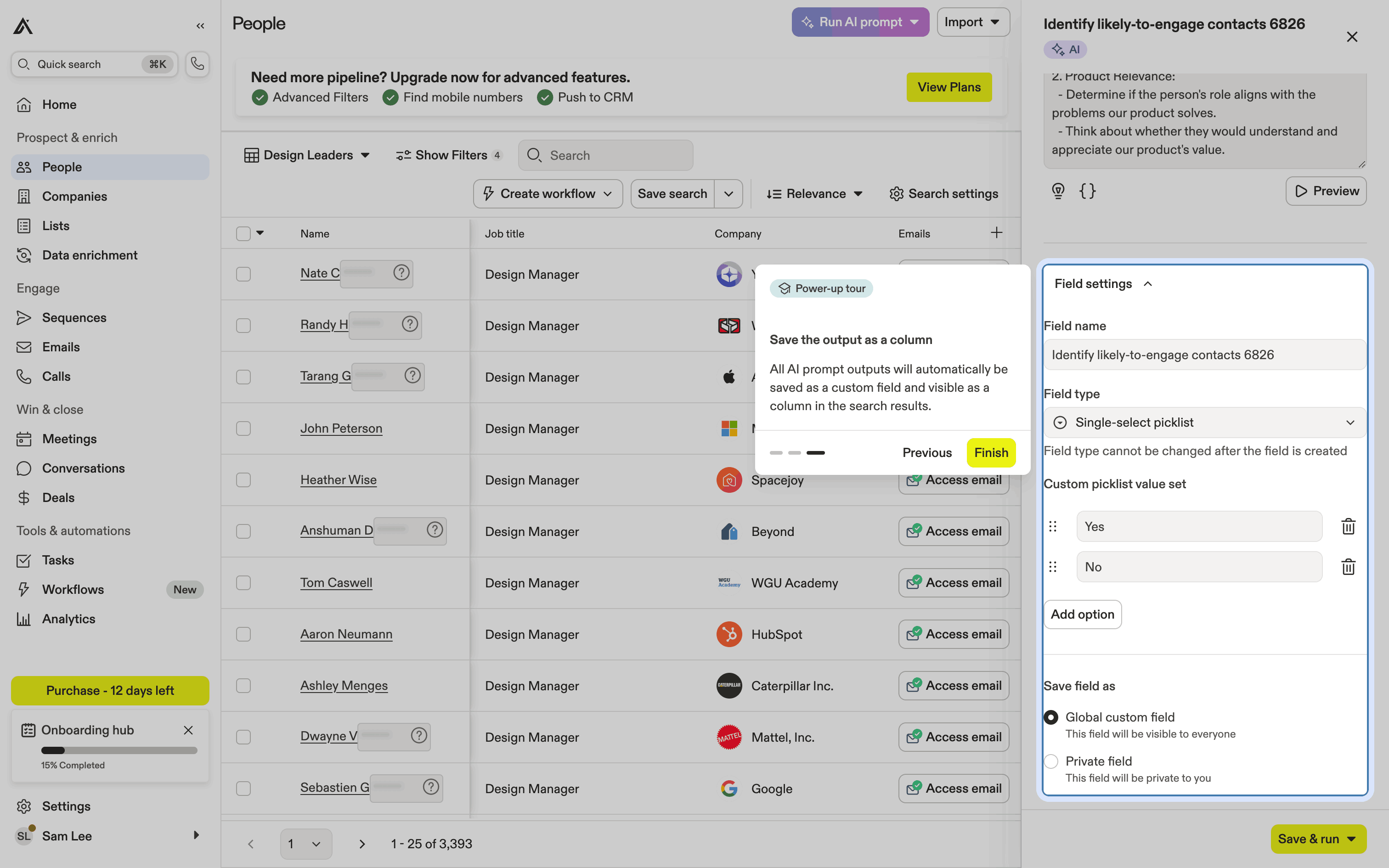 The user runs an AI prompt on a list of people to identify likely-to-engage contacts. The AI results are displayed in a new column.