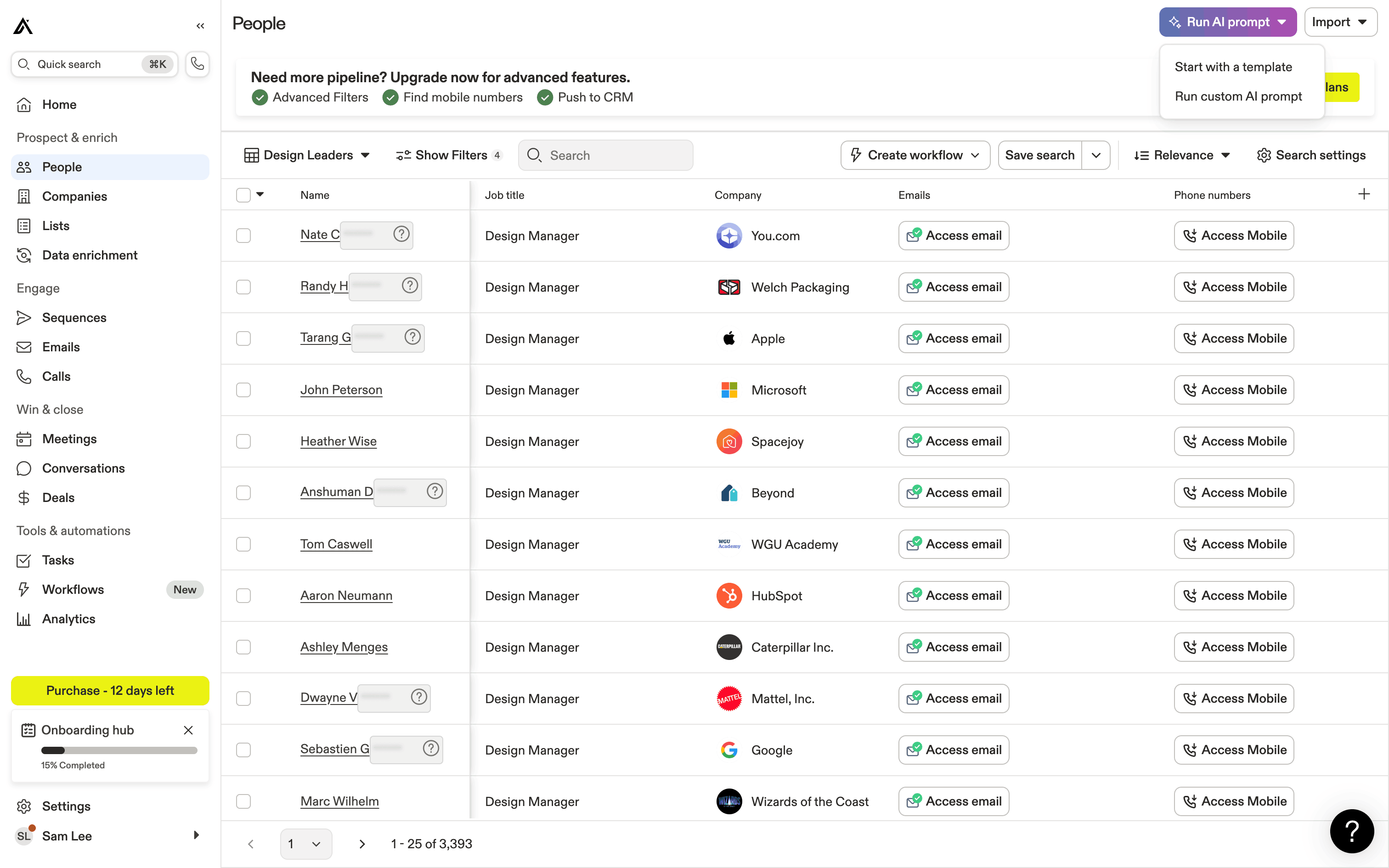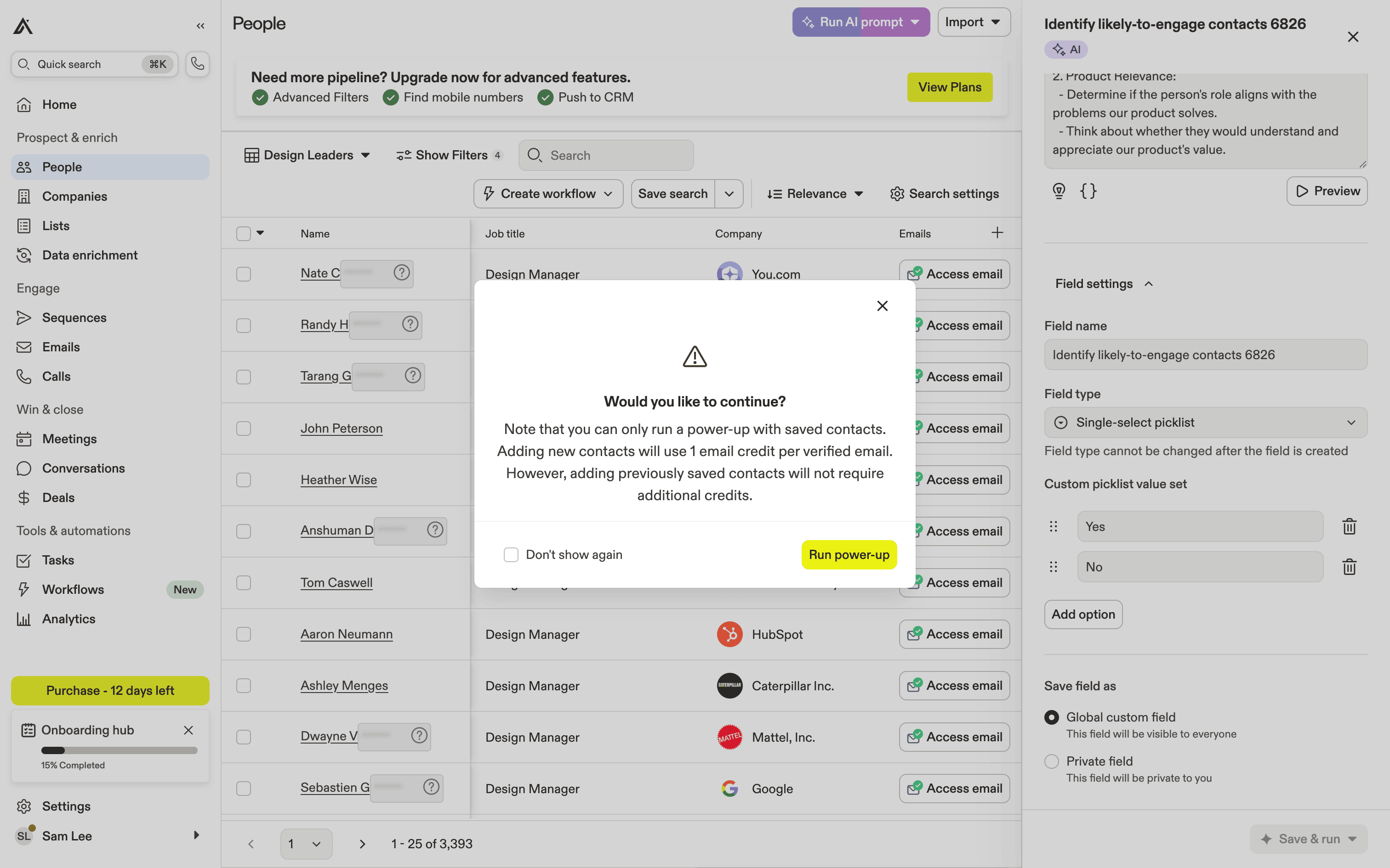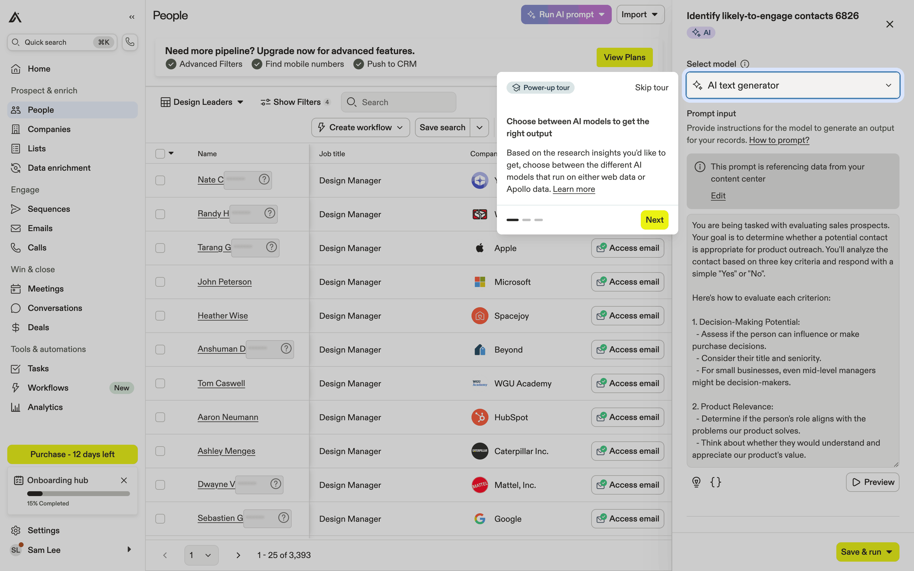 The user runs an AI prompt on a list of people to identify likely-to-engage contacts. The AI results are displayed in a new column.