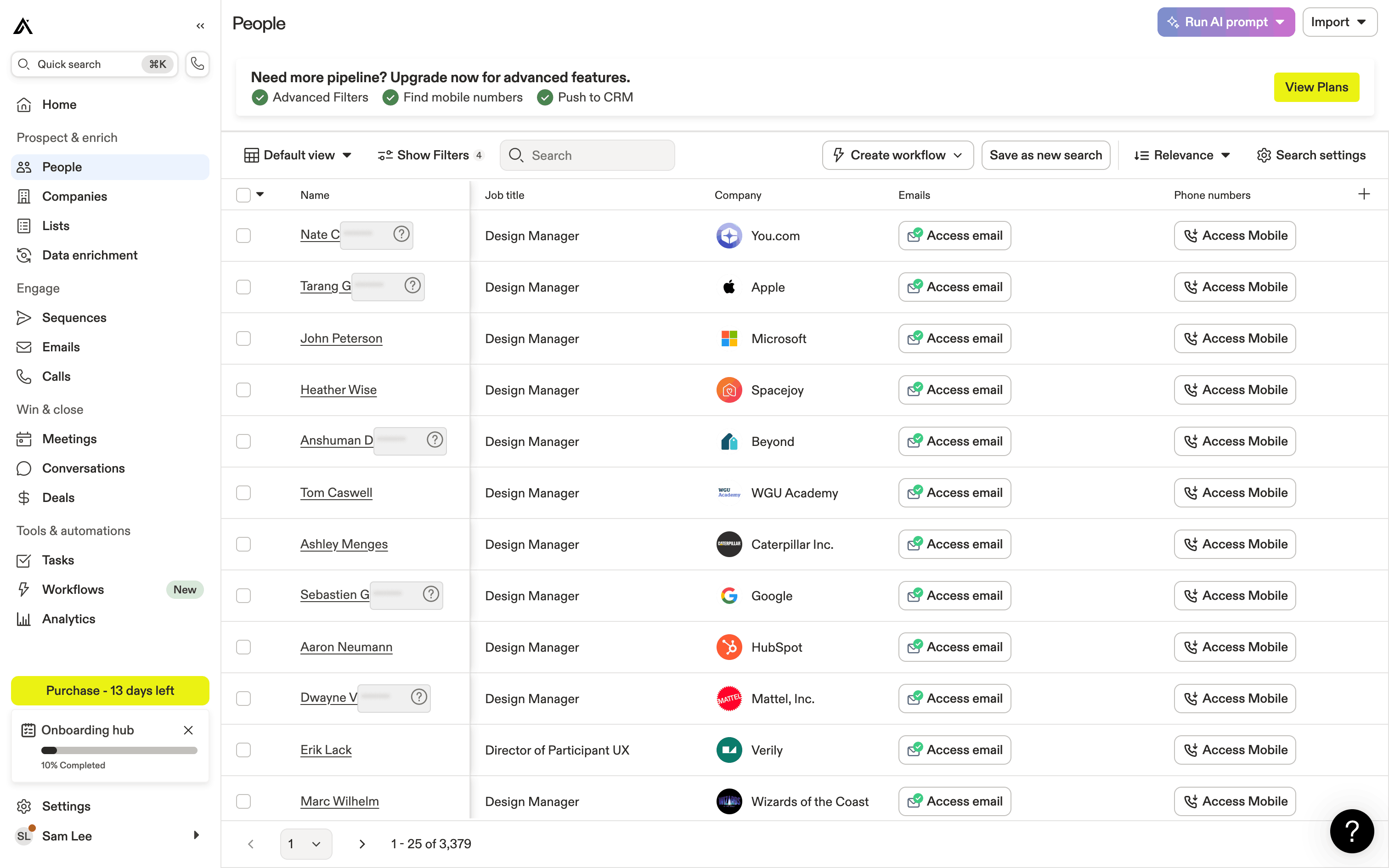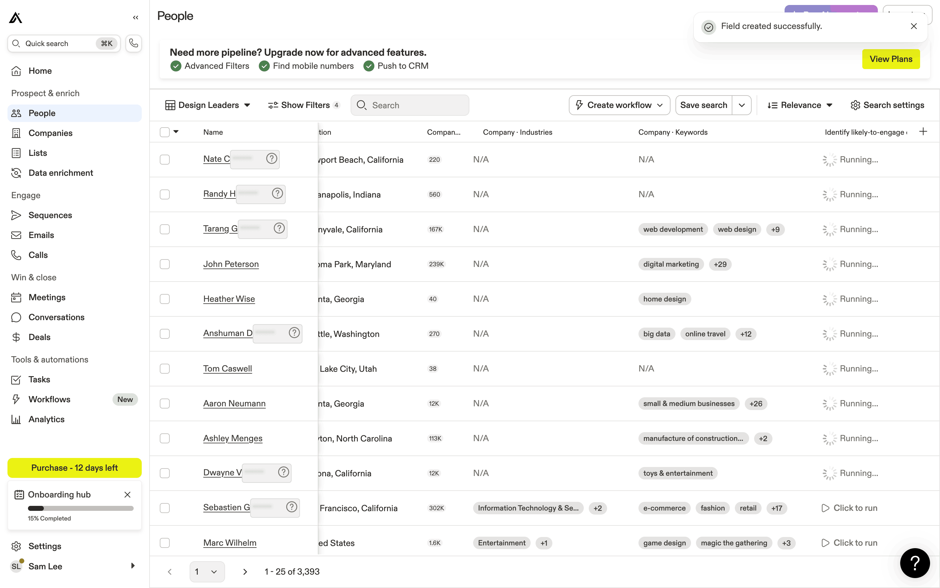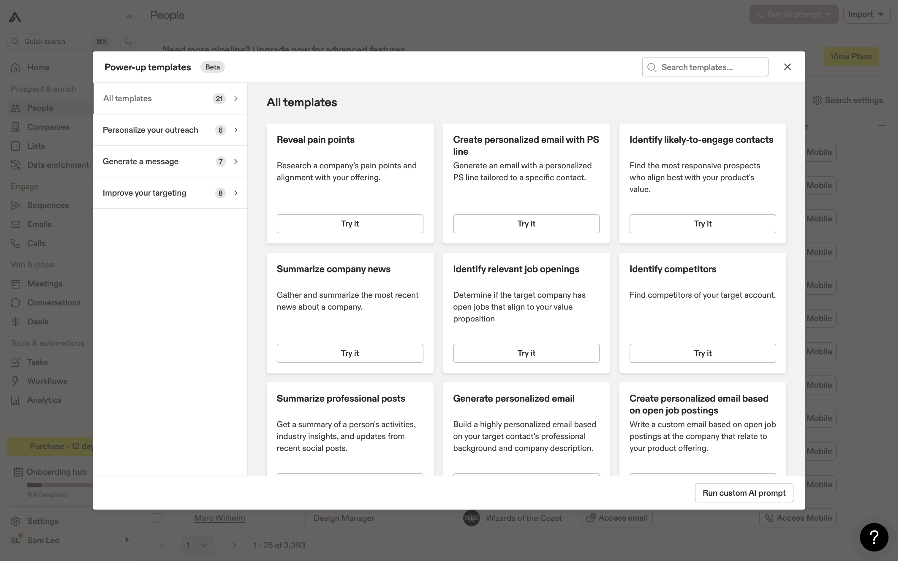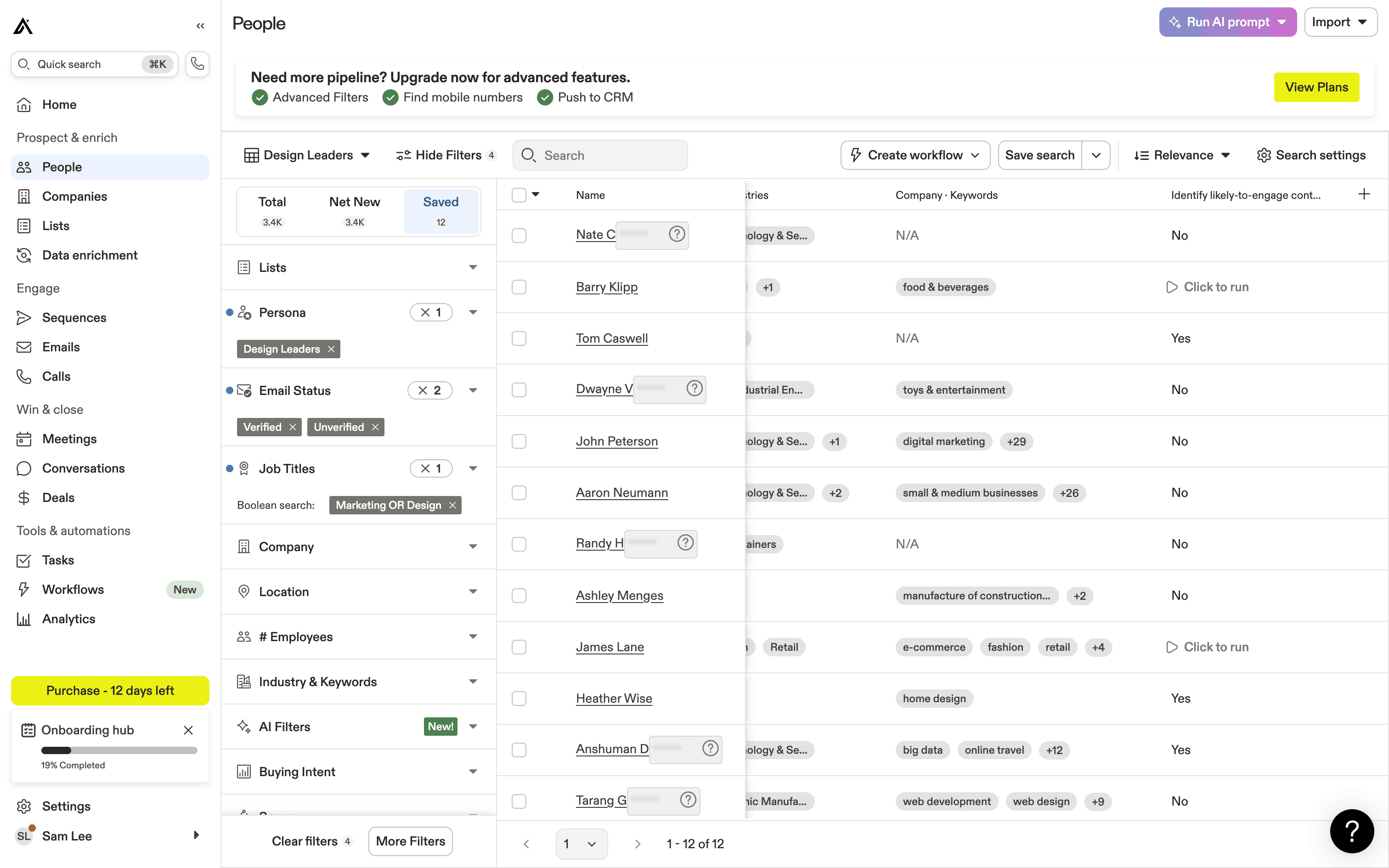 The user runs an AI prompt on a list of people to identify likely-to-engage contacts. The AI results are displayed in a new column.