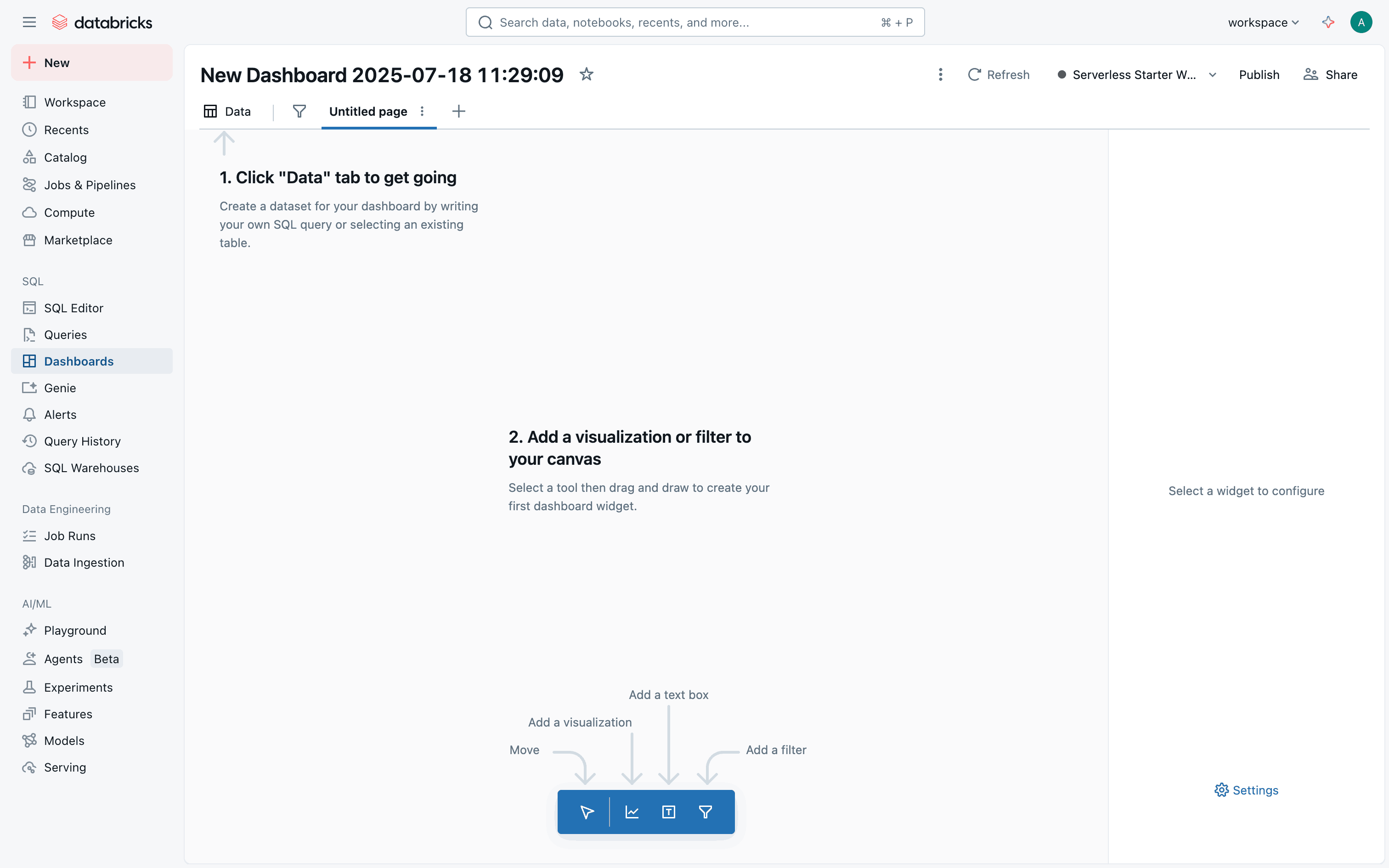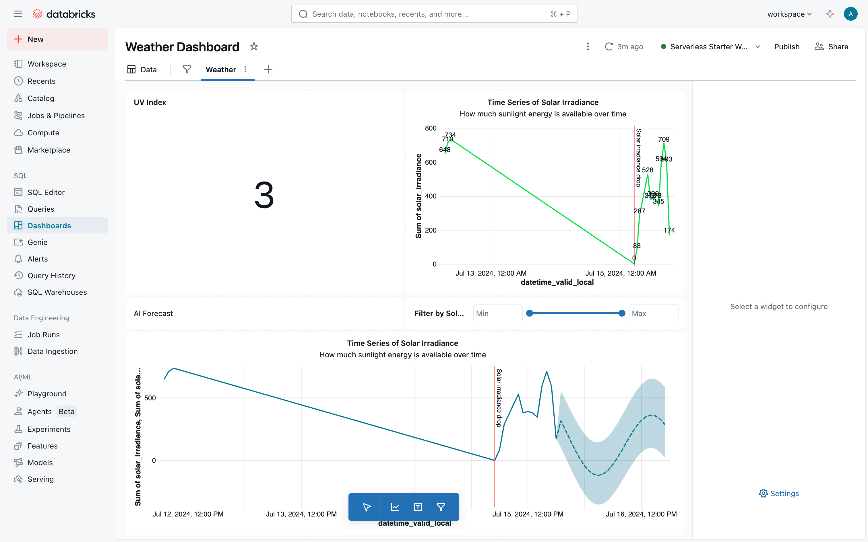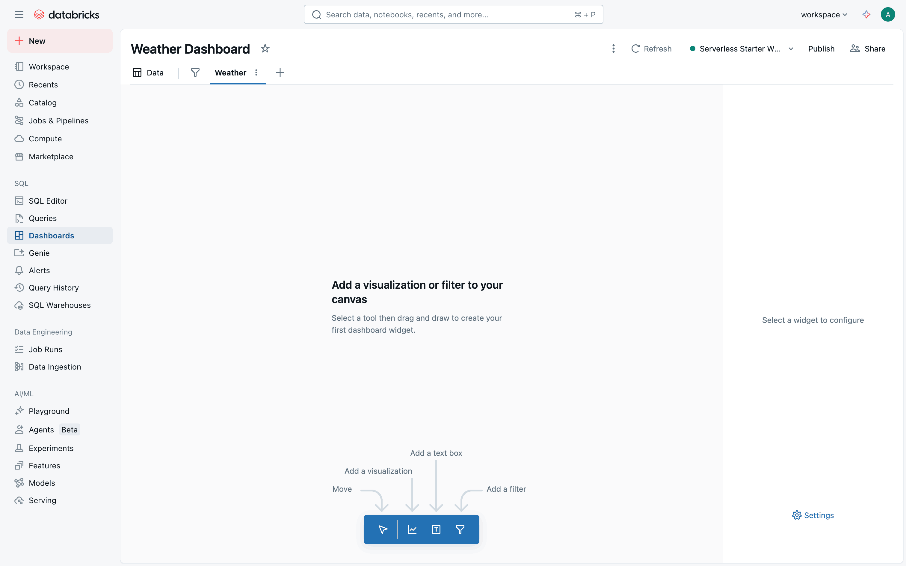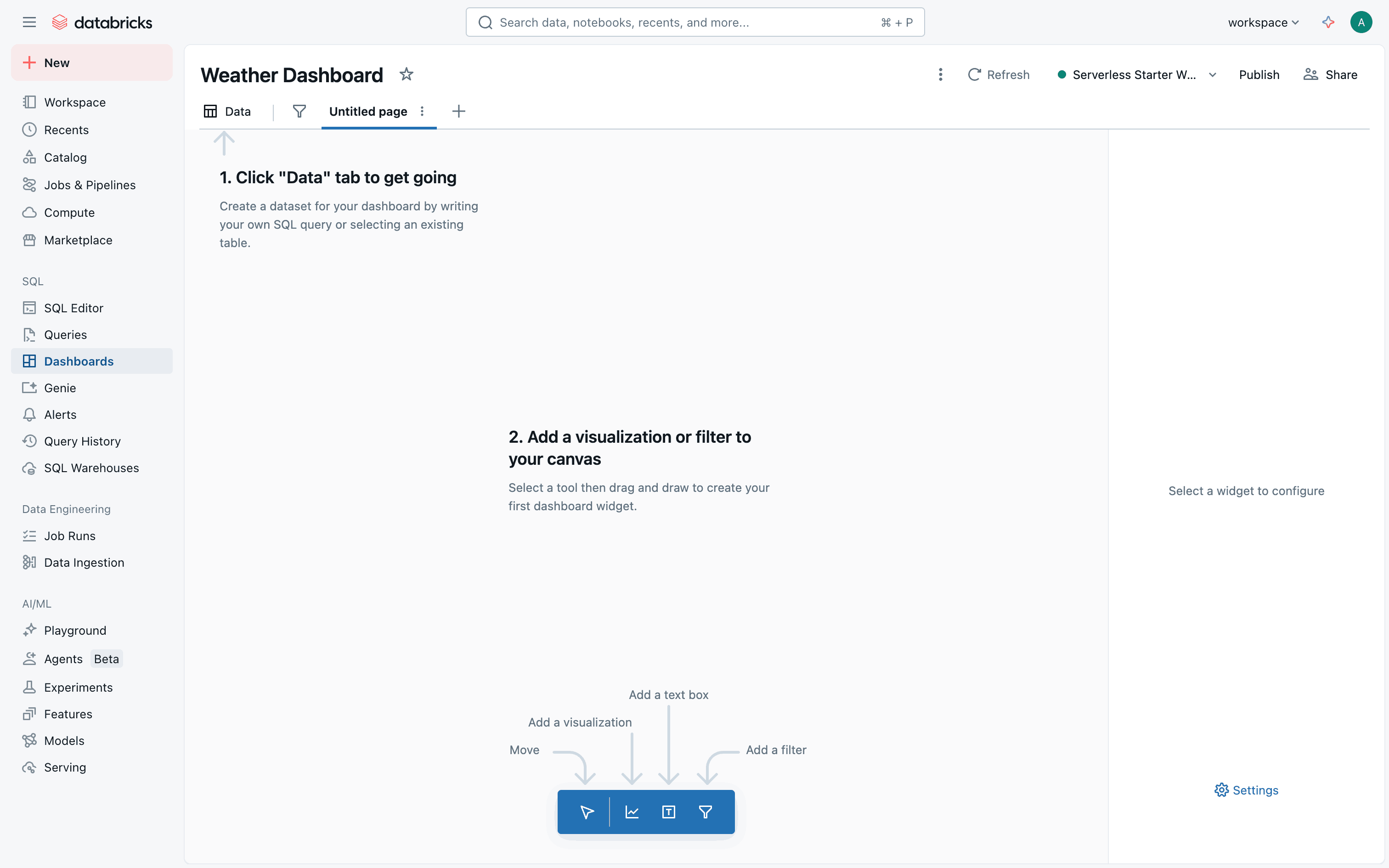 The user creates a weather dashboard, adds data, and populates it with visualizations. The final step involves interacting with a chart to view detailed information.