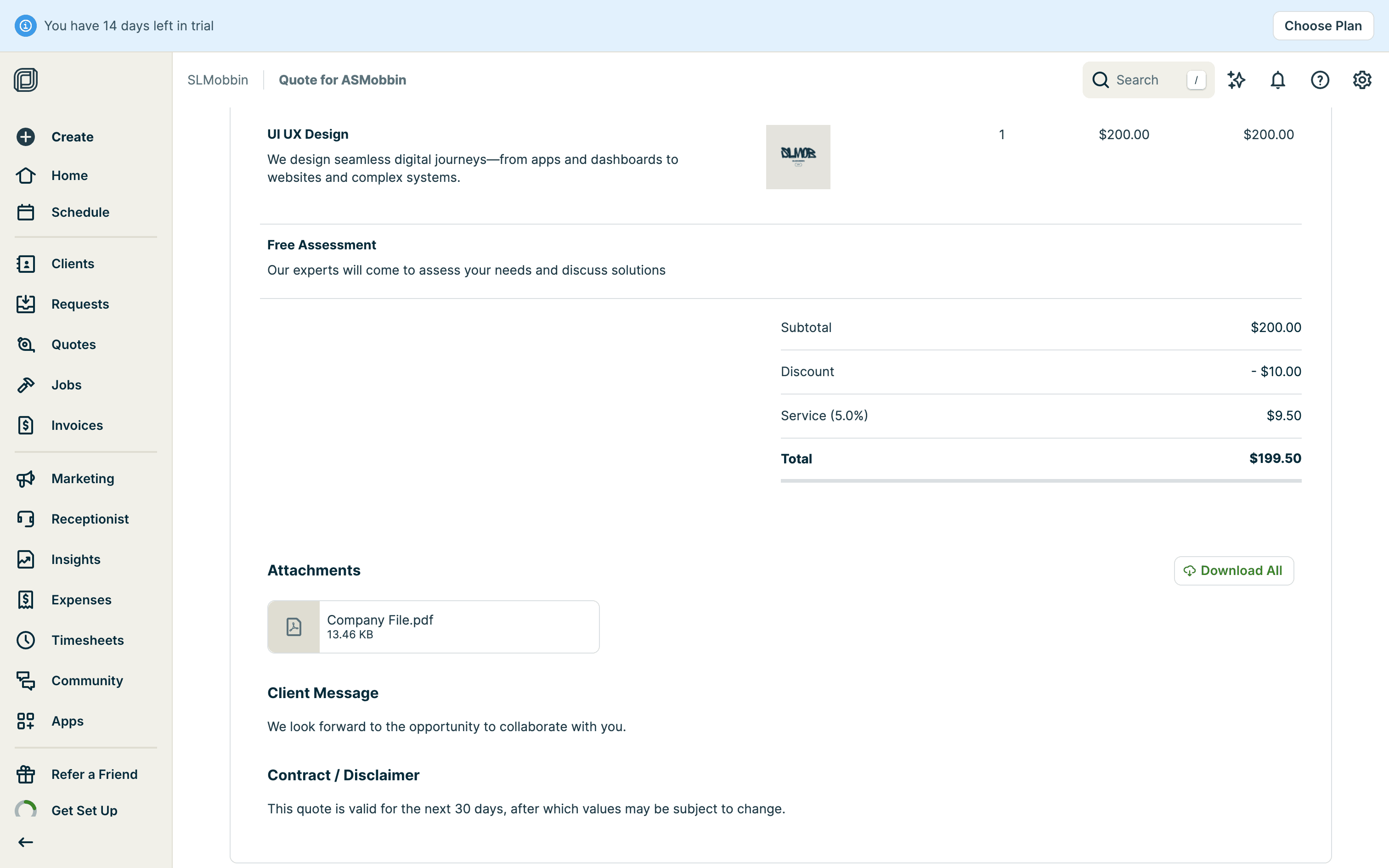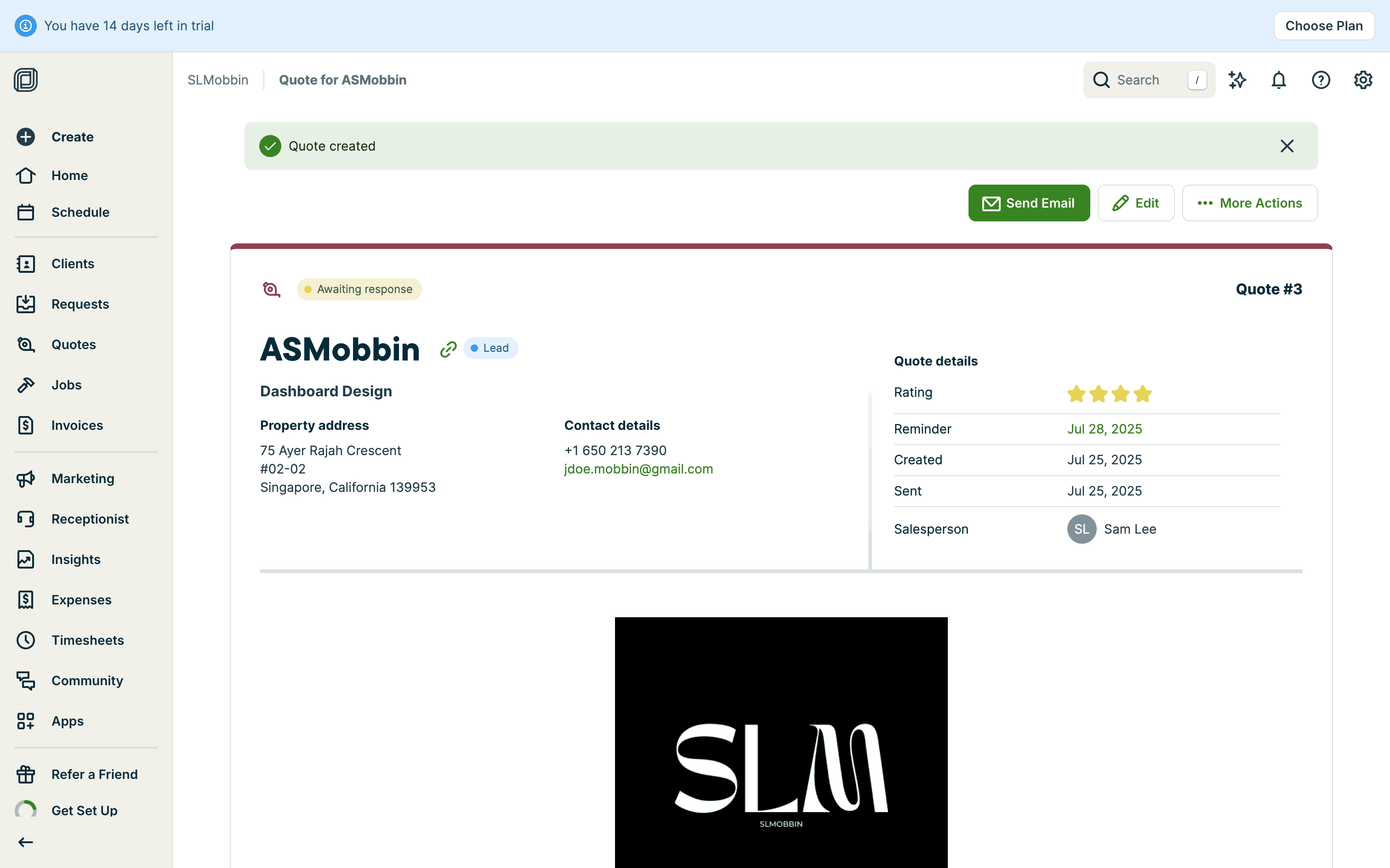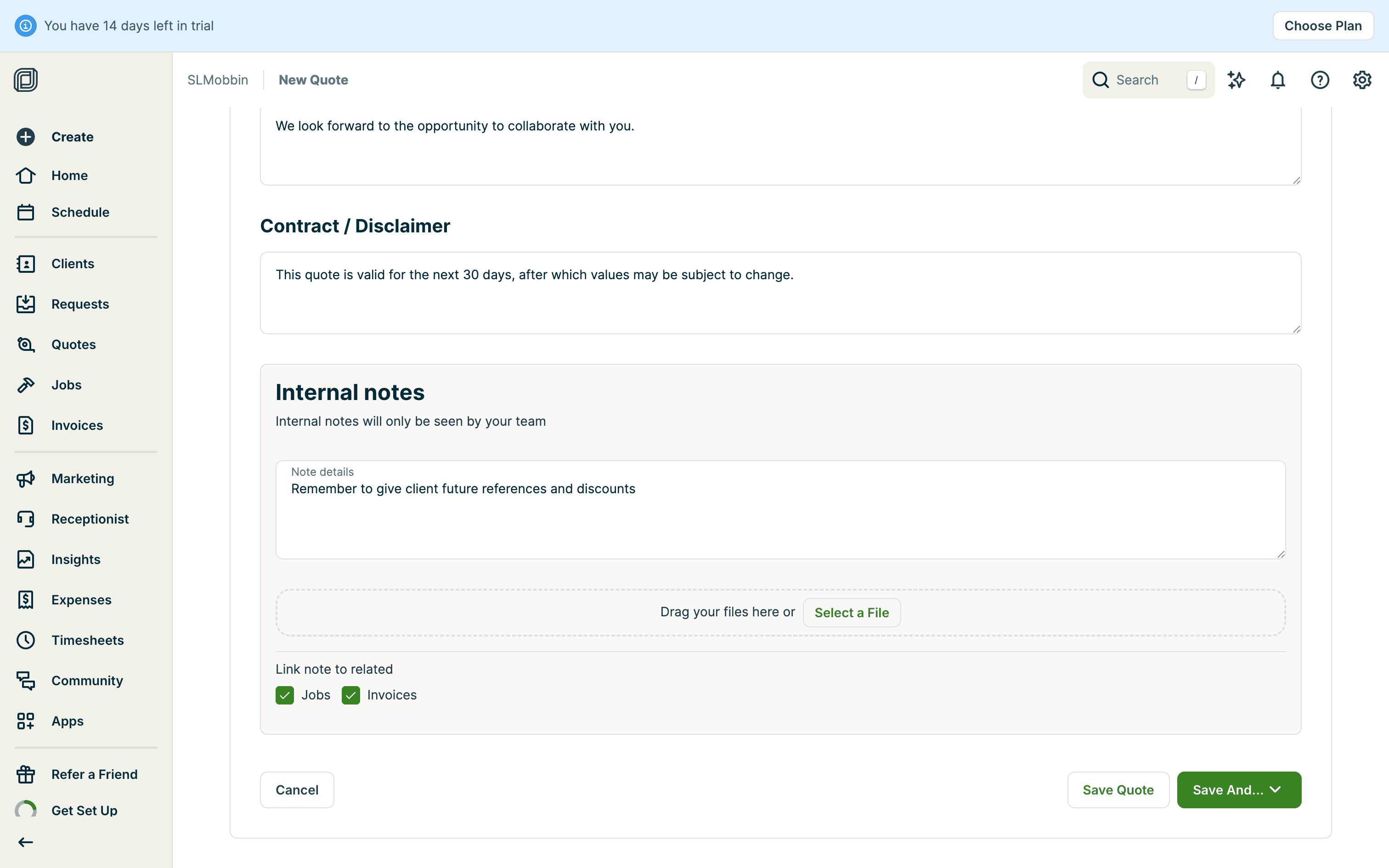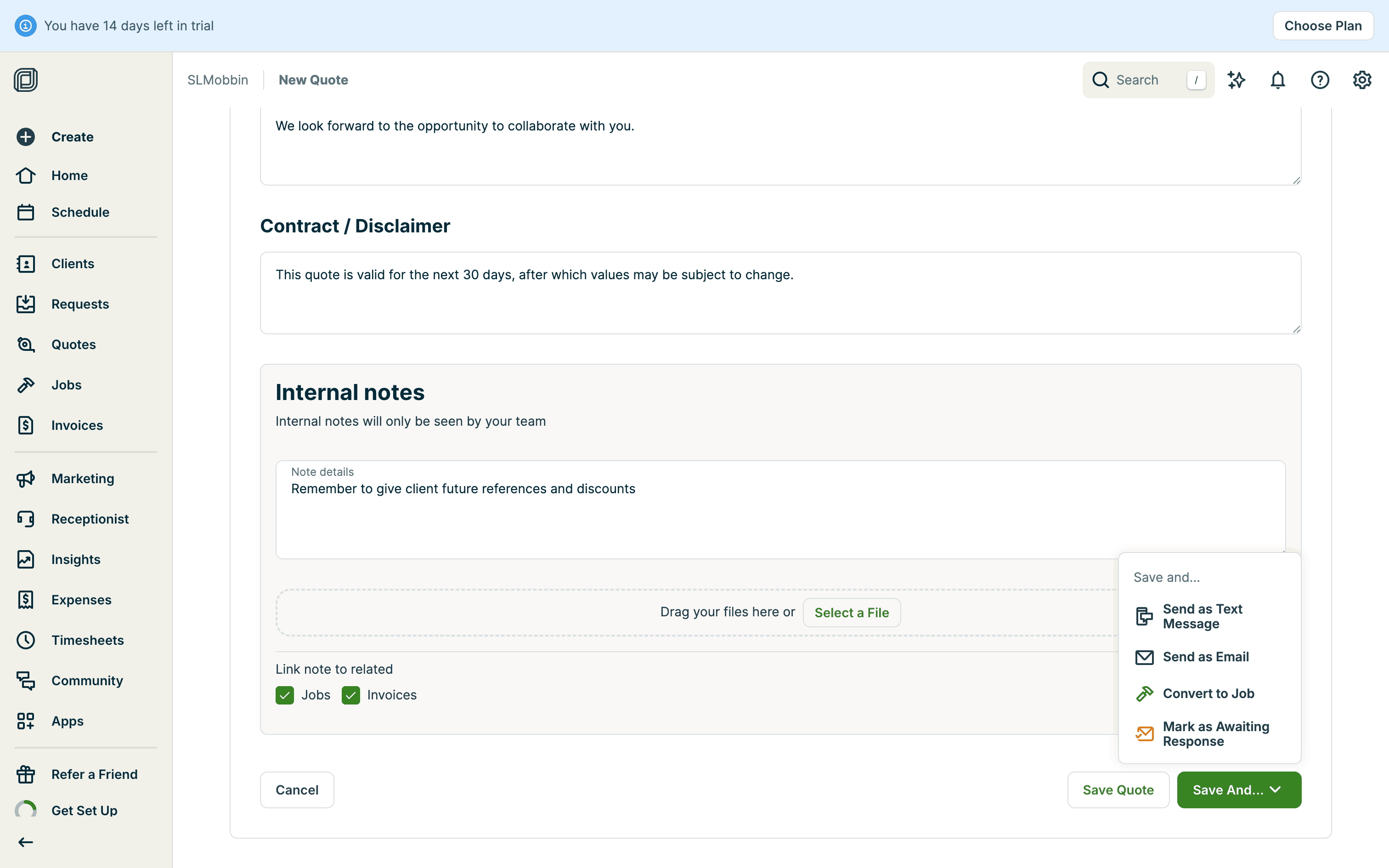 The user creates a quote by filling in client details, services, and attachments. The quote is then saved with options to send.