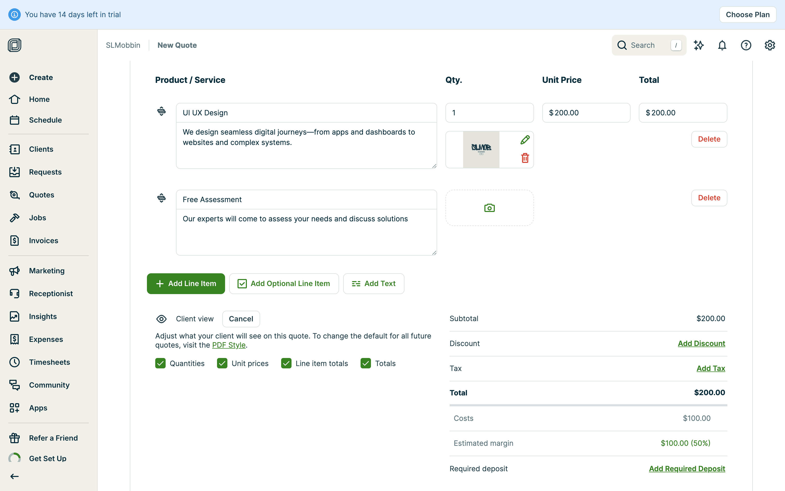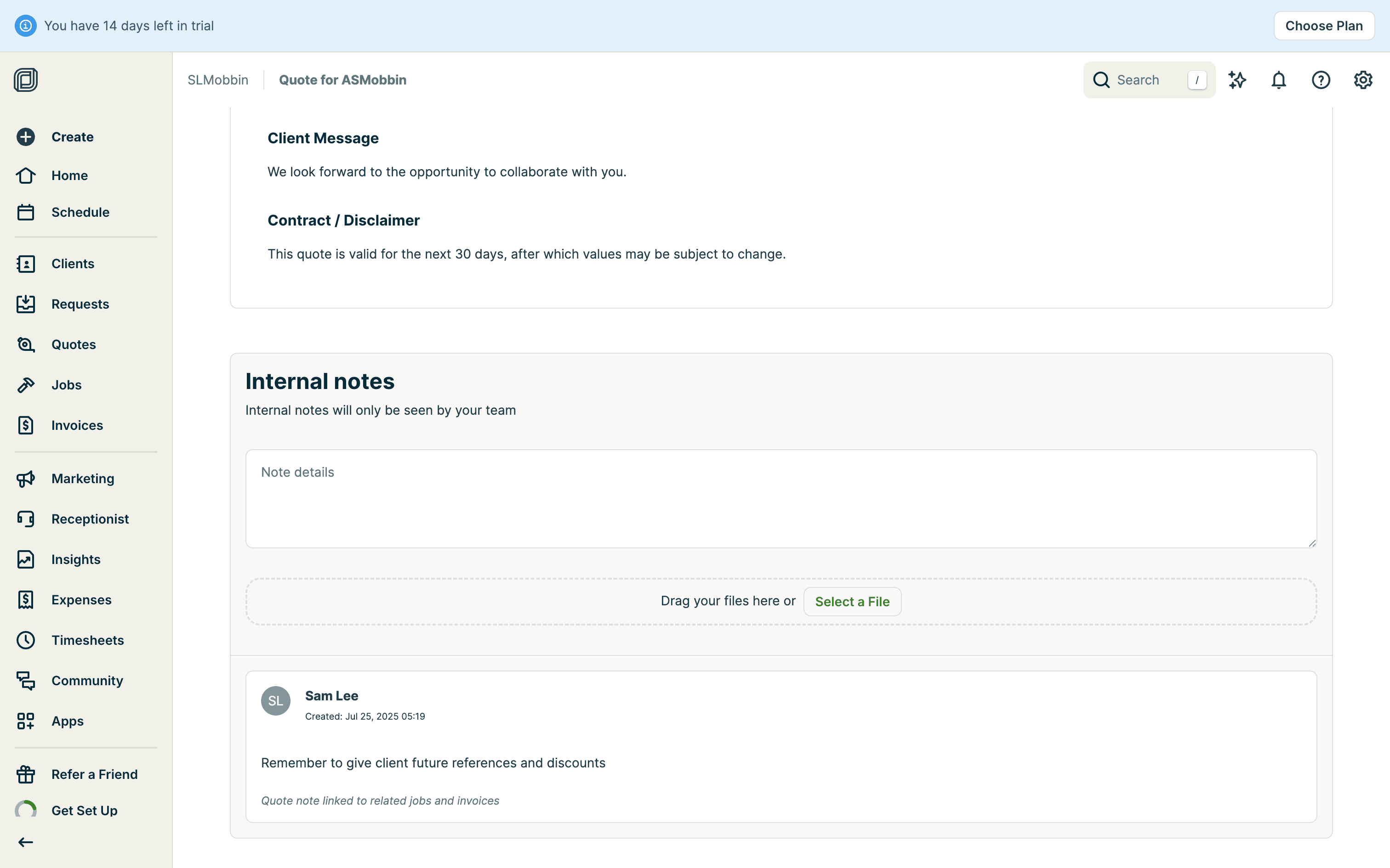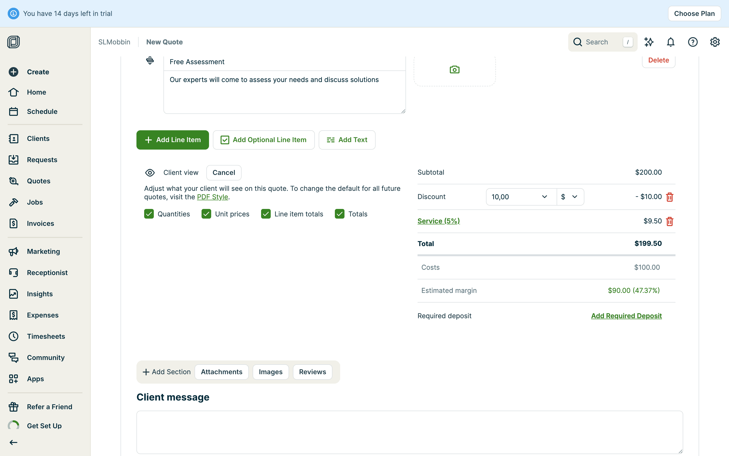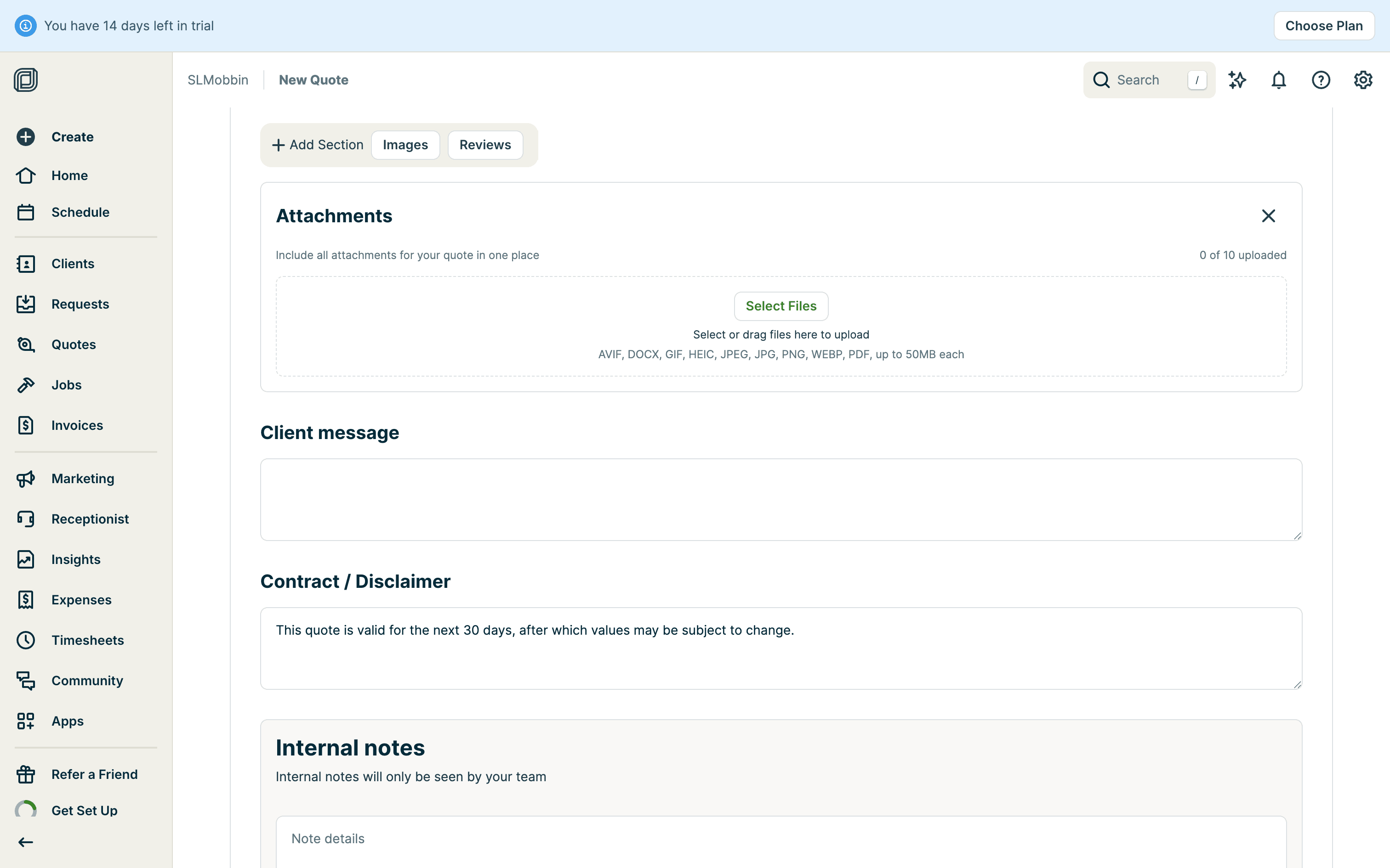 The user creates a quote by filling in client details, services, and attachments. The quote is then saved with options to send.