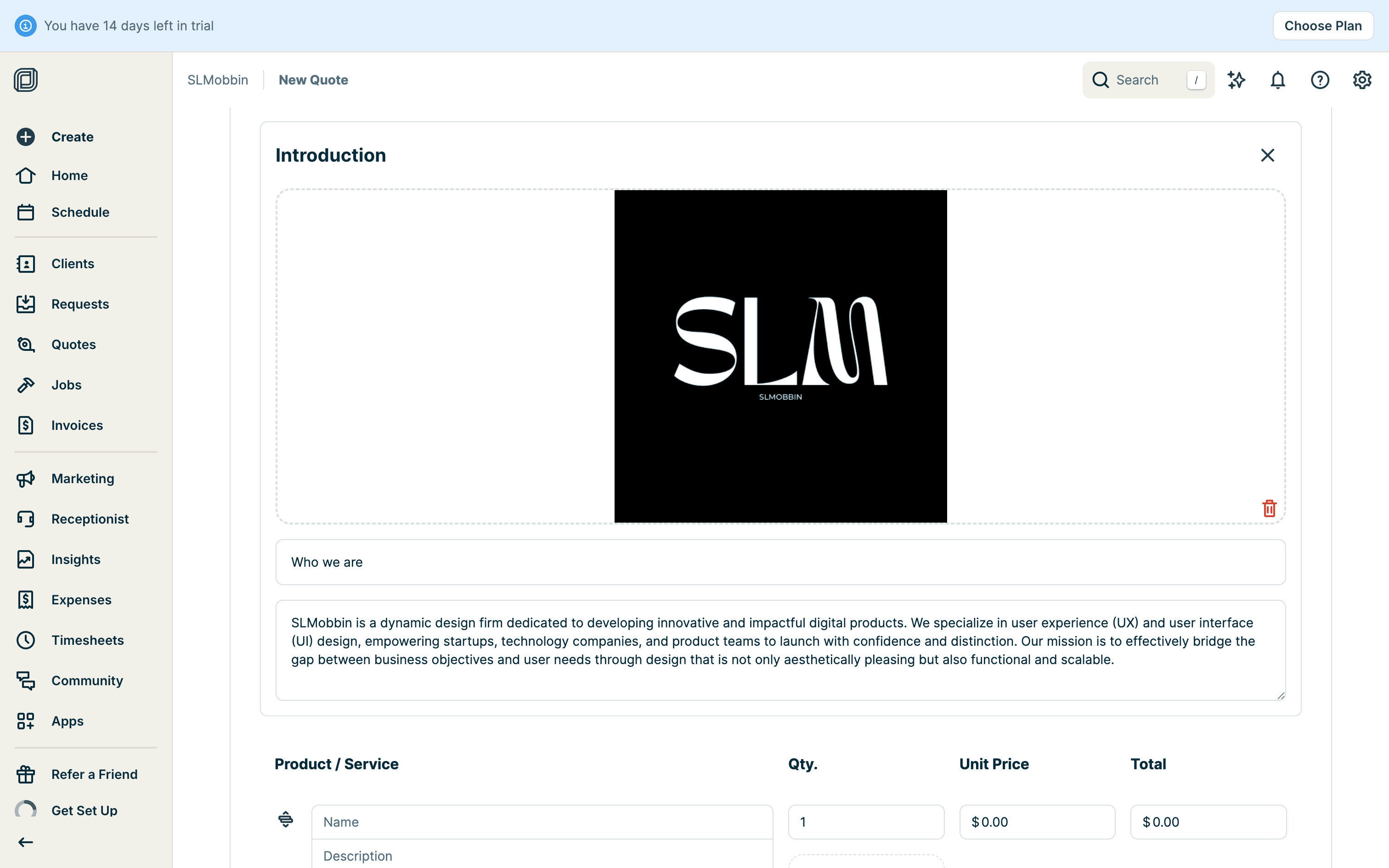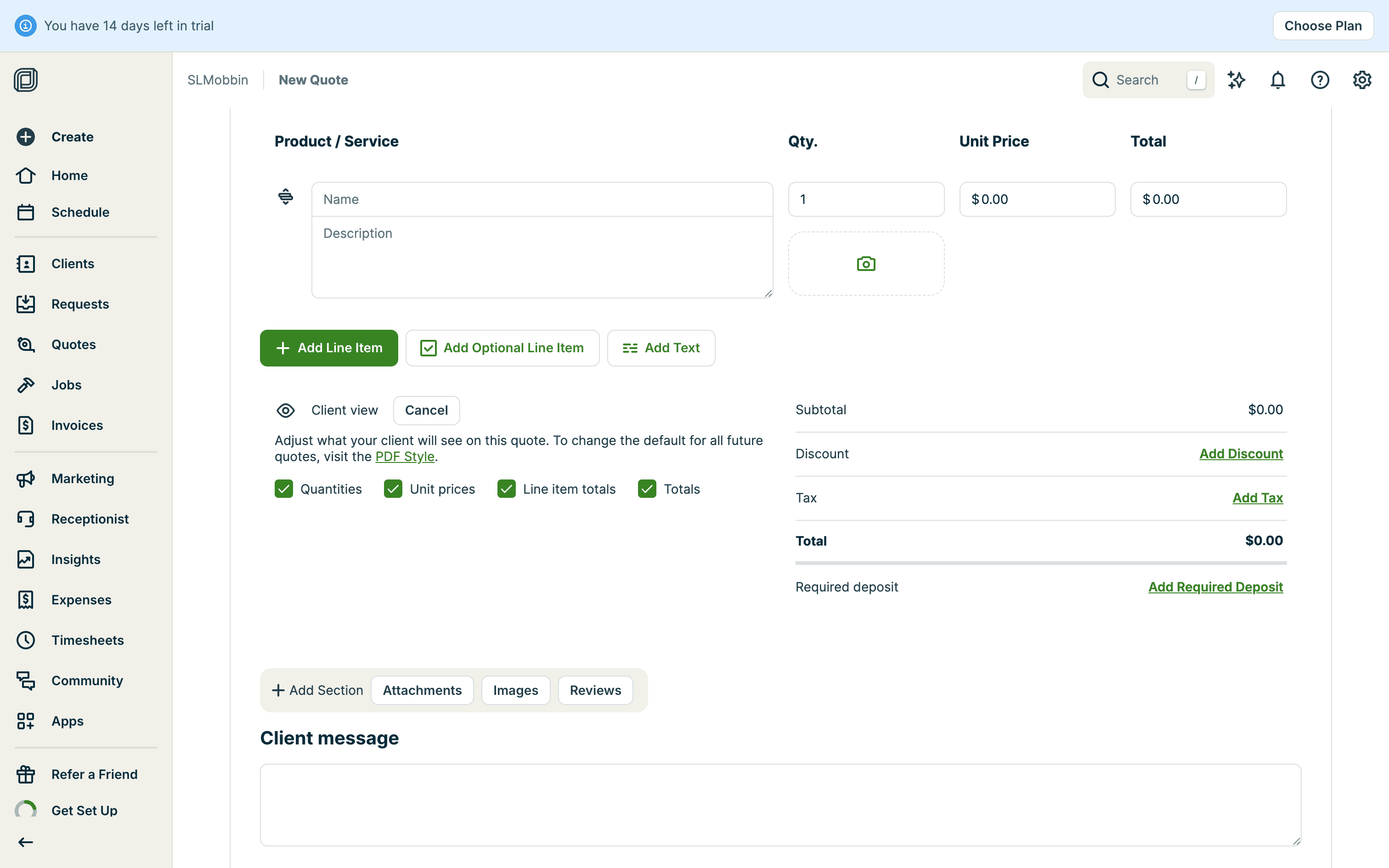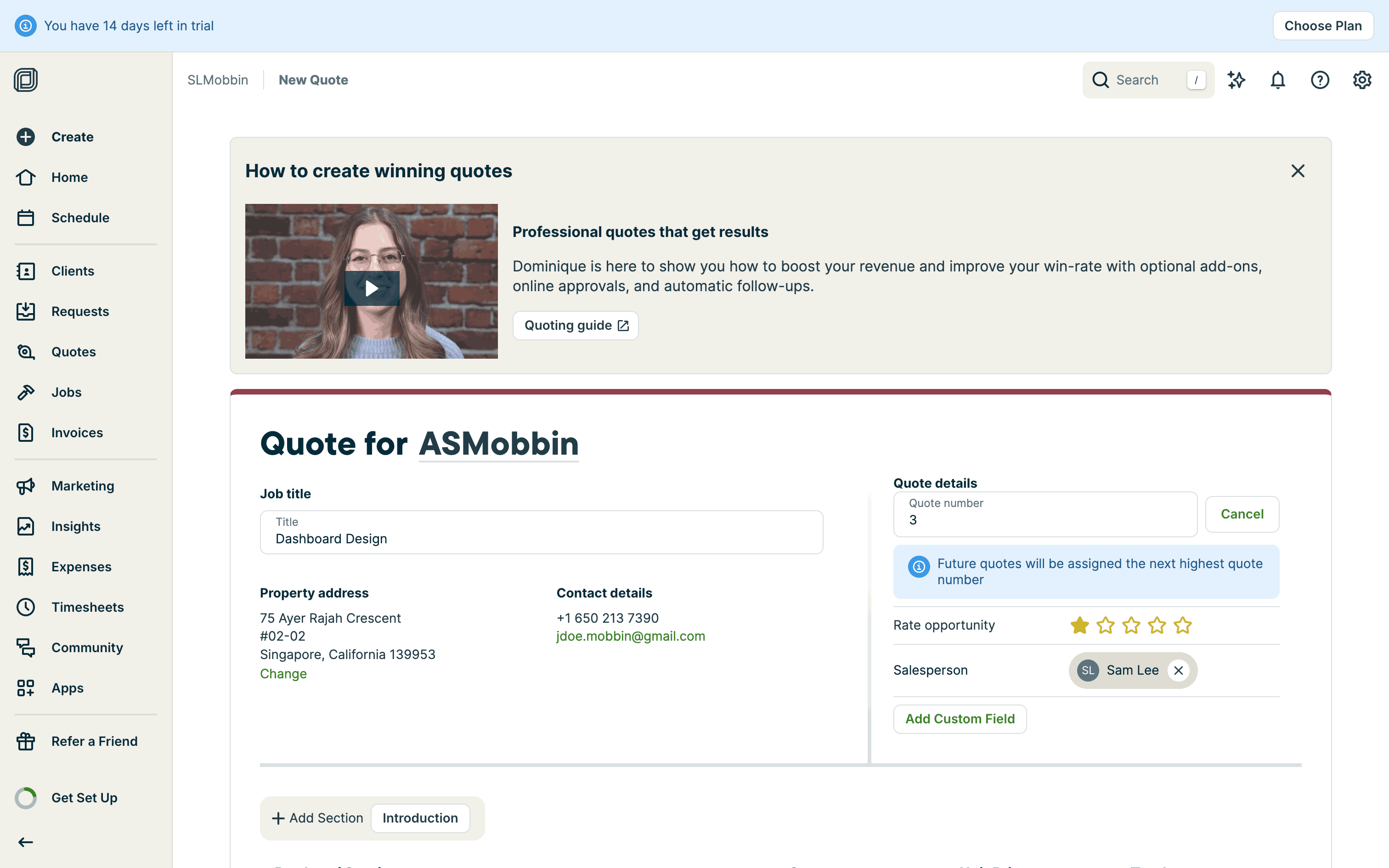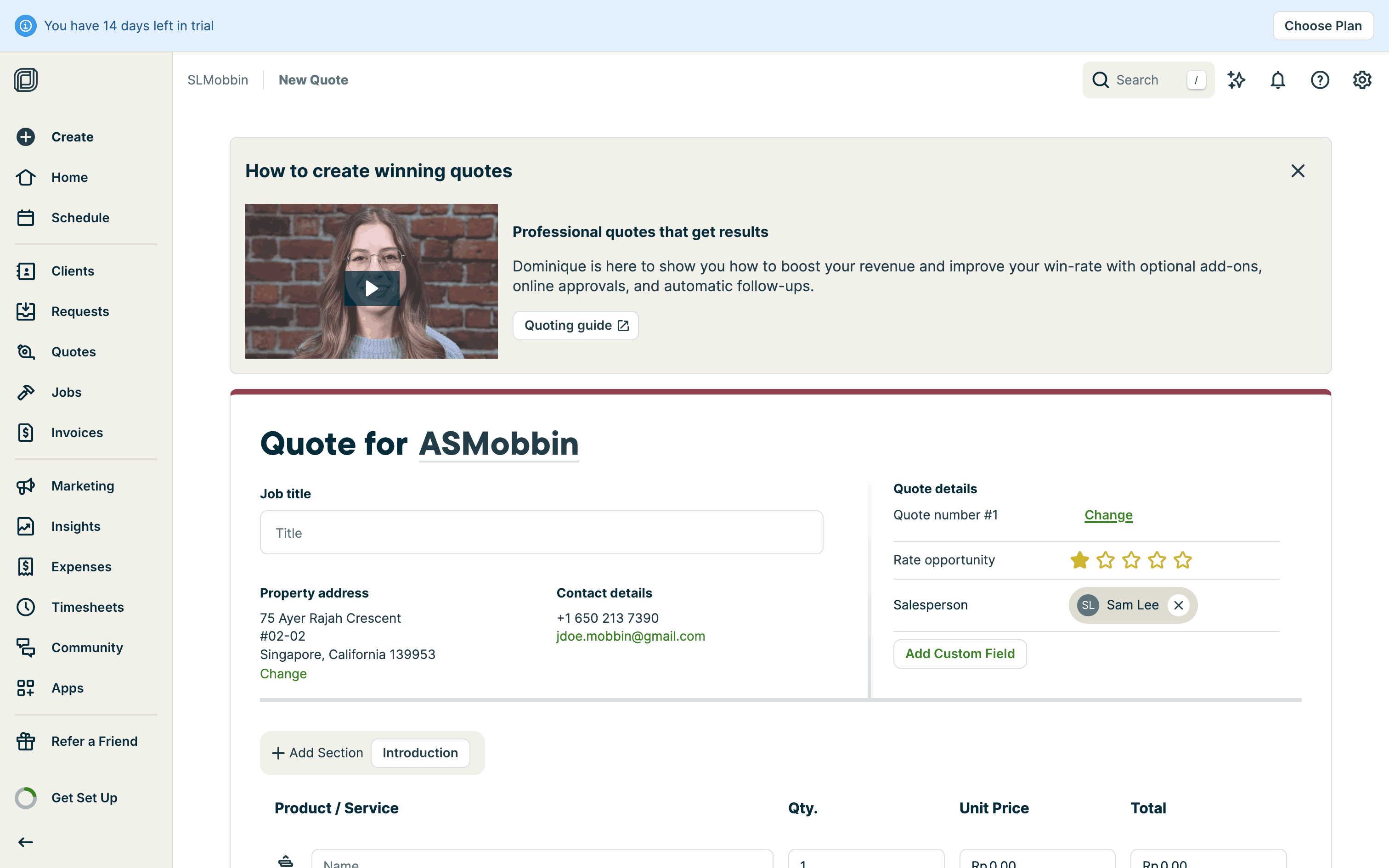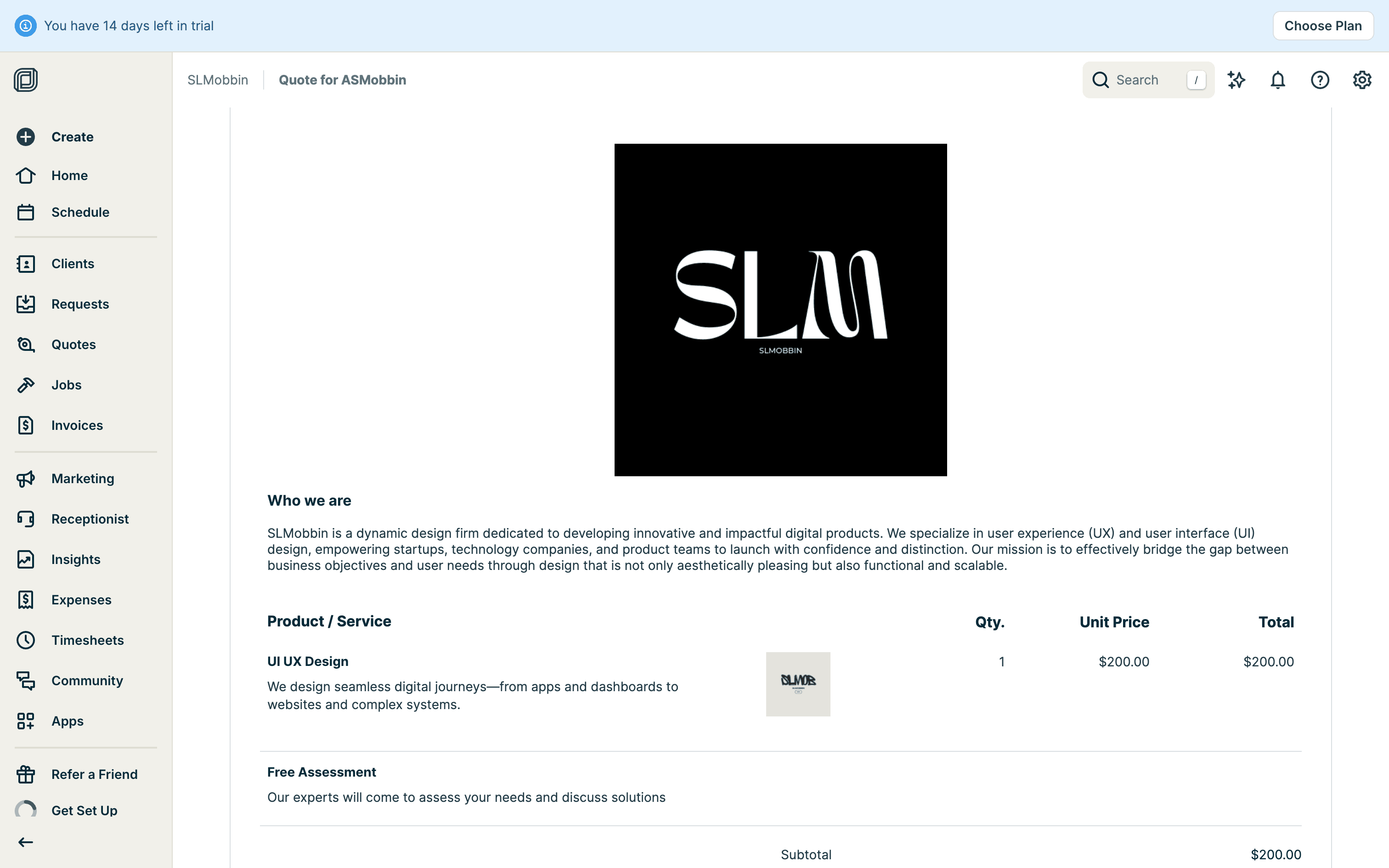 The user creates a quote by filling in client details, services, and attachments. The quote is then saved with options to send.