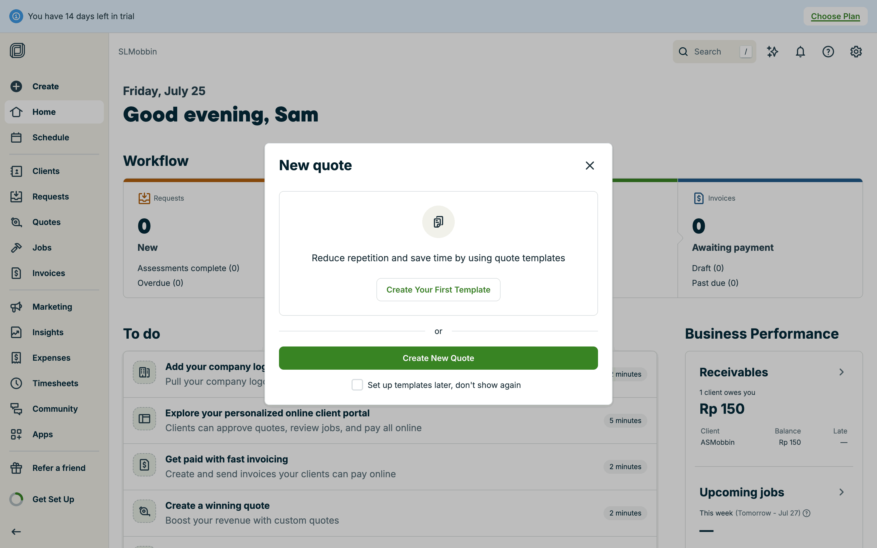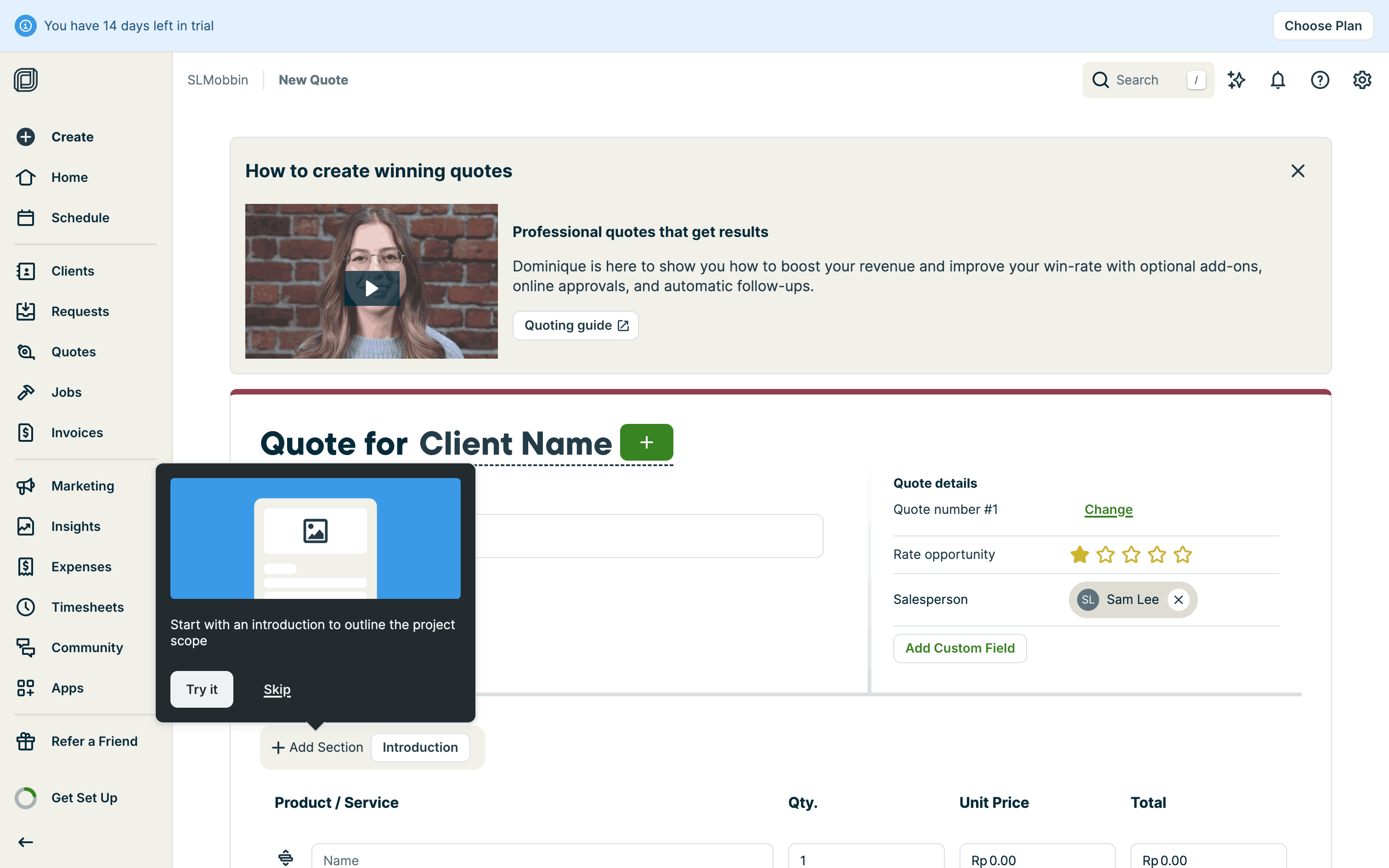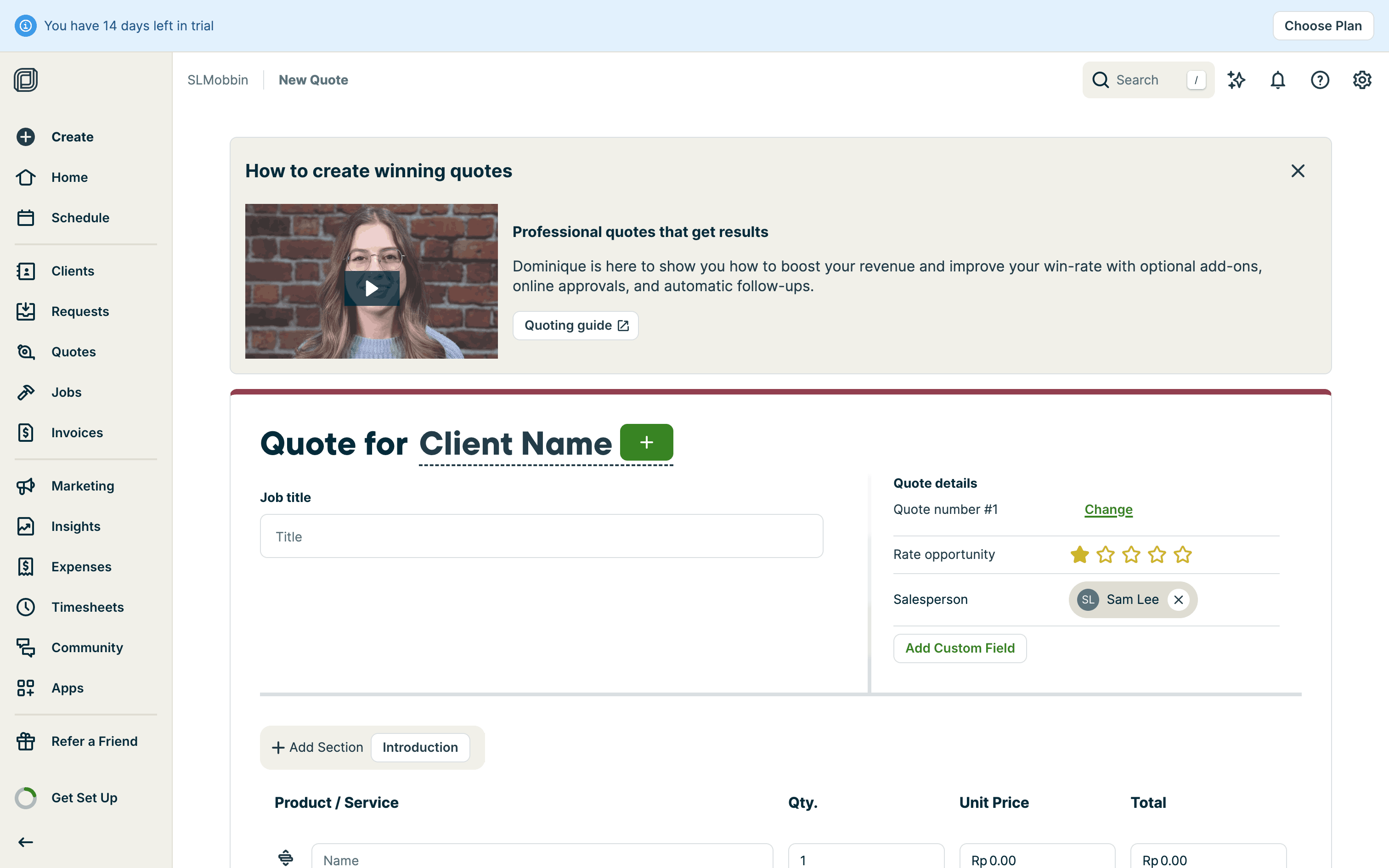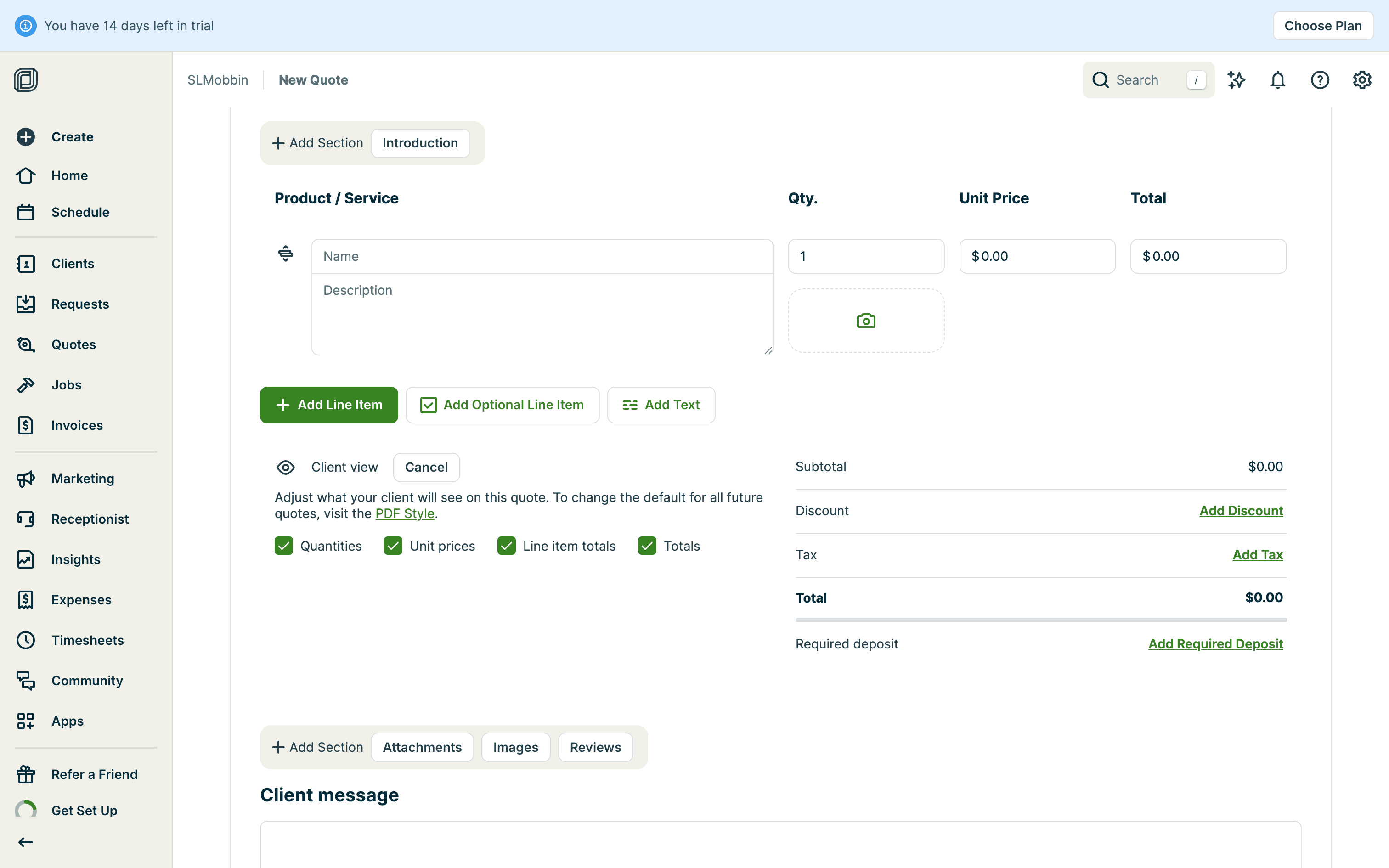 The user creates a quote by filling in client details, services, and attachments. The quote is then saved with options to send.