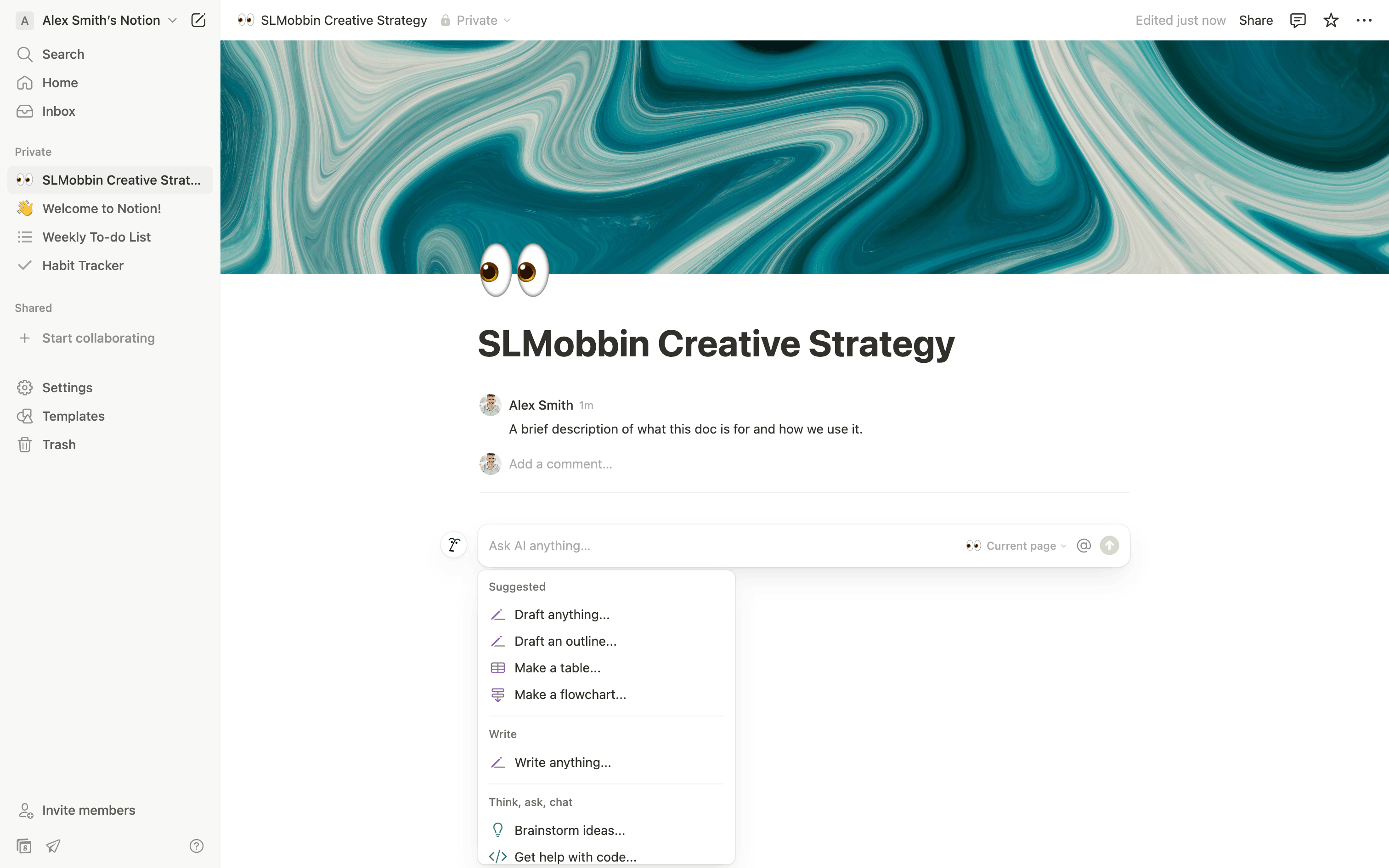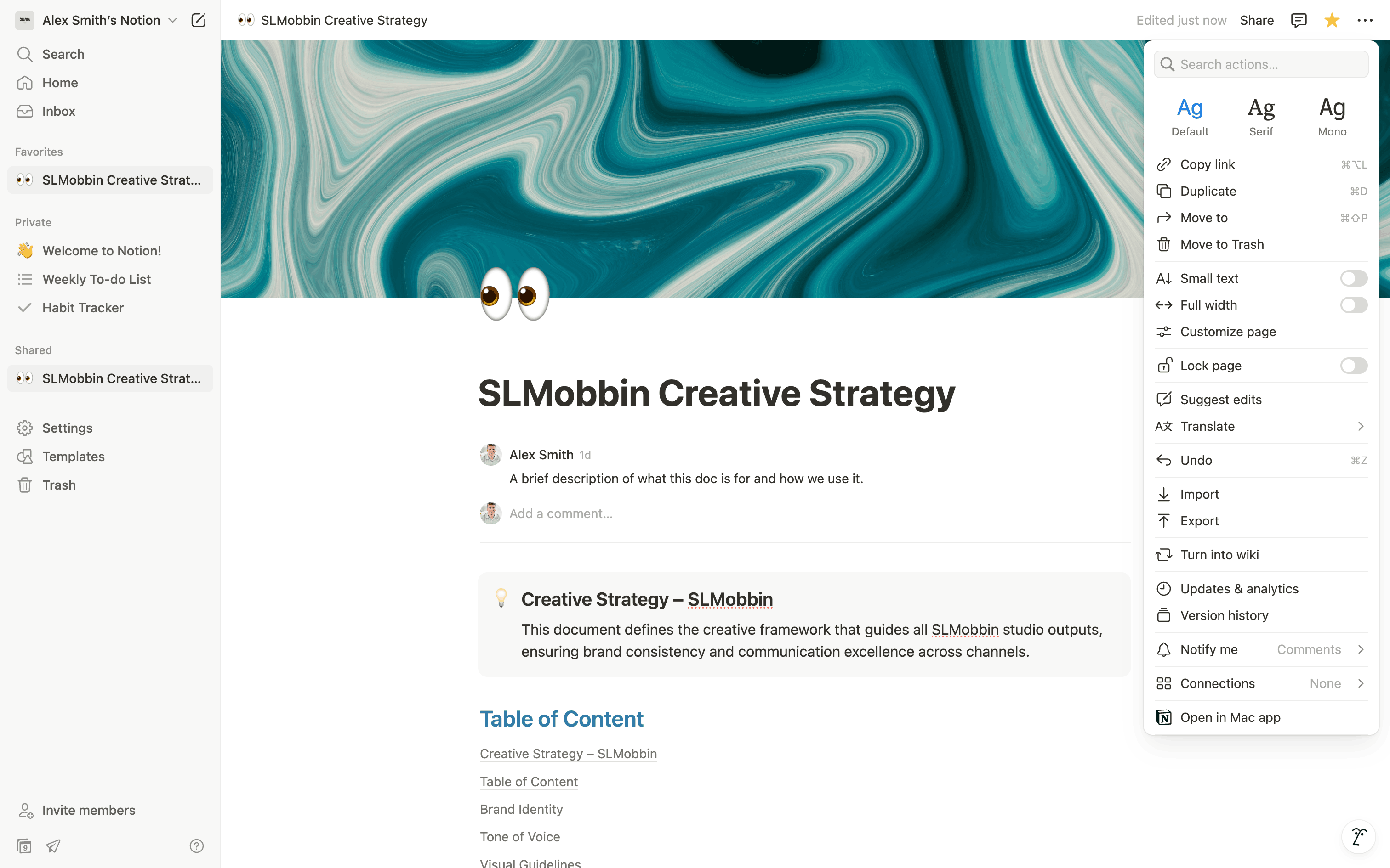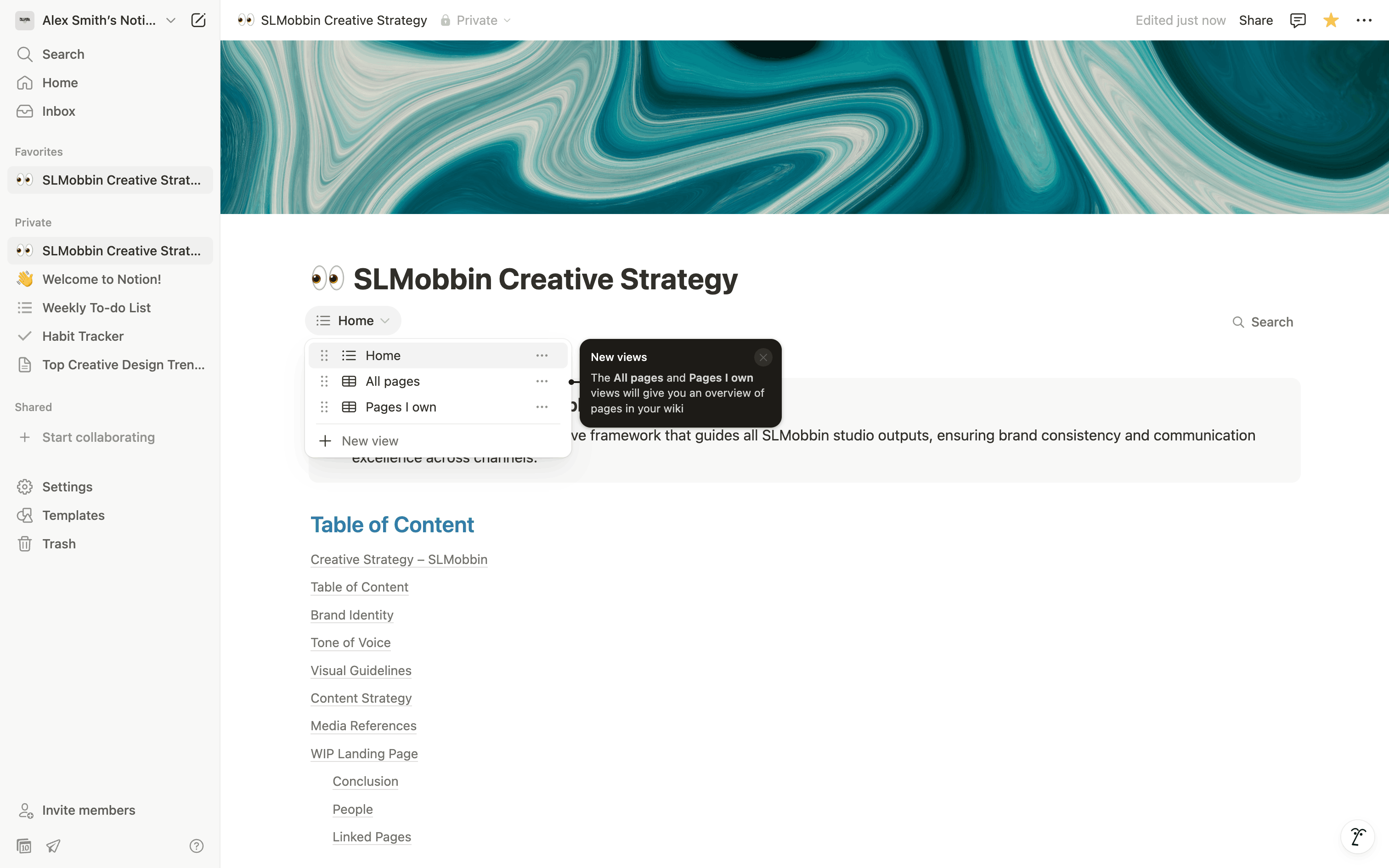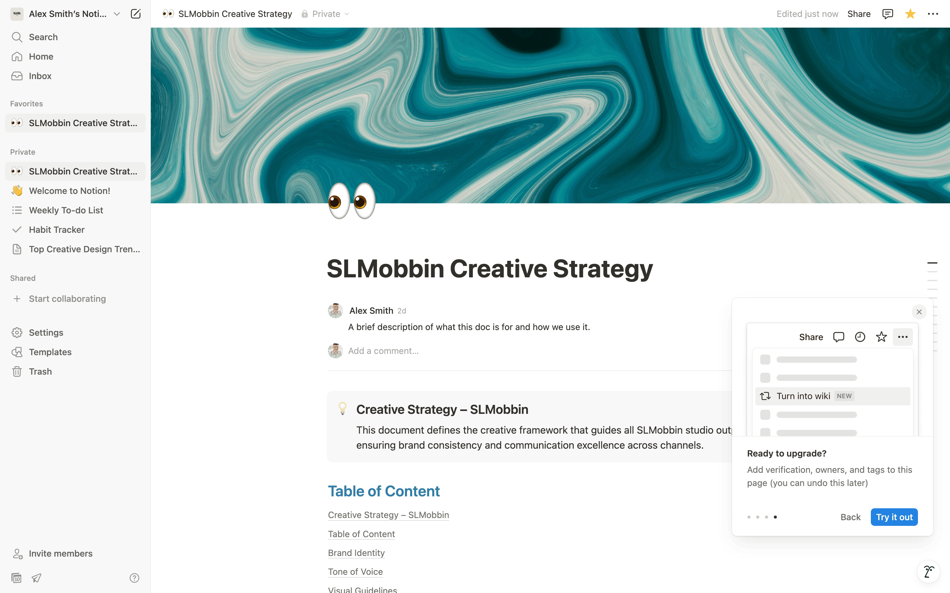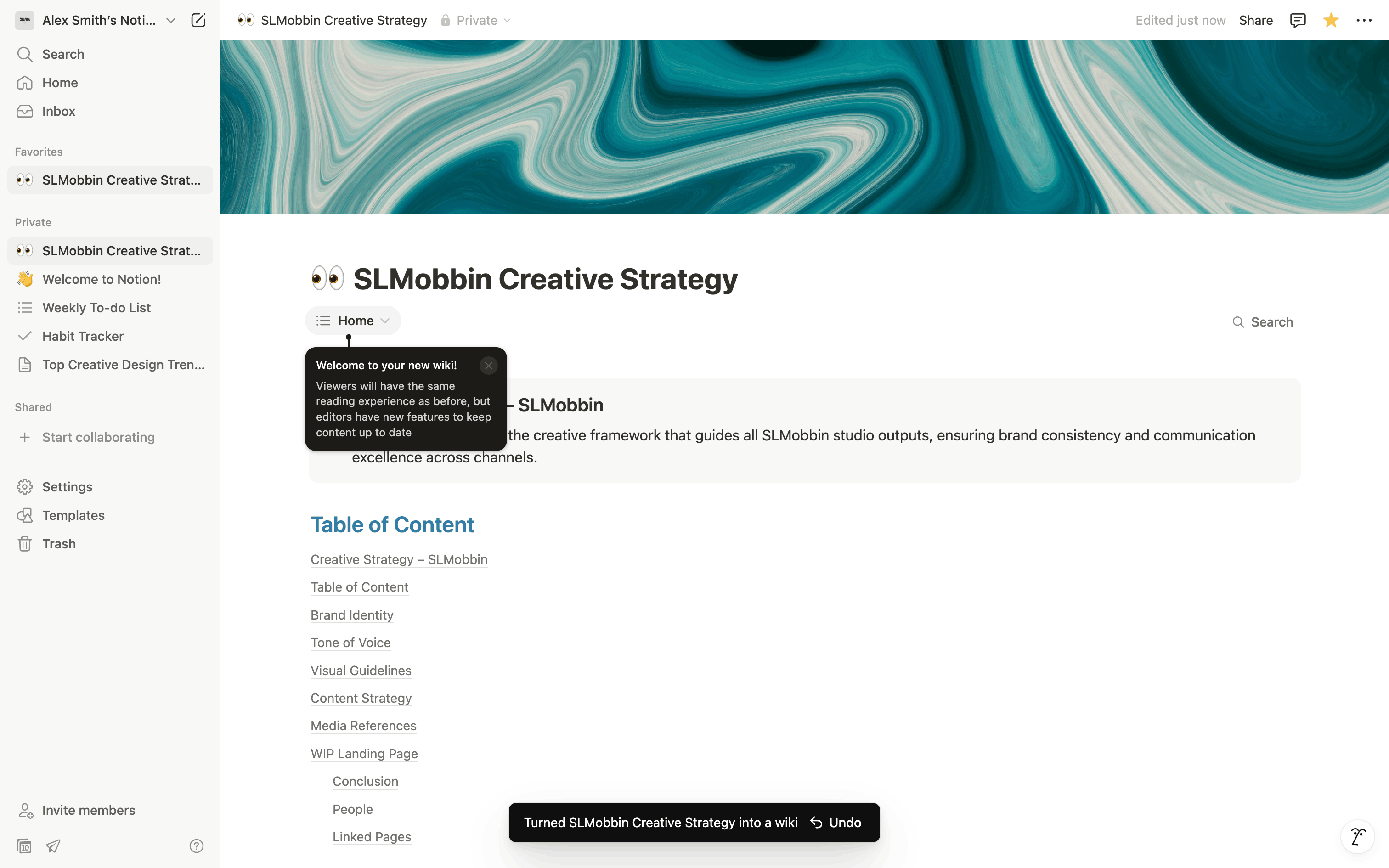 The user turns a regular document into a wiki page and explores the new wiki interface. They navigate through different views to manage the wiki content.