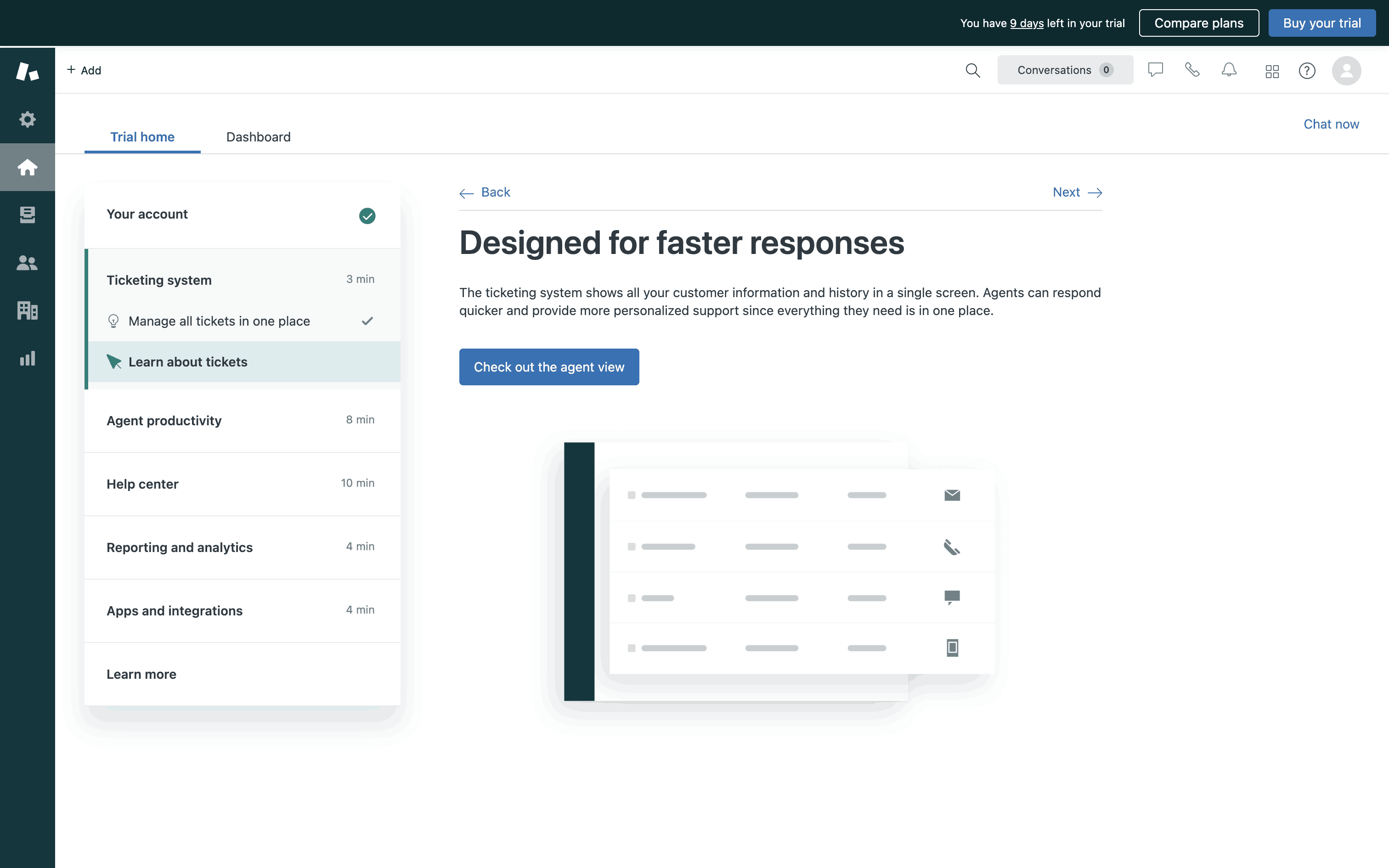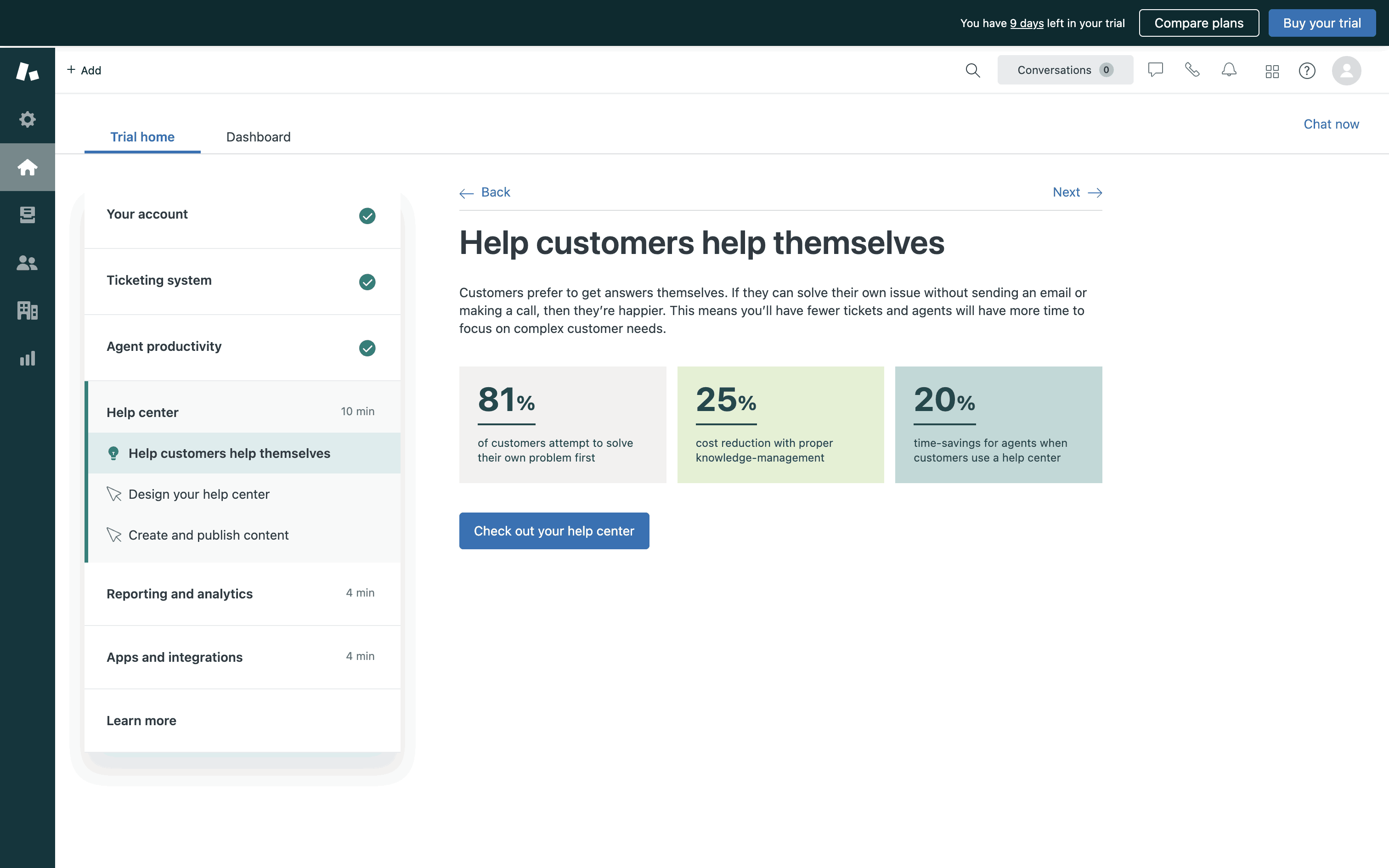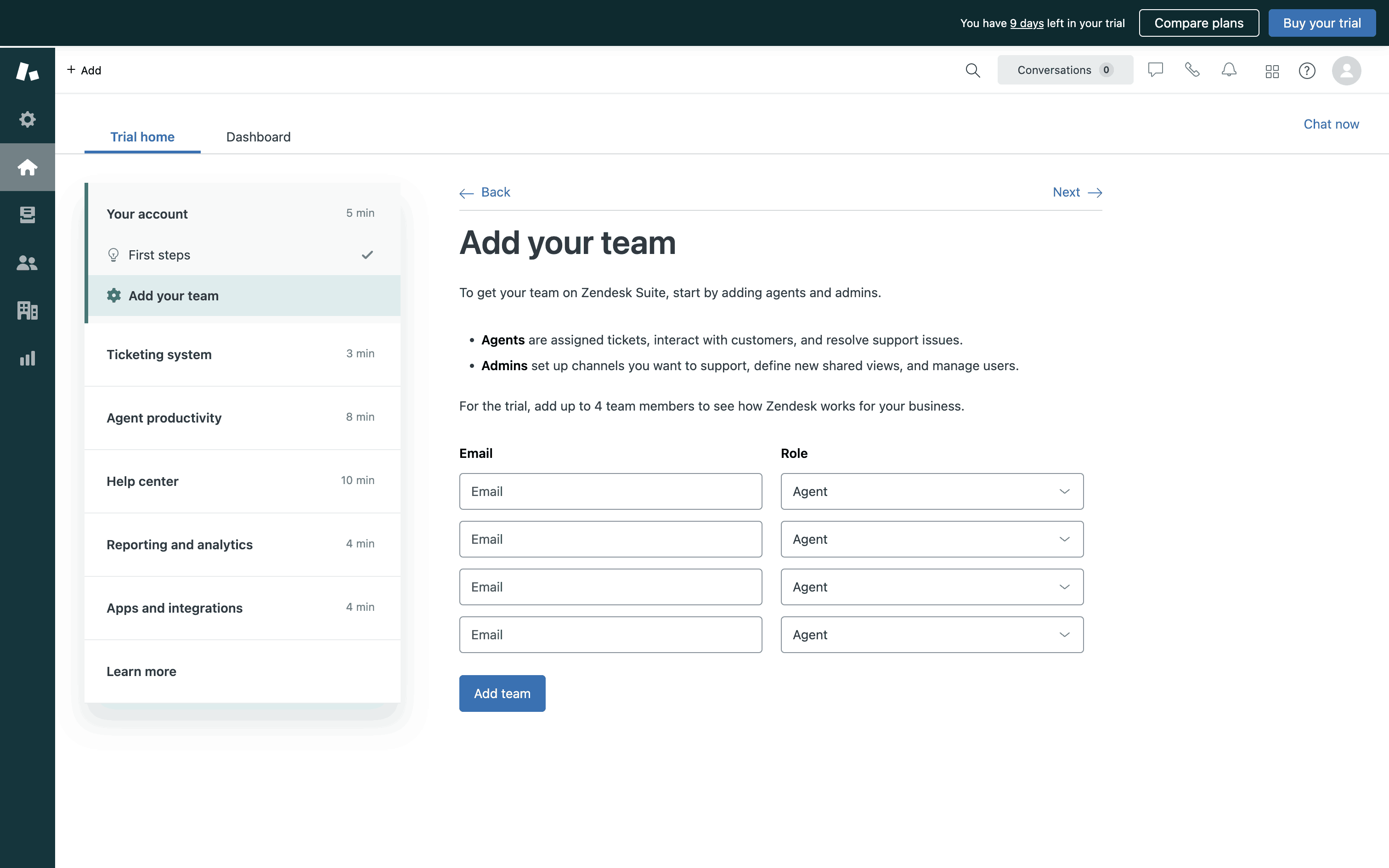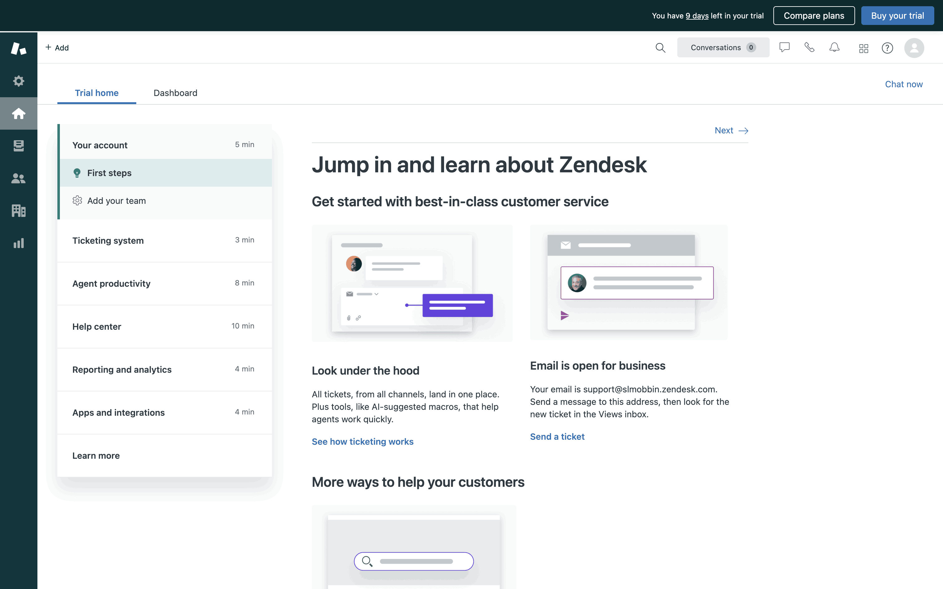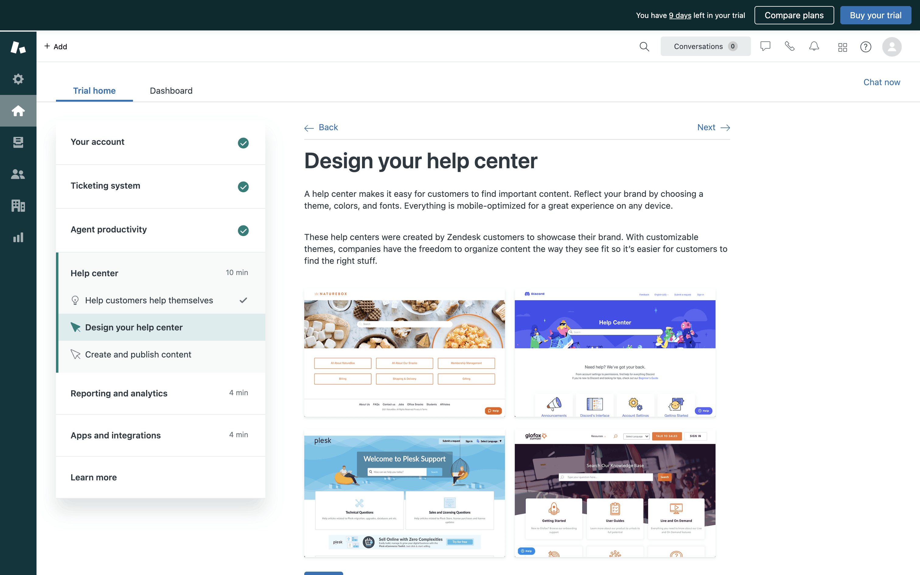 The user explores Zendesk features by navigating through different sections. They learn about adding a team, the ticketing system, and designing the help center.