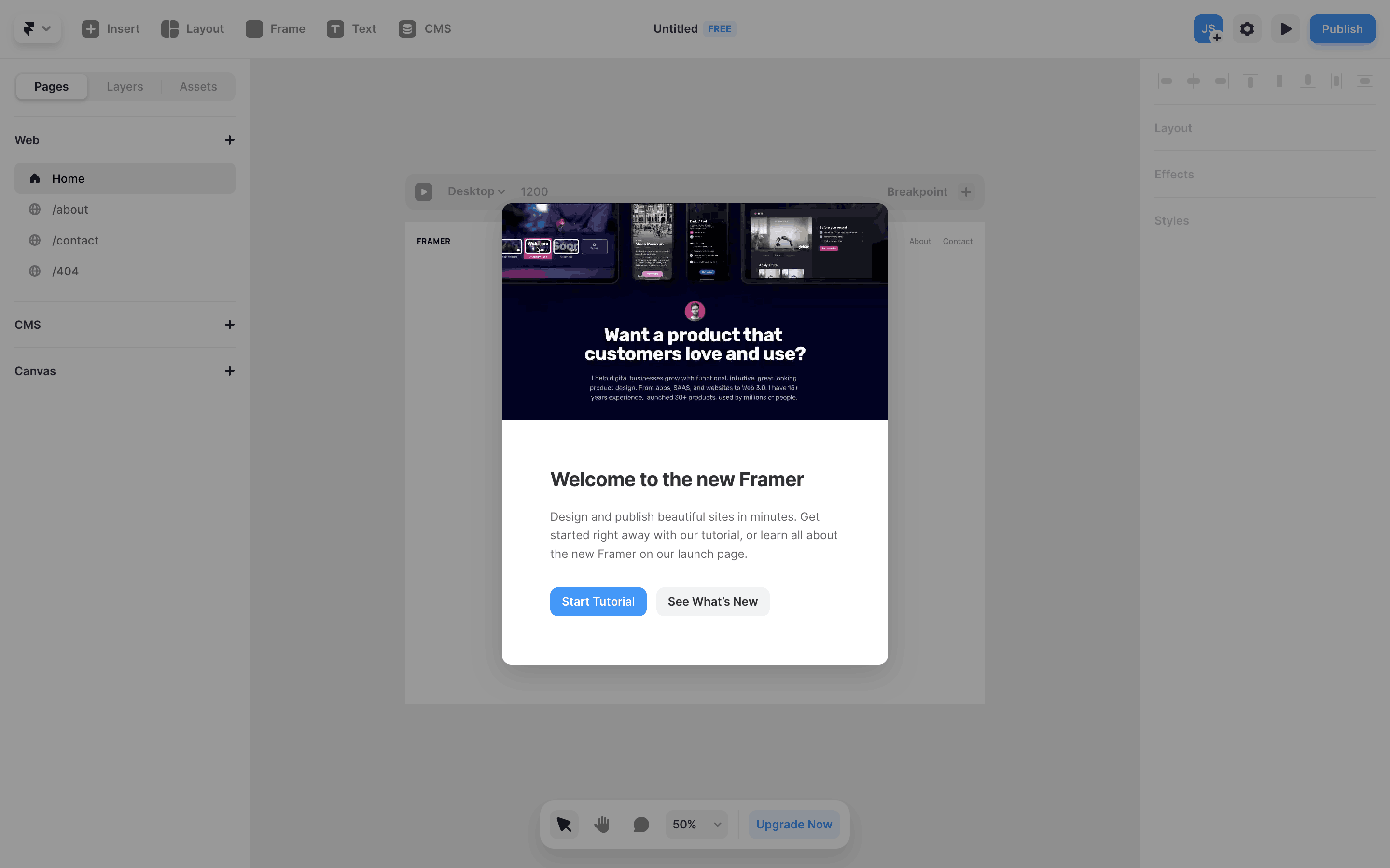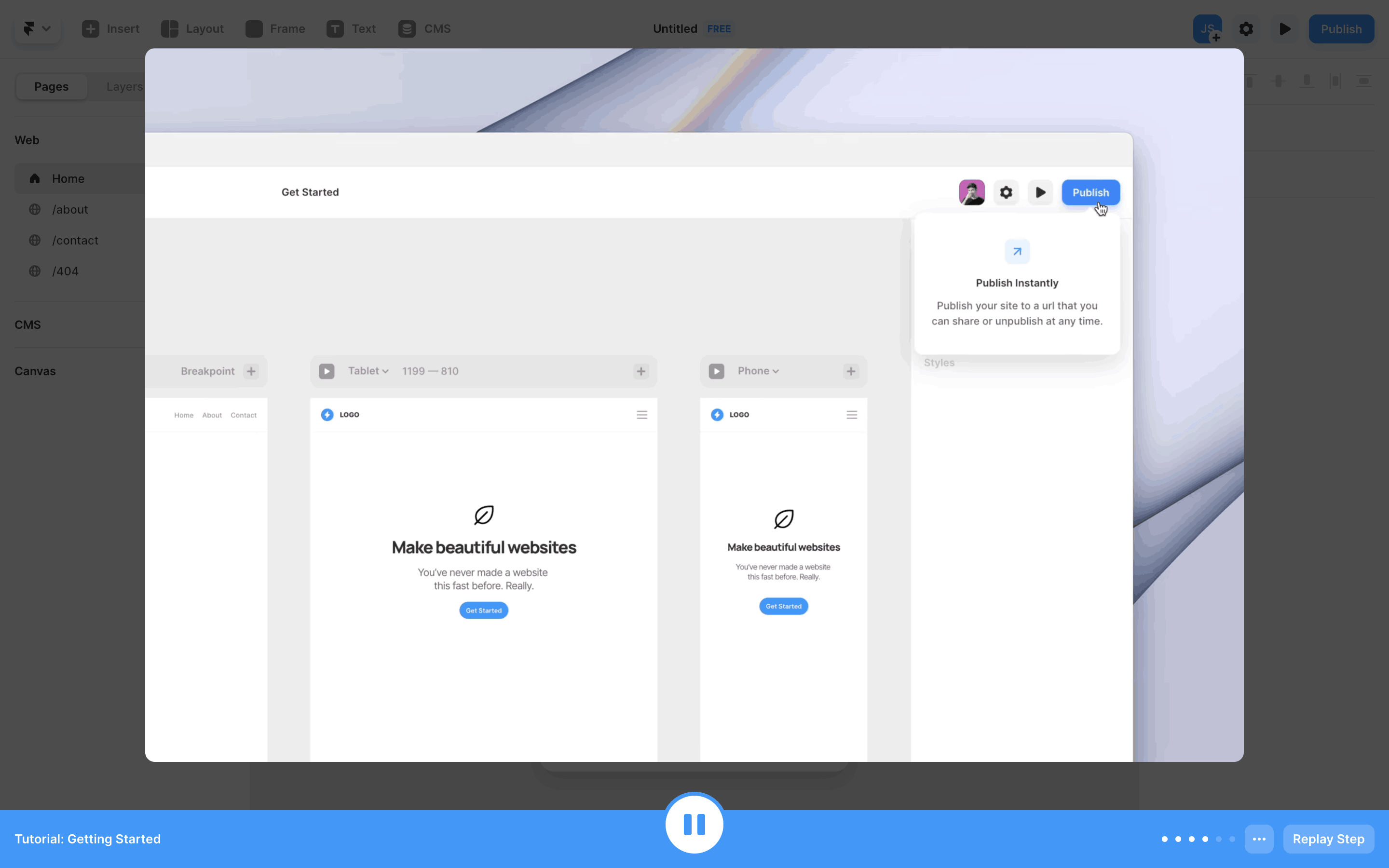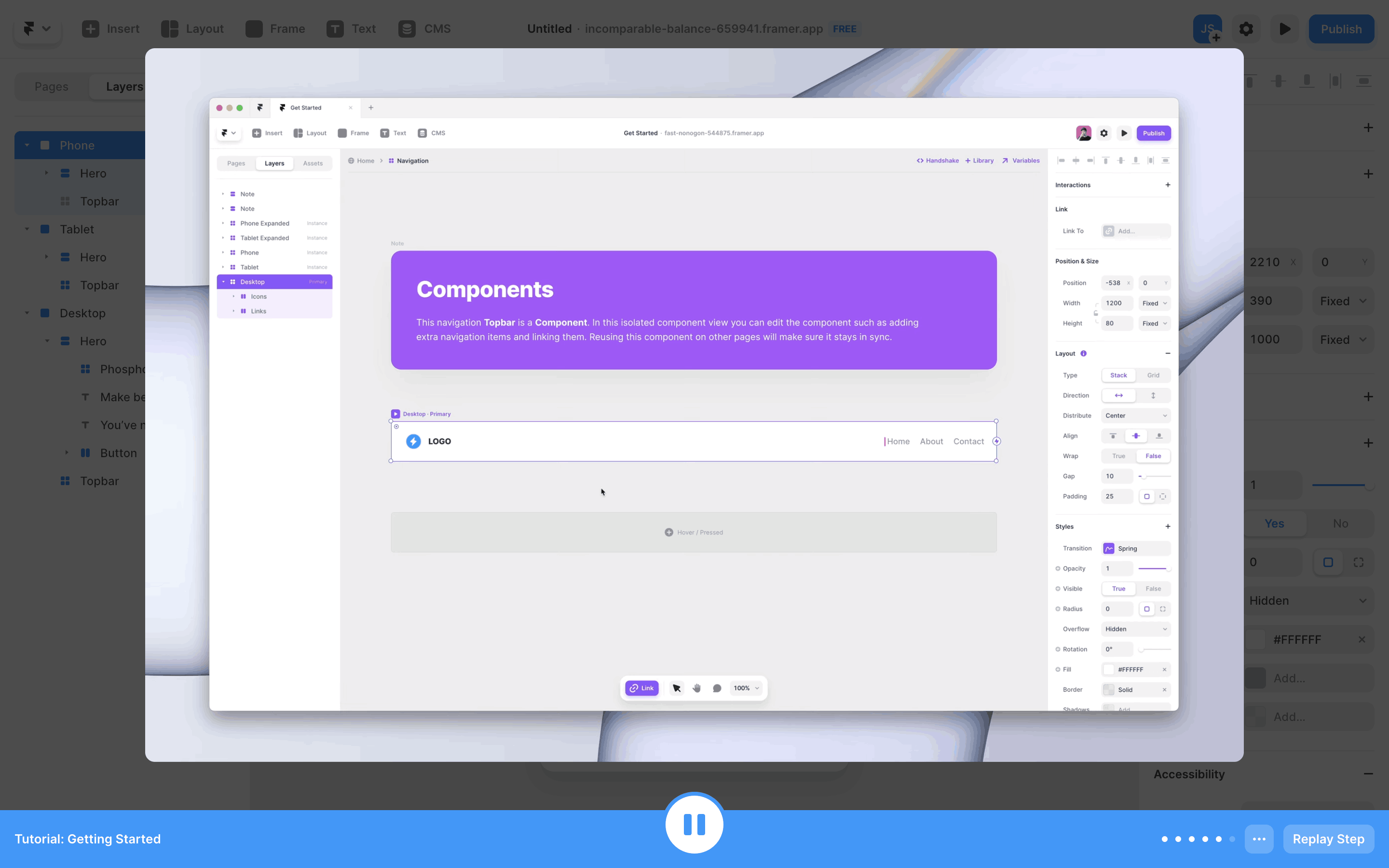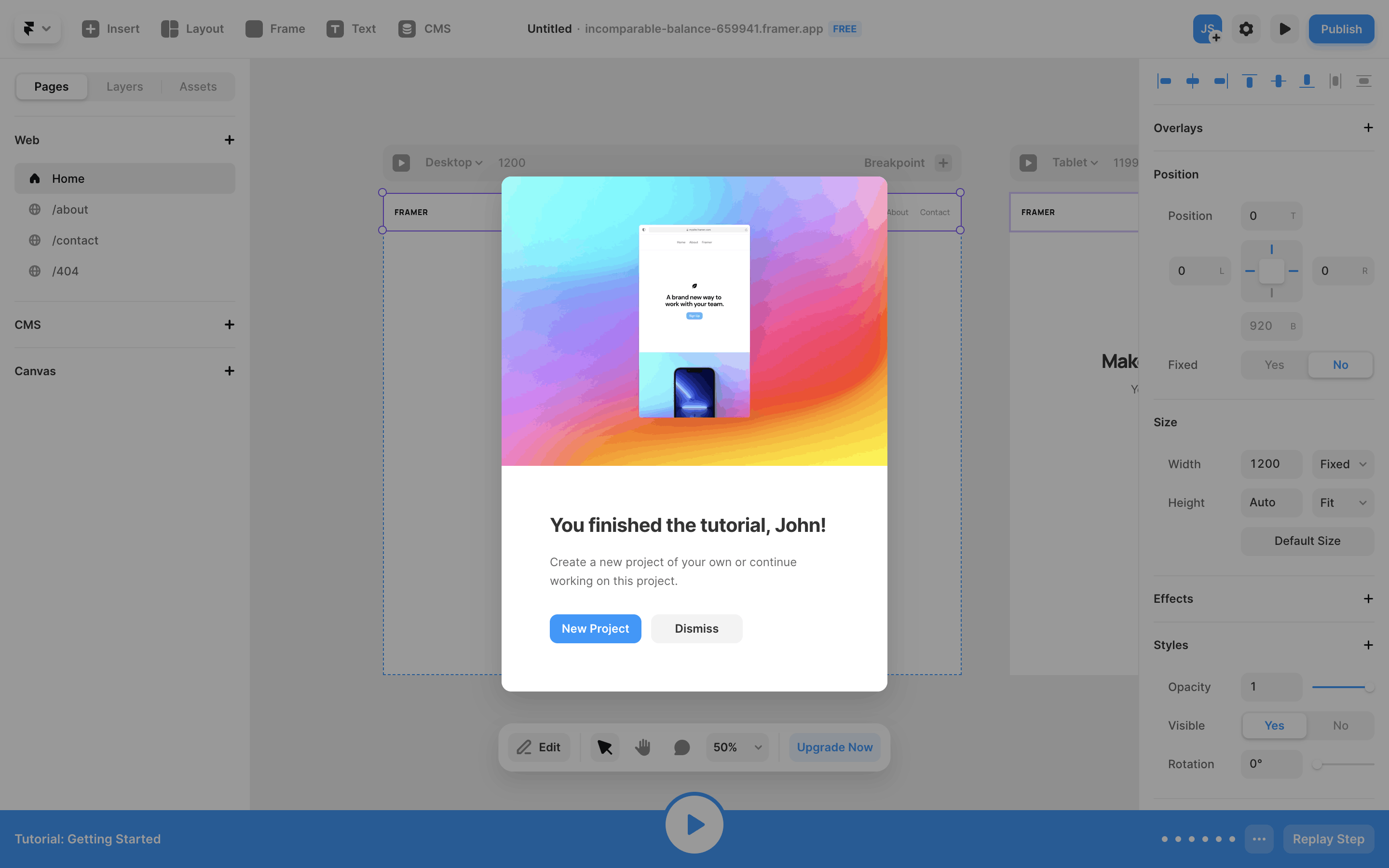 The user completes an interactive tutorial within the Framer UI. The tutorial guides the user through website creation and publishing, ending with a completion message.
