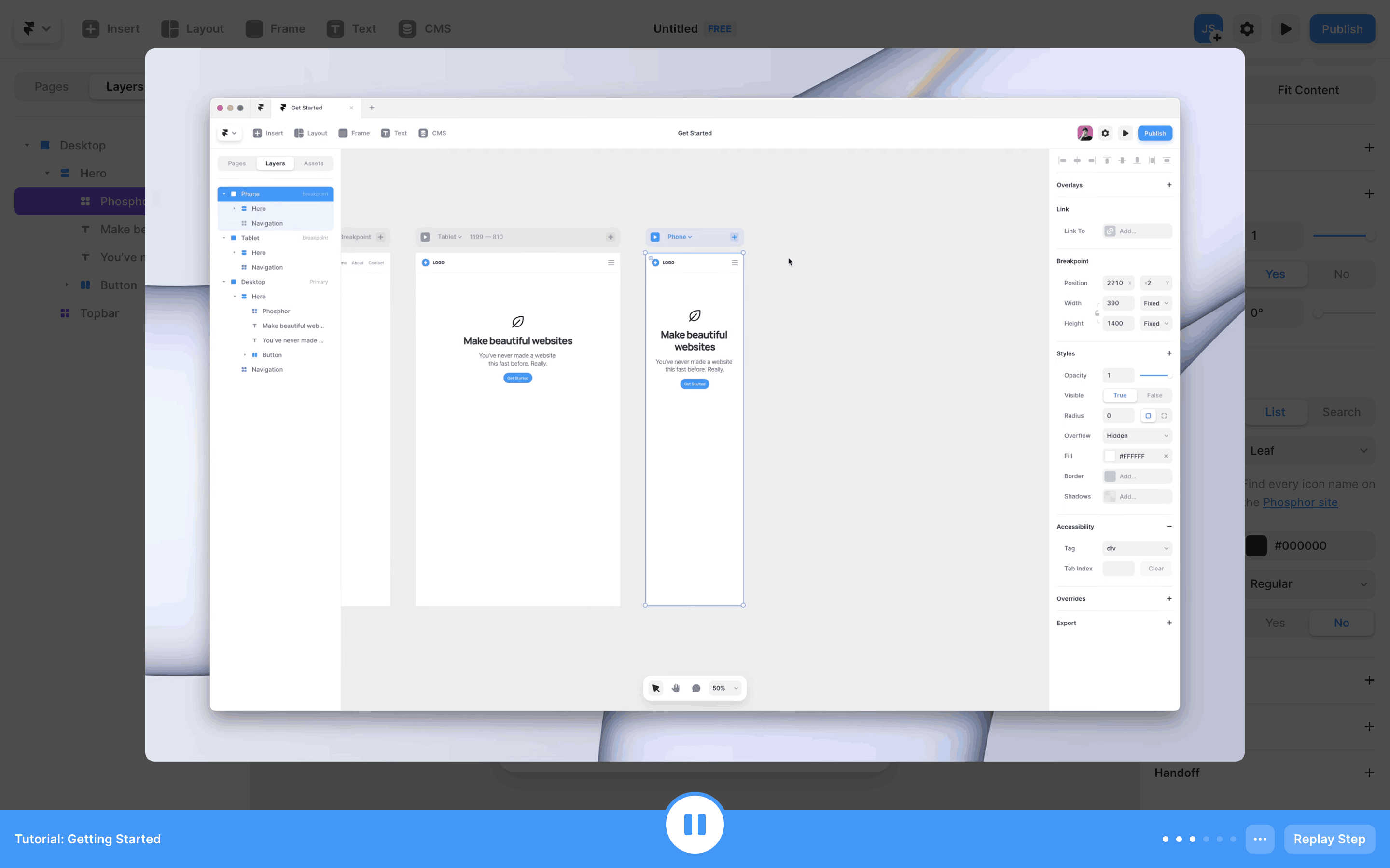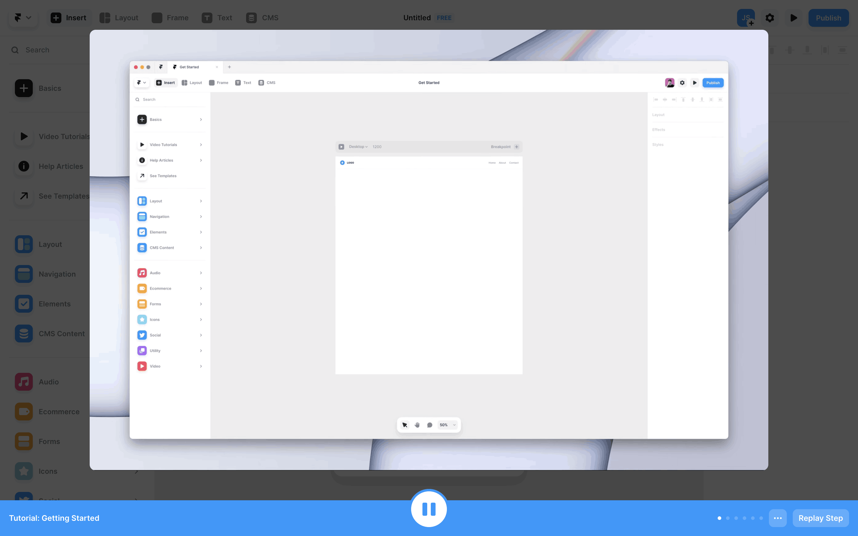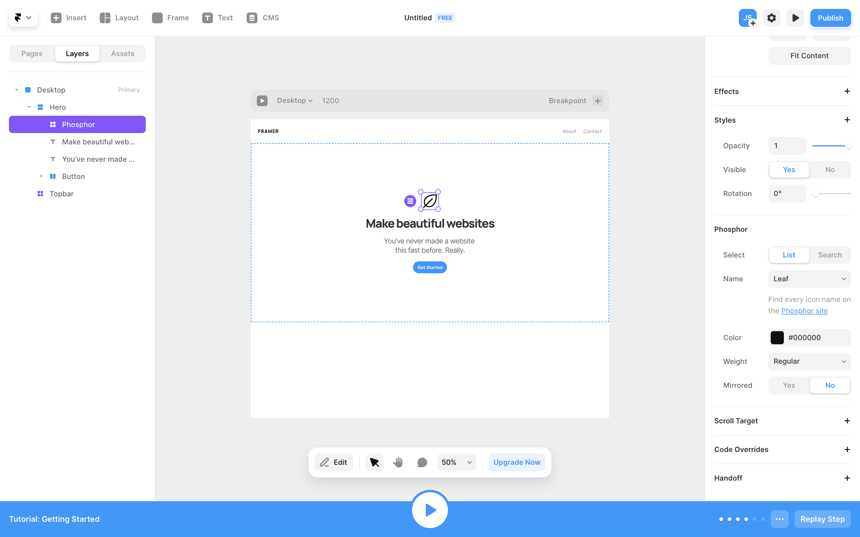 The user completes an interactive tutorial within the Framer UI. The tutorial guides the user through website creation and publishing, ending with a completion message.