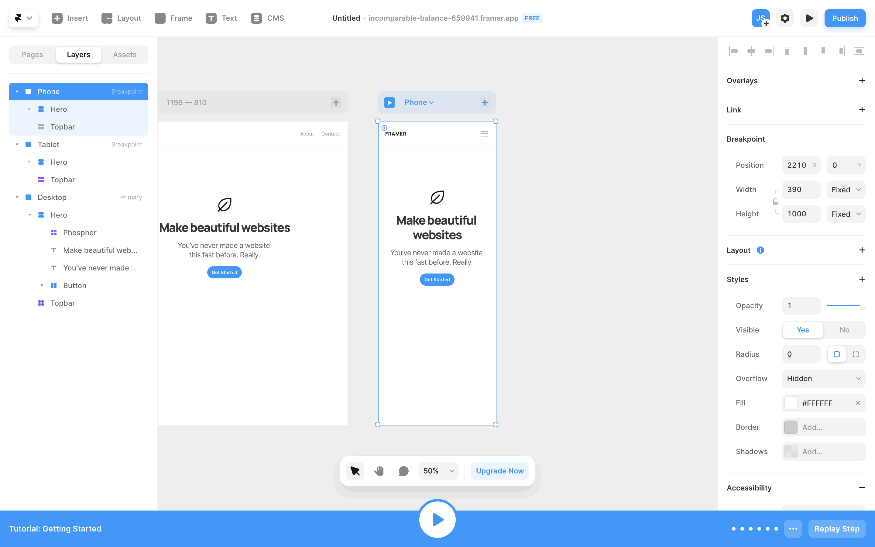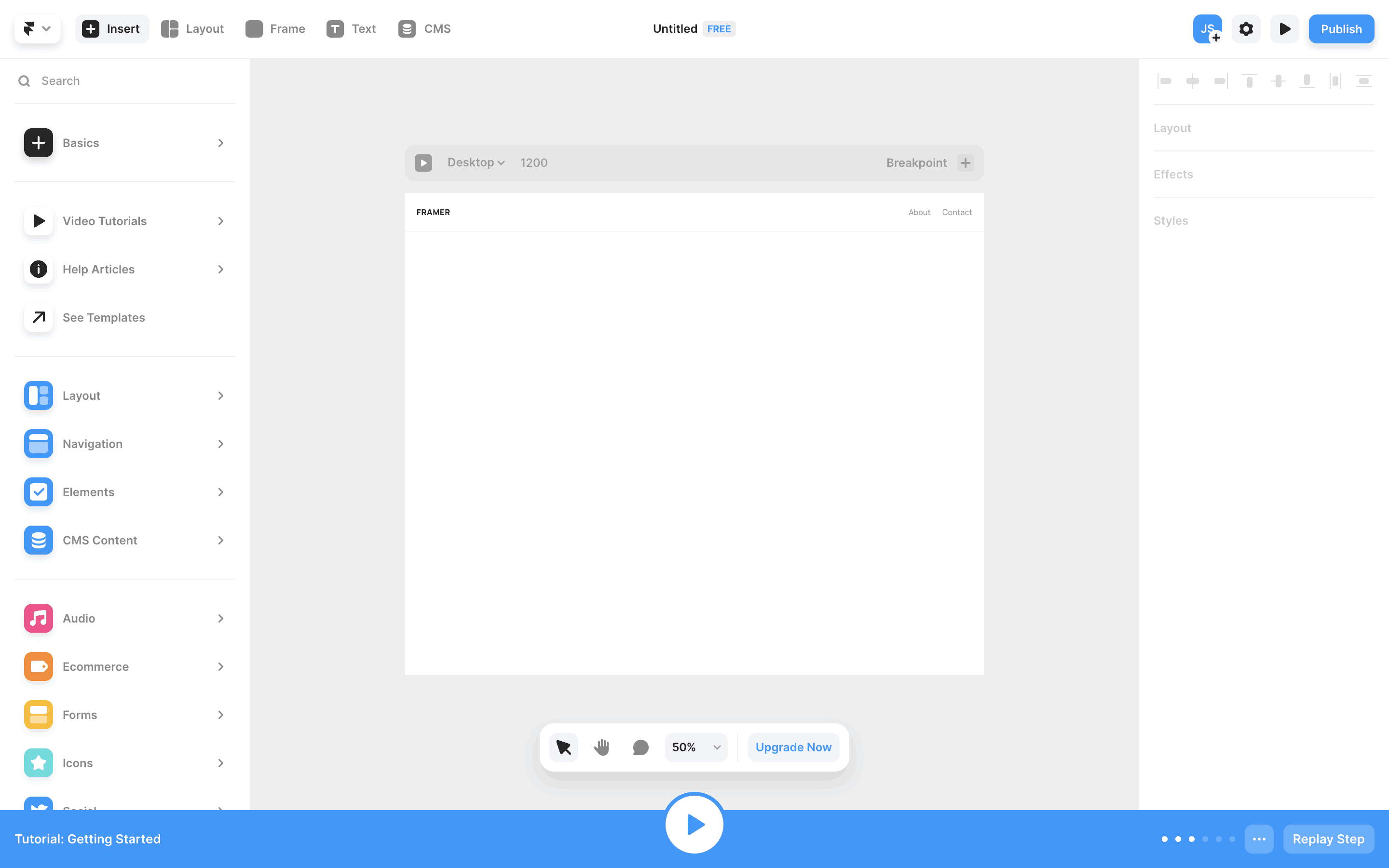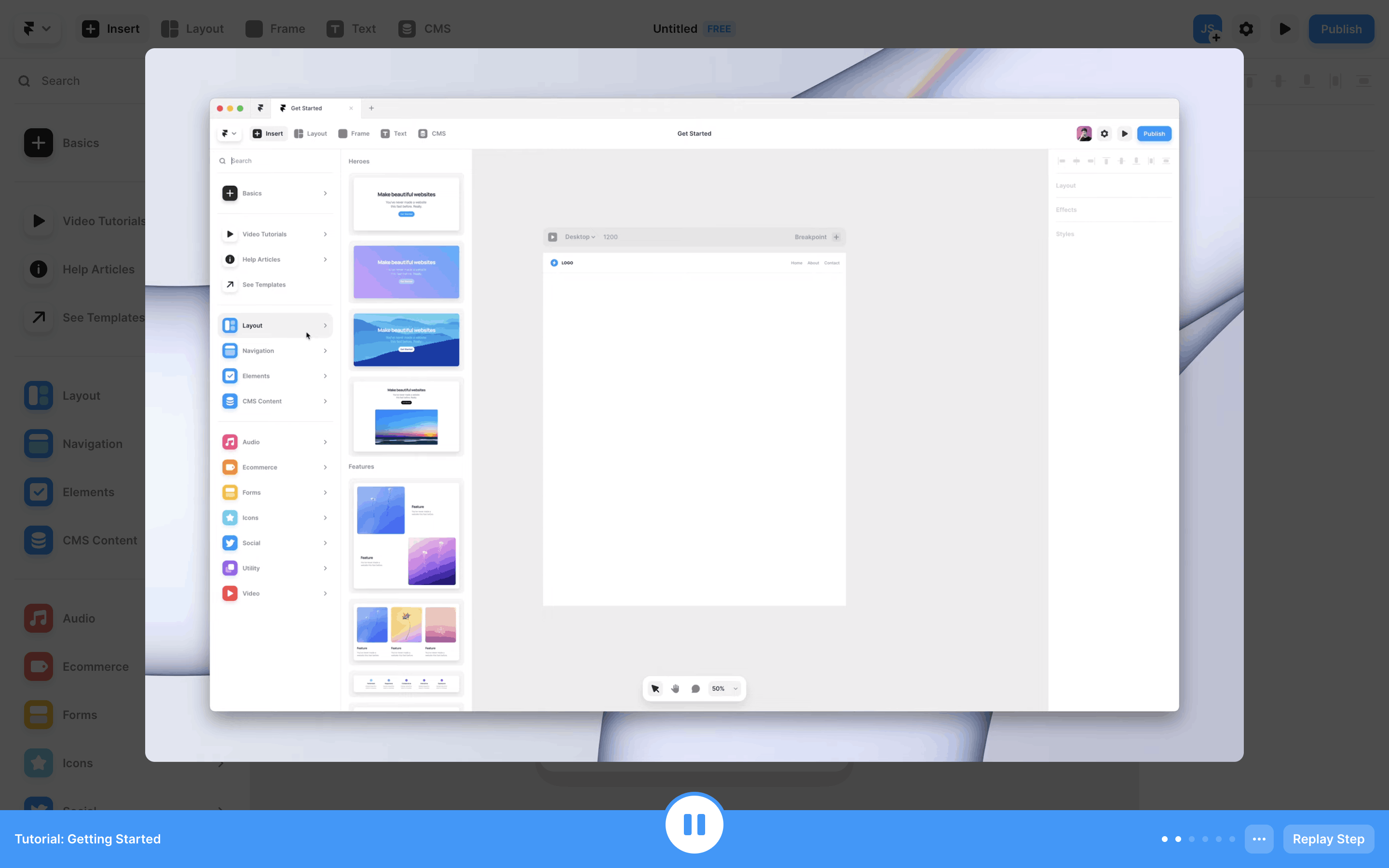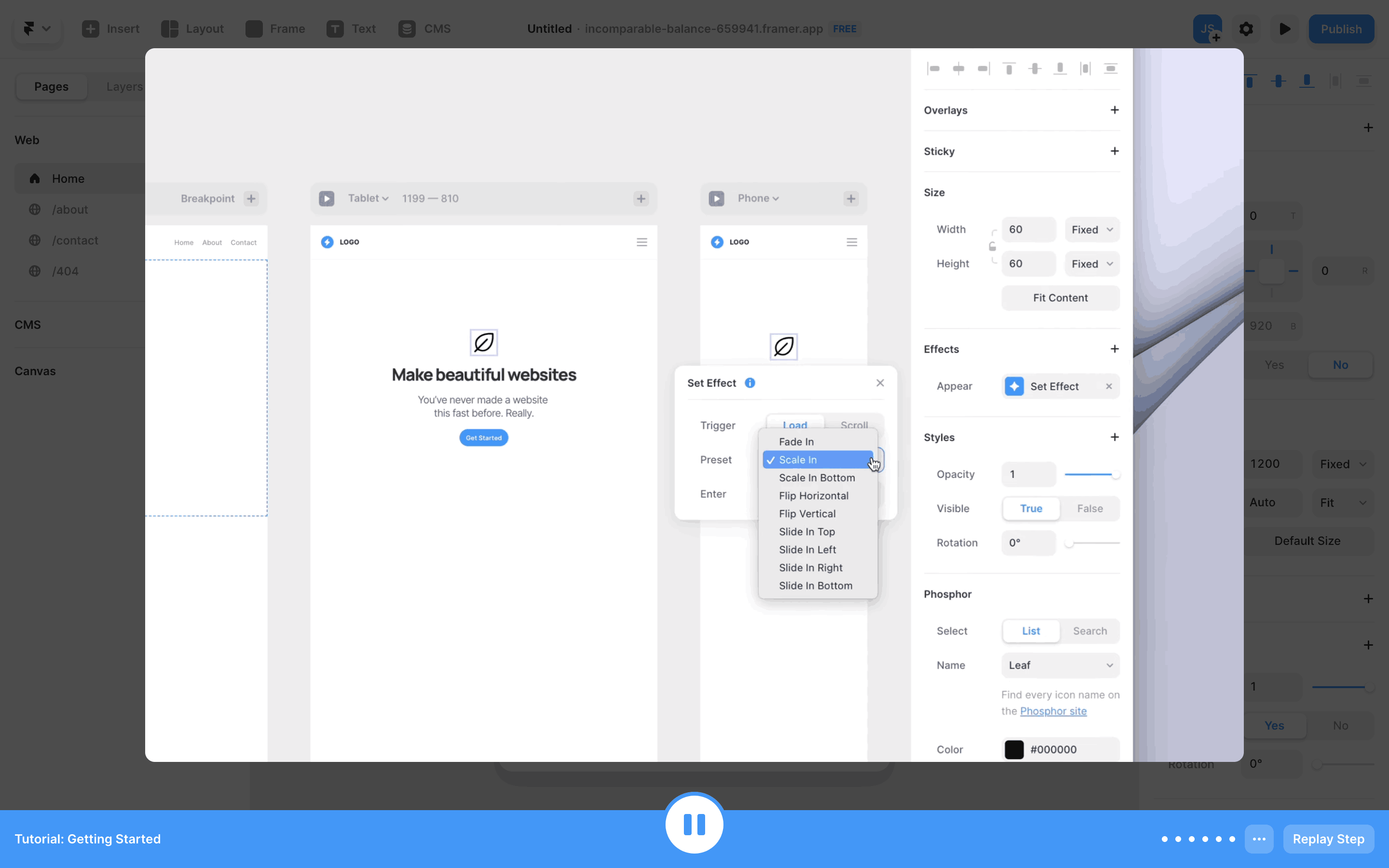 The user completes an interactive tutorial within the Framer UI. The tutorial guides the user through website creation and publishing, ending with a completion message.