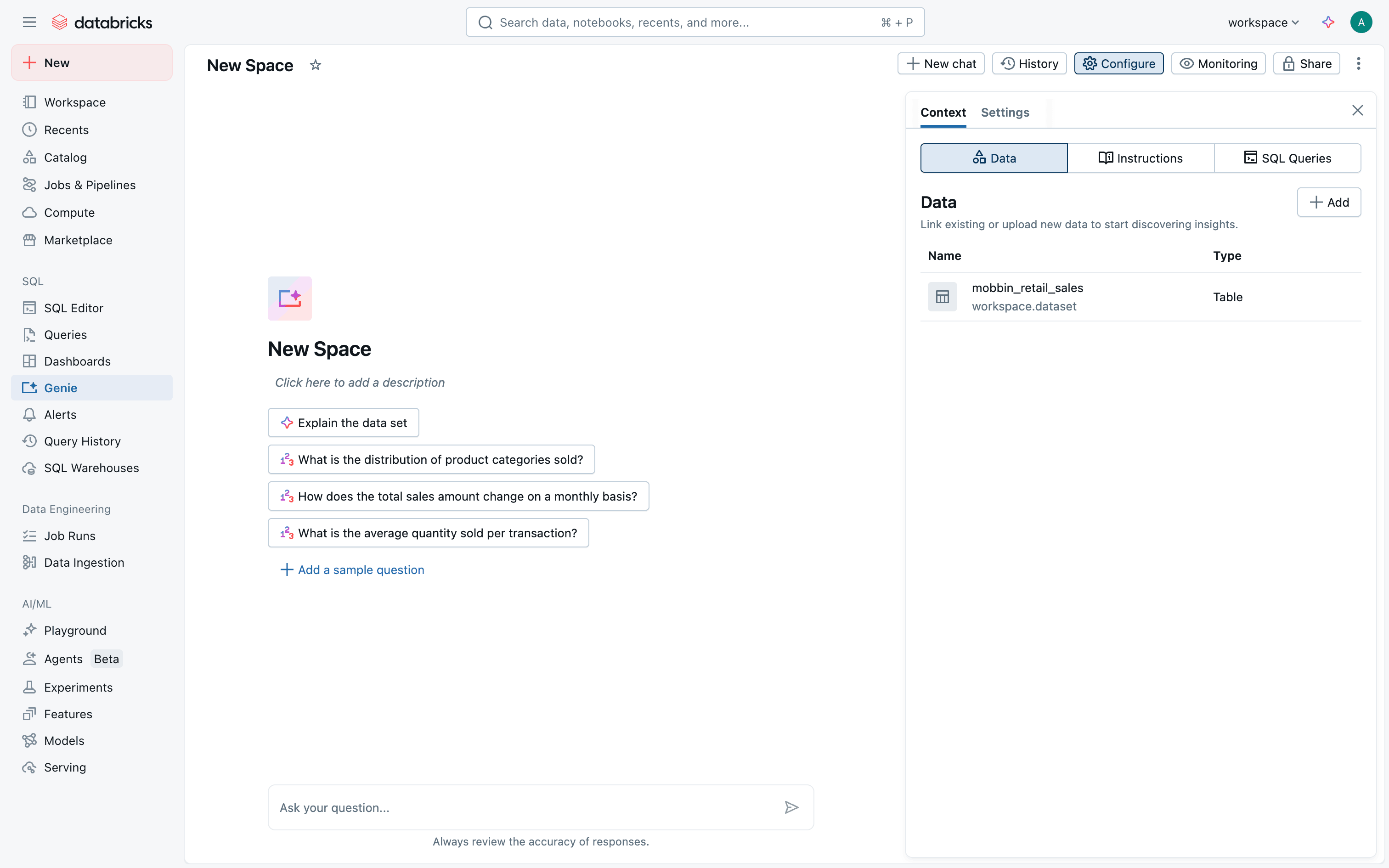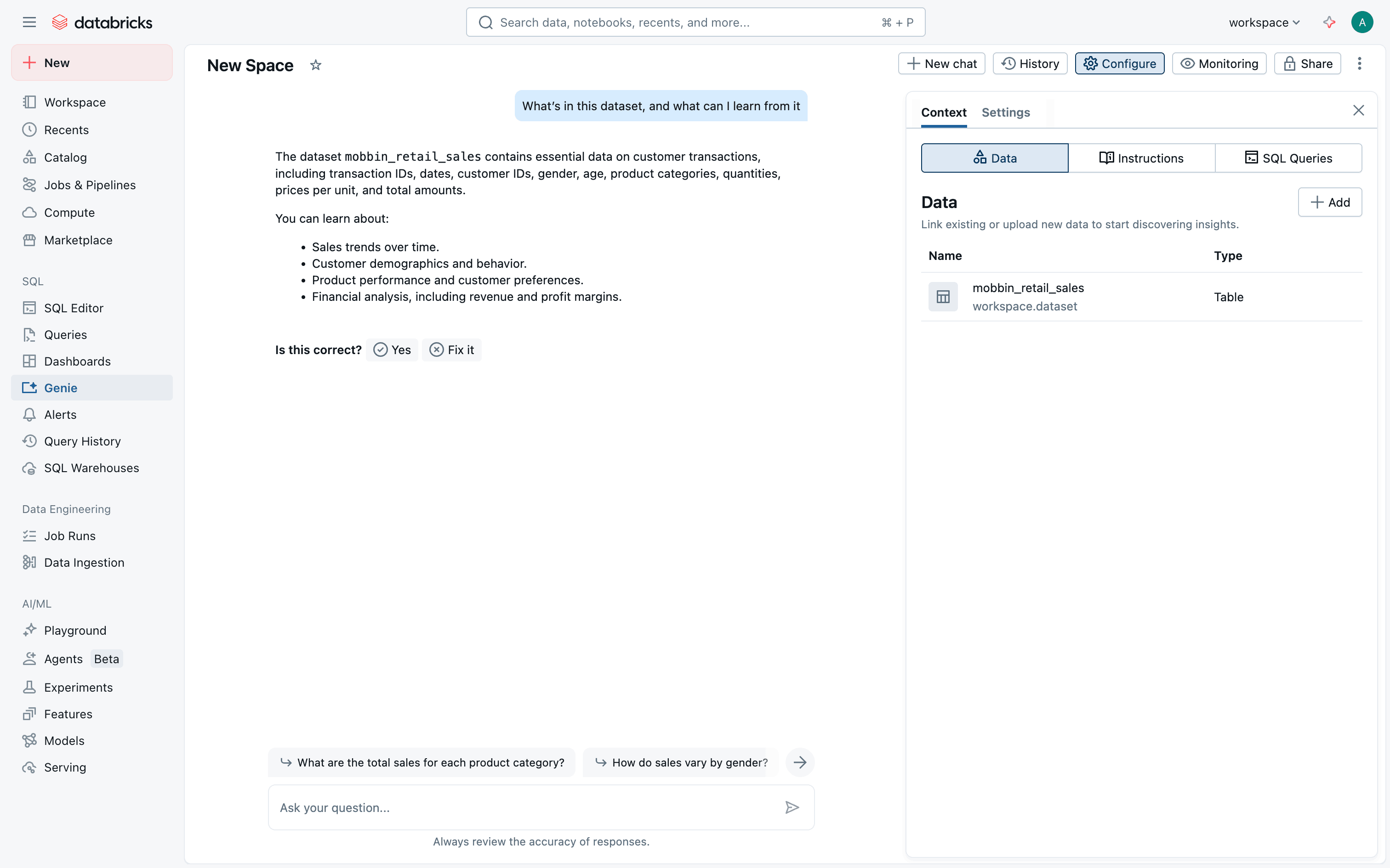 The user explores a dataset by asking questions in a chat interface. The system provides explanations and data analysis in response.