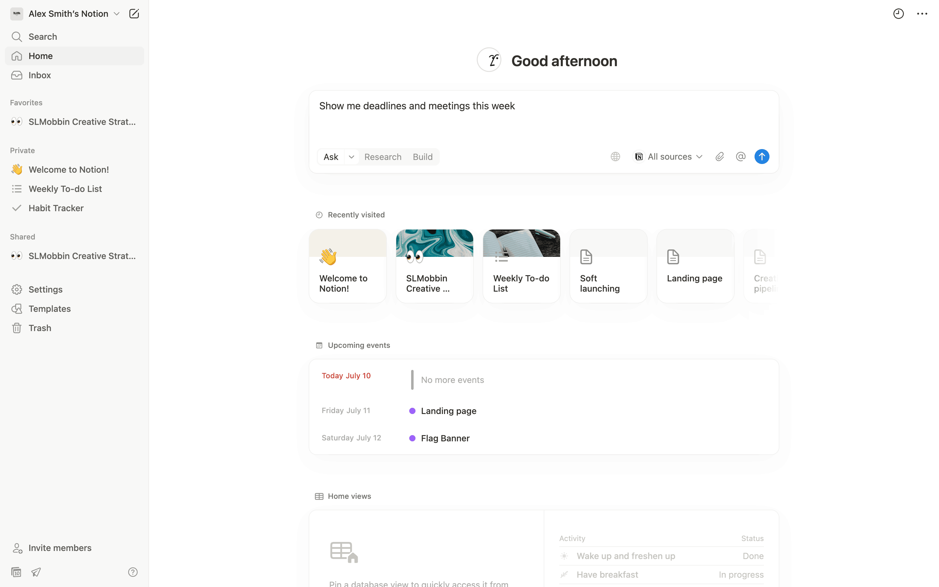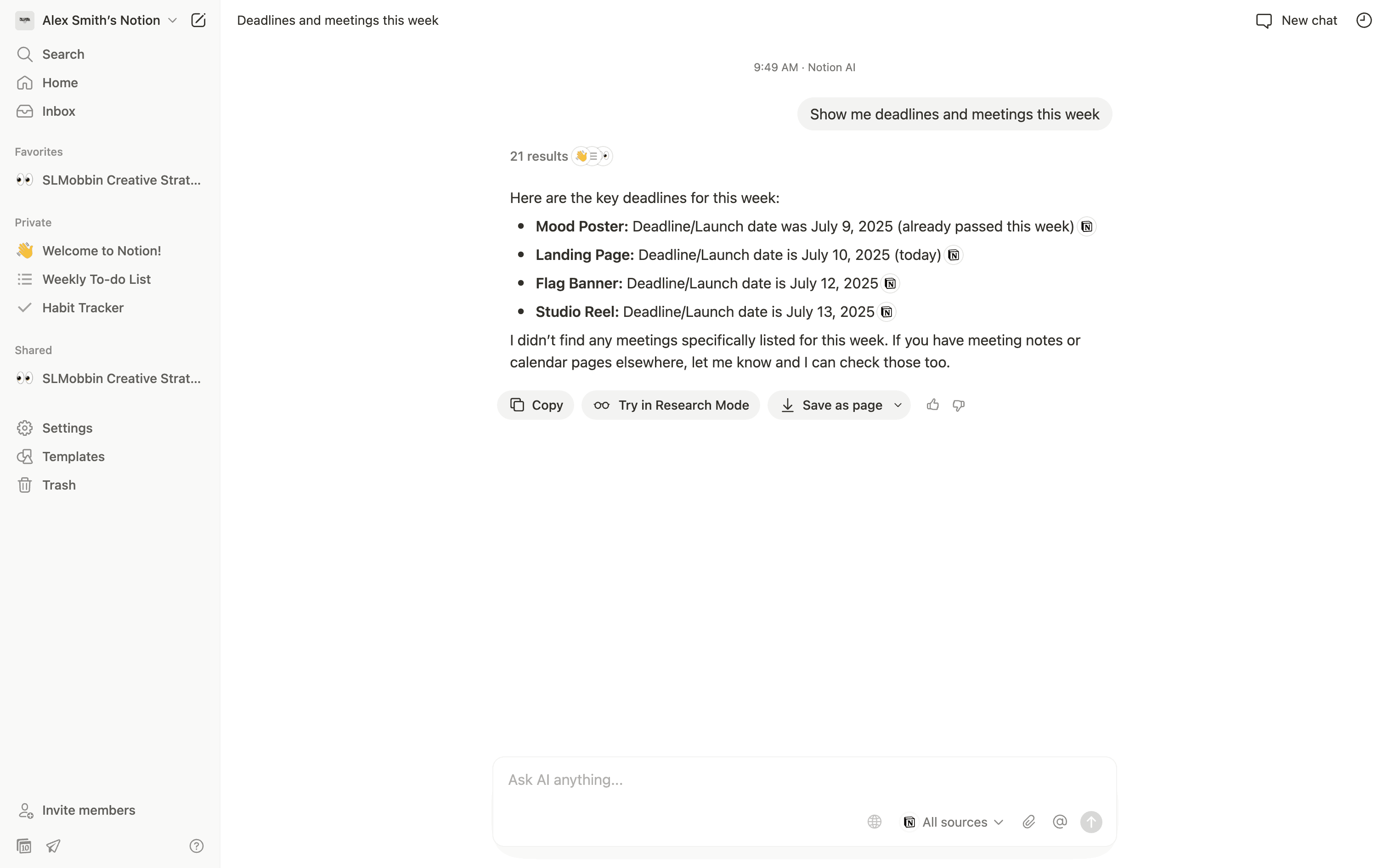 The user enters a search query on the Notion homepage to find deadlines and meetings. The search results are then displayed.