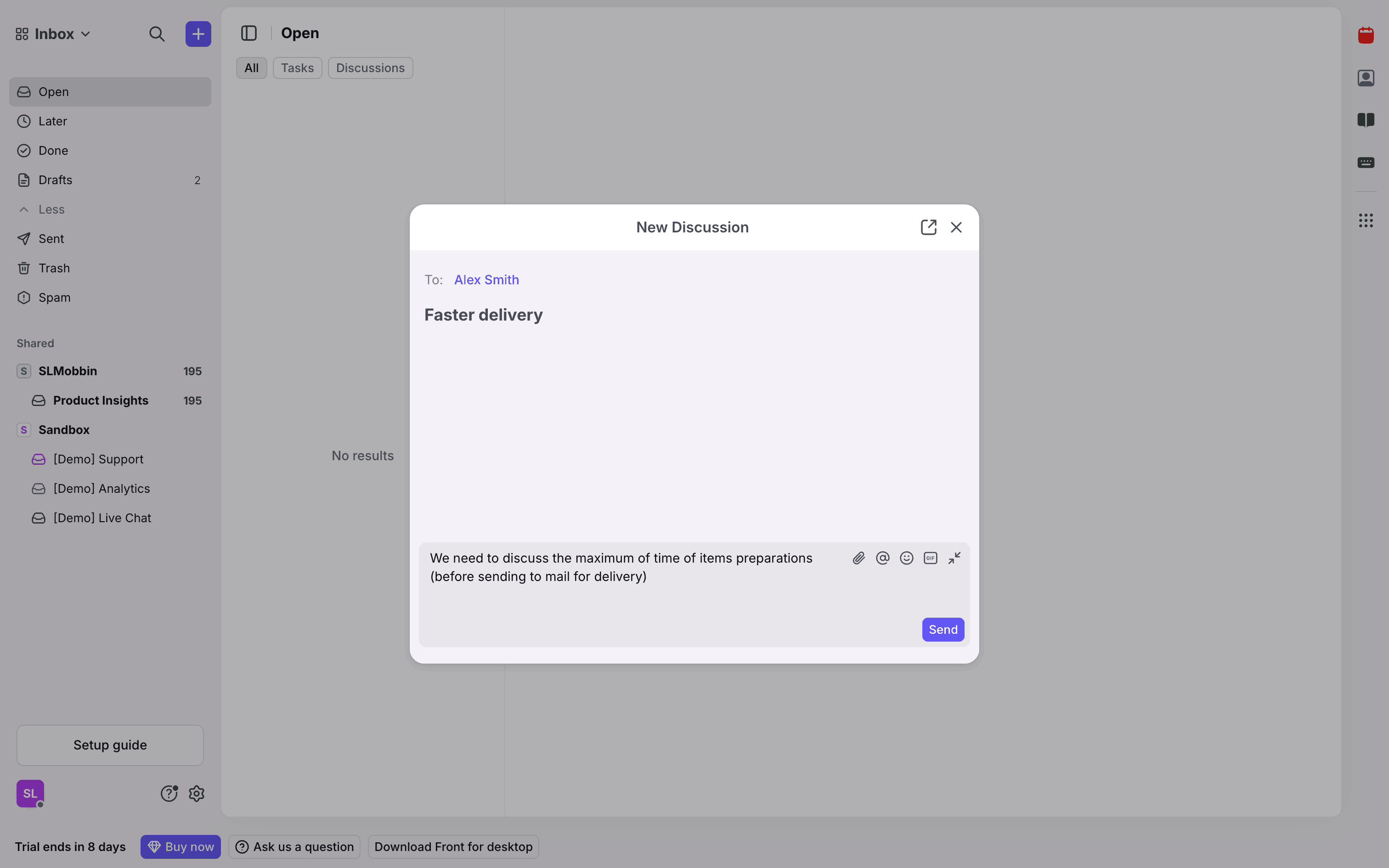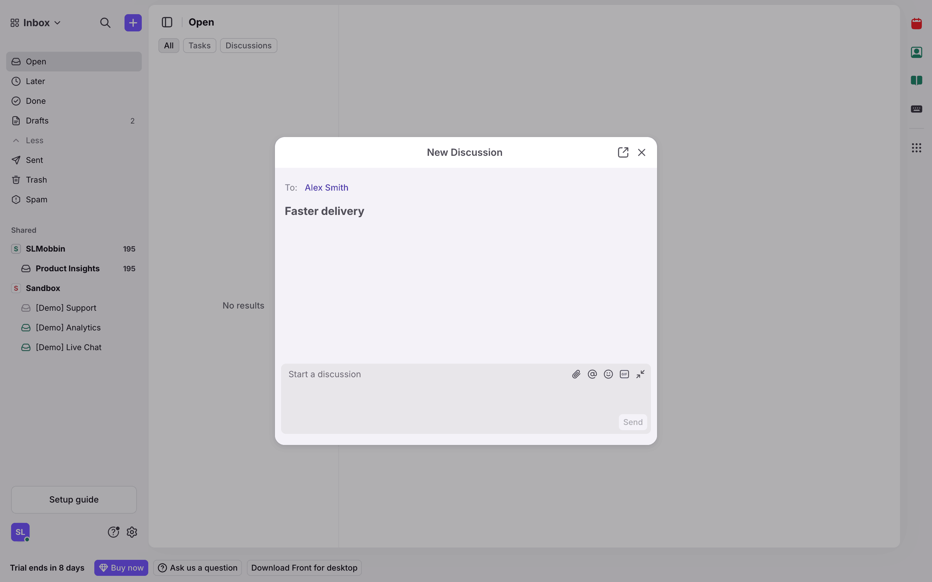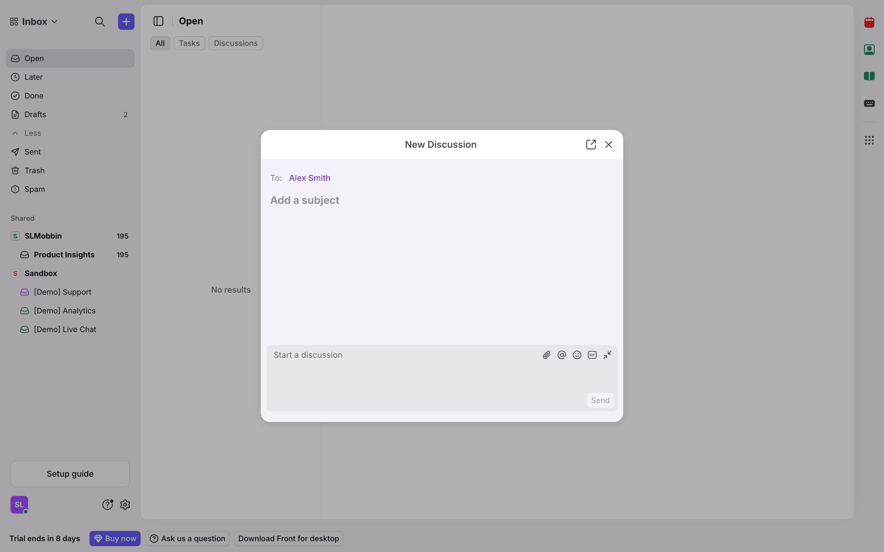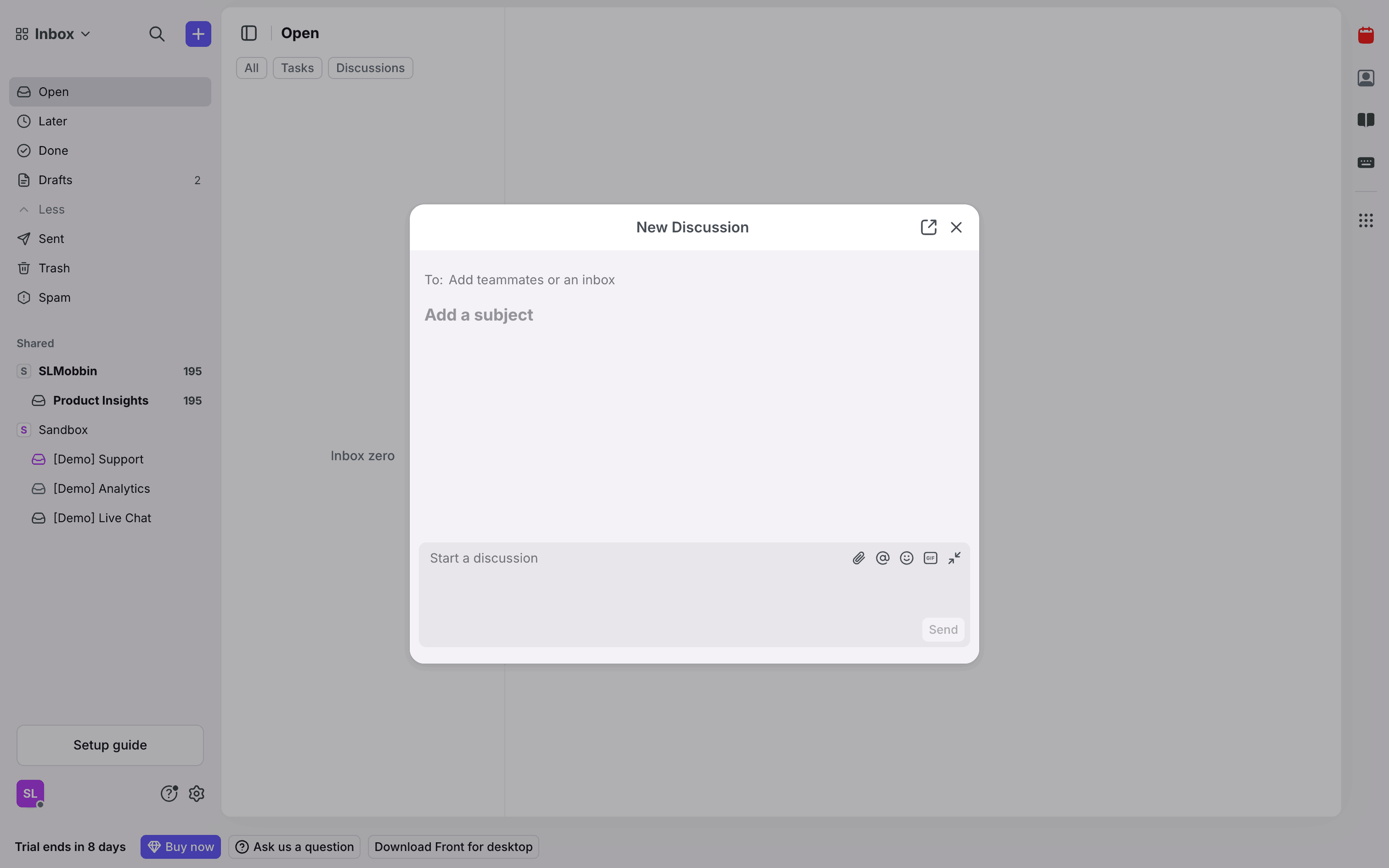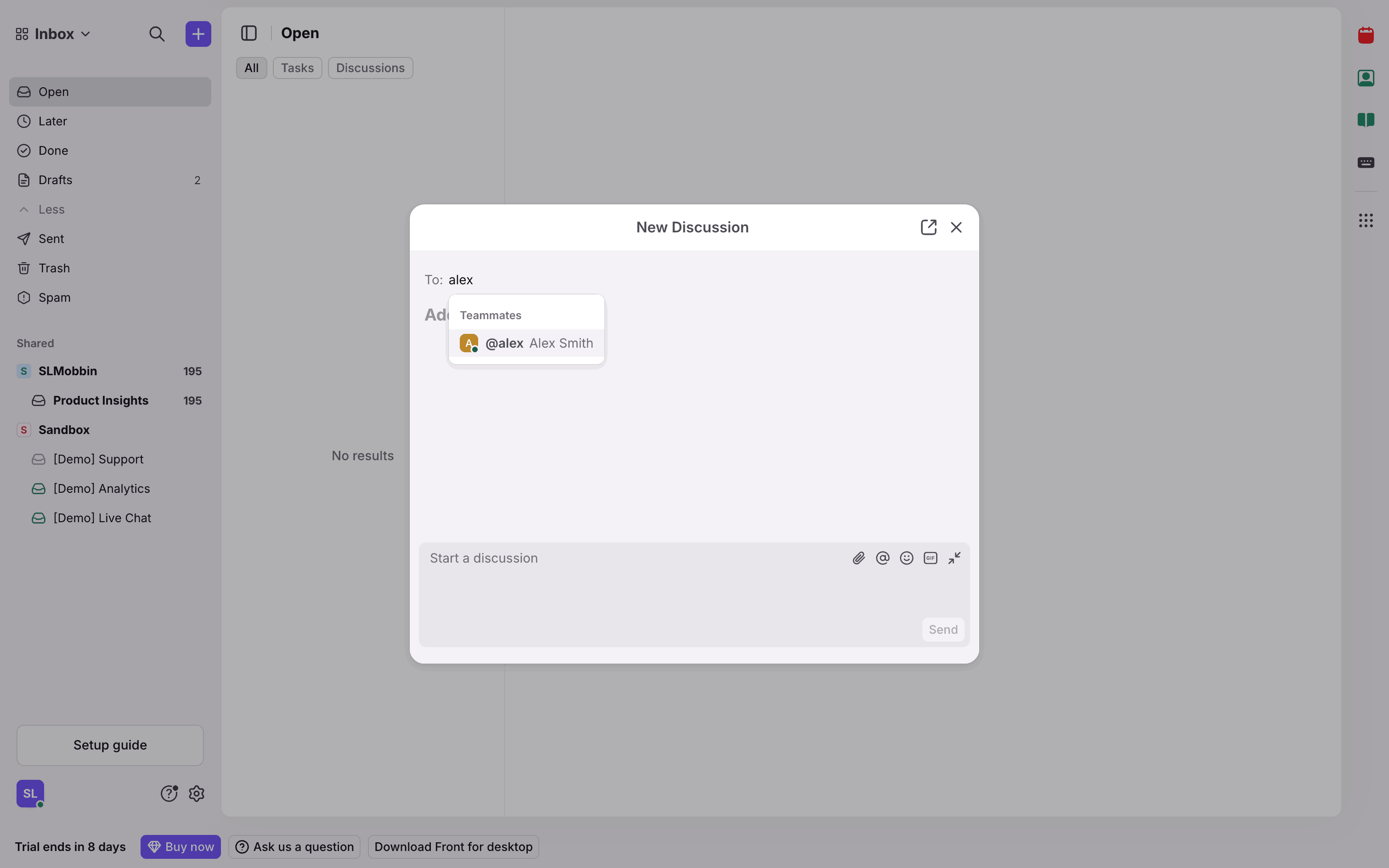 The user creates a new discussion by adding teammates, a subject, and a message. A teammate then responds to the discussion.