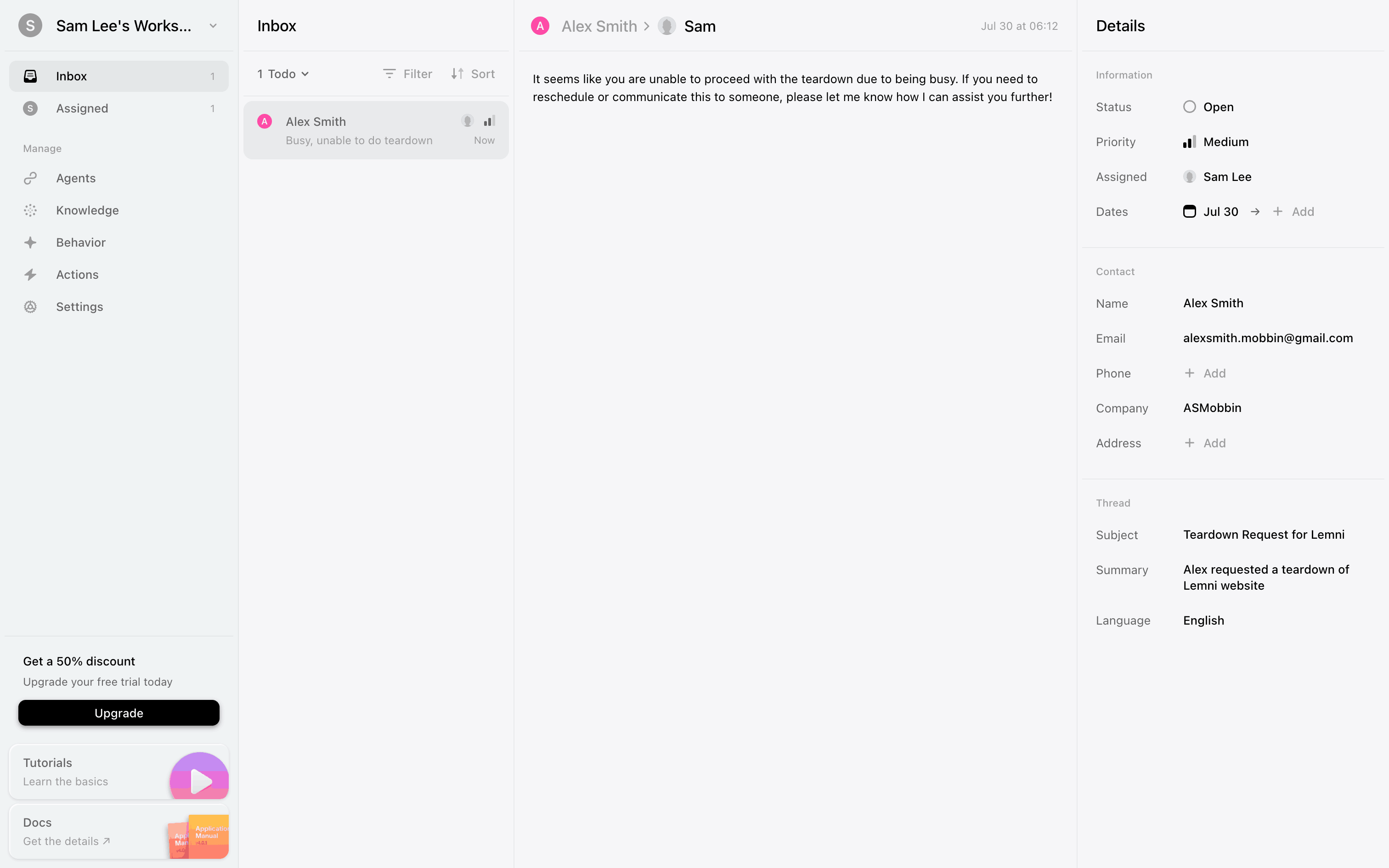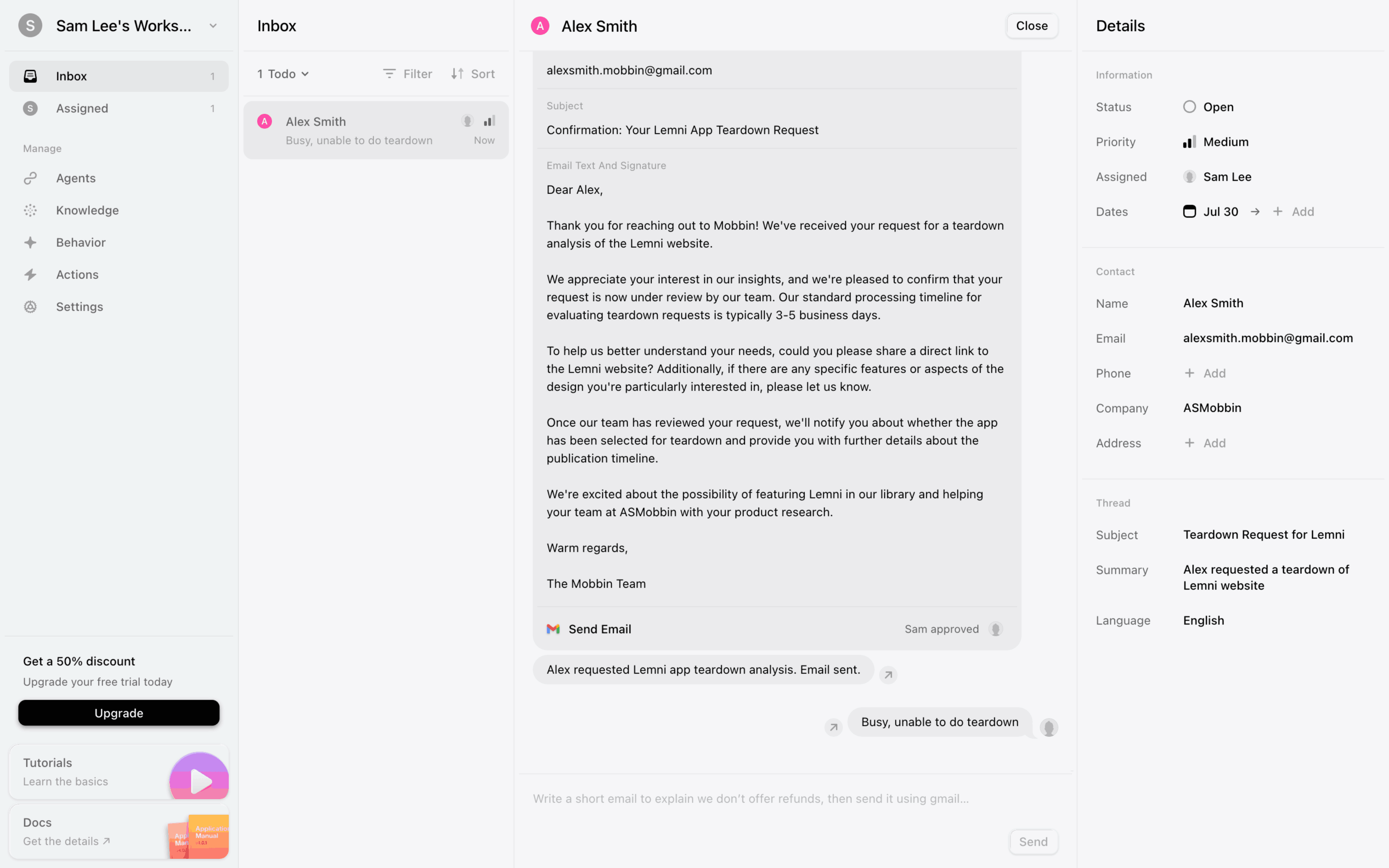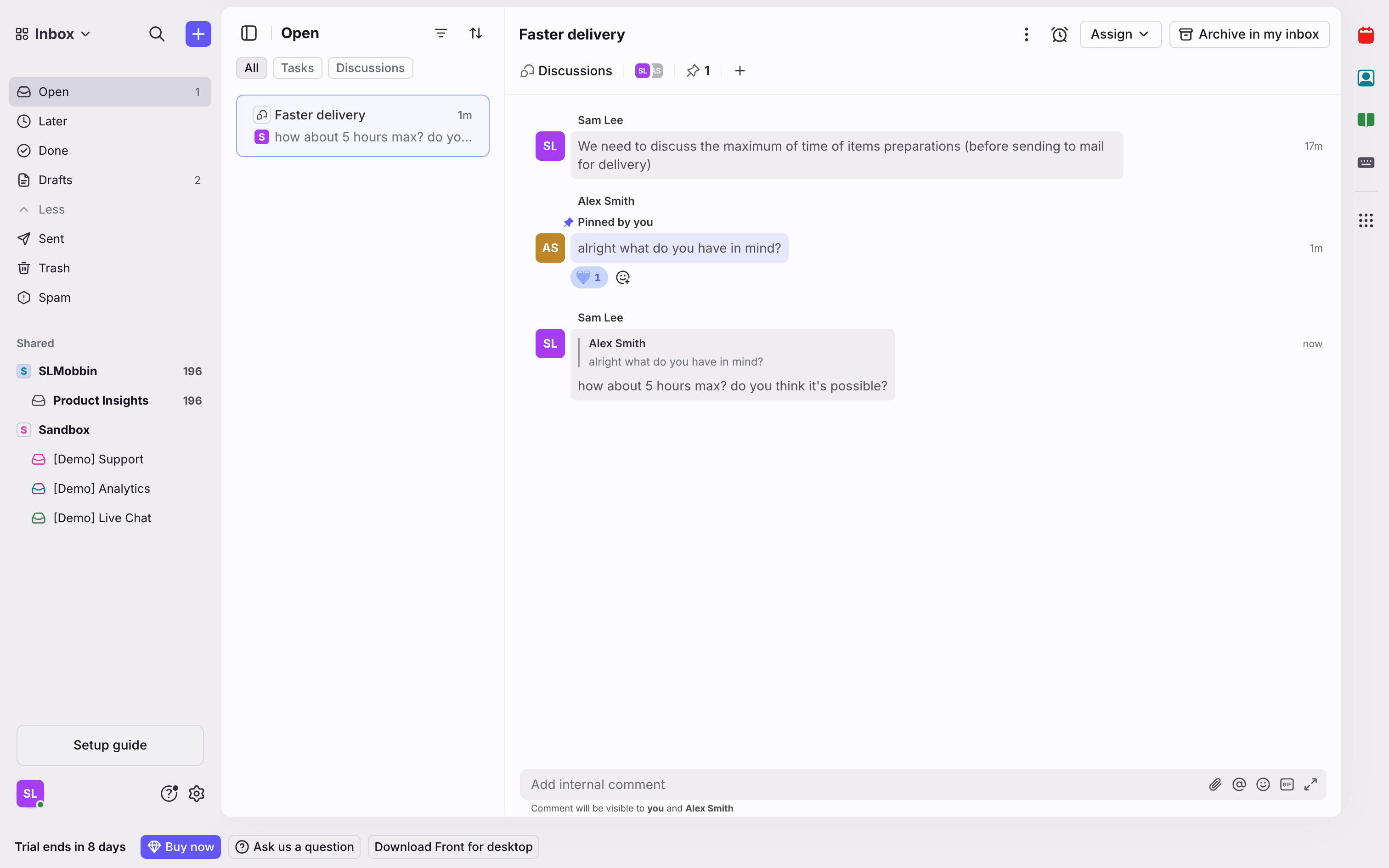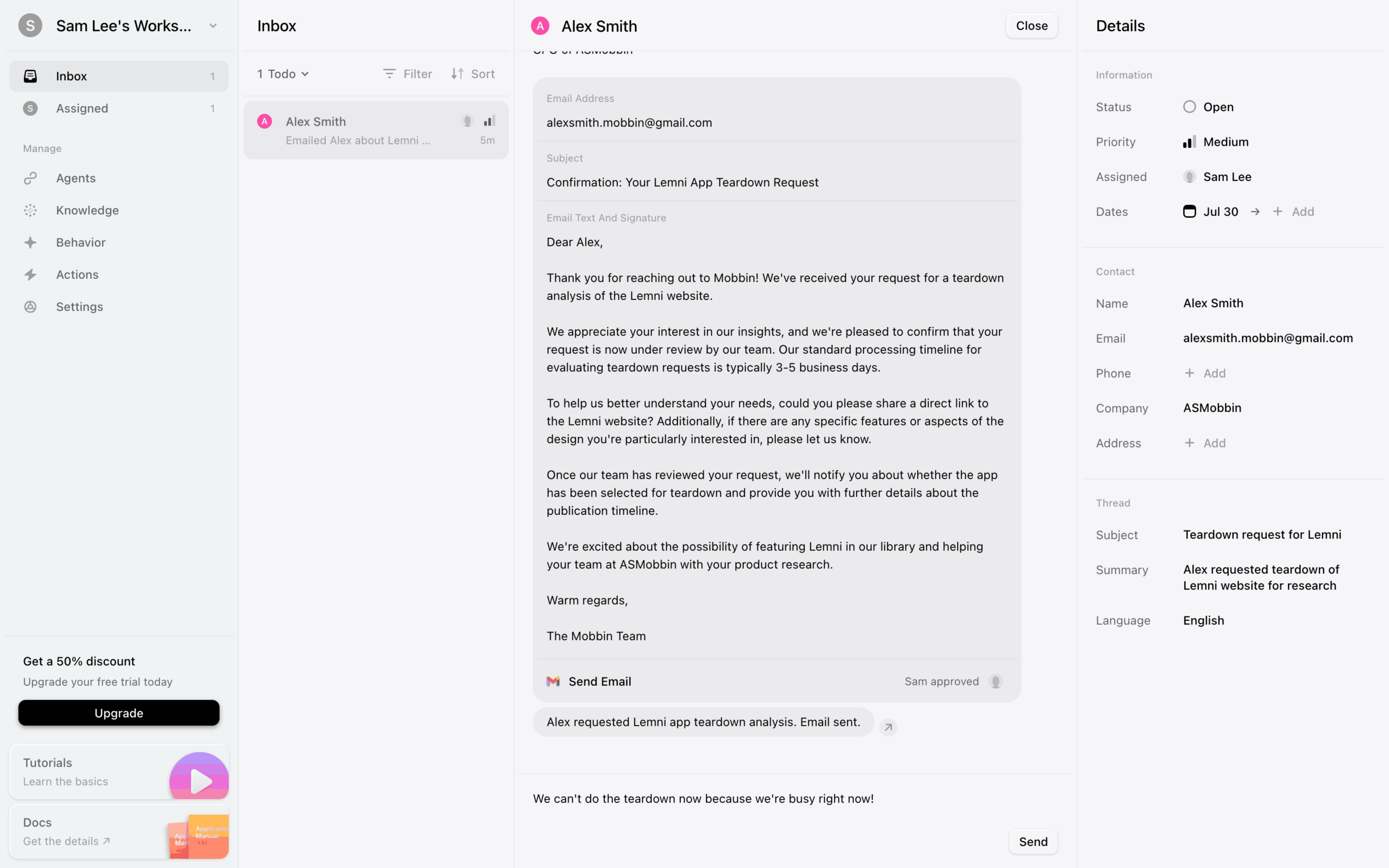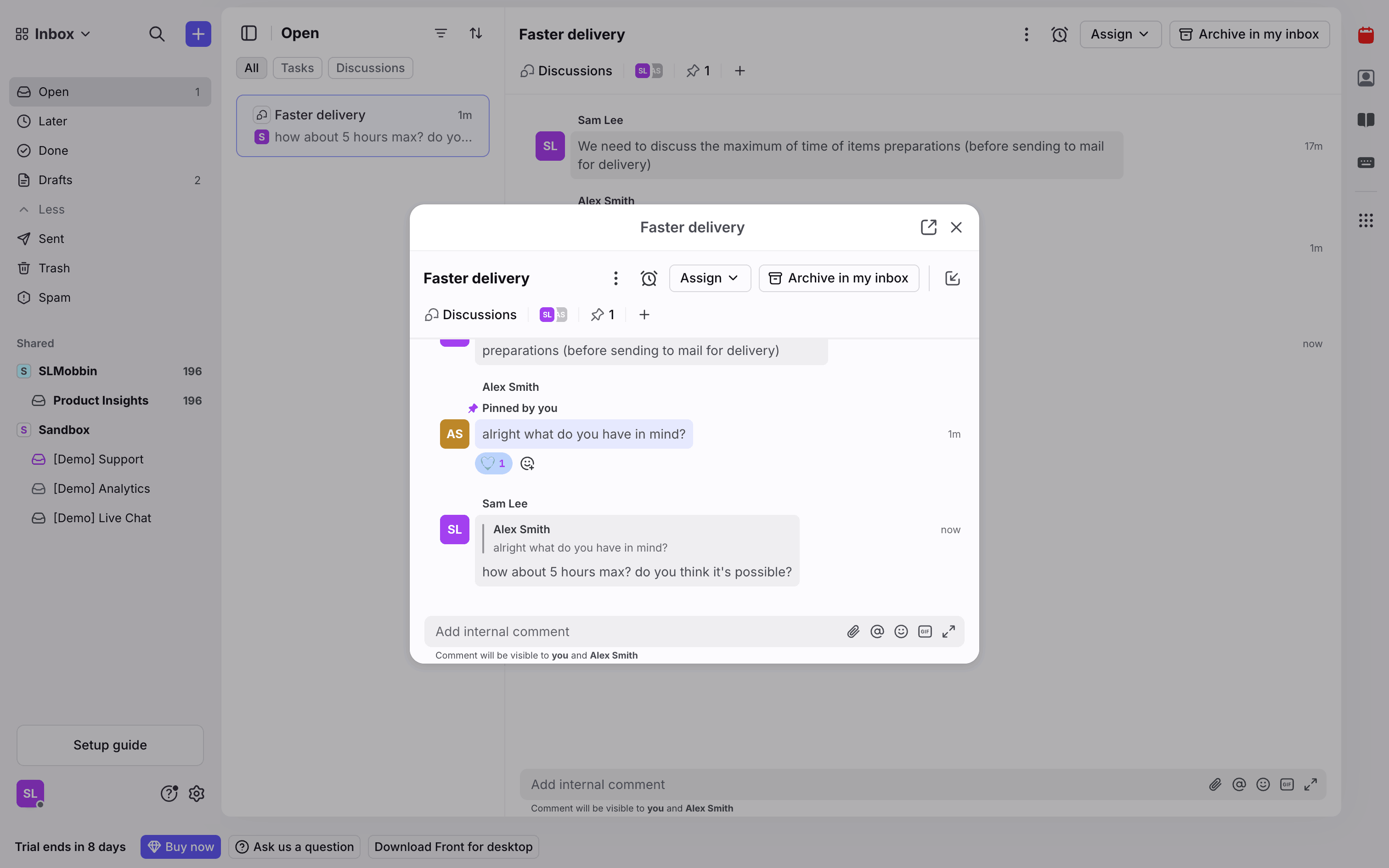 The user creates a new discussion by adding teammates, a subject, and a message. A teammate then responds to the discussion.