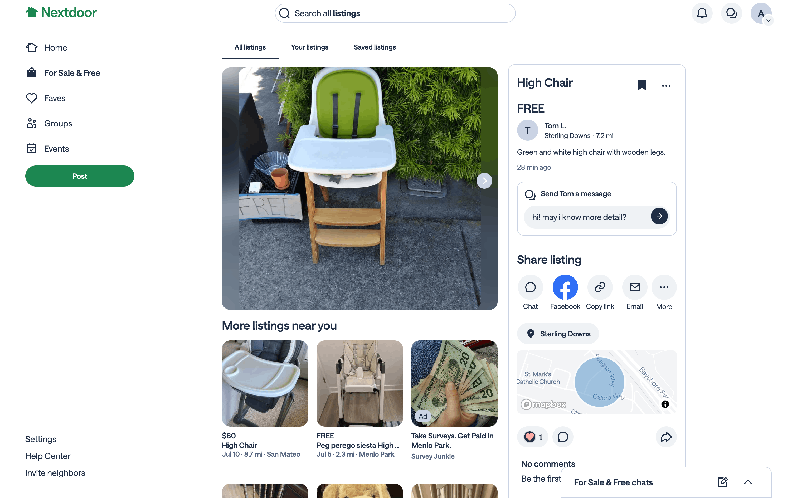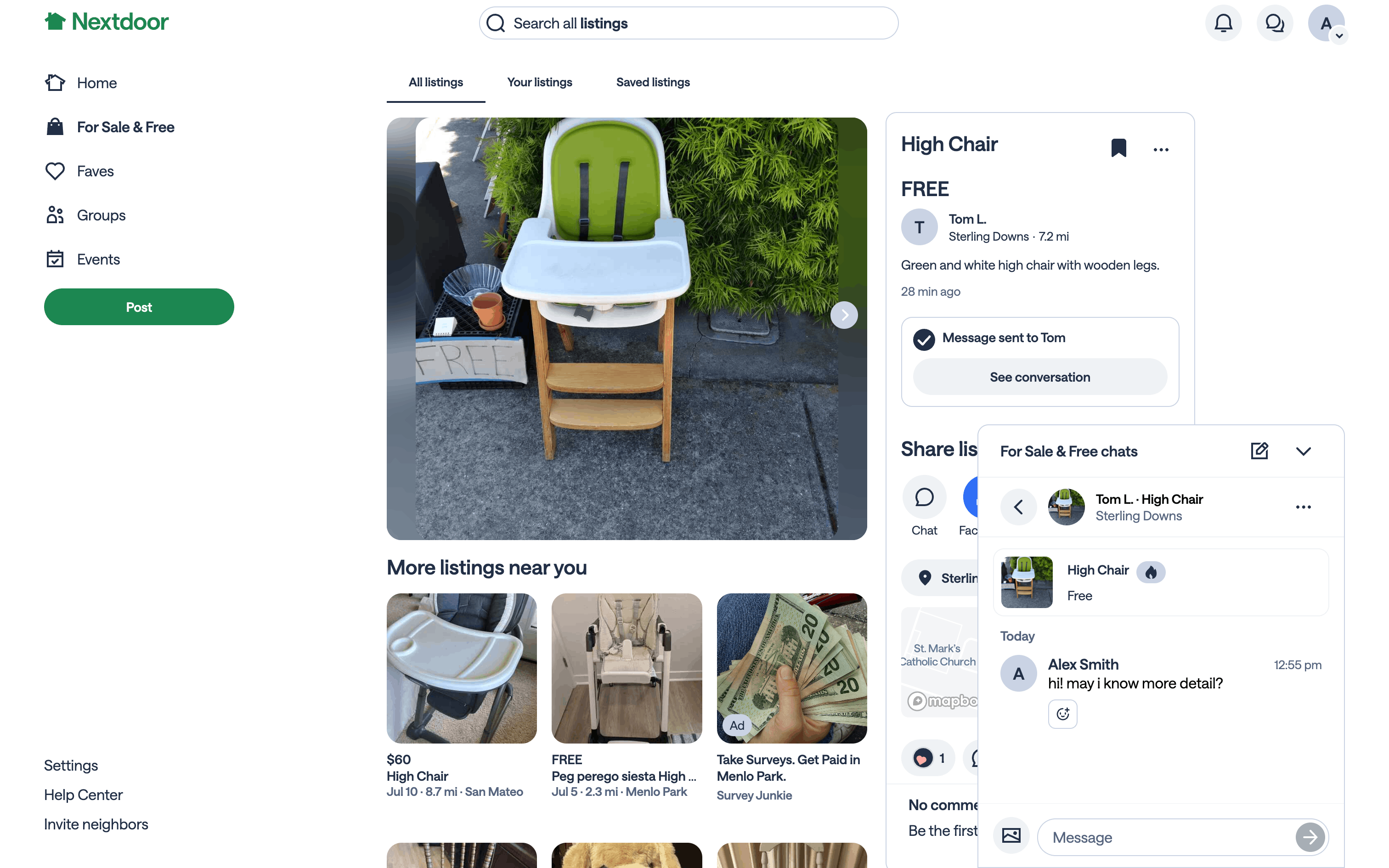 The user views a listing, edits the pre-filled message, and sends it to the seller. The user then views the conversation with the seller.